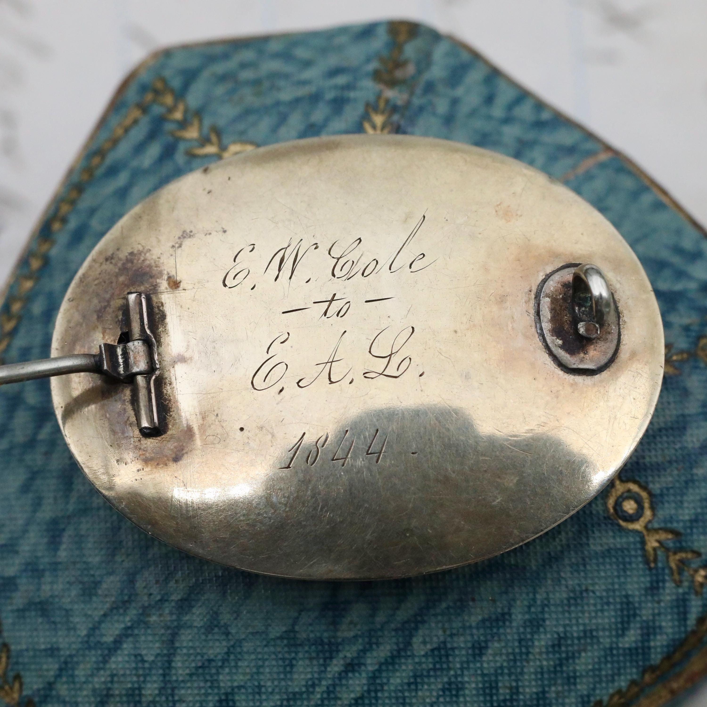 A Victorian sentimental brooch dated 1844, featuring woven hair preserved beneath a clear crystal and framed in 14k yellow gold-fill. The reverse is engraved “E.W. Cole to E.A.L. 1844,” a personal dedication typical of early 19th-century love tokens and remembrance gifts.