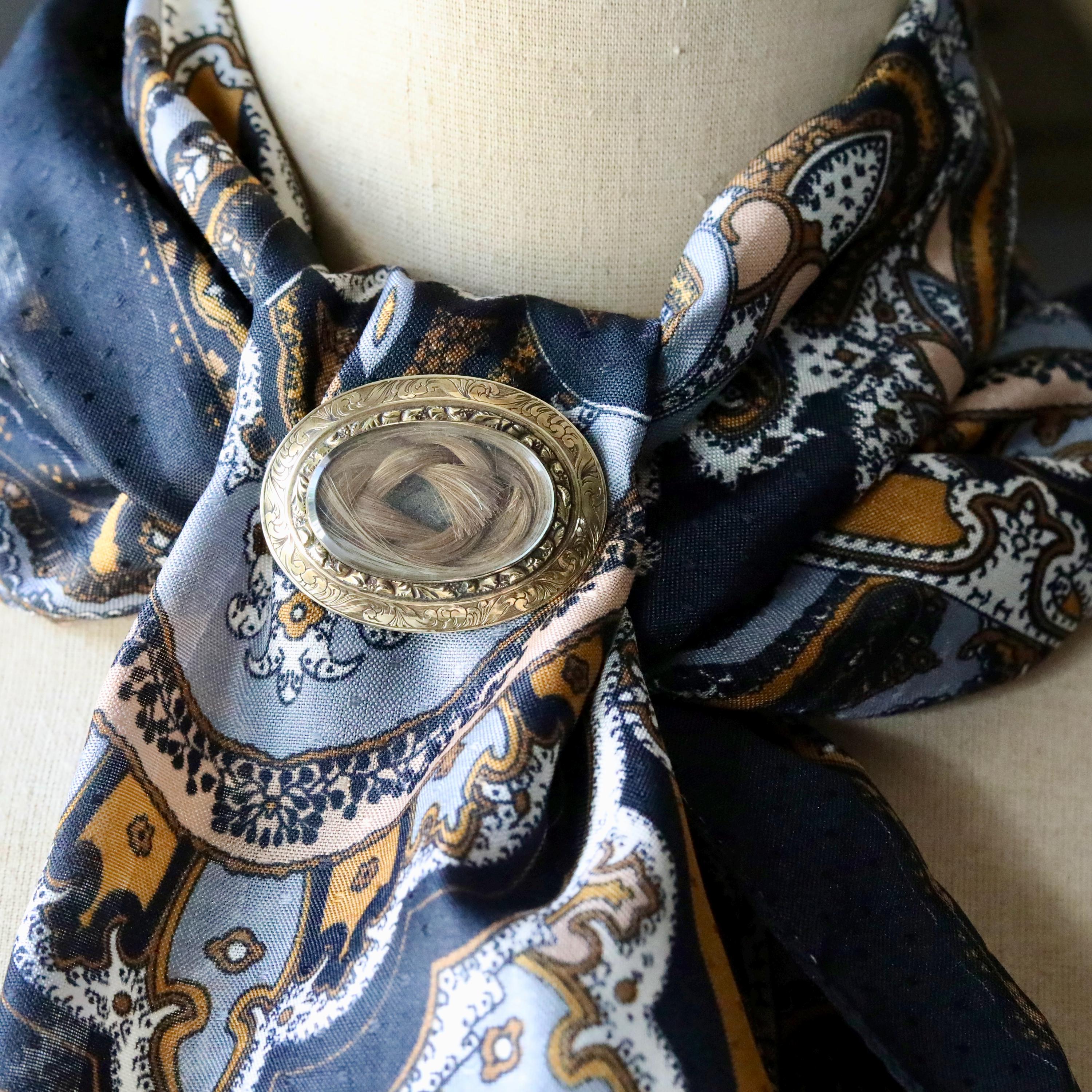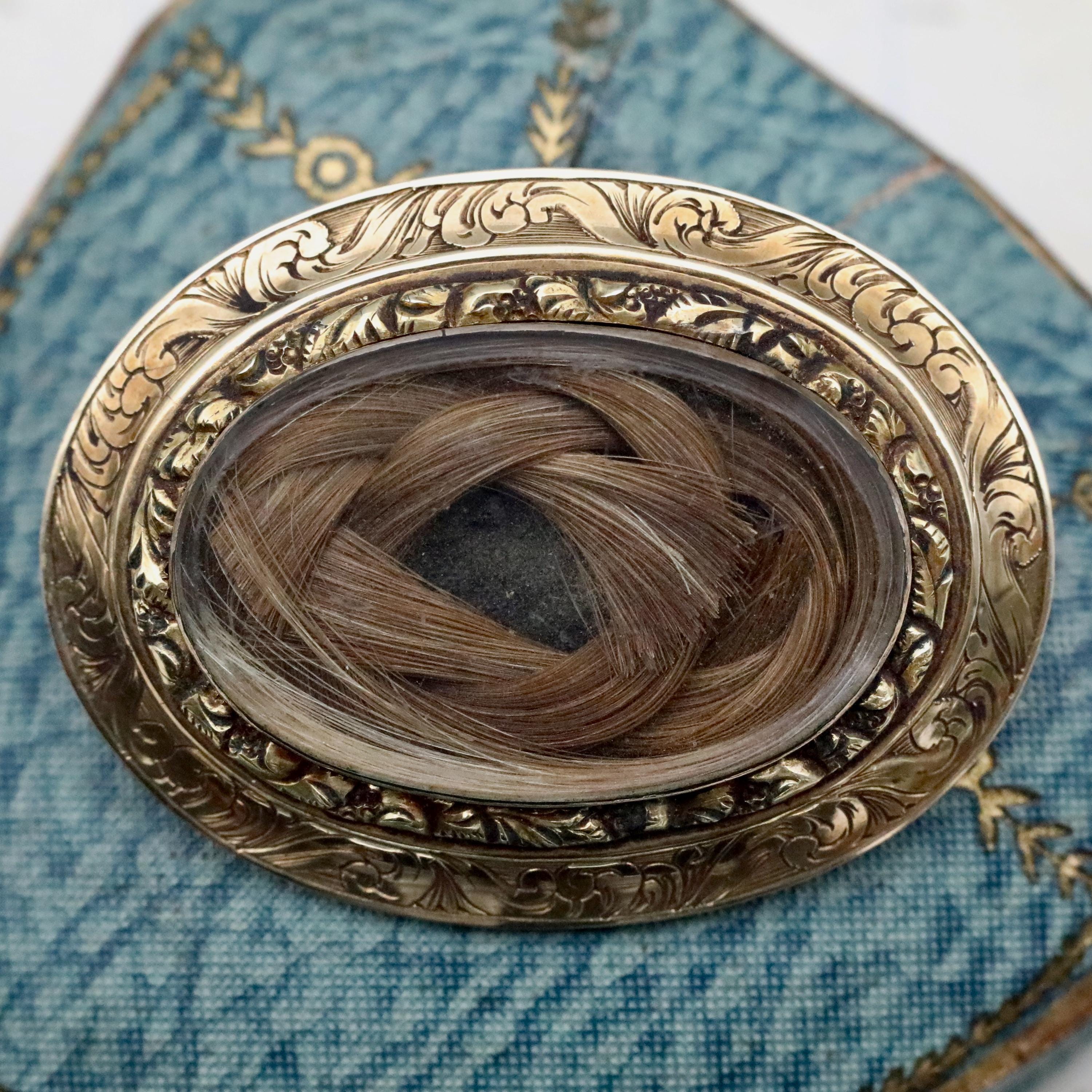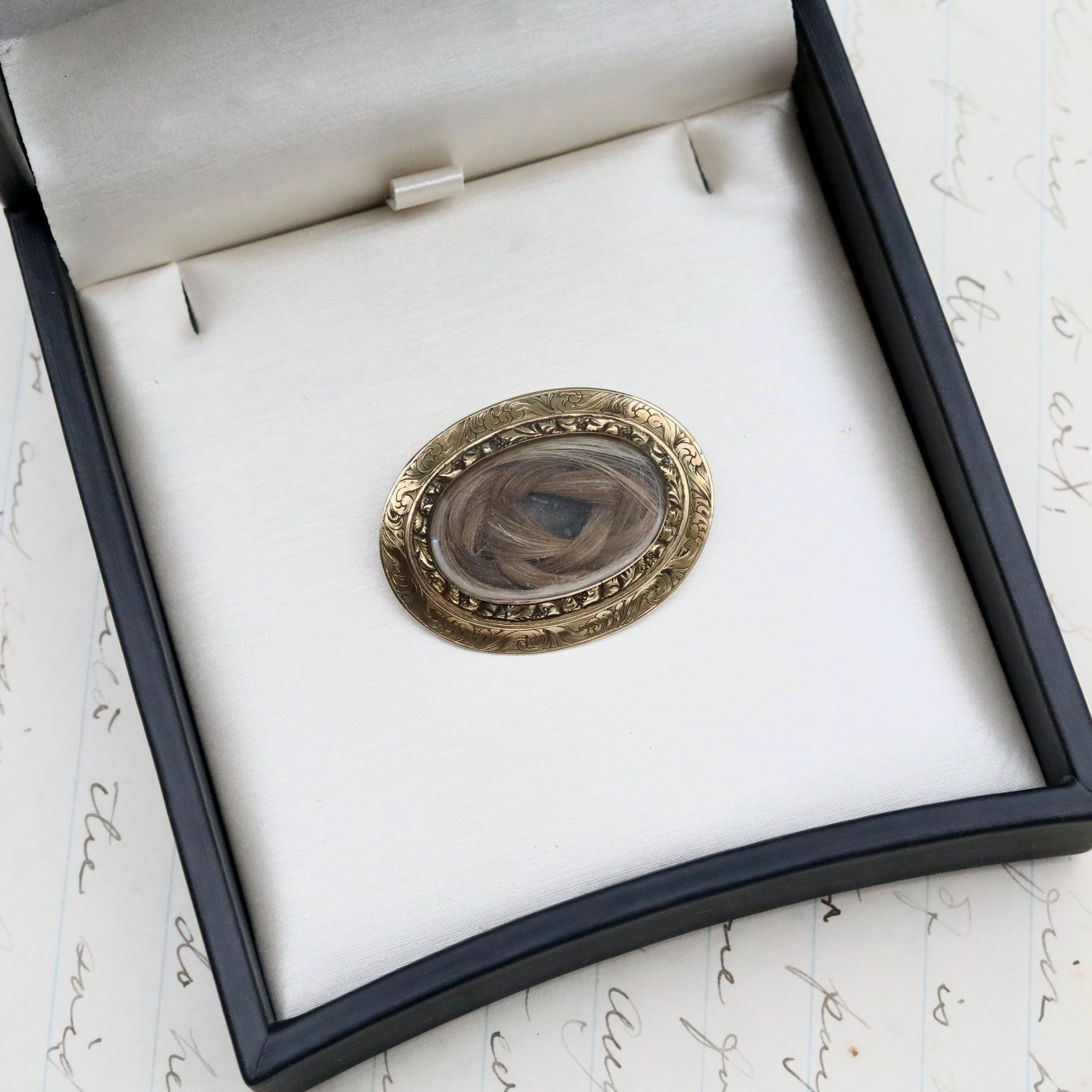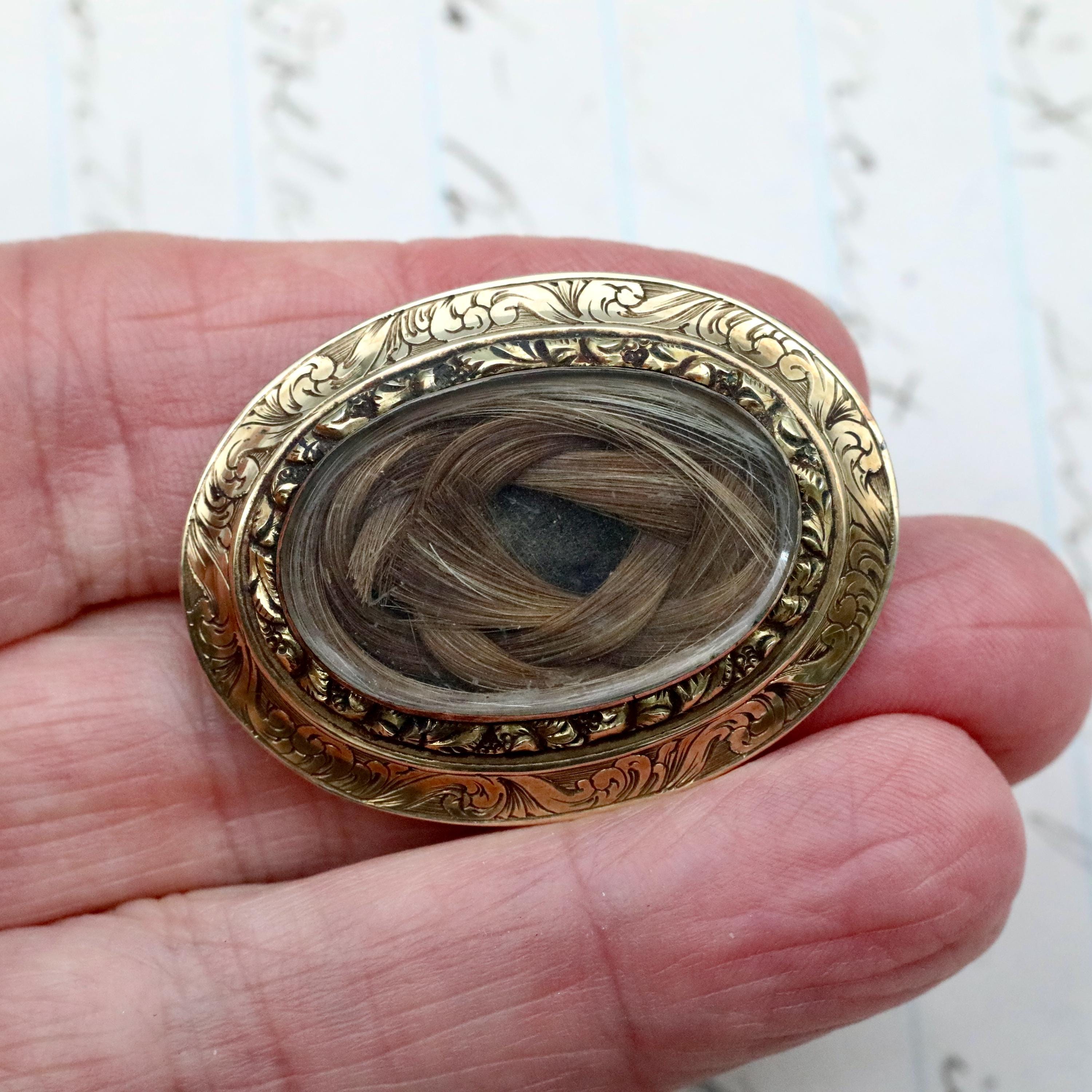The hairwork remains well preserved beneath the crystal, with light surface wear appropriate to its age. A quiet and expressive piece of personal jewelry from the 1840s, equally suited for collectors of early sentimental hairwork or those drawn to romantic antique adornment.