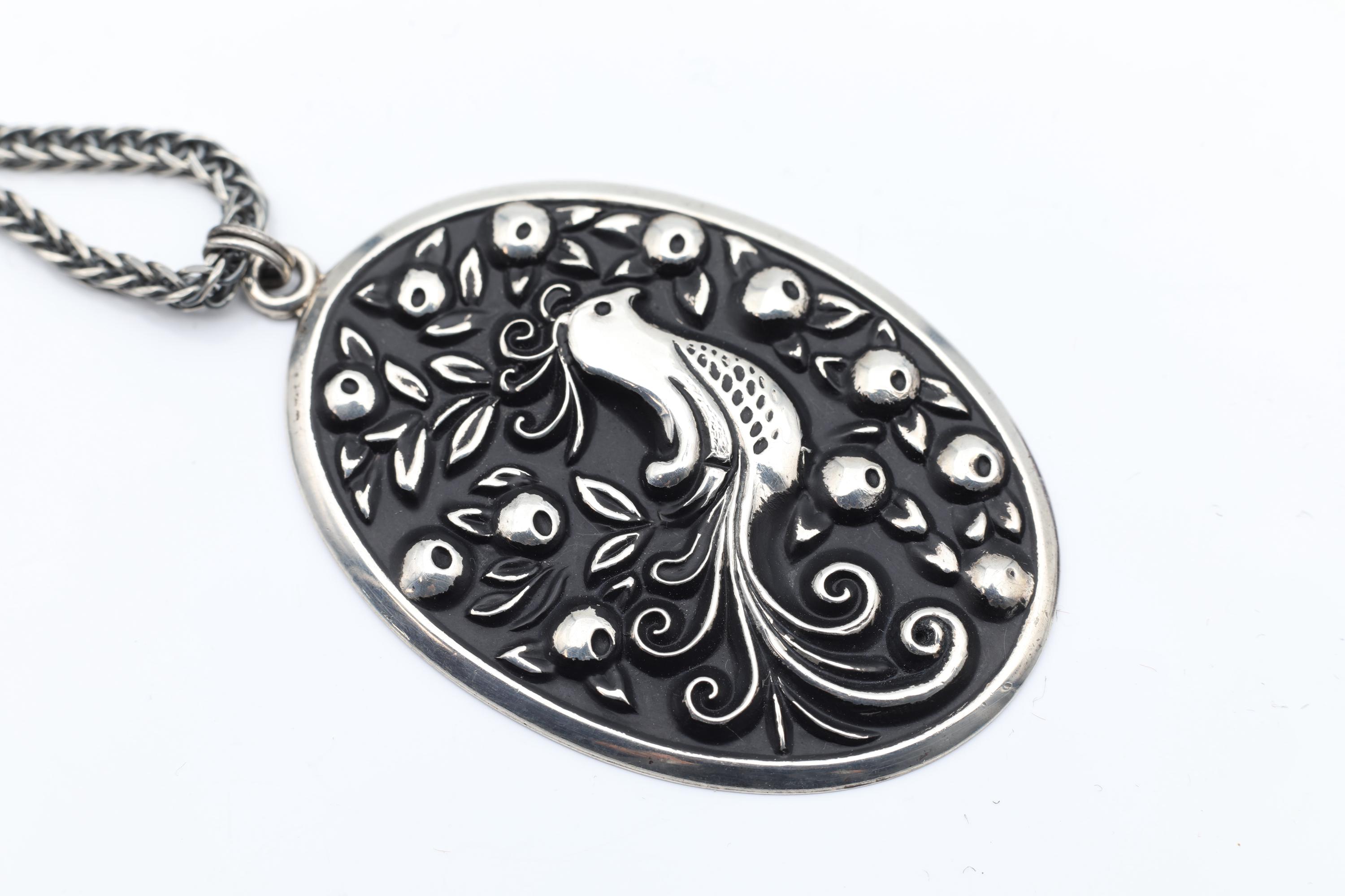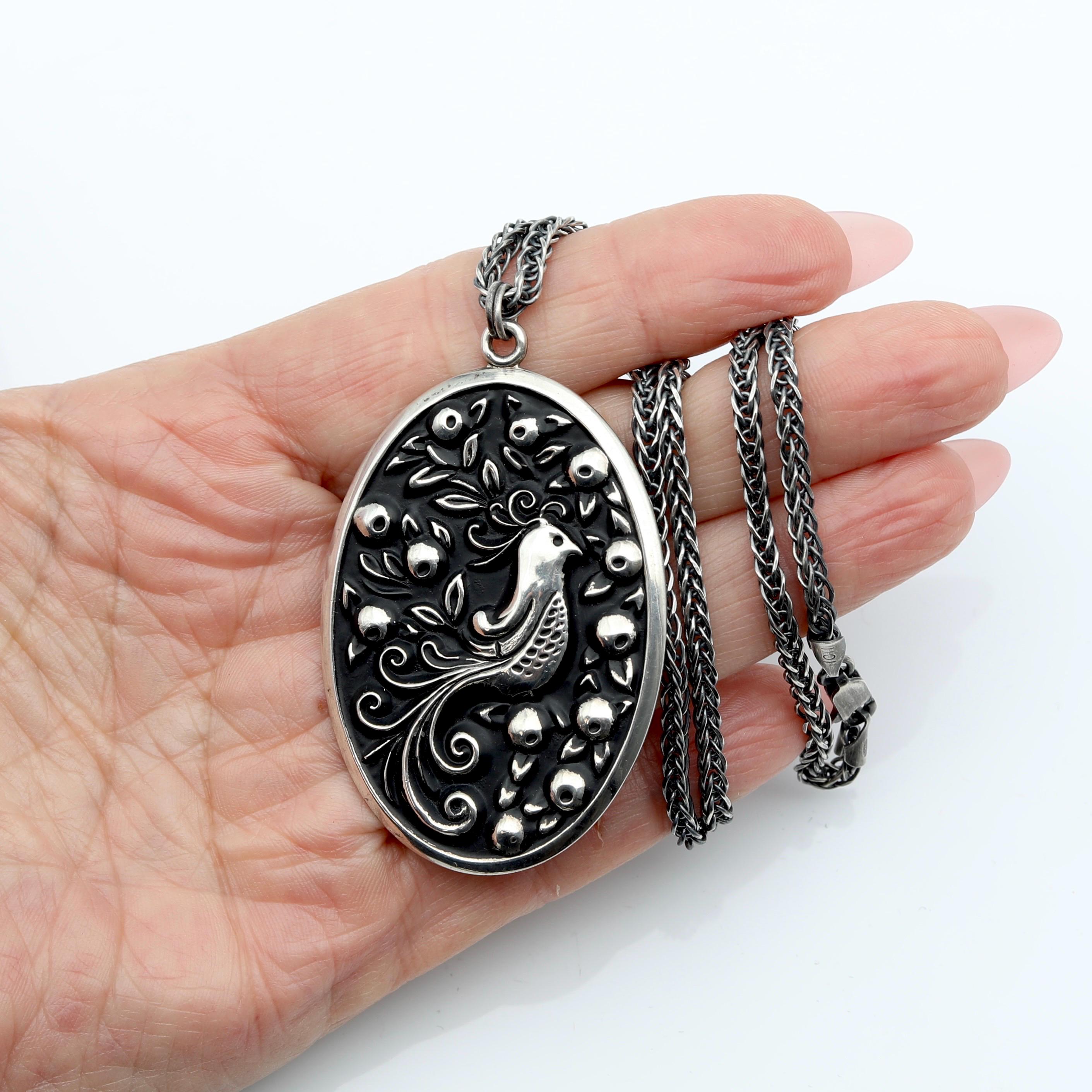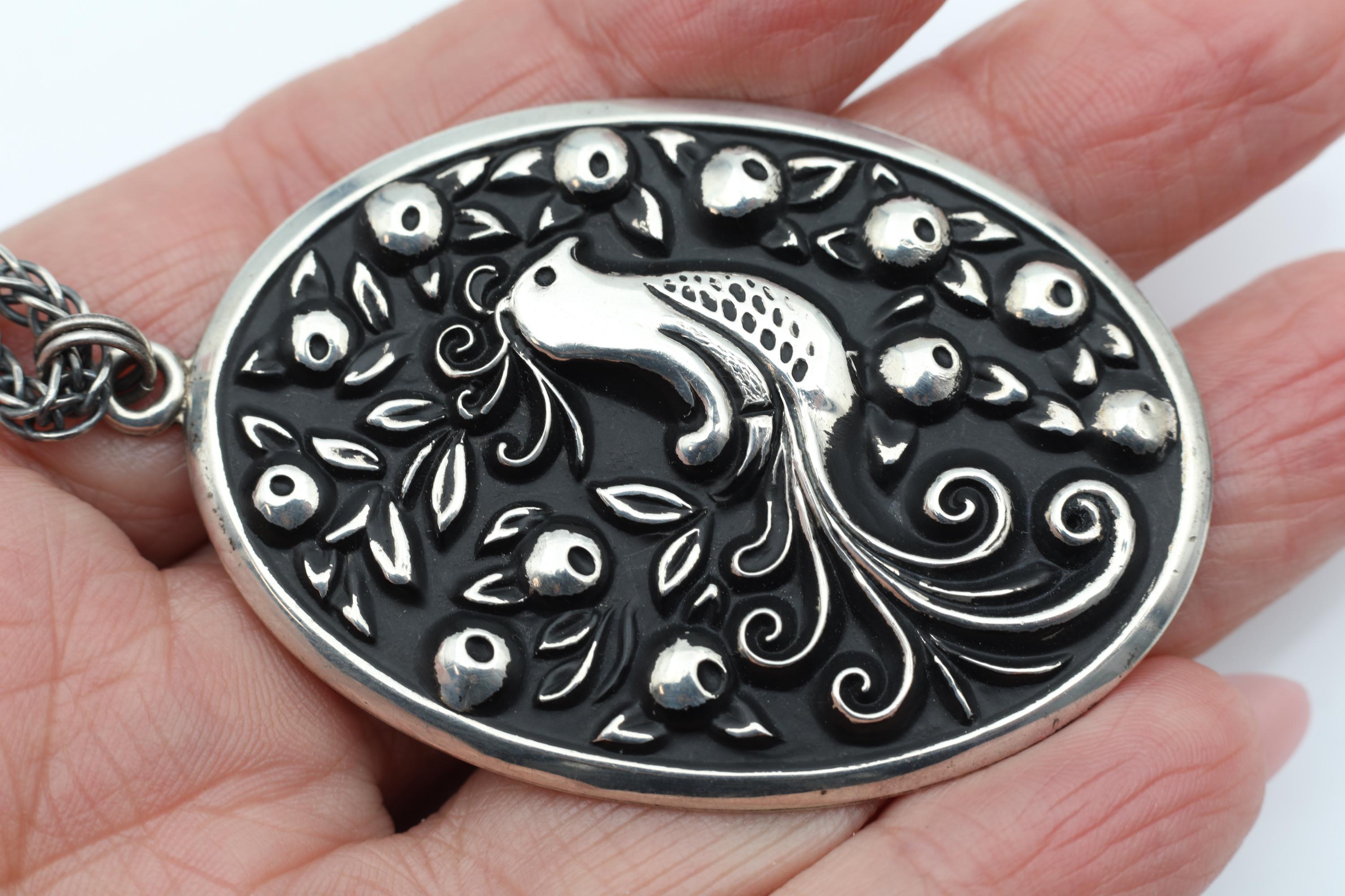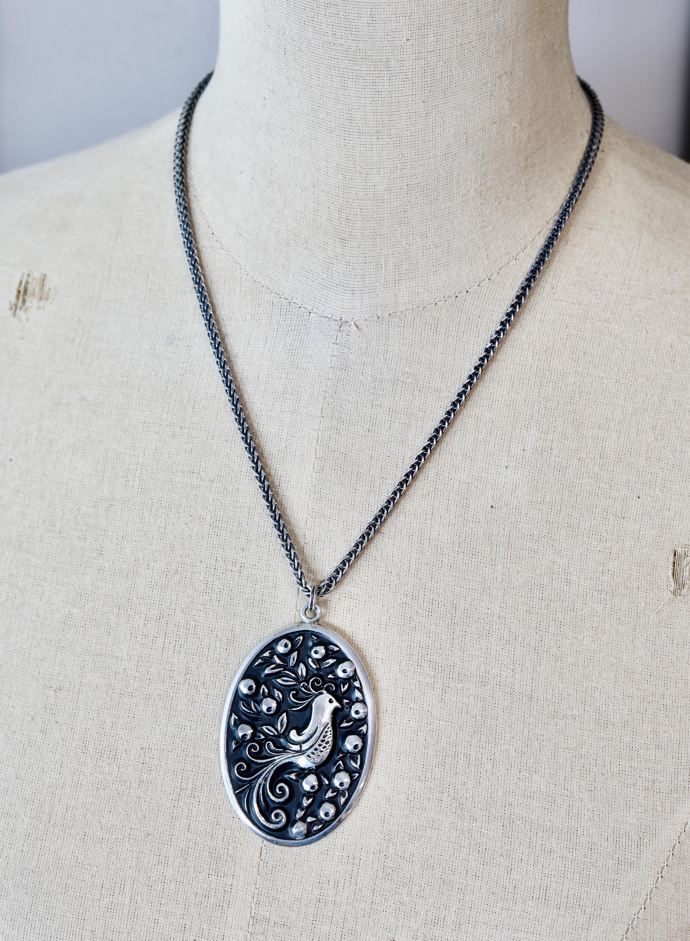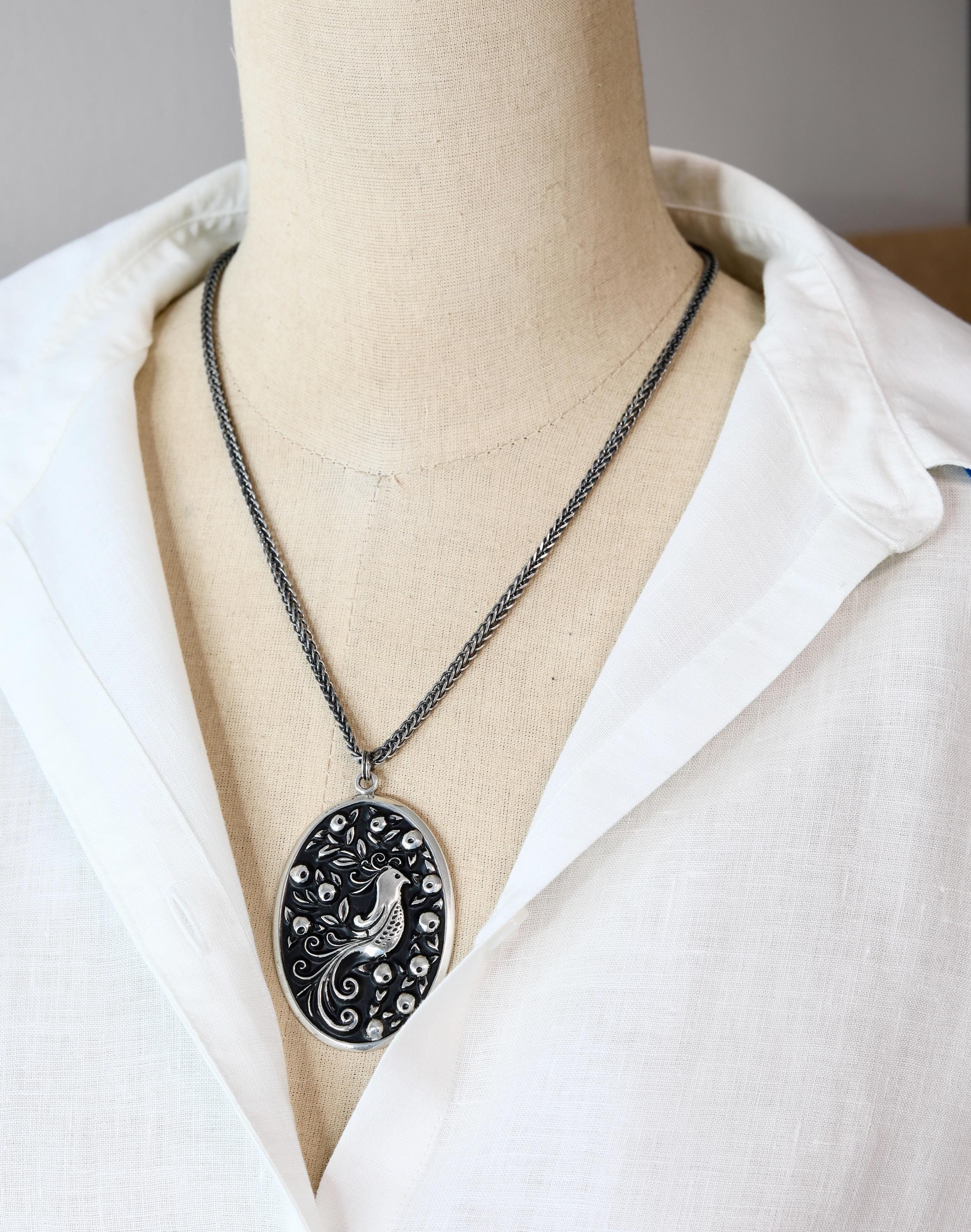 This vintage sterling silver pendant features a beautifully detailed partridge in a pear tree, inspired by the first verse of The Twelve Days of Christmas. Originally crafted in the early 1970s, the piece has been thoughtfully reimagined into a bold, wearable statement necklace and paired with a substantial new sterling chain.