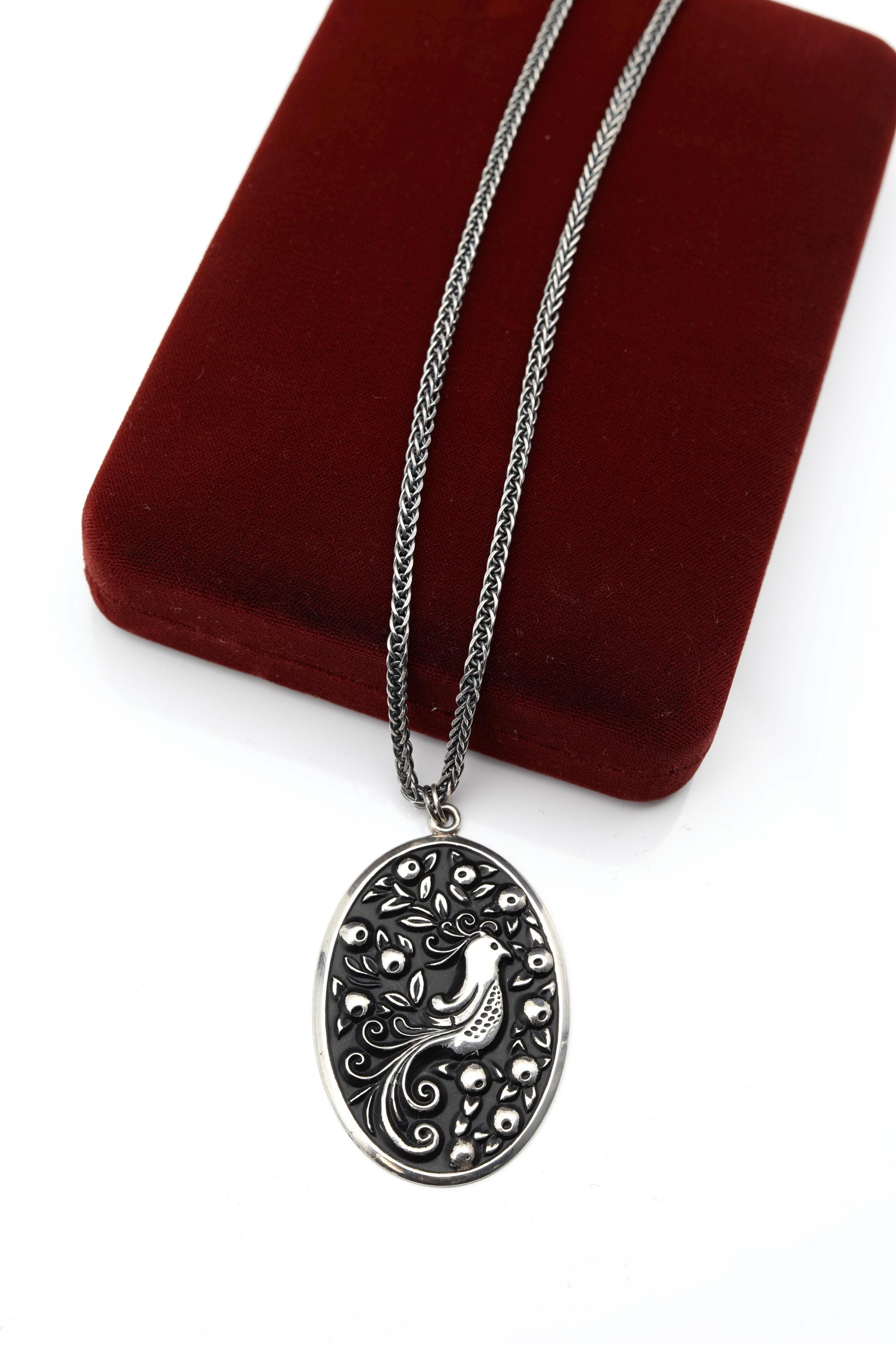 The pendant is deeply cast with rich mid-century texture—crisp feathers, sculpted pears, and a classic tree silhouette. It is festive without being overly seasonal, making it easy to wear throughout the year. A wonderful piece for those who love meaningful jewelry, traditional holiday artistry, or unique sterling collectibles. One-of-a-kind, nostalgic, and beautifully made, this necklace feels instantly heirloom-worthy.