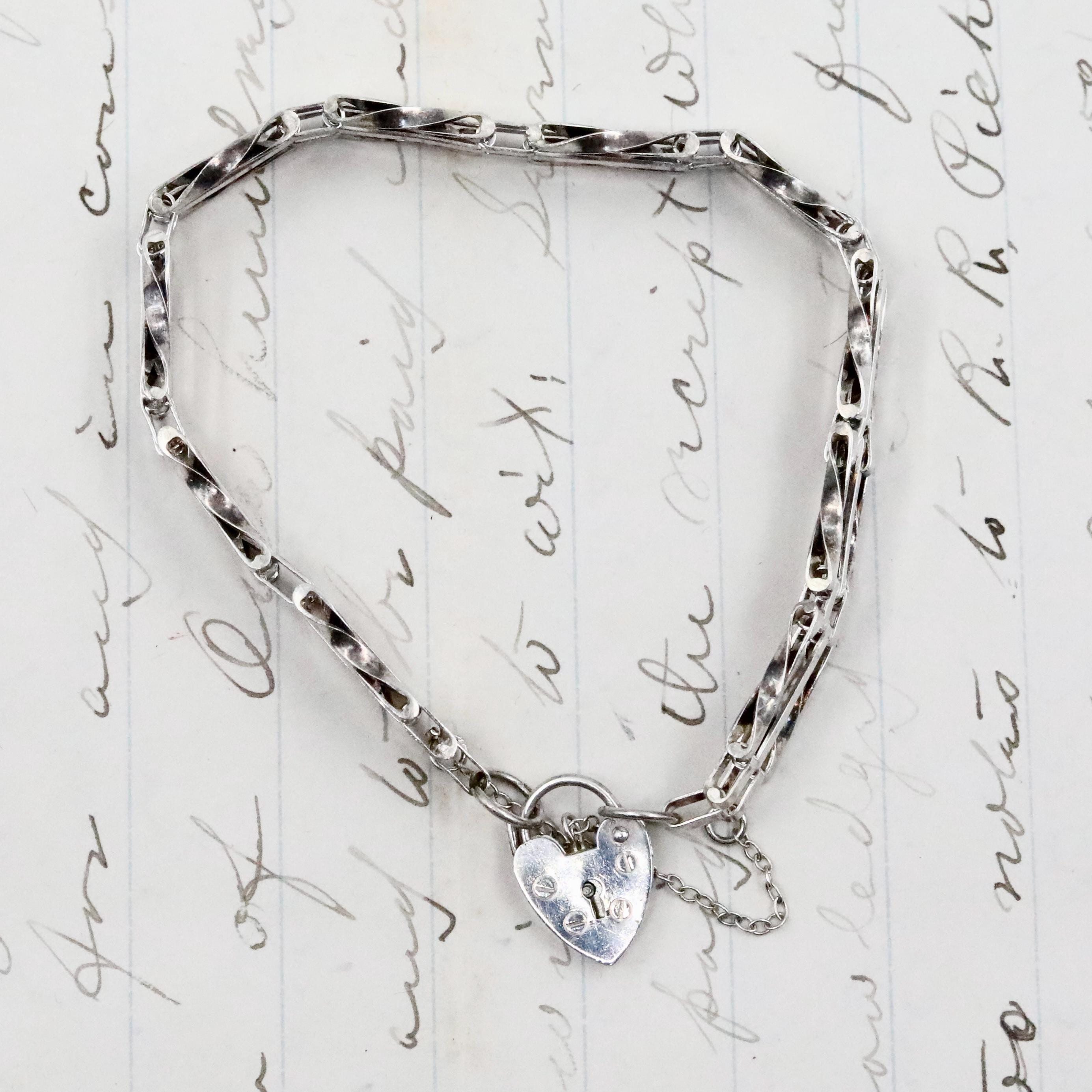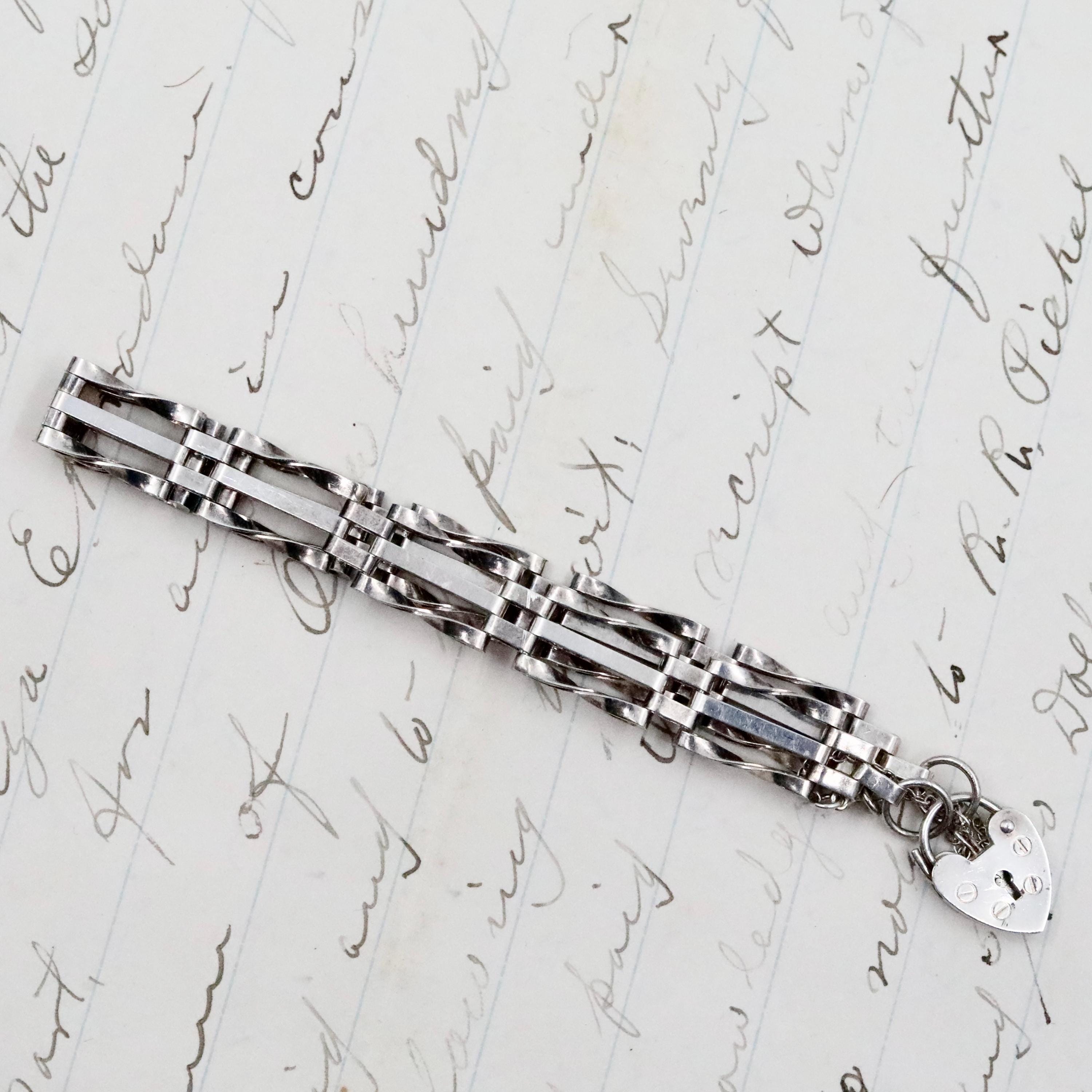 The substantial silver links are designed in a classic double-bar gate pattern—solid, dimensional, and smooth against the wrist. The heart padlock opens and closes securely, and the safety chain remains perfectly intact. This is a versatile bracelet that feels both modern and historic, ideal for everyday wear or gifting.