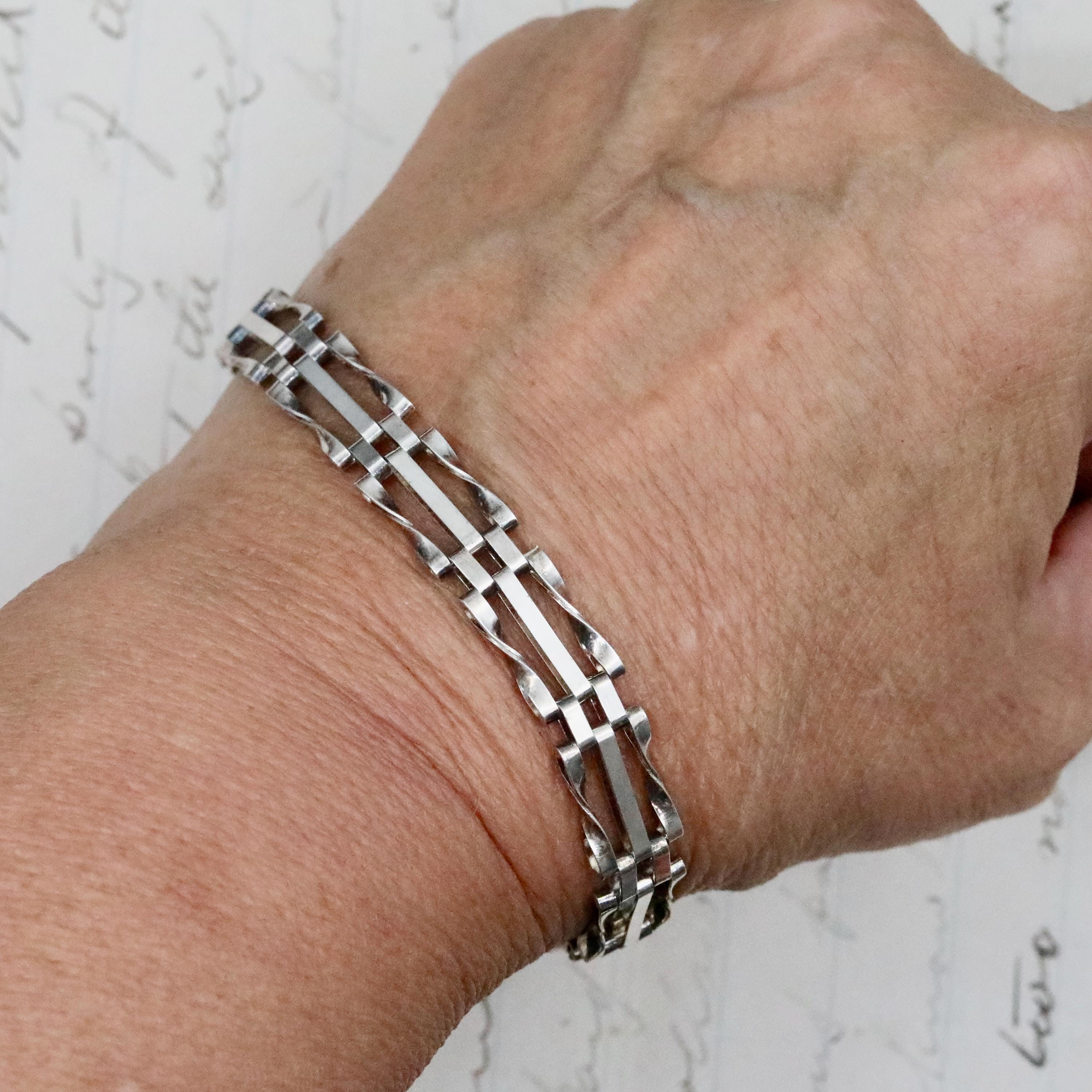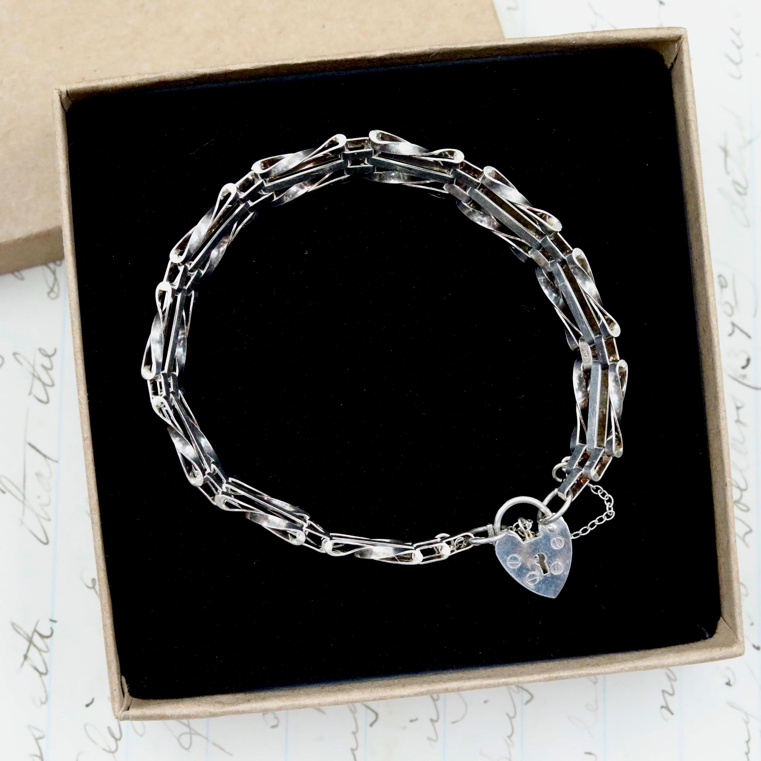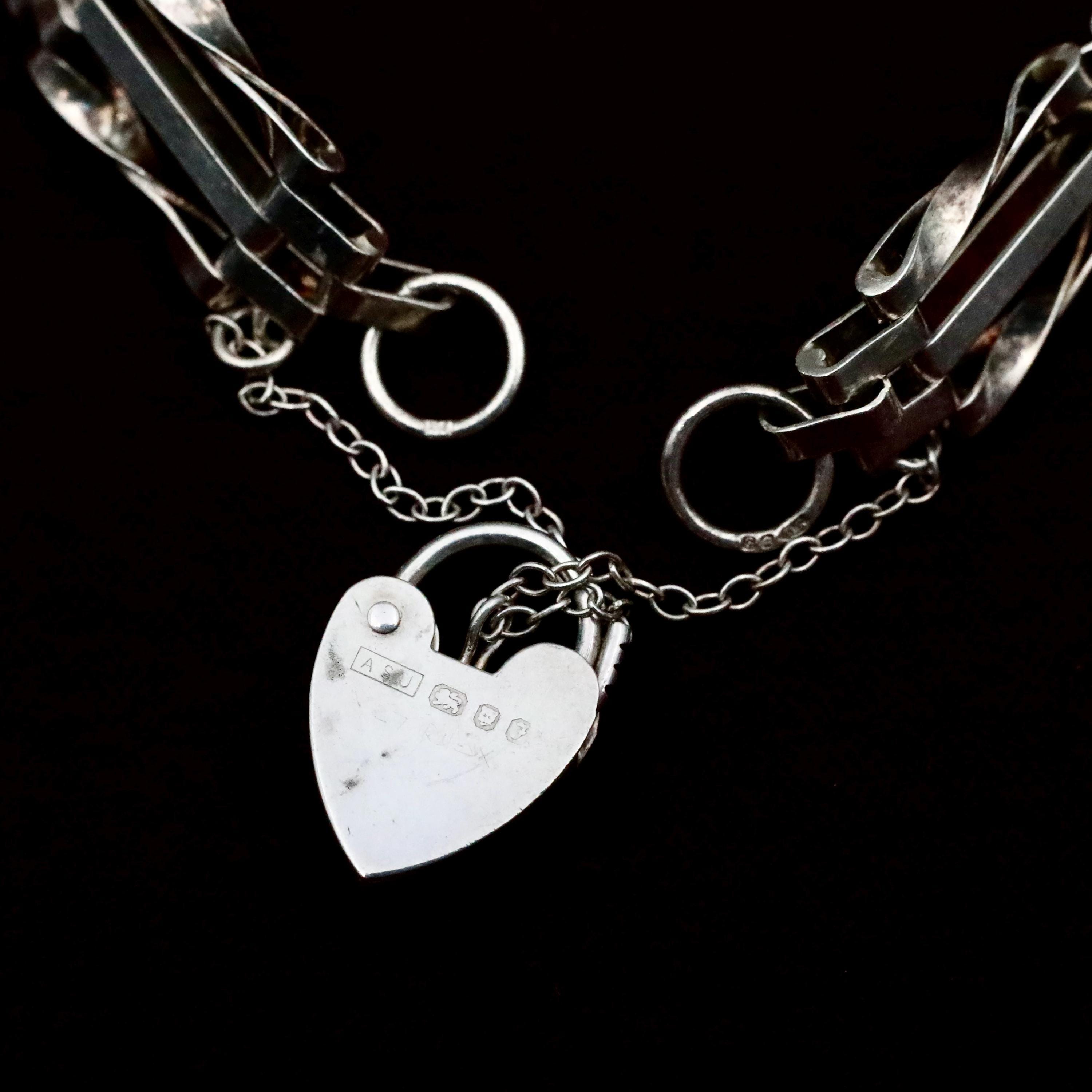 A beautifully crafted heavy sterling silver gate bracelet, finished with a traditional heart padlock clasp and safety chain. Fully hallmarked in London, 1980, this vintage British piece blends bold, sculptural style with timeless romantic symbolism.