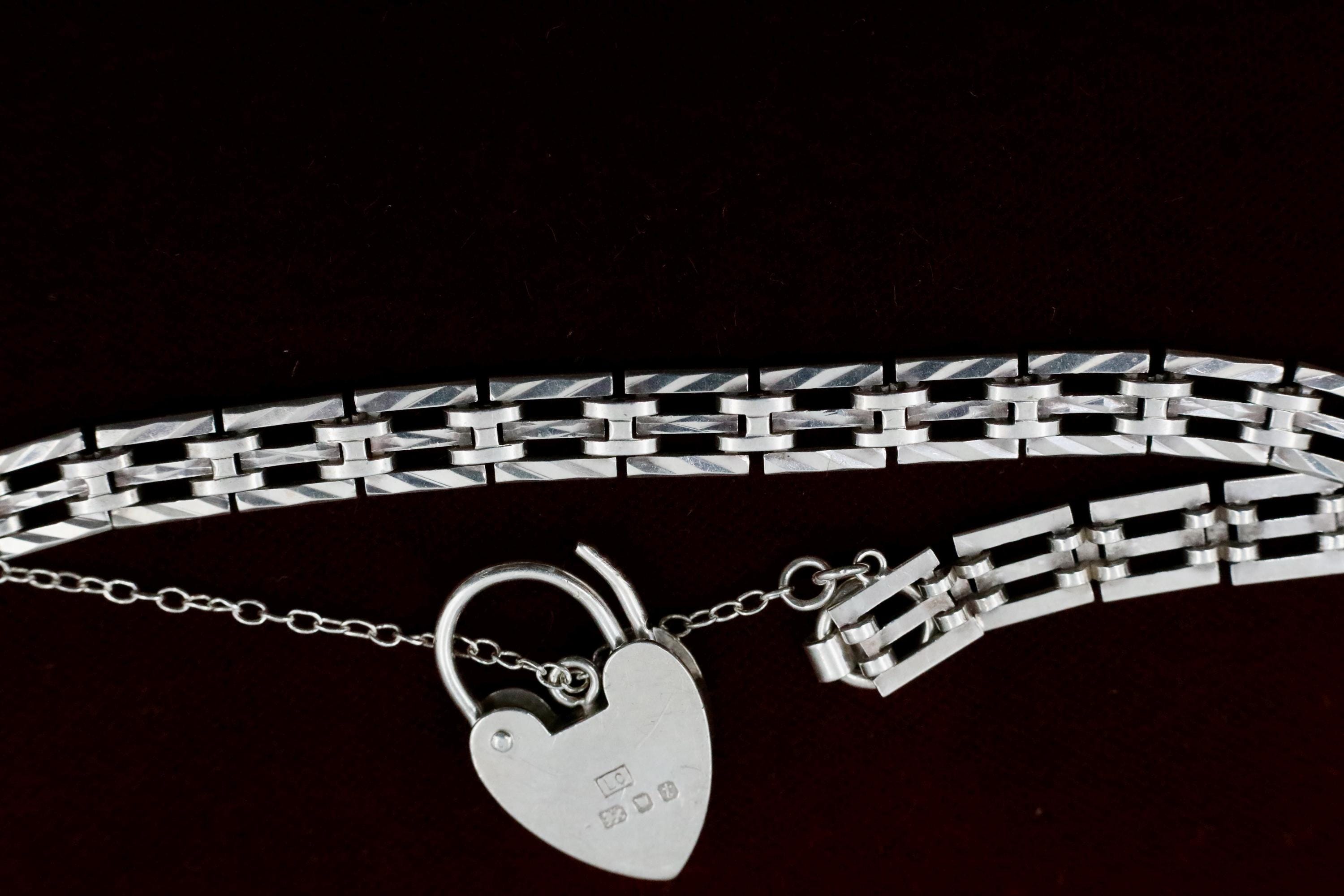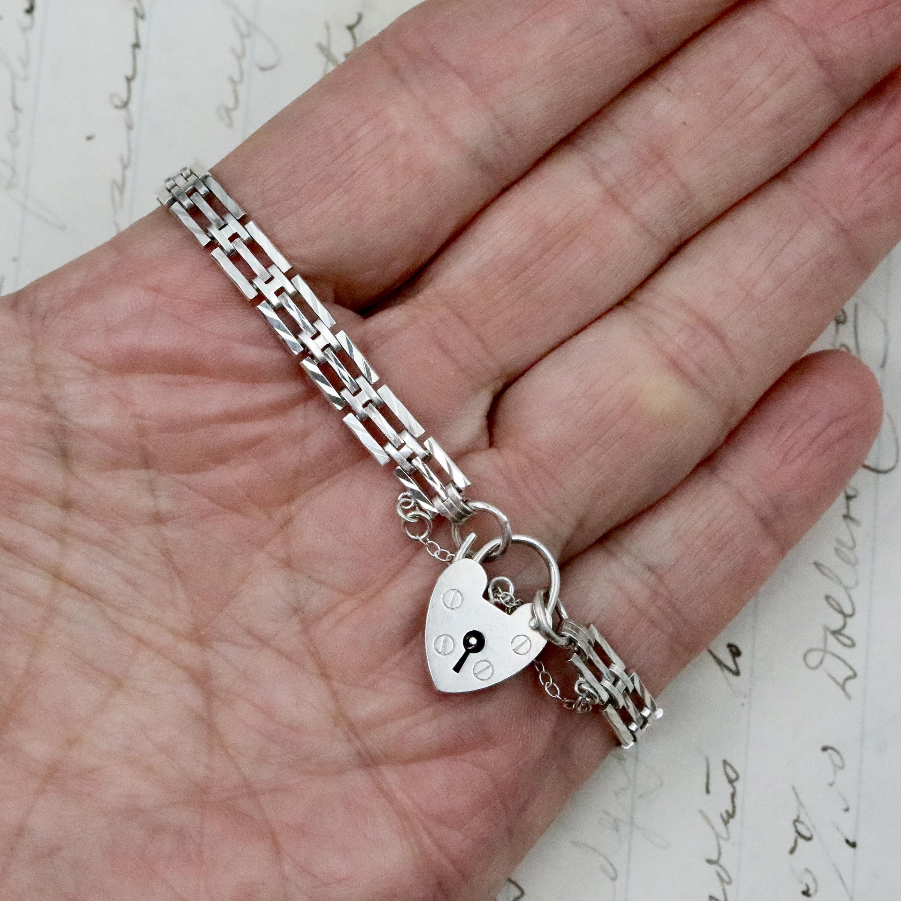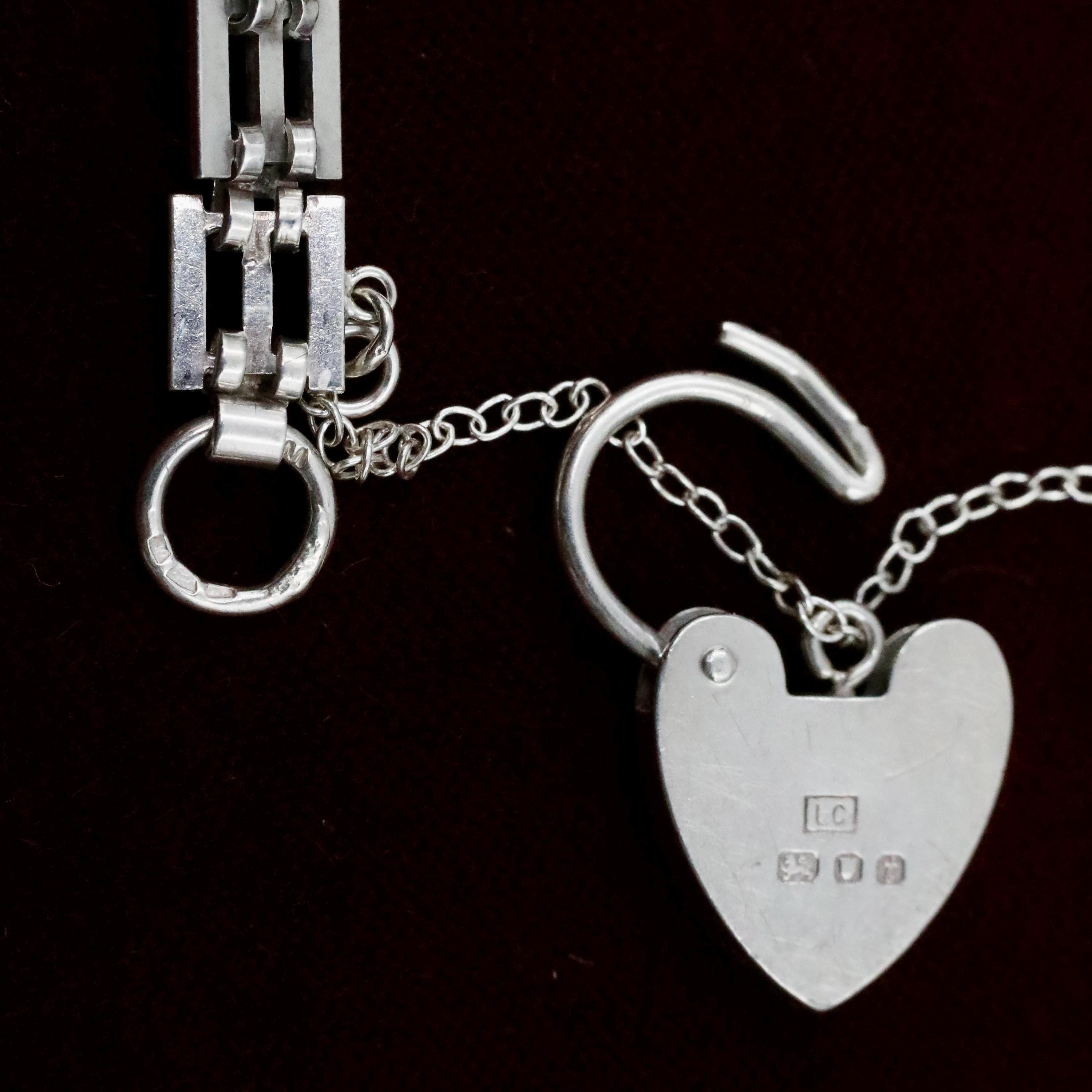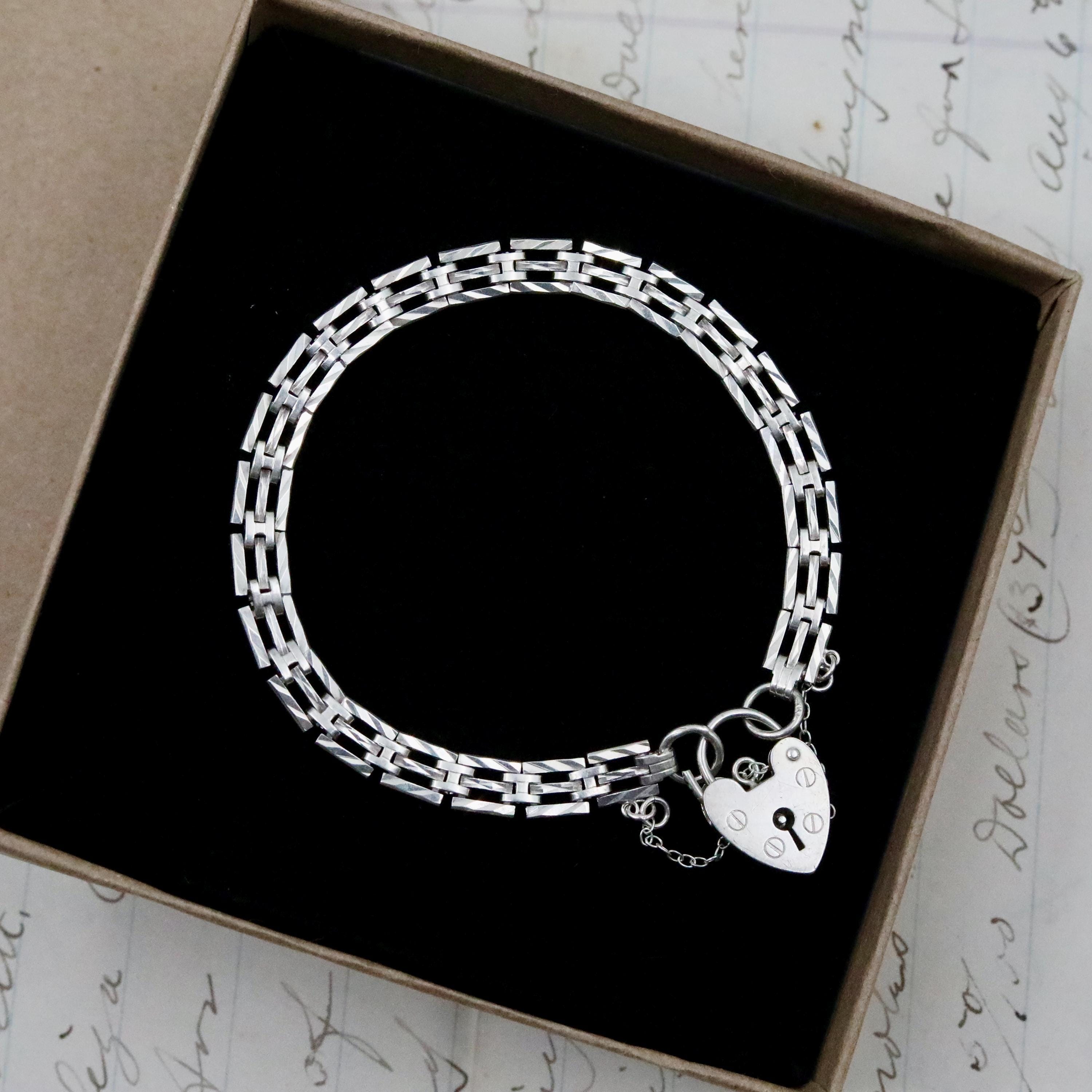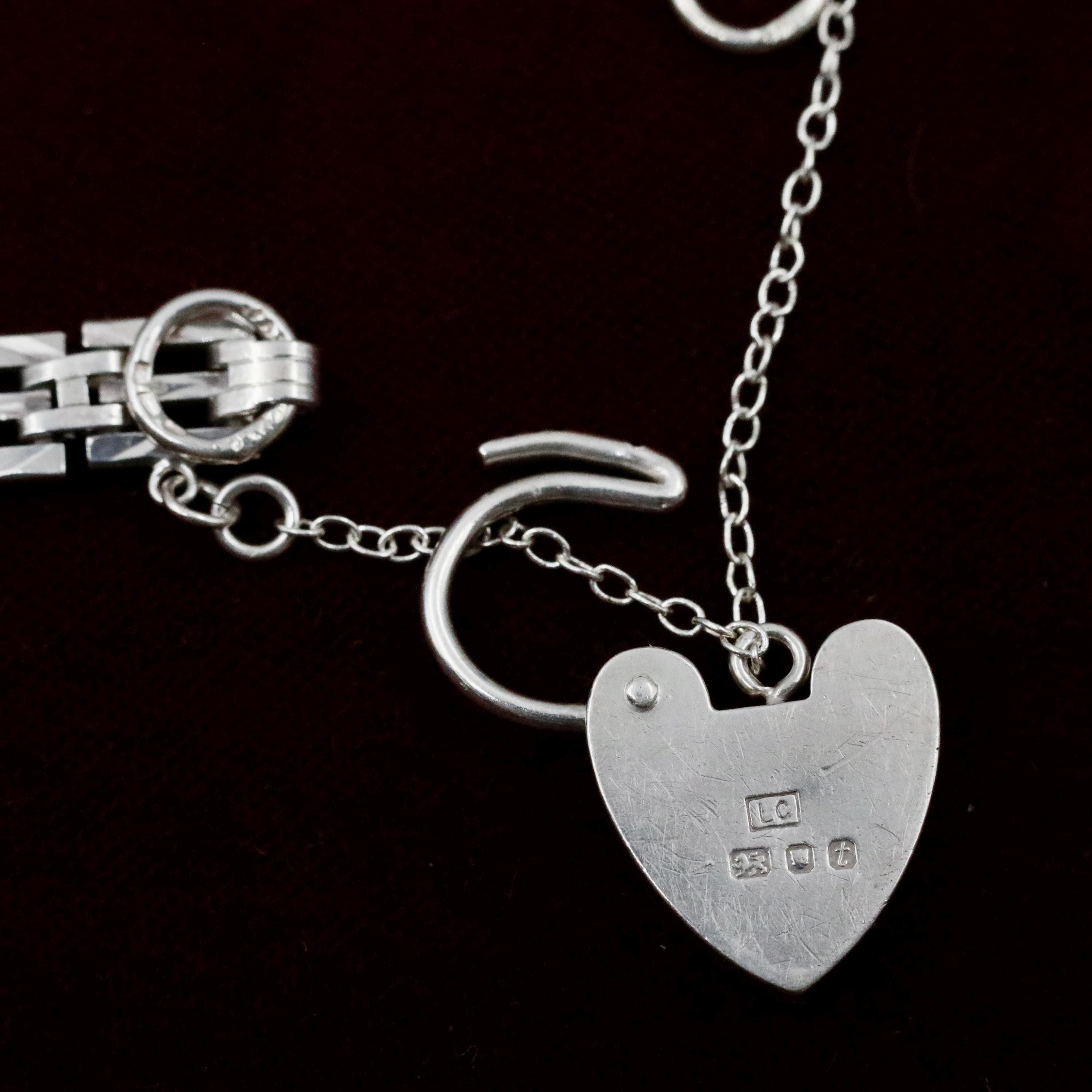 A beautifully crafted vintage sterling silver heart padlock bracelet made in London in 1974. Designed with classic gate links and finished with an iconic heart-shaped padlock clasp, this piece blends bold vintage style with romantic symbolism. The polished links feel substantial yet feminine, and the working heart padlock with safety chain adds both charm and security.