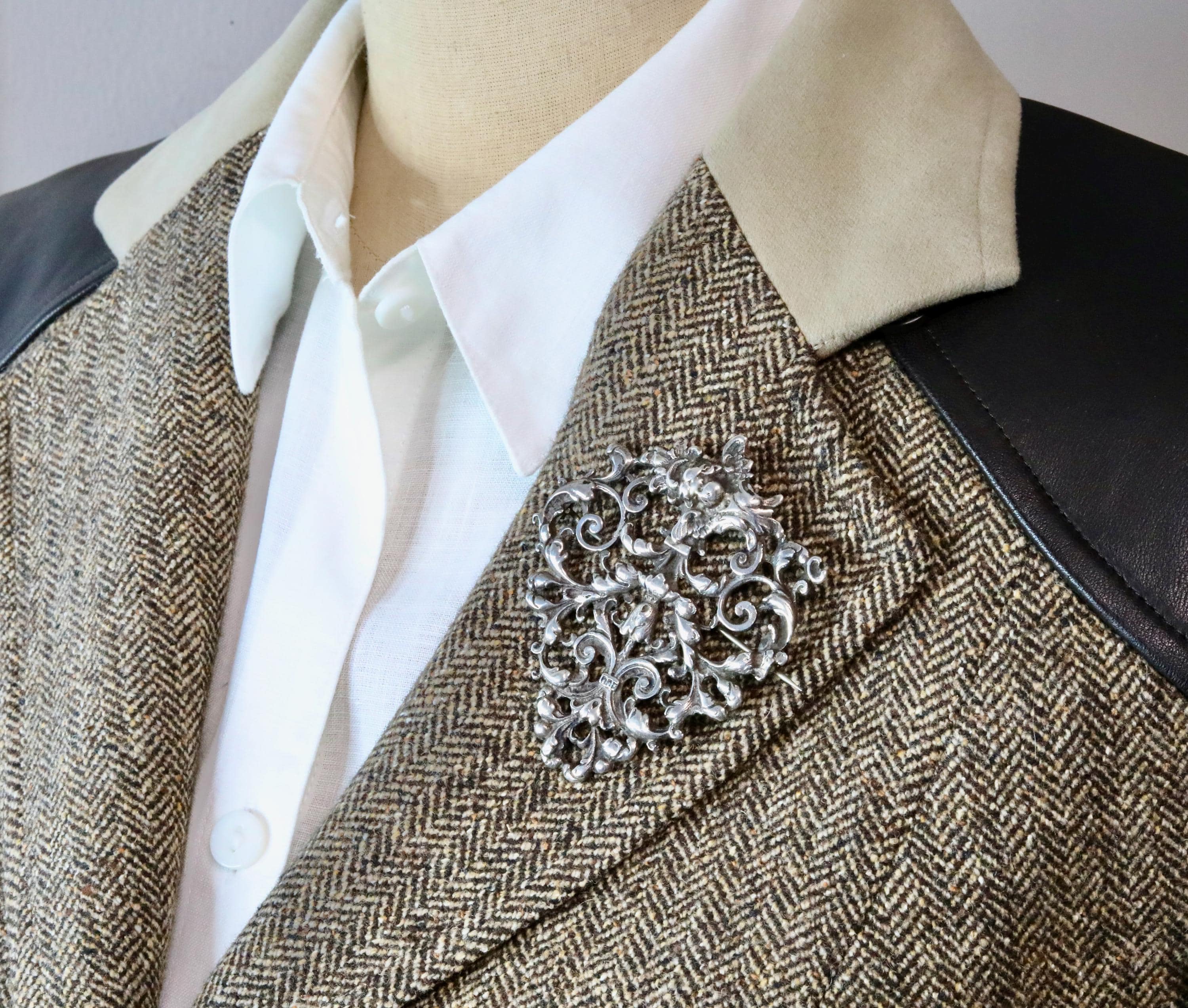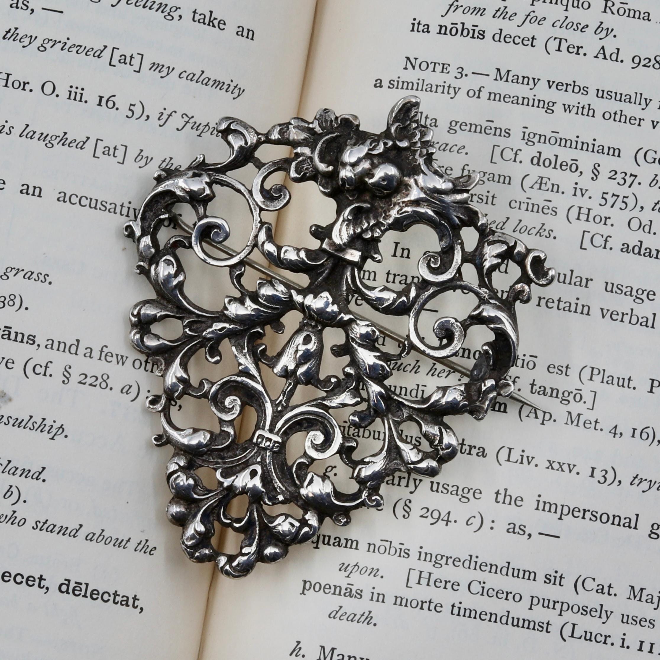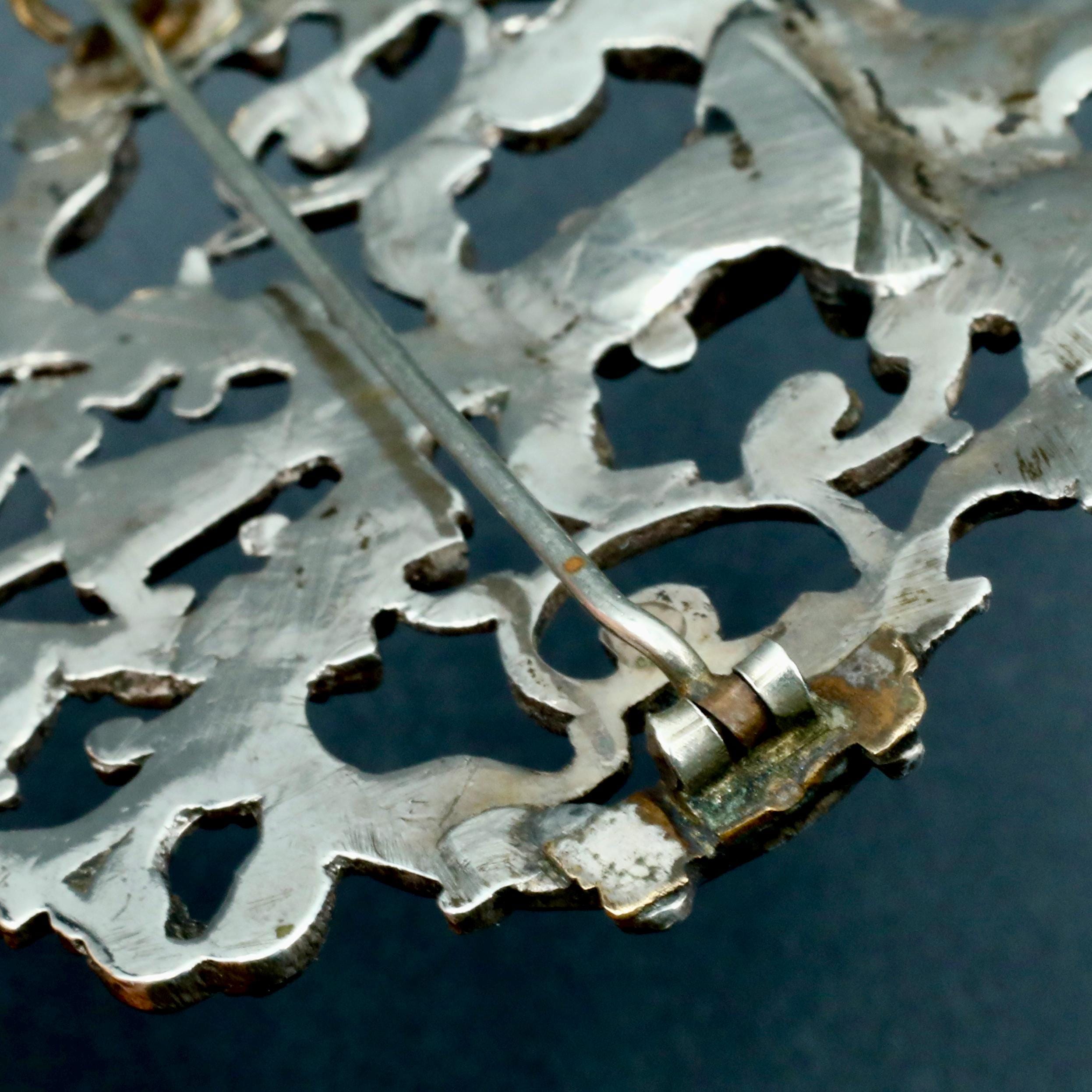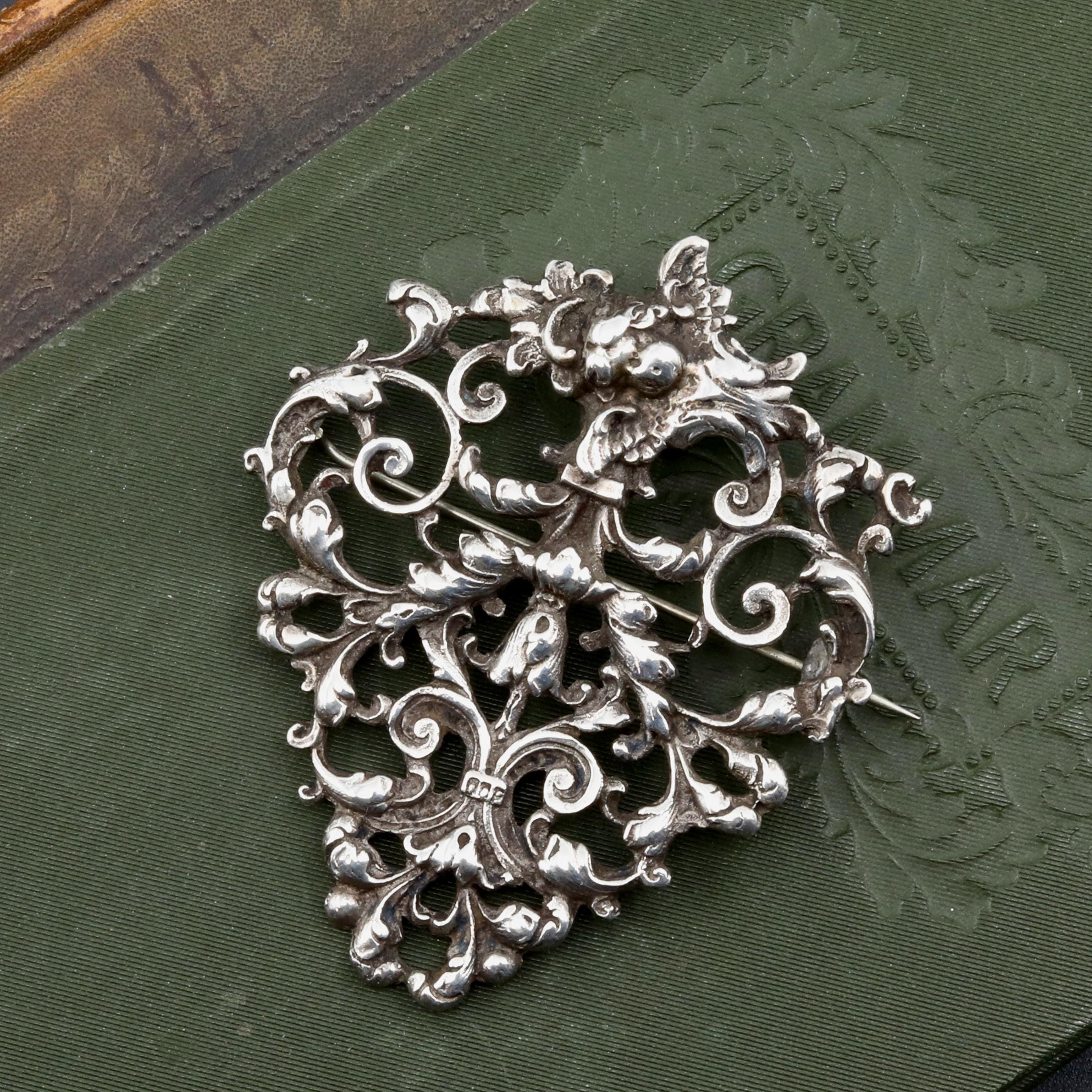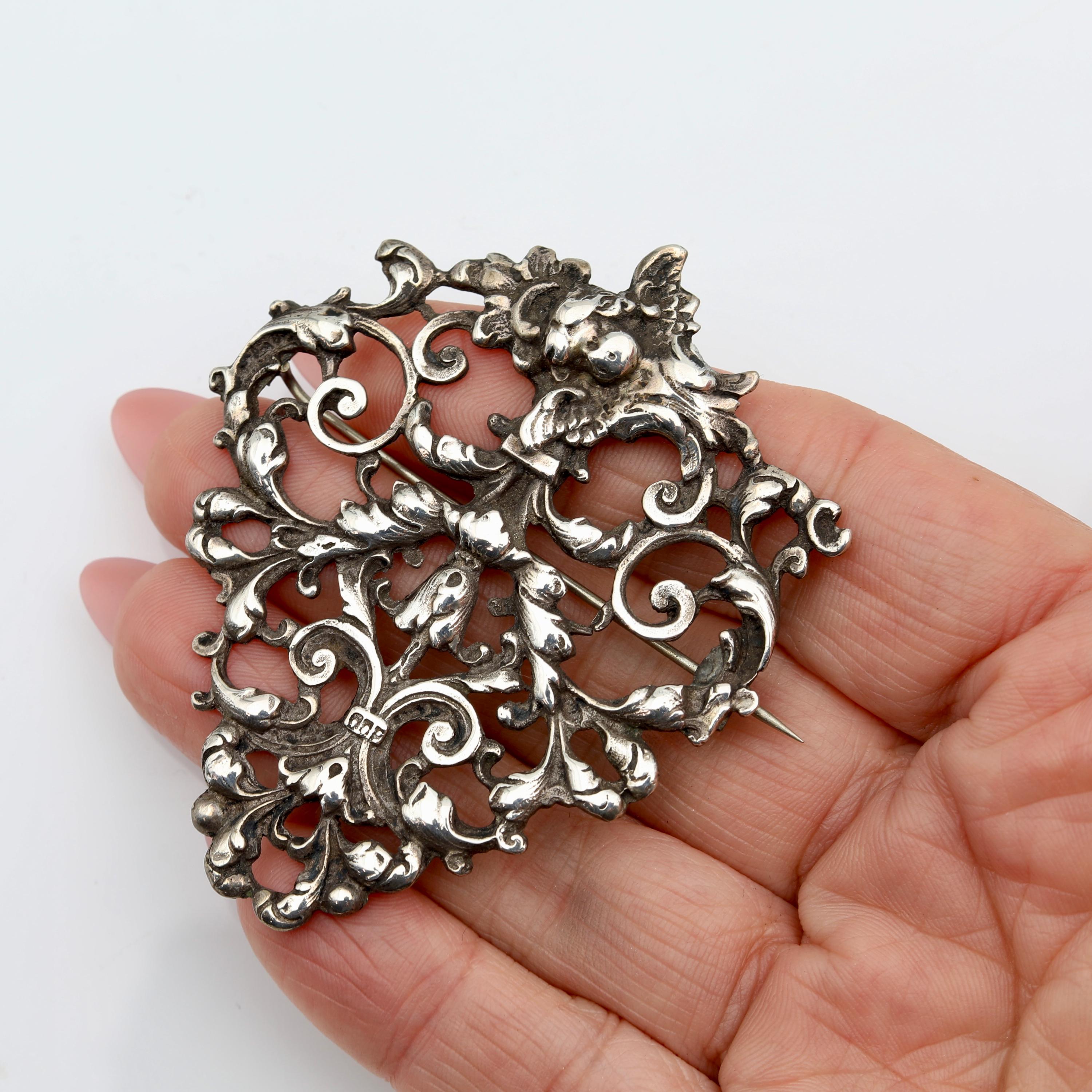A Victorian sterling silver brooch, converted from one half of a late-19th-century belt buckle. The ornate cast silver scrollwork reflects Rococo Revival design, with floral elements that give the piece a distinctly gothic, romantic character. Typical of Birmingham silver from the 1880–1900 period, this brooch combines historic craftsmanship with a dramatic aesthetic well suited to modern styling as a lapel pin or statement accessory.