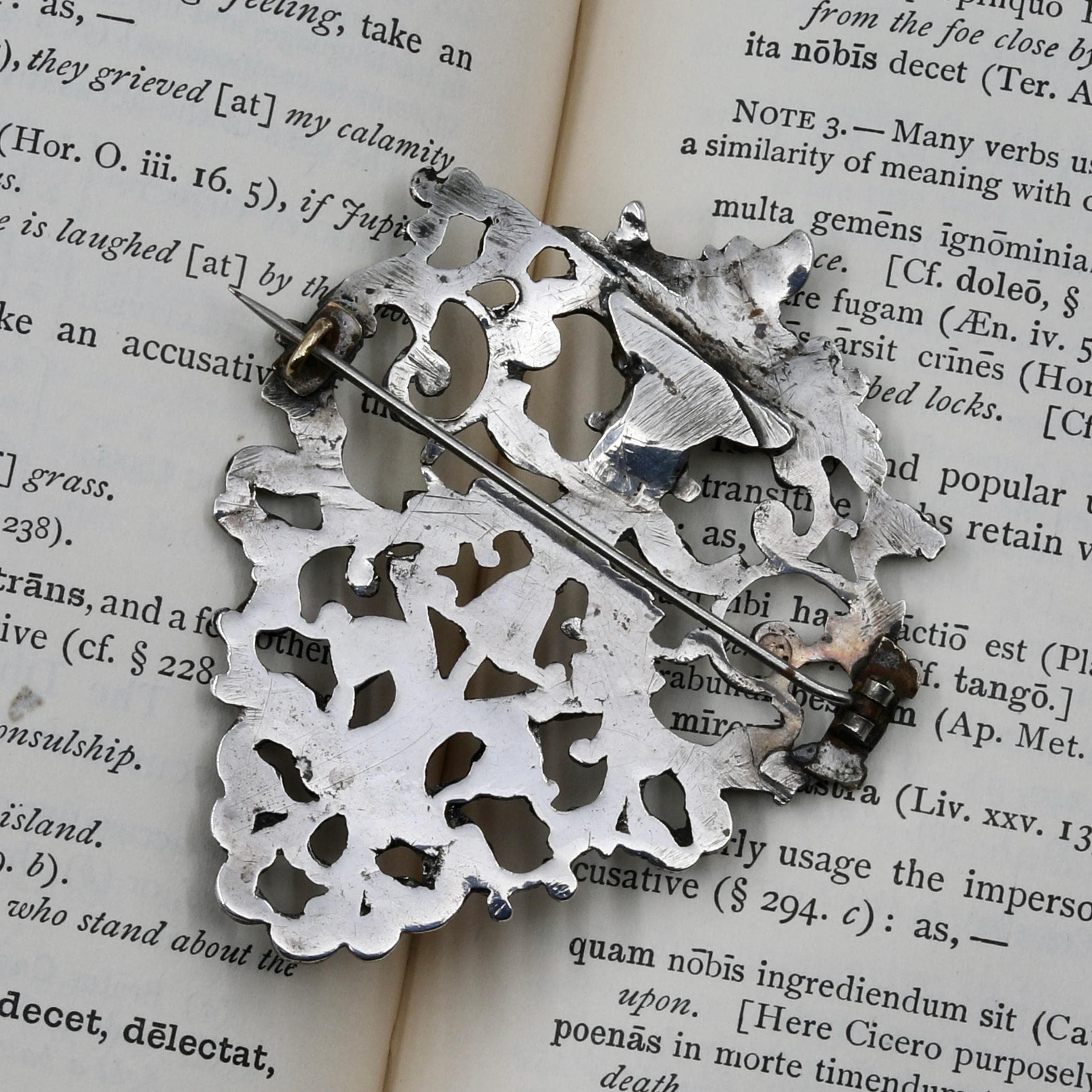 Historical solder and a later clasp are present on the reverse from its conversion to a brooch.