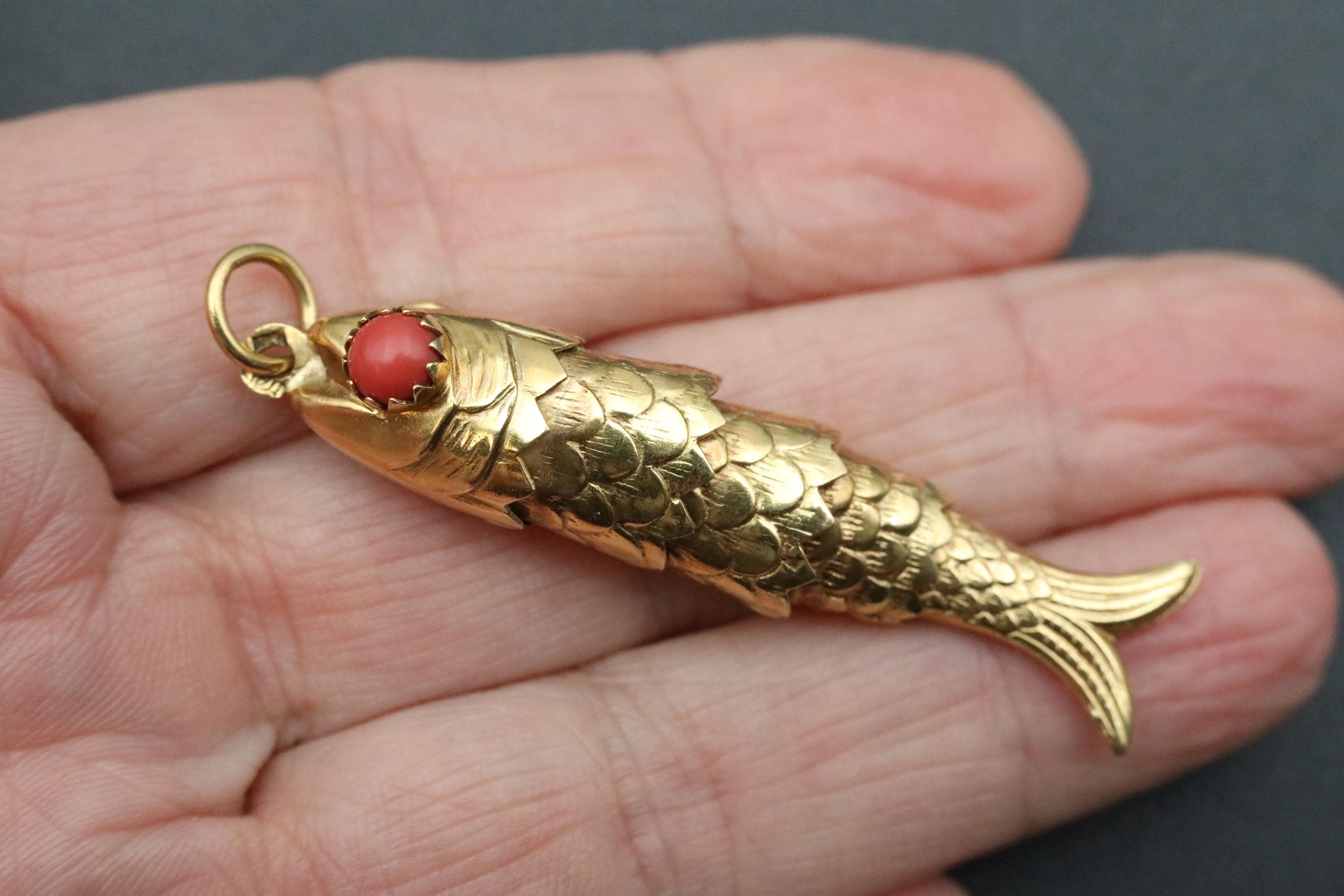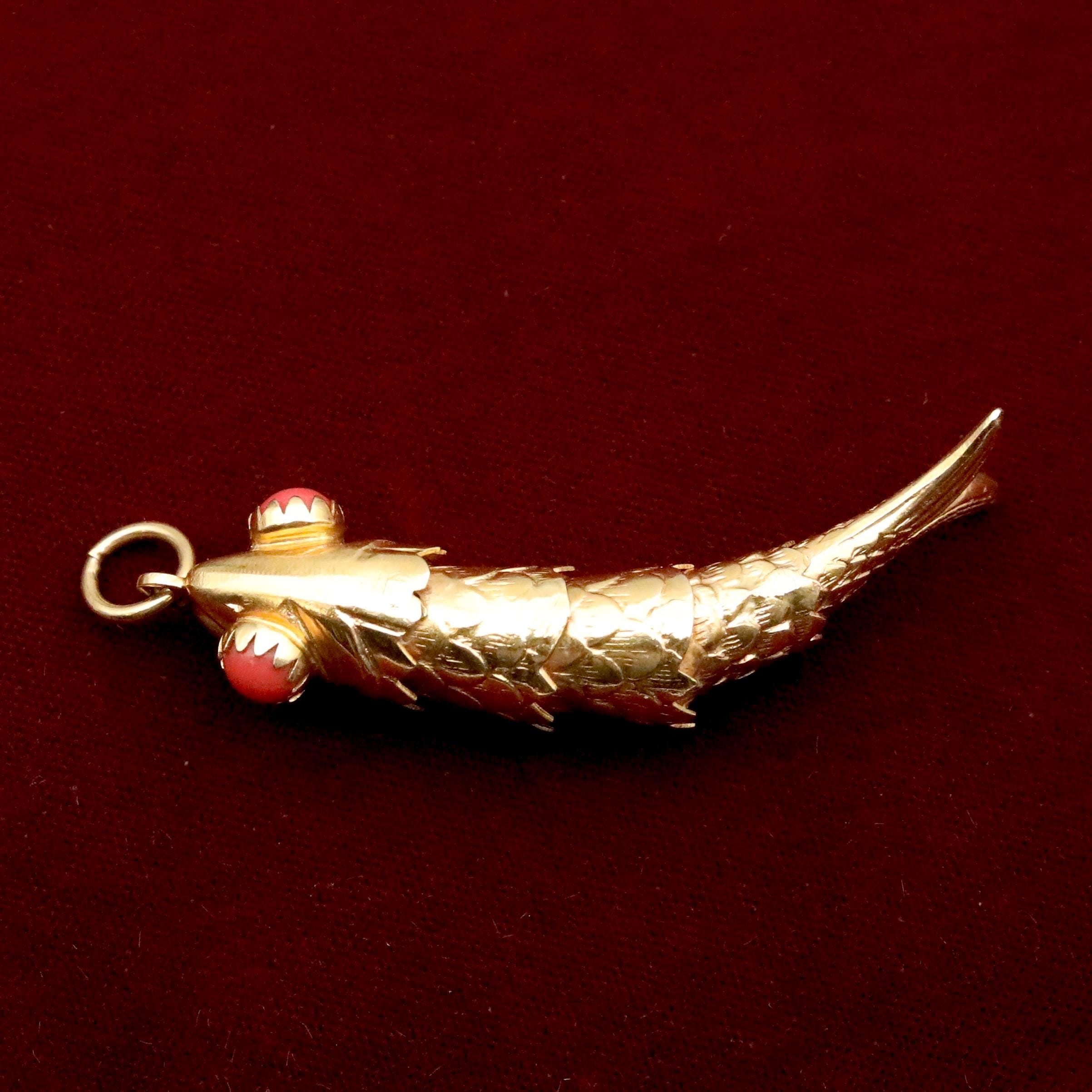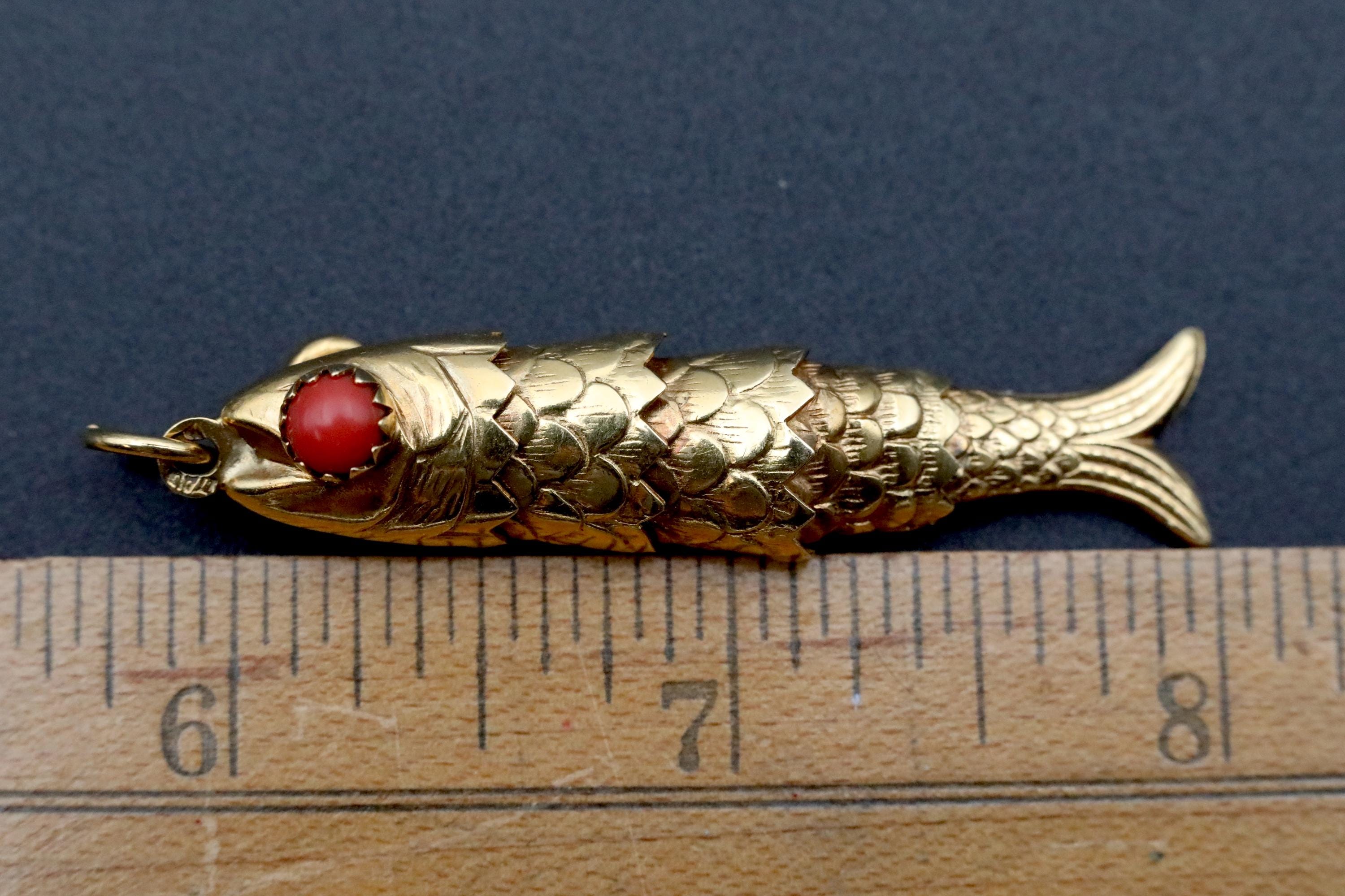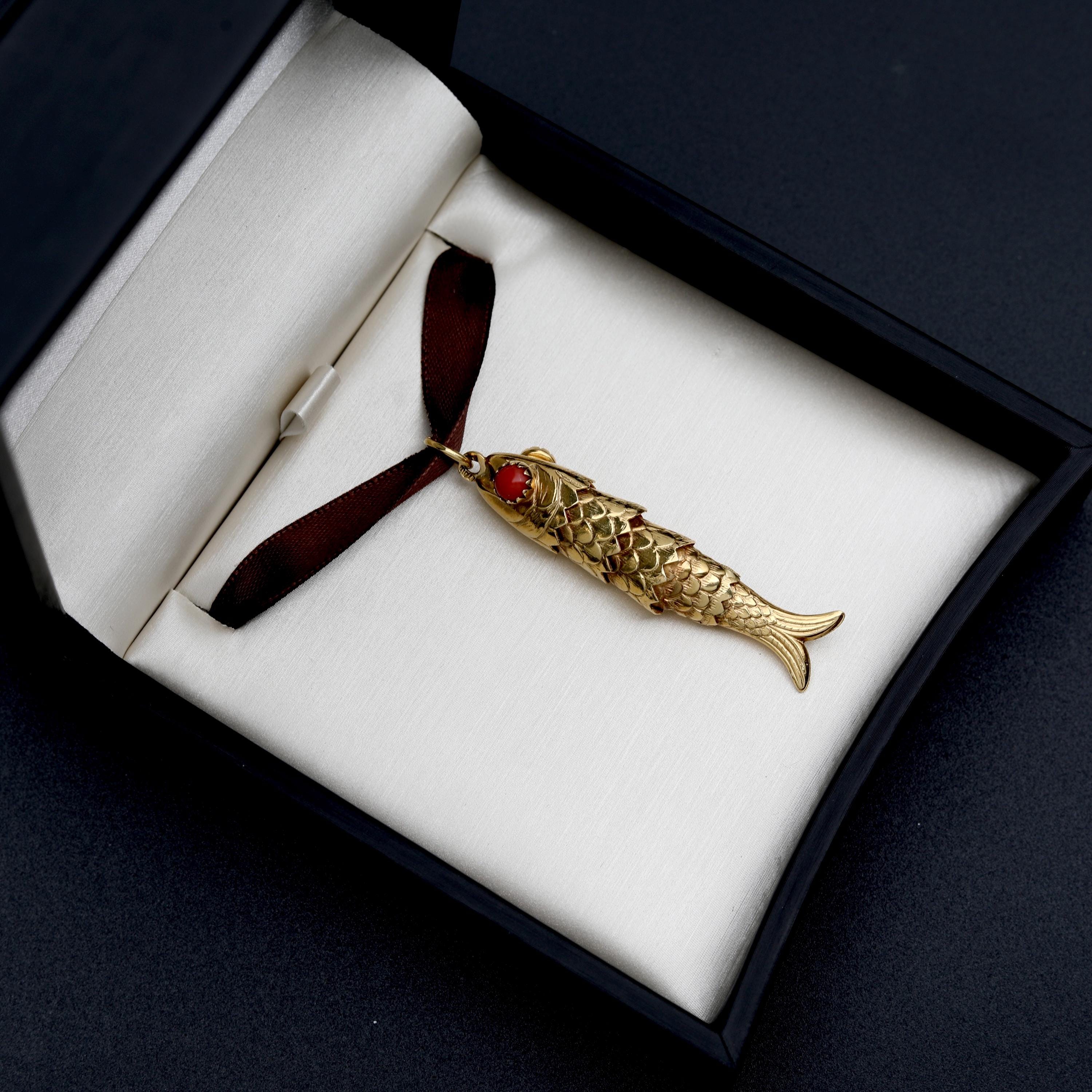 A beautifully crafted vintage 18k solid gold articulated fish pendant, made in Italy during the mid-century era and designed with exceptional movement and presence. Each individually hinged section allows the fish to sway with lifelike fluidity. The eyes are set with natural red coral cabochons, adding a vibrant pop of color and an unmistakably Italian flourish.