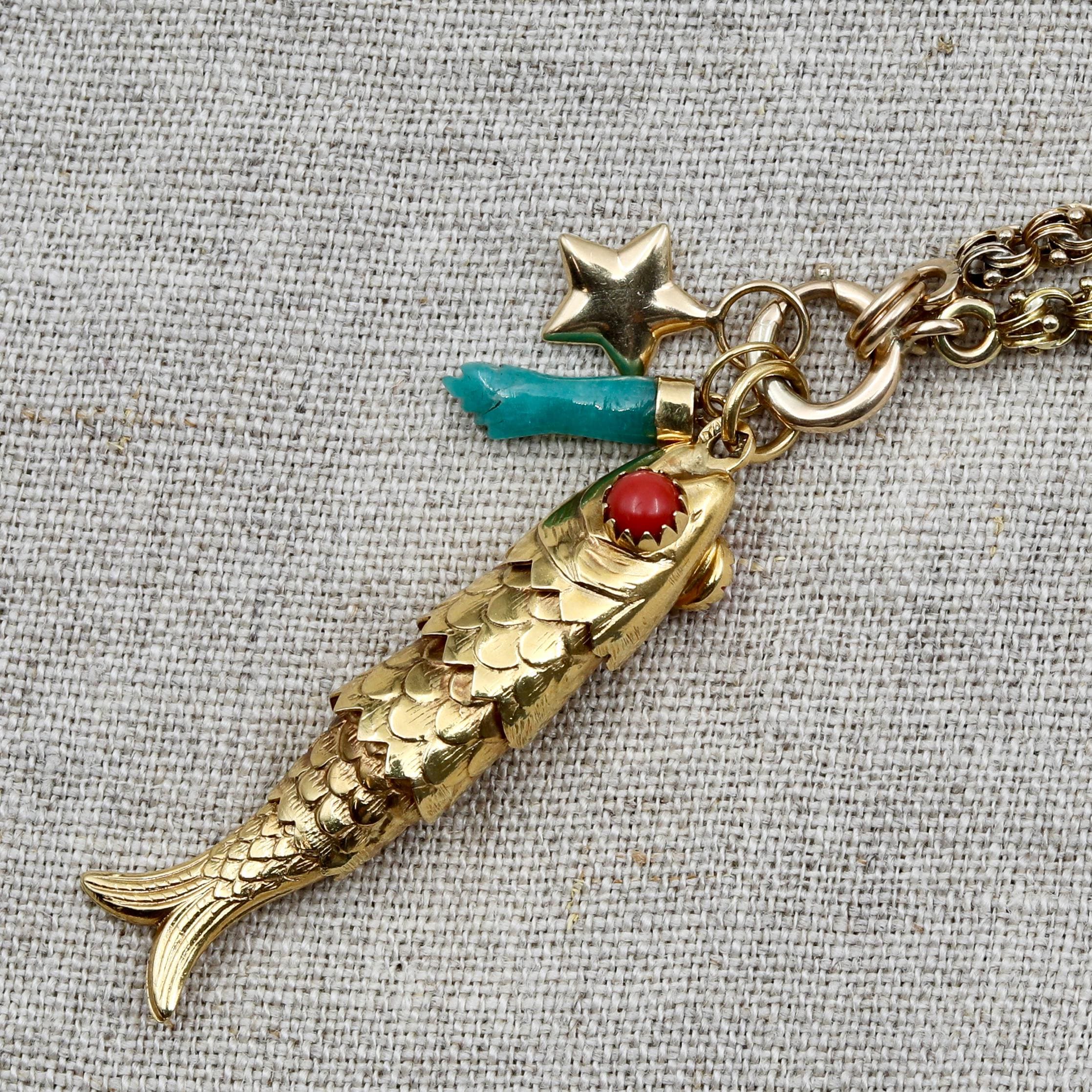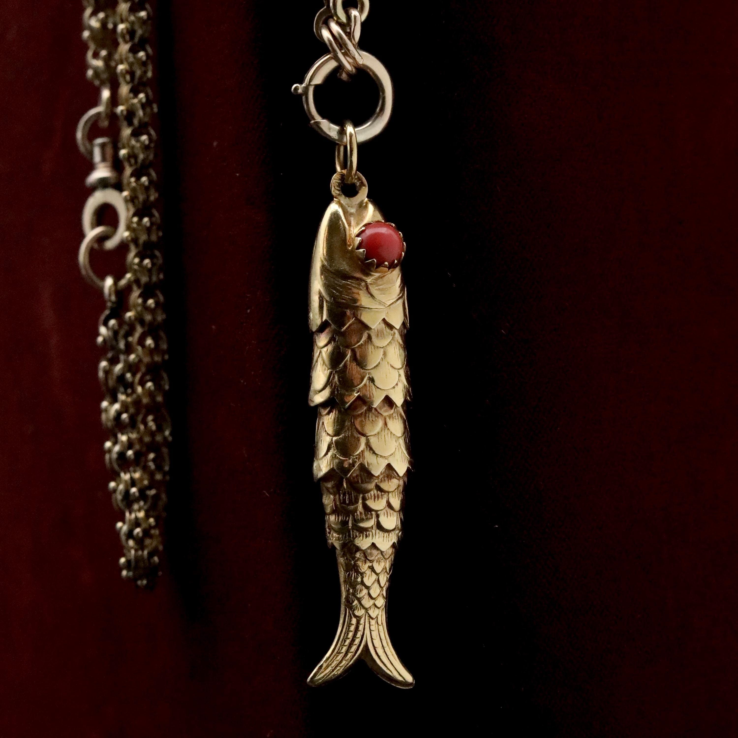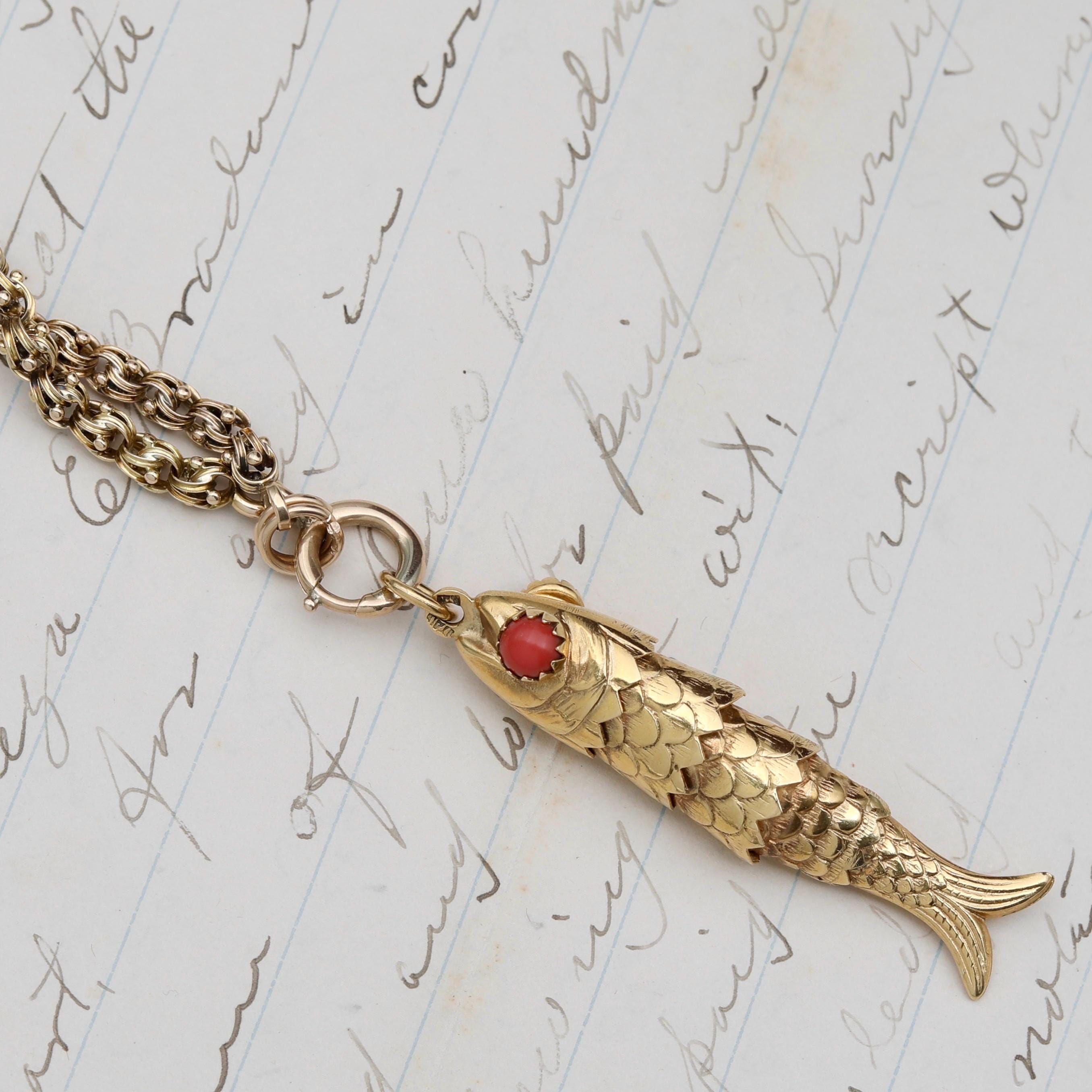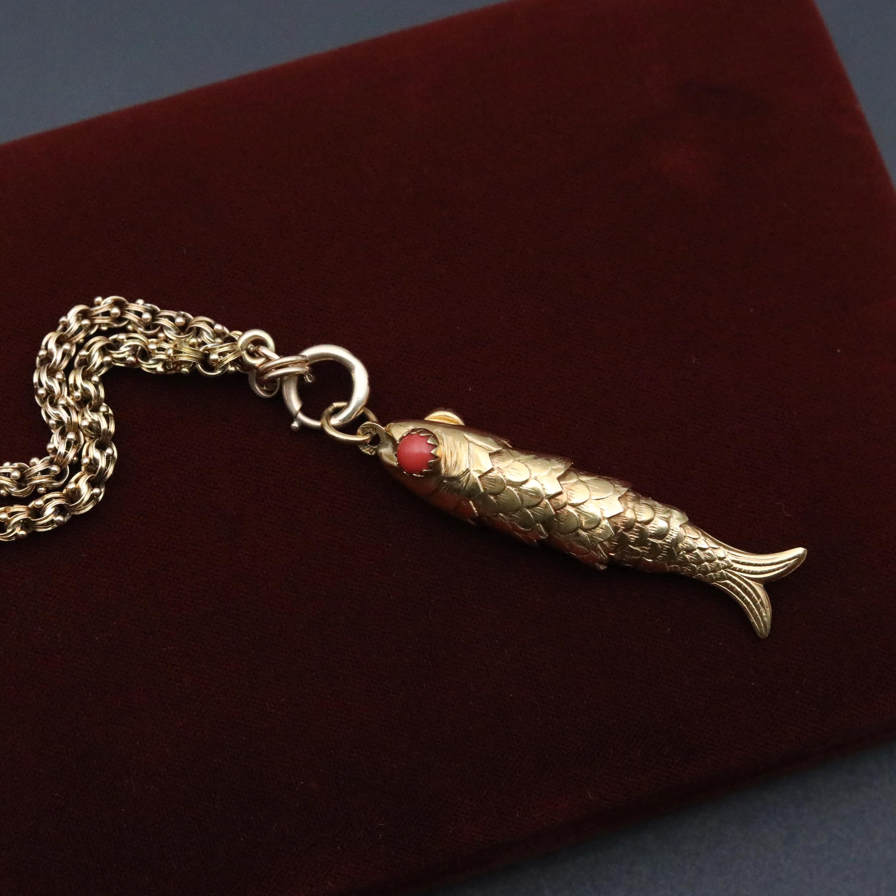 A beautifully crafted vintage 18k solid gold articulated fish pendant, made in Italy during the mid-century era and designed with exceptional movement and presence. Each individually hinged section allows the fish to sway with lifelike fluidity. The eyes are set with natural red coral cabochons, adding a vibrant pop of color and an unmistakably Italian flourish.