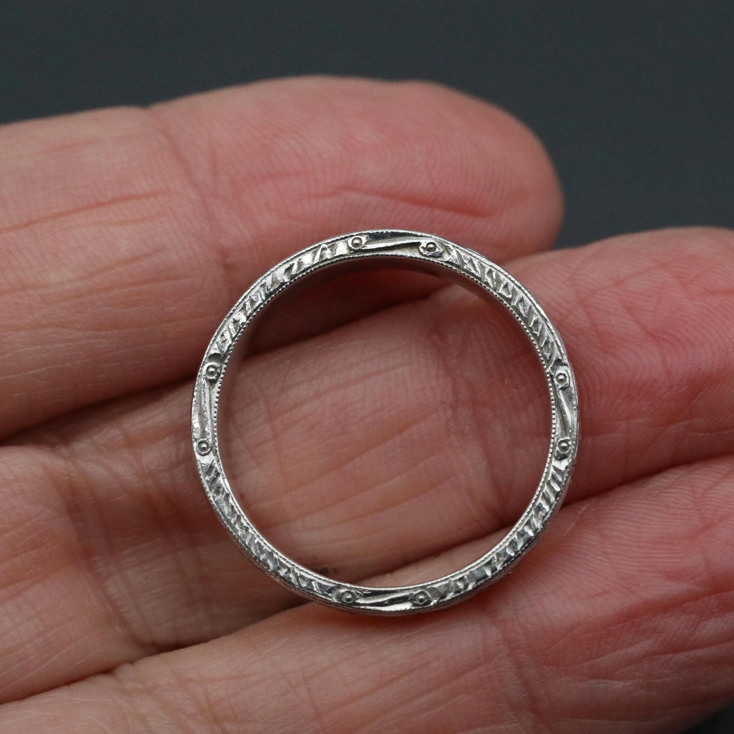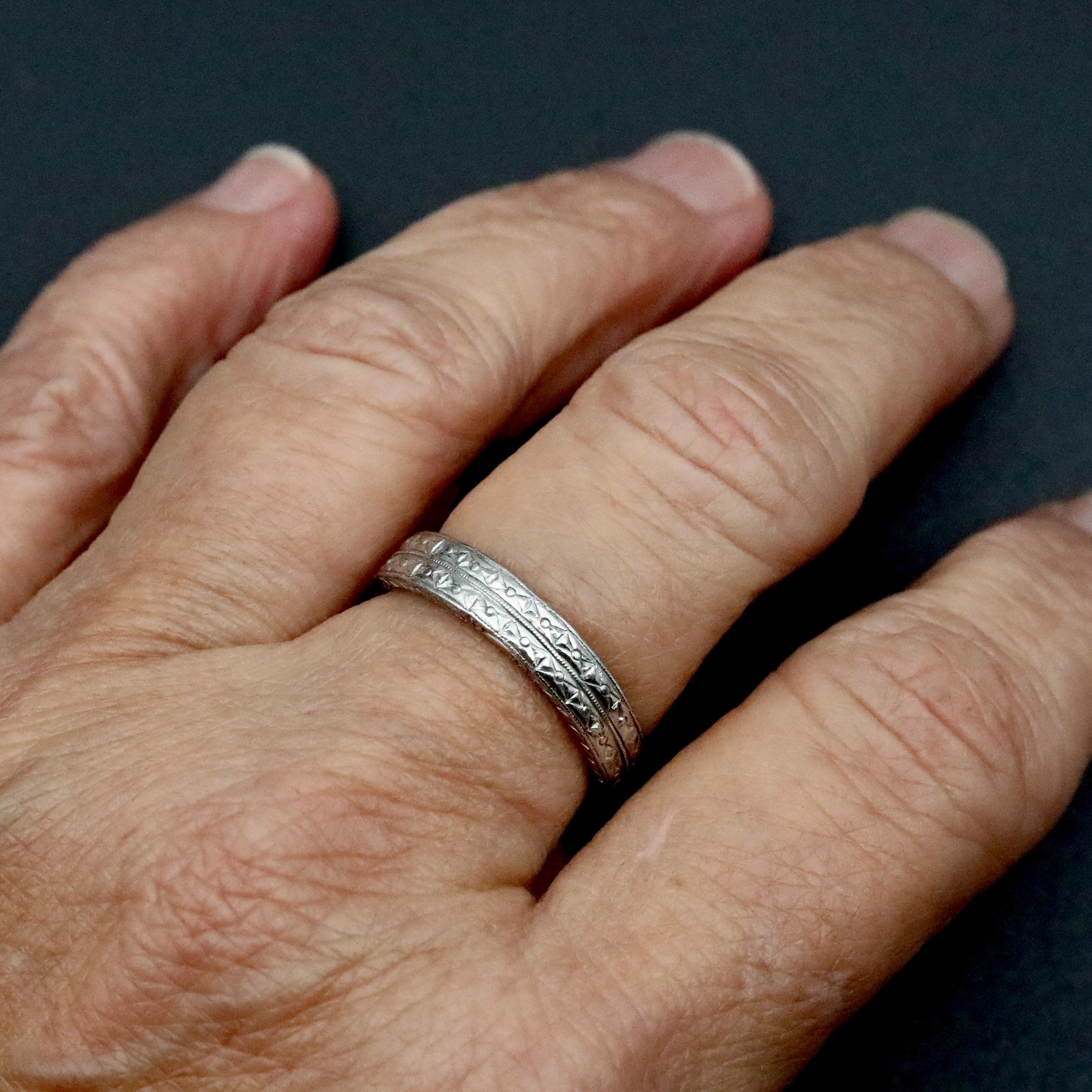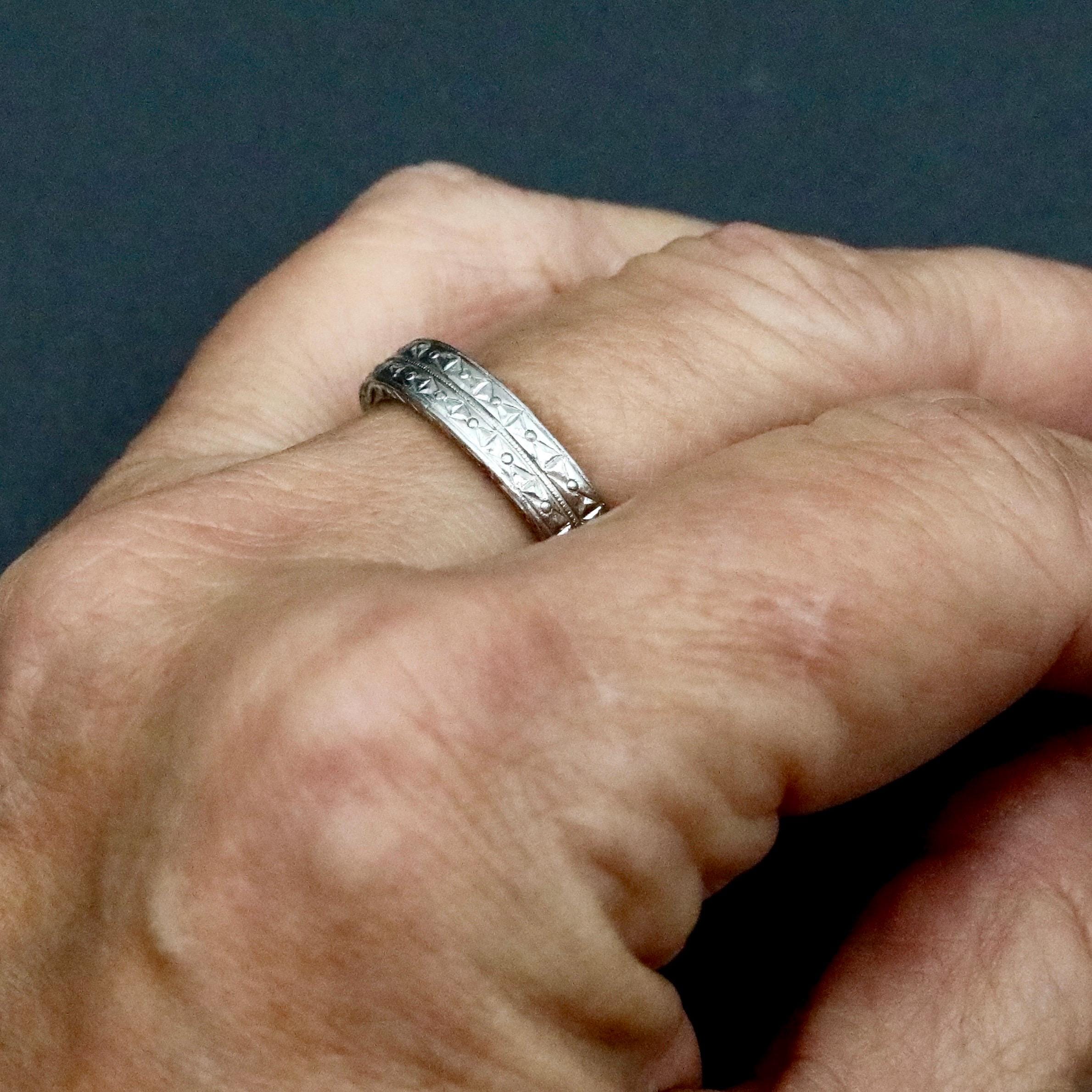 A substantial antique Edwardian wedding band in solid platinum, crafted with detailed engraving along the outer surface and sides. The pattern remains beautifully defined, showing the precision and craftsmanship typical of fine early 20th-century jewelry.
