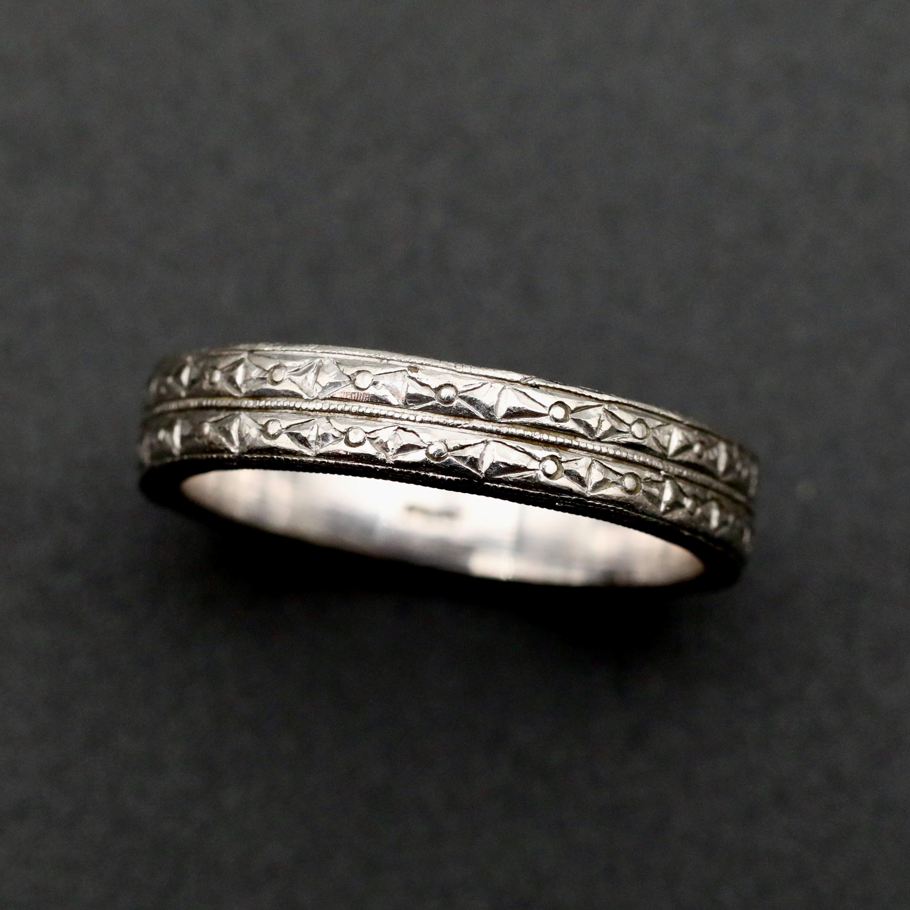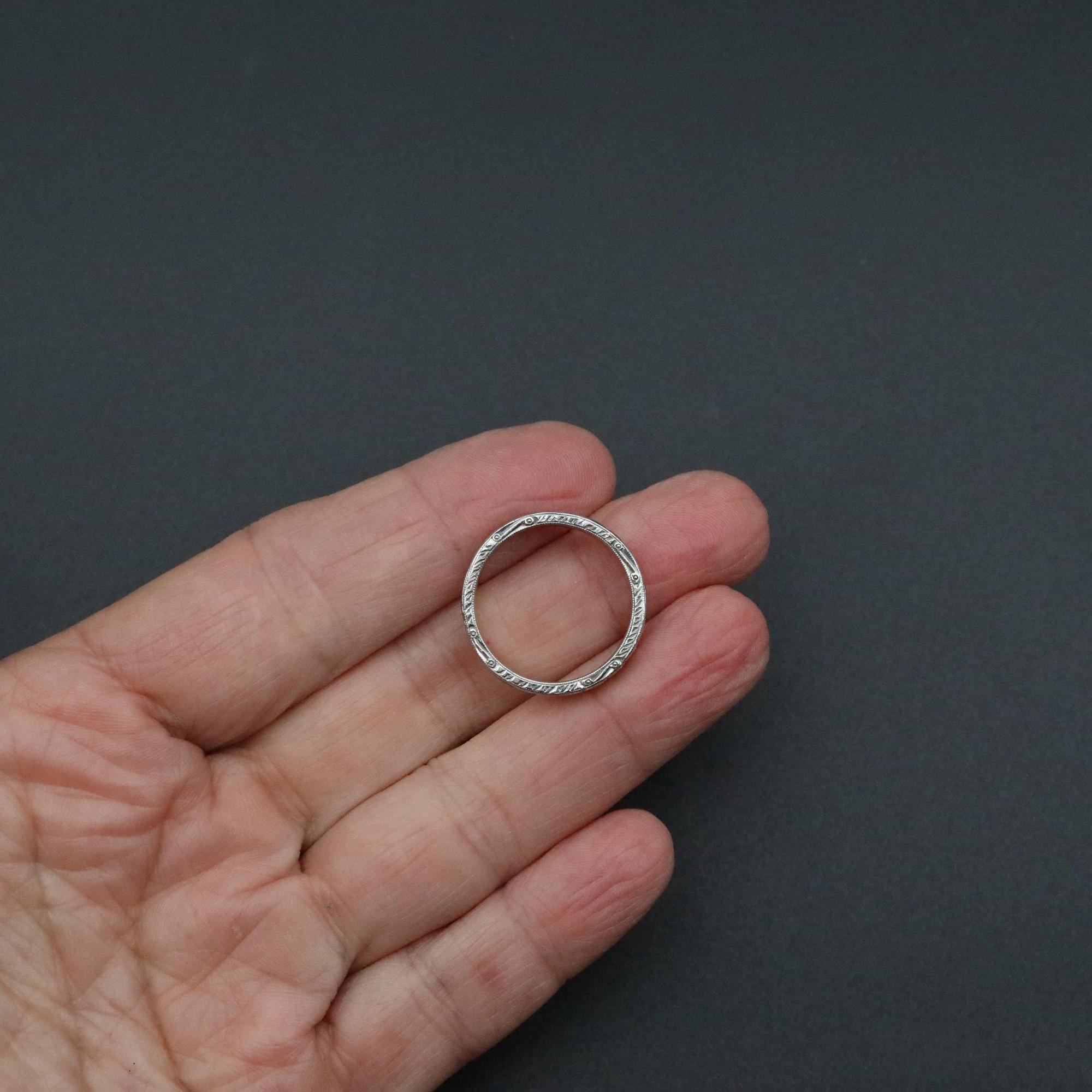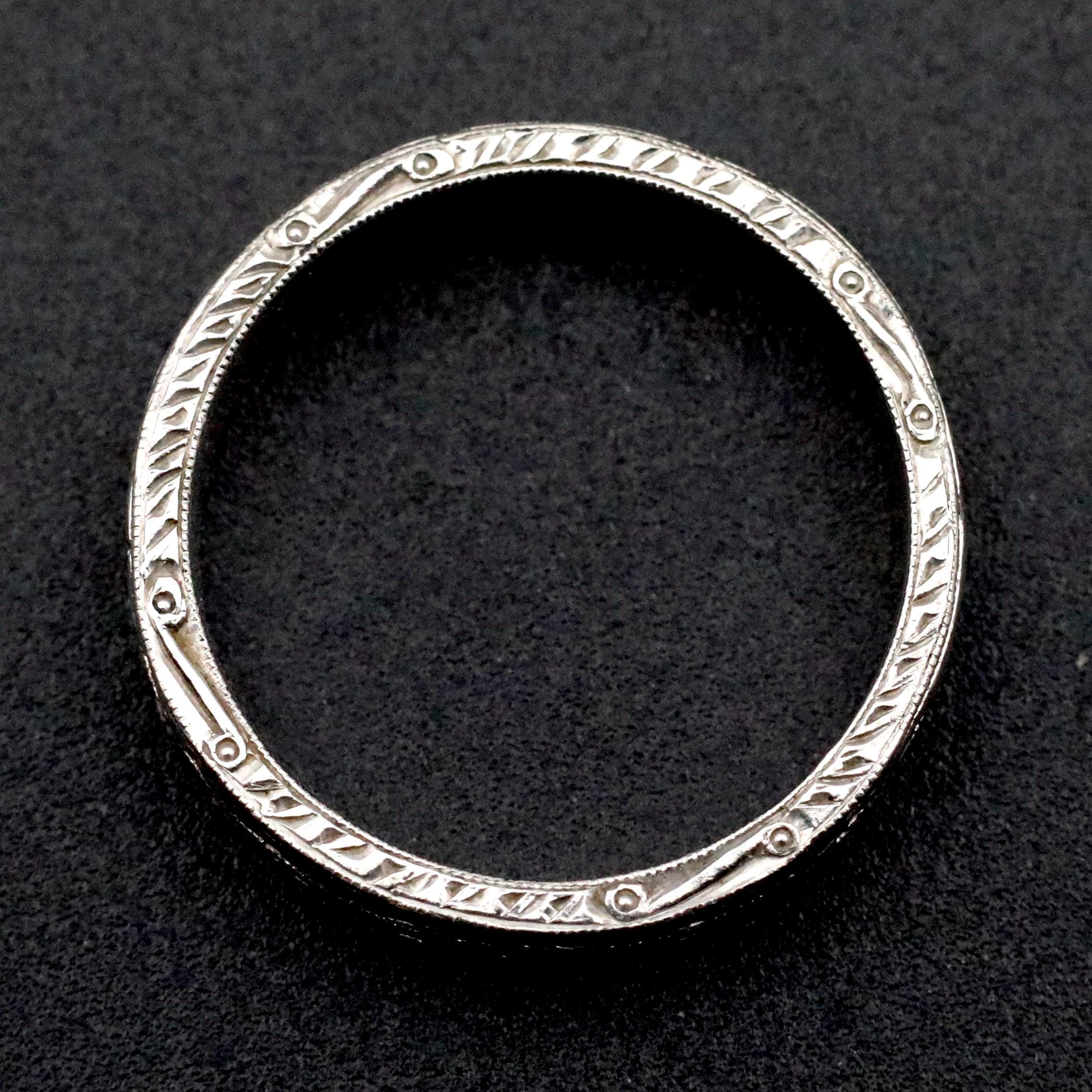 A substantial antique Edwardian wedding band in solid platinum, crafted with detailed engraving along the outer surface and sides. The pattern remains beautifully defined, showing the precision and craftsmanship typical of fine early 20th-century jewelry.