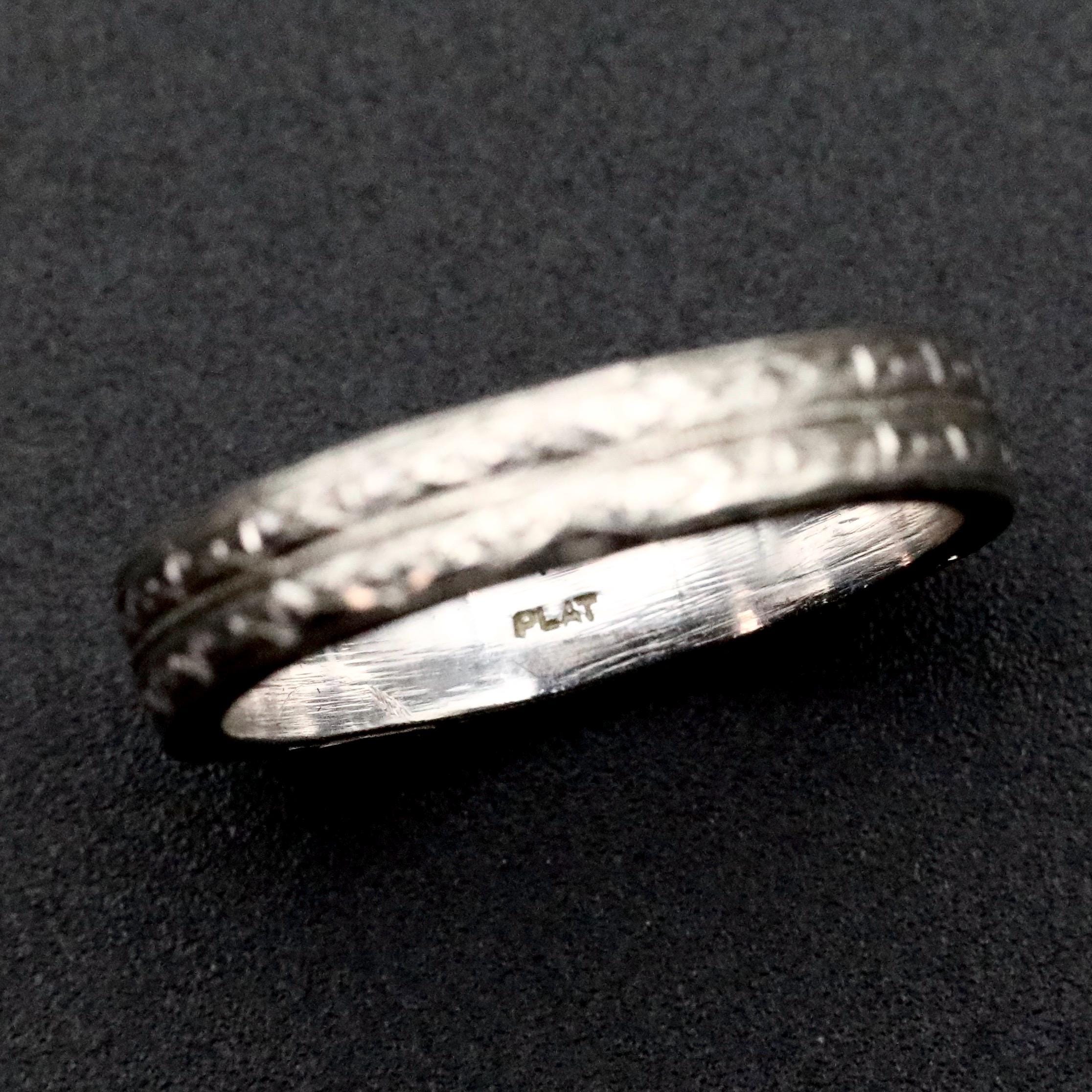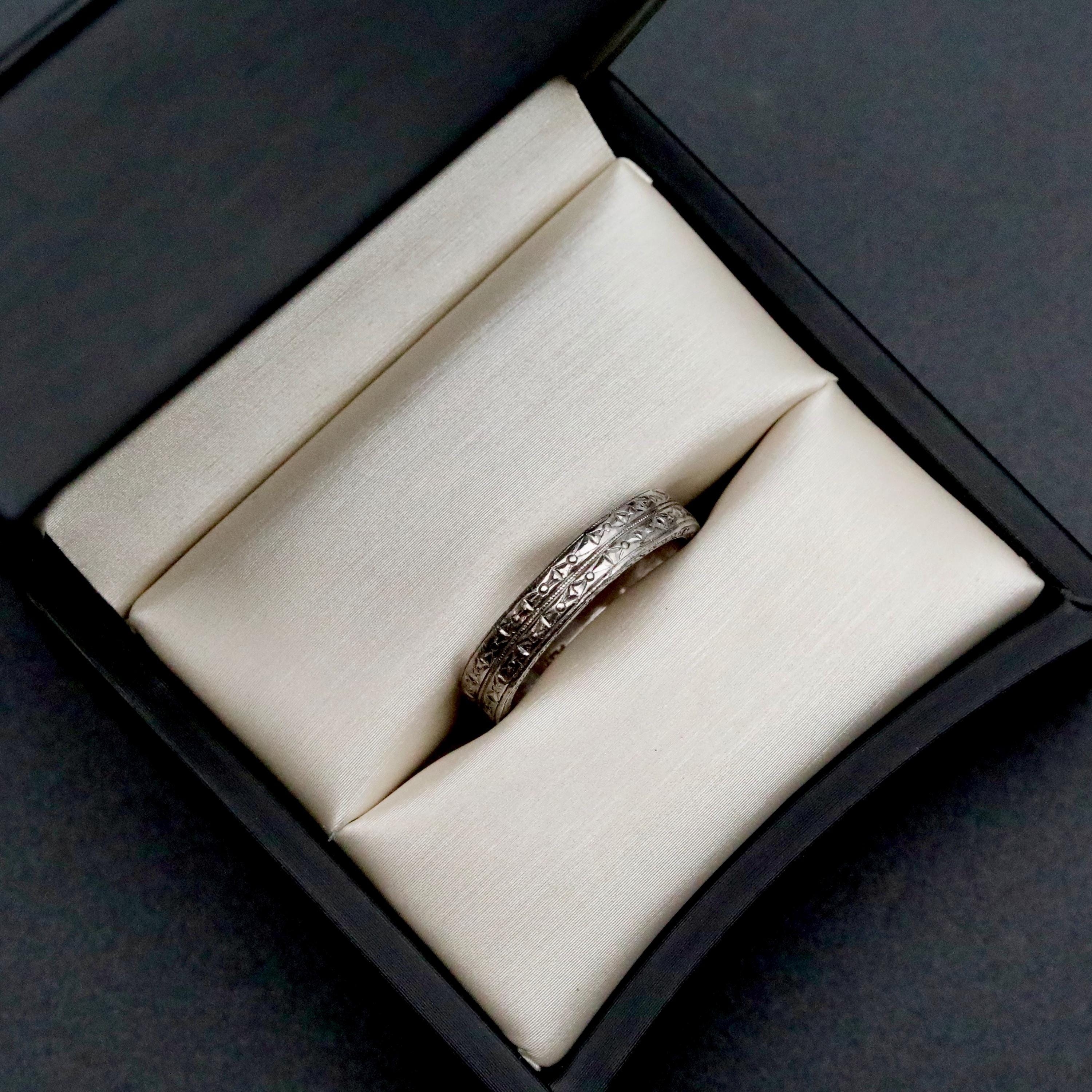 The ring is purity-marked “PLAT” and has been professionally tested as solid platinum. Its refined detail and weight give it both presence and permanence, qualities that make it a meaningful choice as a wedding band or heirloom piece.