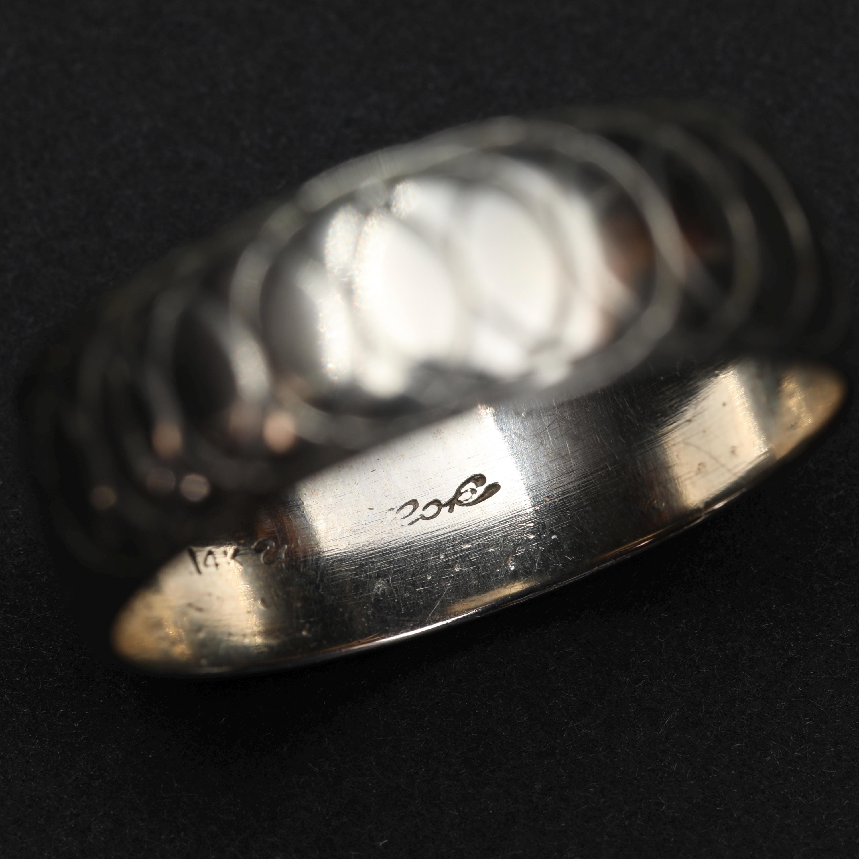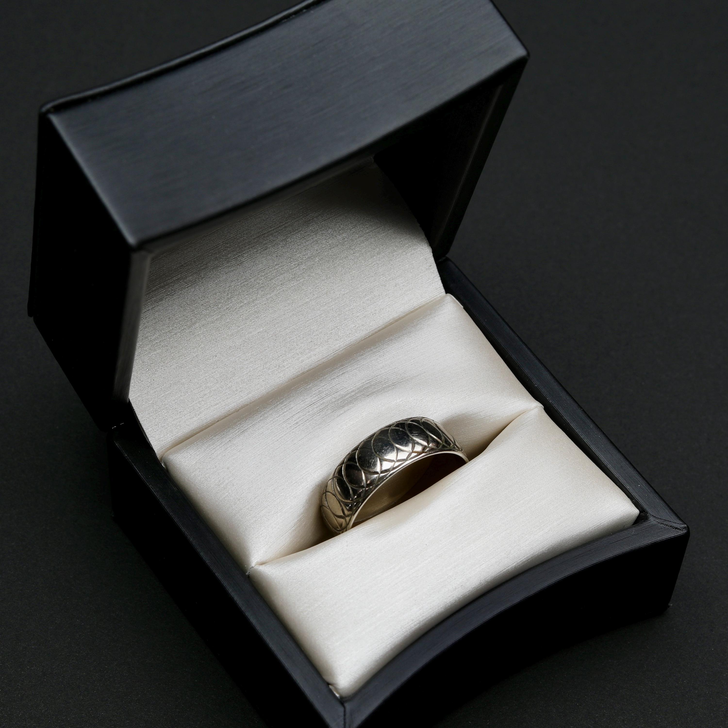 A solid 14k white gold men’s wedding band, crafted in the late 1980s in a notably wide, heavy profile typical of the period. Measuring 7.85mm in width and weighing 7 grams, this ring has substantial presence and a clean, architectural feel.