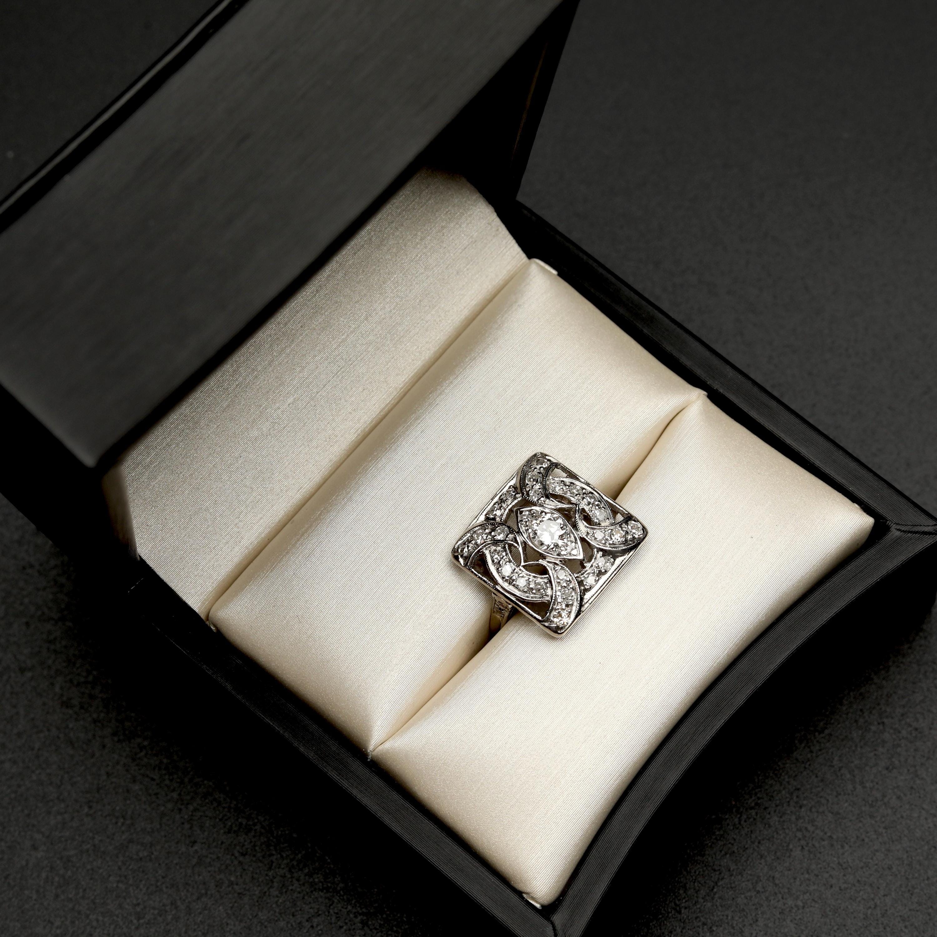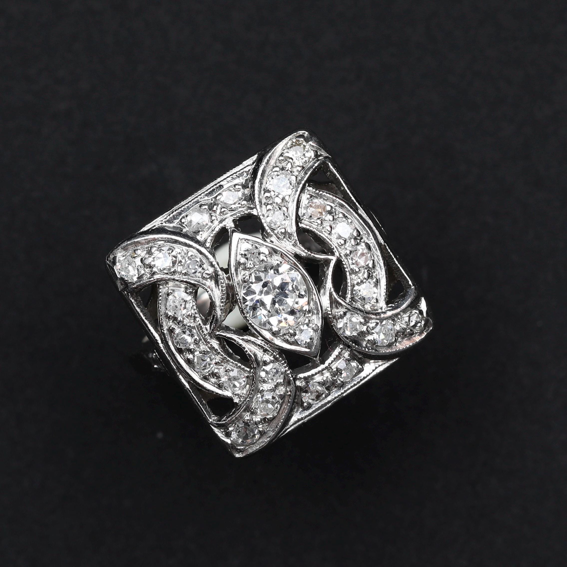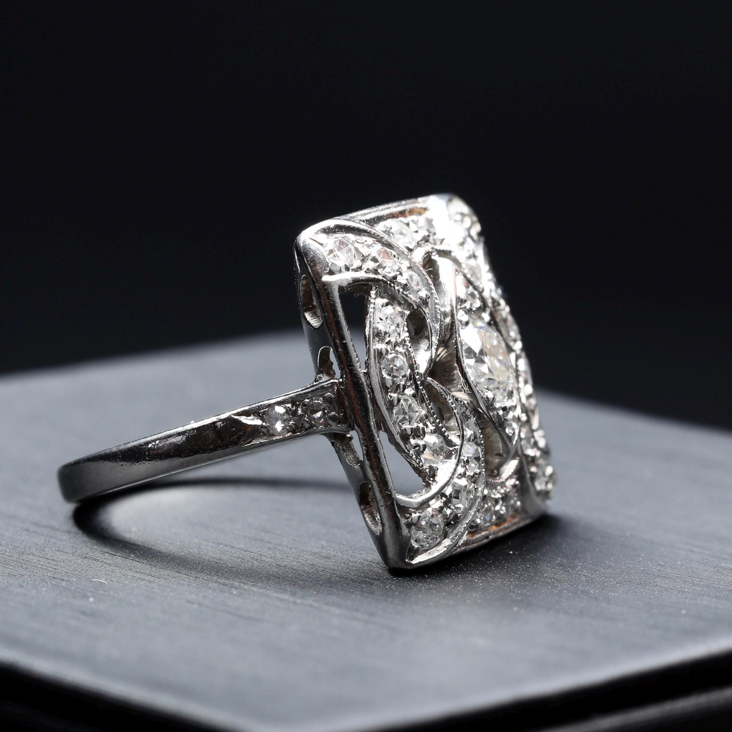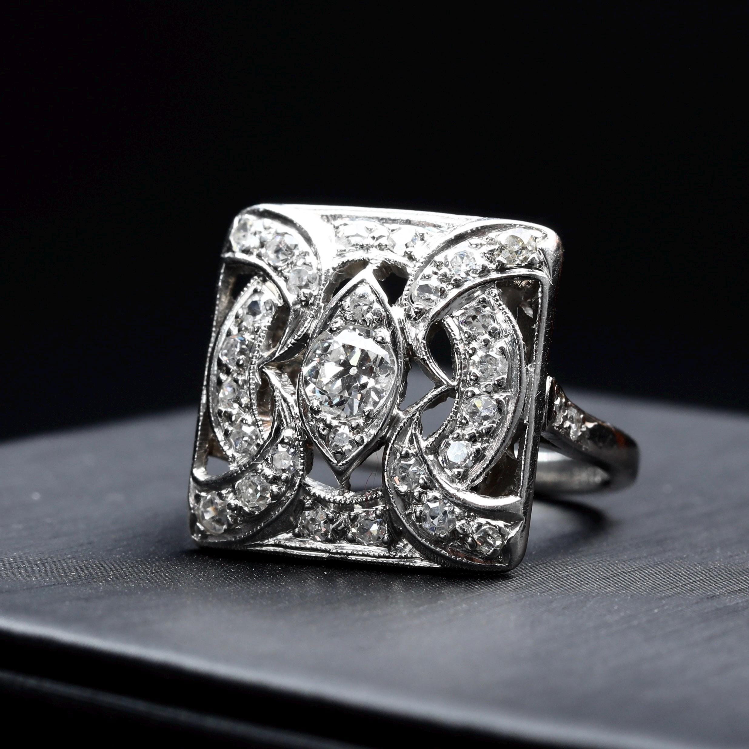 An exceptional example of Art Deco design, this platinum diamond ring dates to the 1920s and showcases the crisp geometry and hand craftsmanship that define the era. The ring is centered with an Old European cut diamond and surrounded by a field of single-cut Old European diamonds, creating a sparkling, architectural presence on the hand. Elegant in proportion yet substantial in feel.