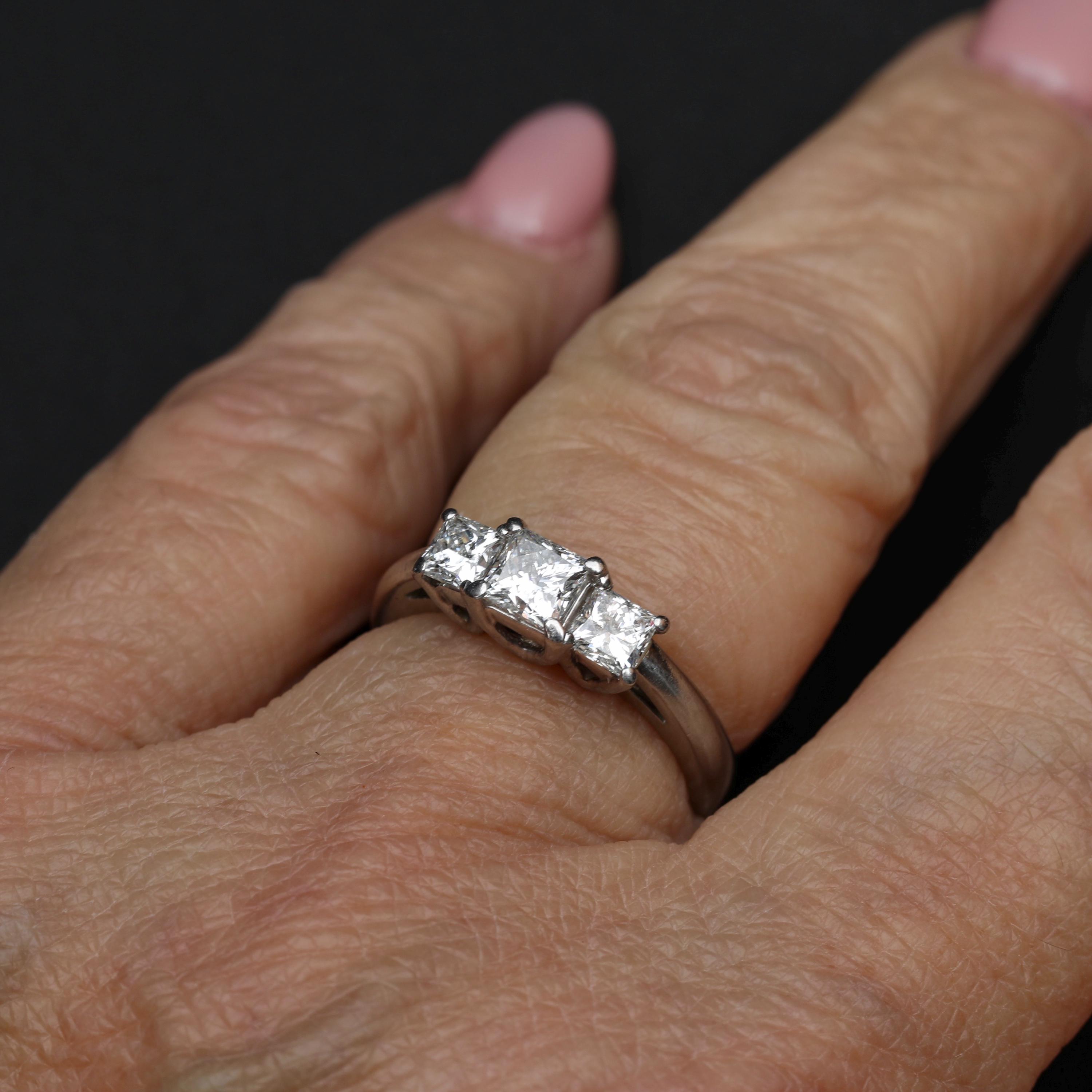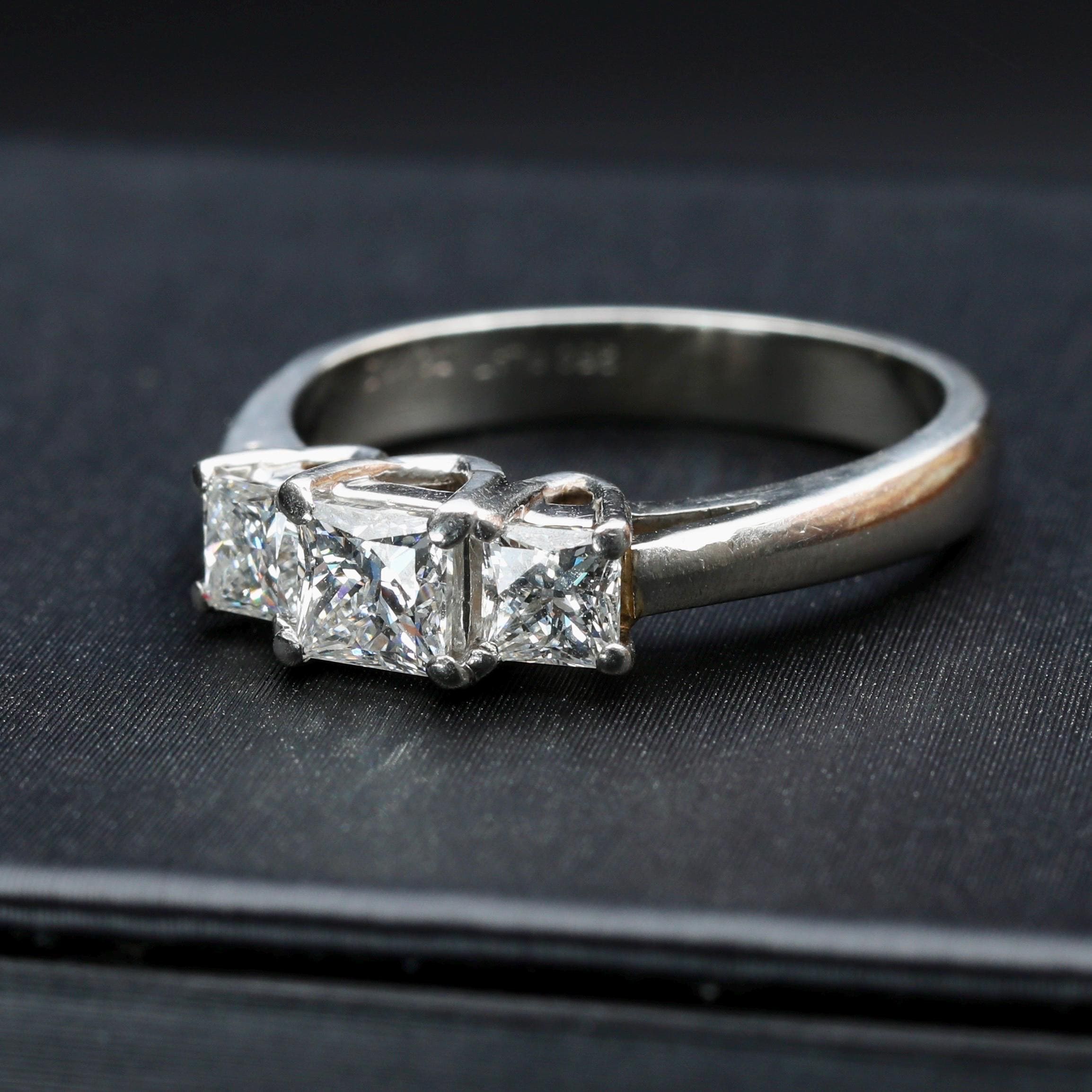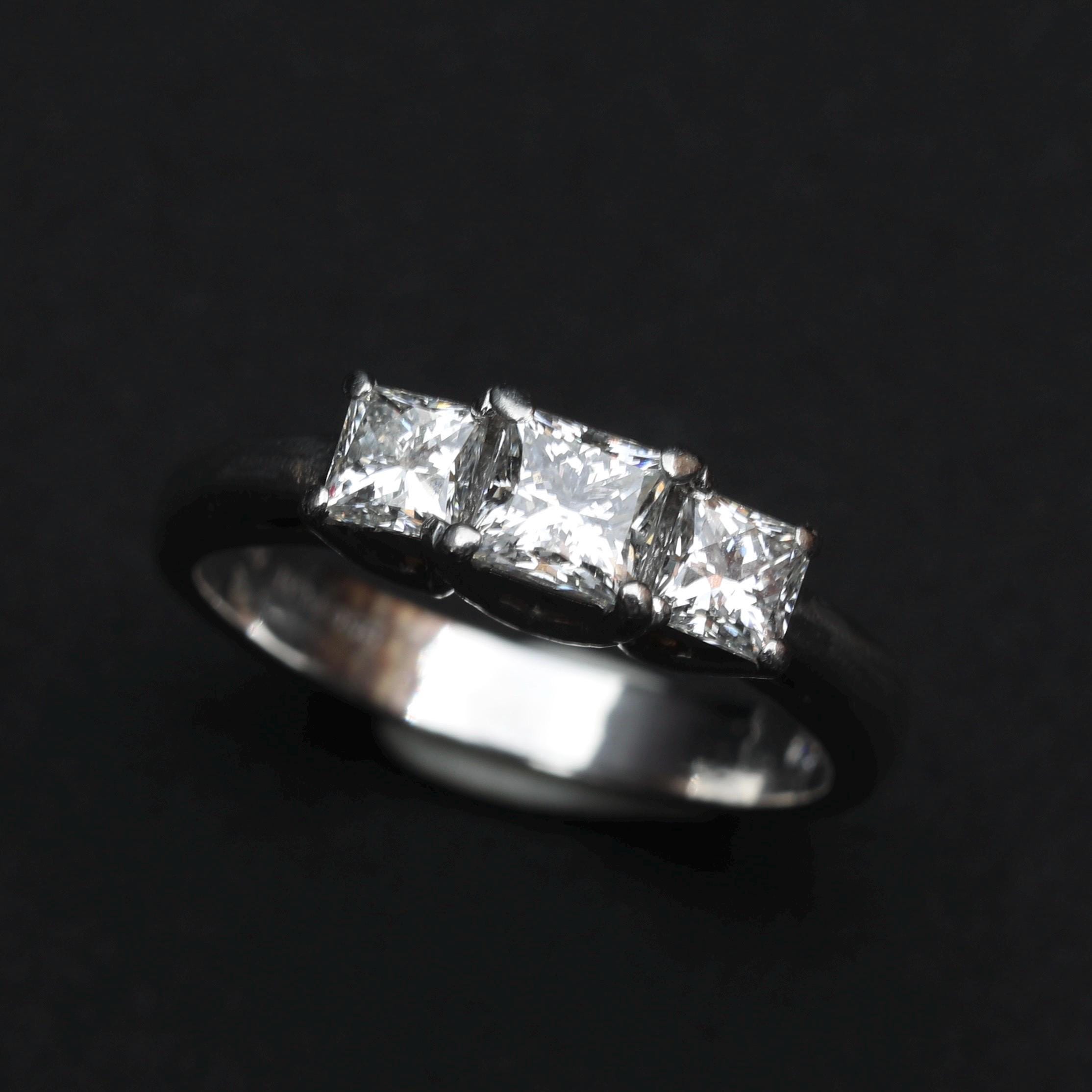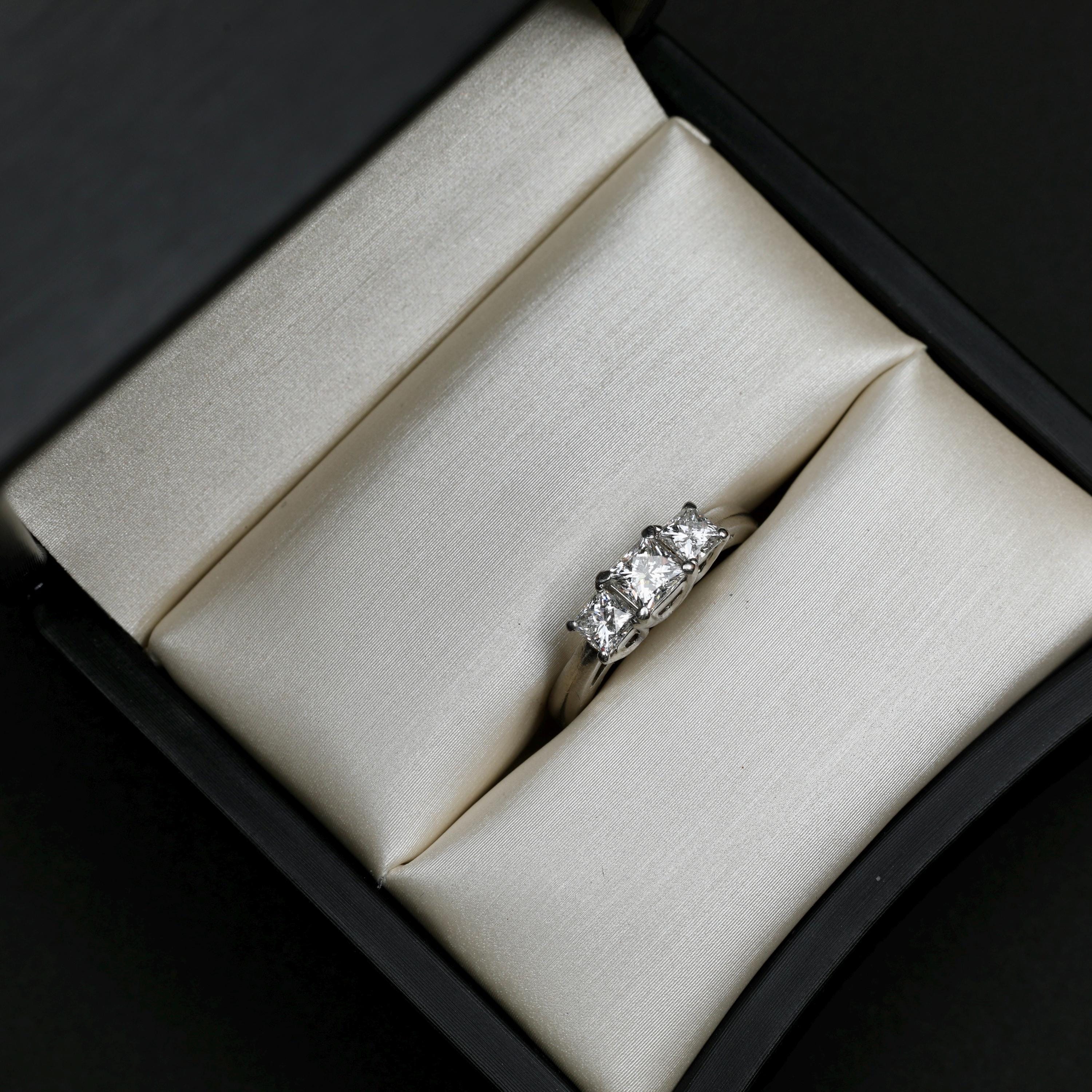 A platinum three-stone diamond ring set with LEO® cut princess diamonds, designed with clean architectural lines and excellent light performance. The classic three-stone composition symbolizes past, present, and future, making this ring well suited for an engagement, anniversary, or meaningful milestone.