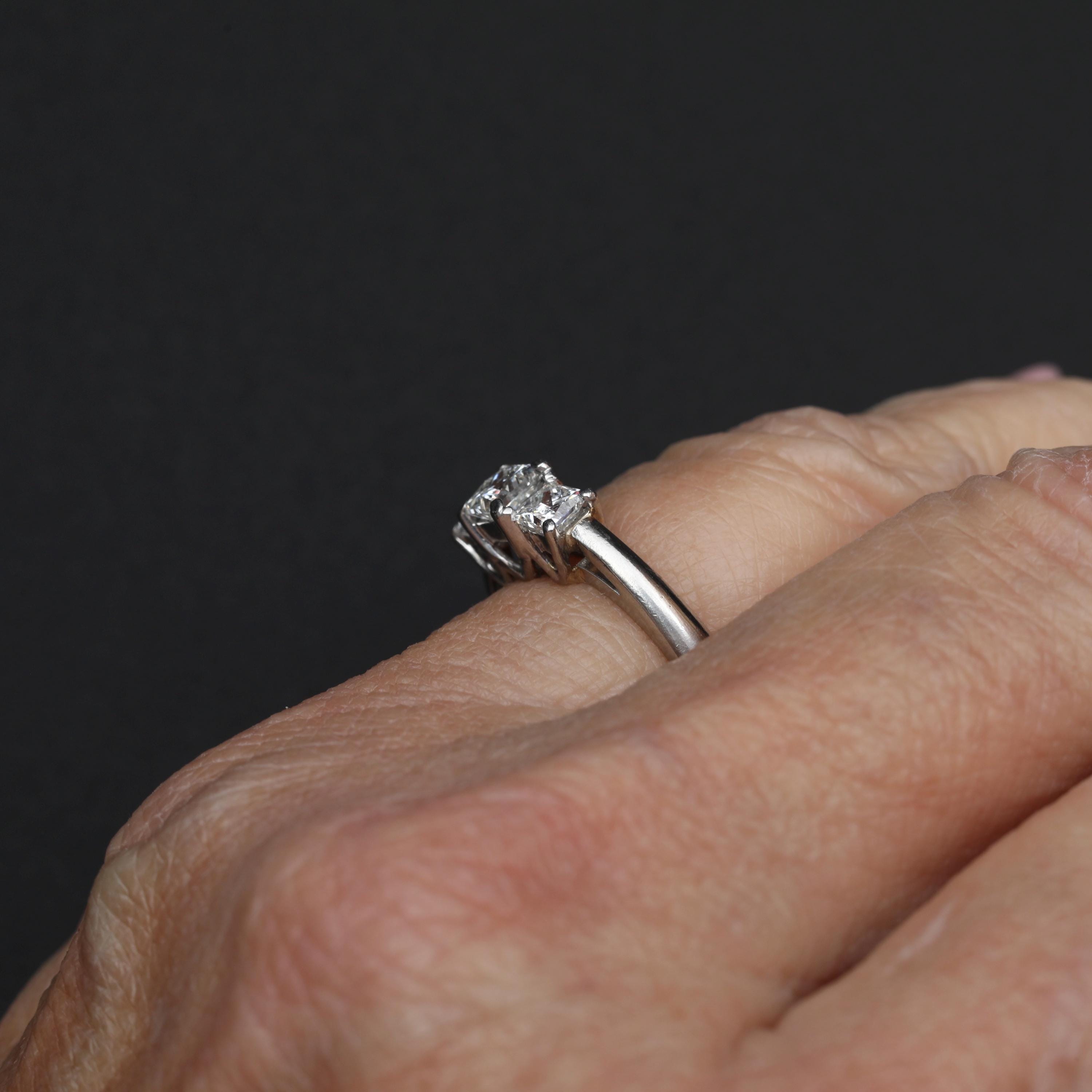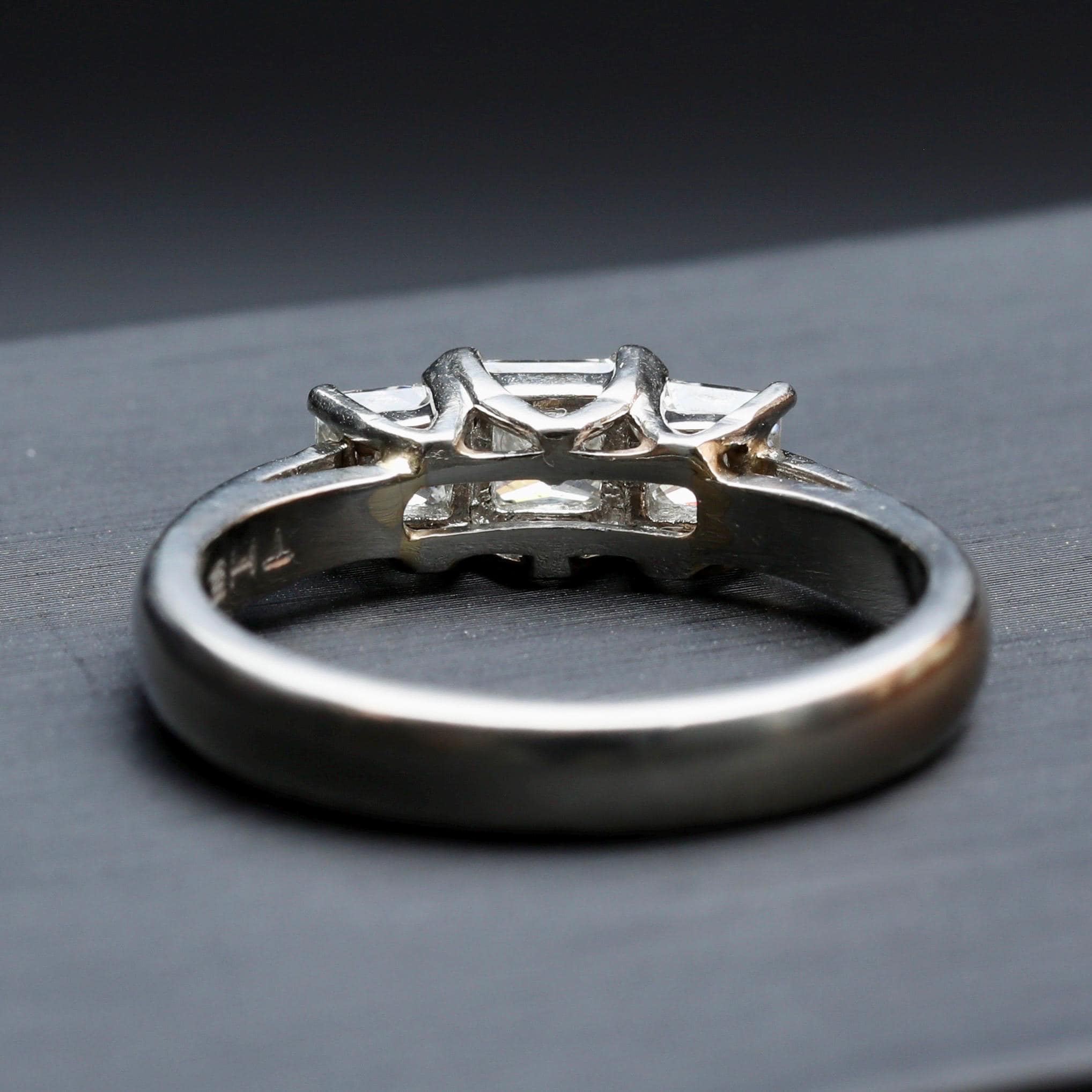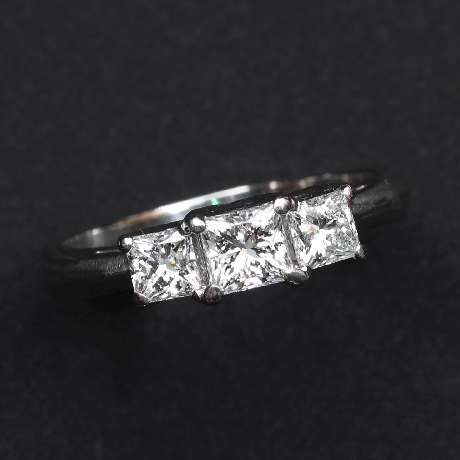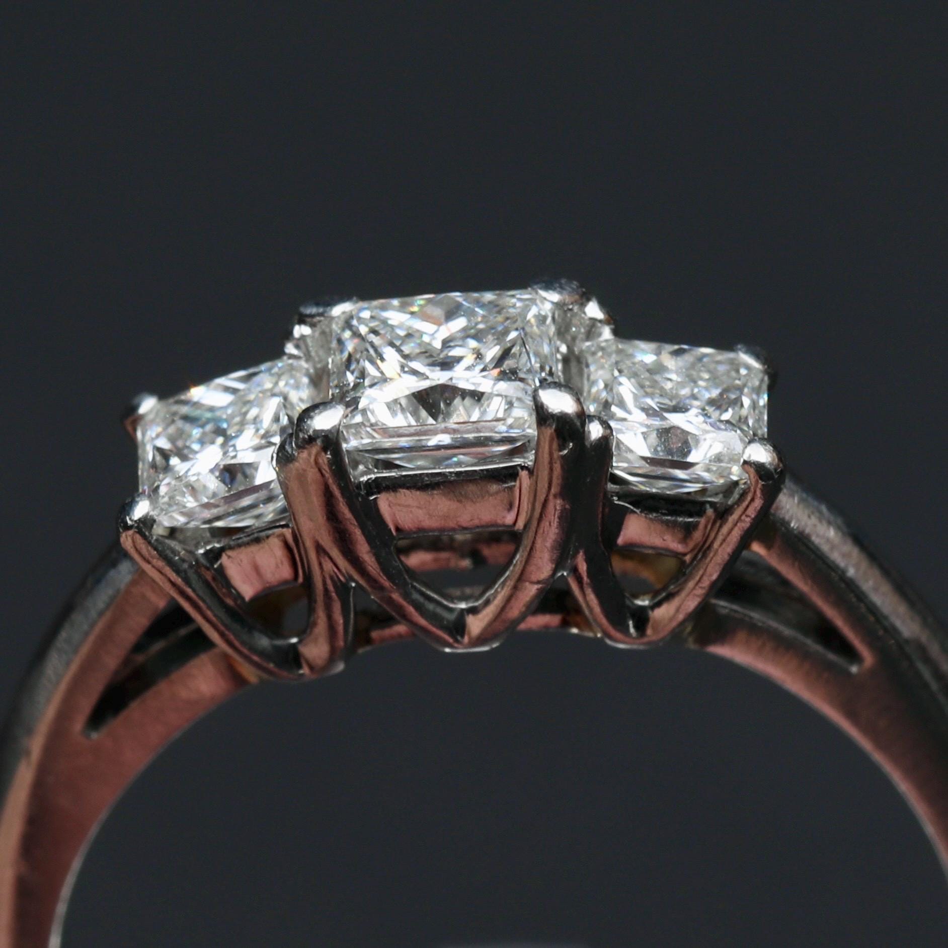 A platinum three-stone diamond ring set with LEO® cut princess diamonds, designed with clean architectural lines and excellent light performance. The classic three-stone composition symbolizes past, present, and future, making this ring well suited for an engagement, anniversary, or meaningful milestone.