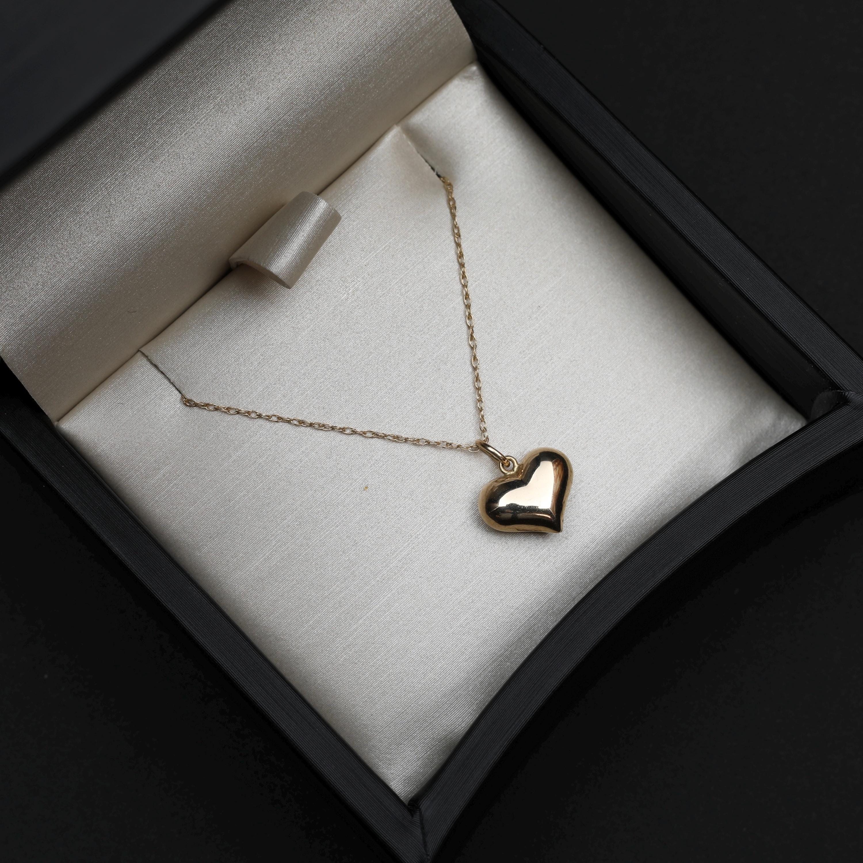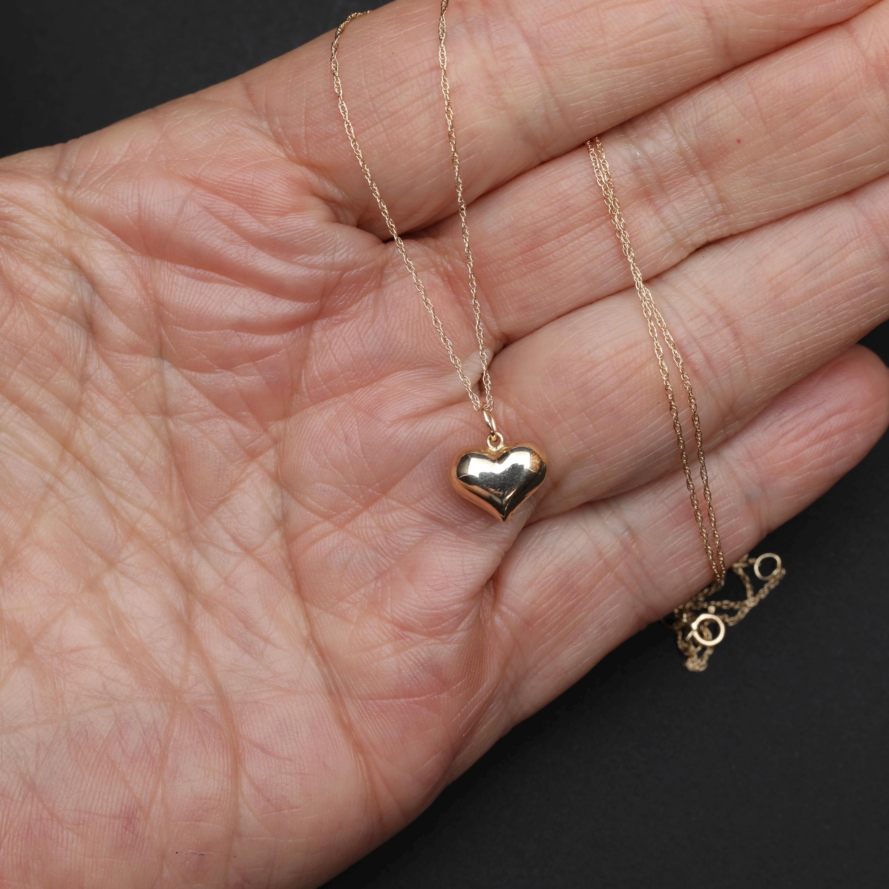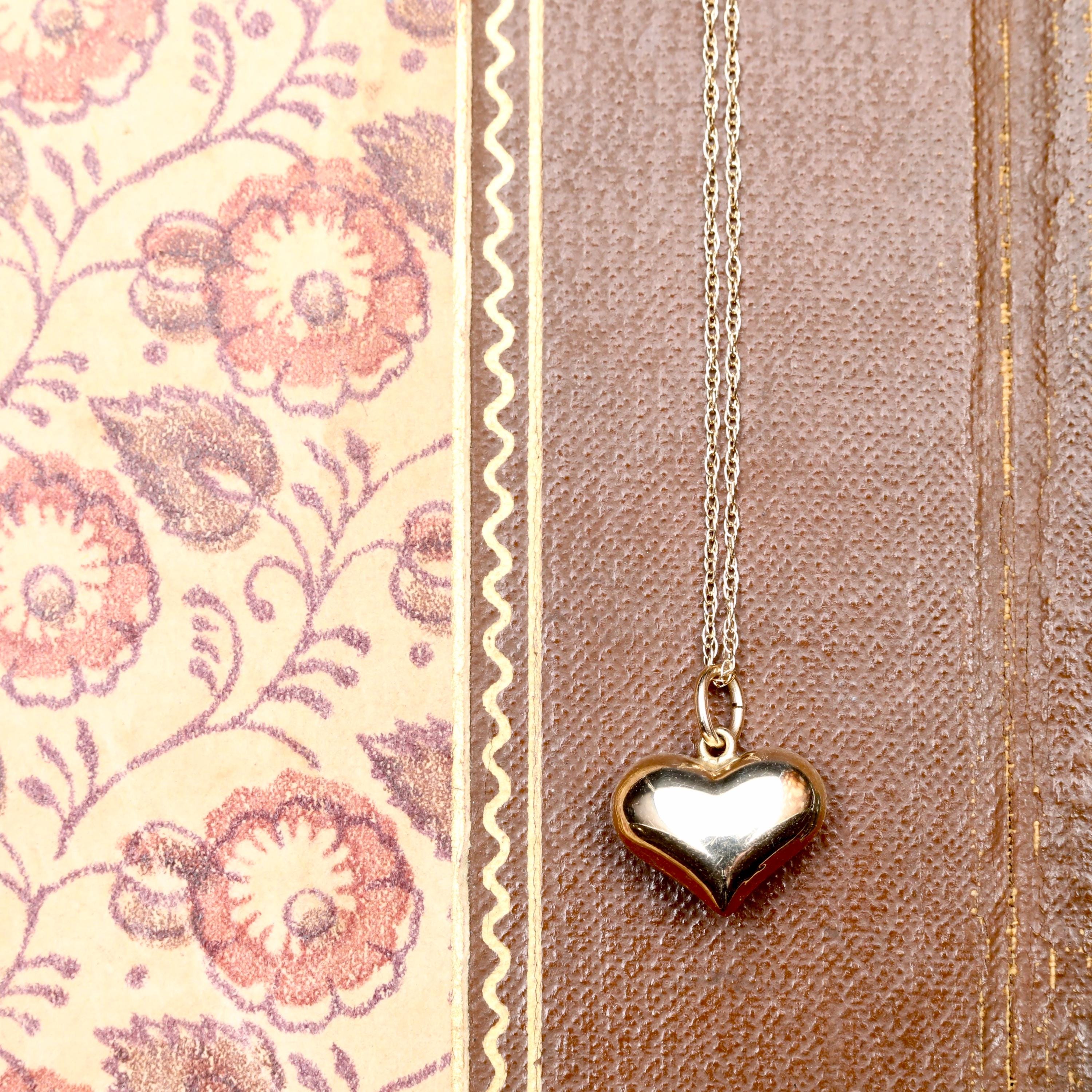 This vintage puffy heart pendant necklace is crafted in solid 14k gold and dates to the 1980s. The heart charm is hollow in construction, giving it gentle volume and a softly rounded form while remaining lightweight and easy to wear. Its petite scale makes it well suited for everyday wear or thoughtful gifting.