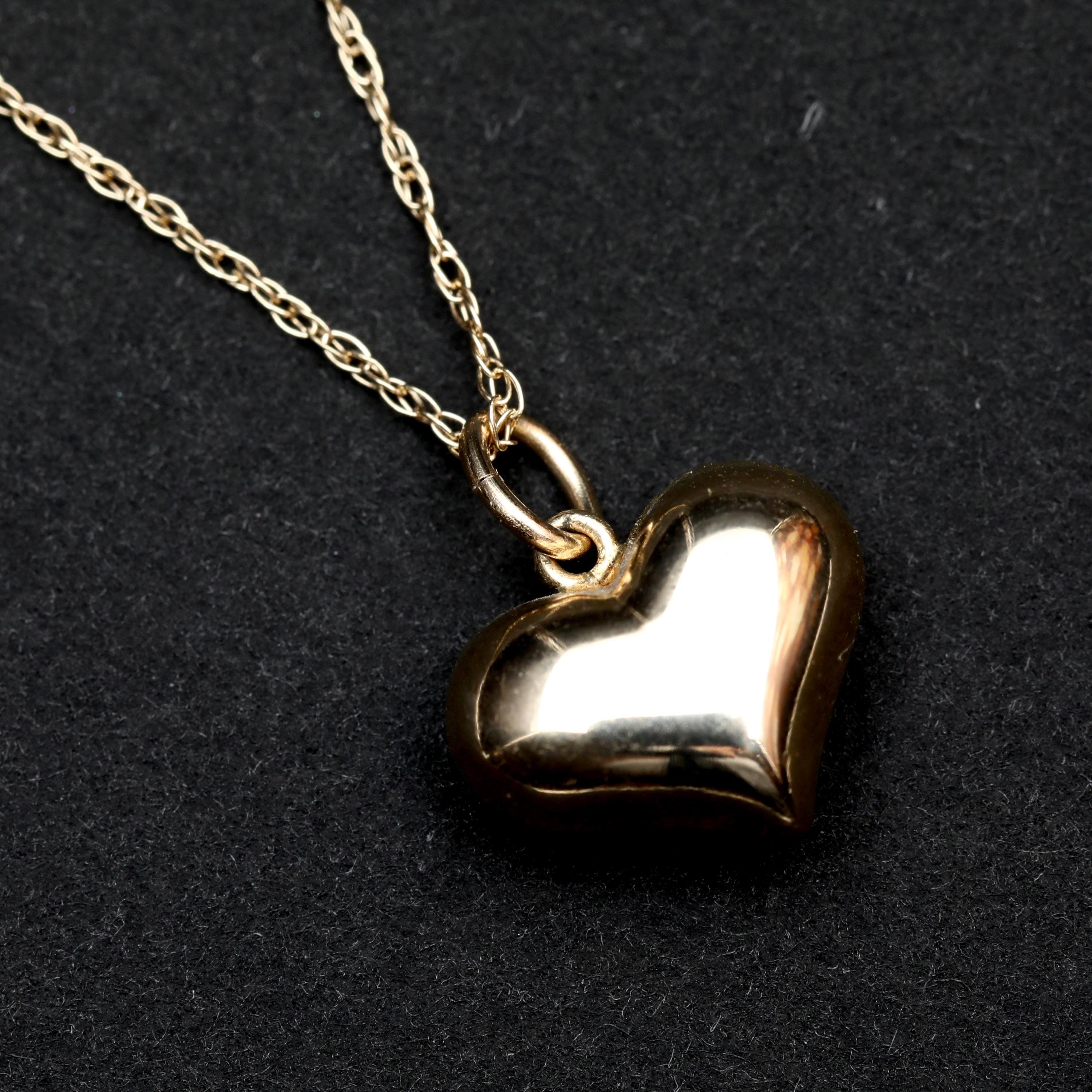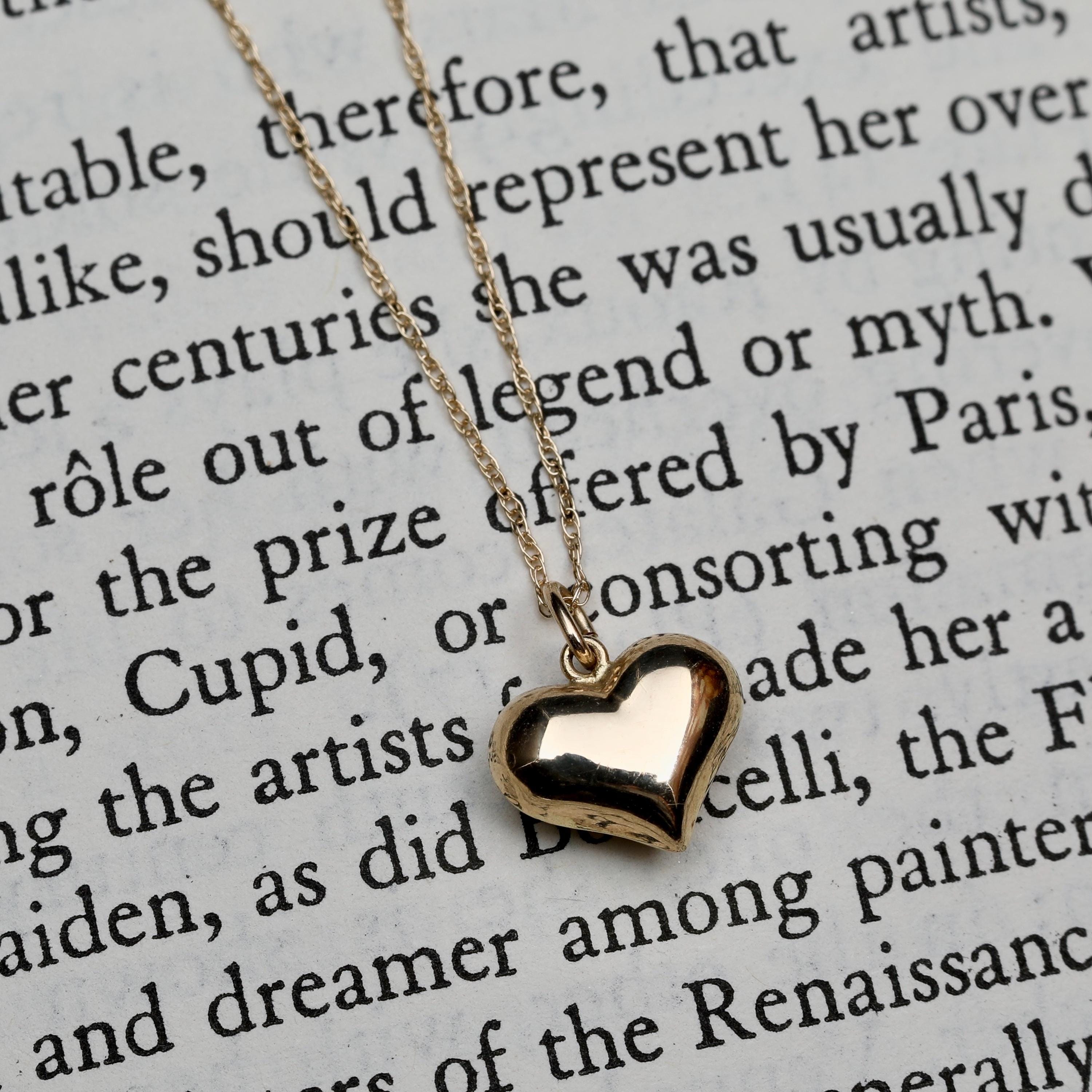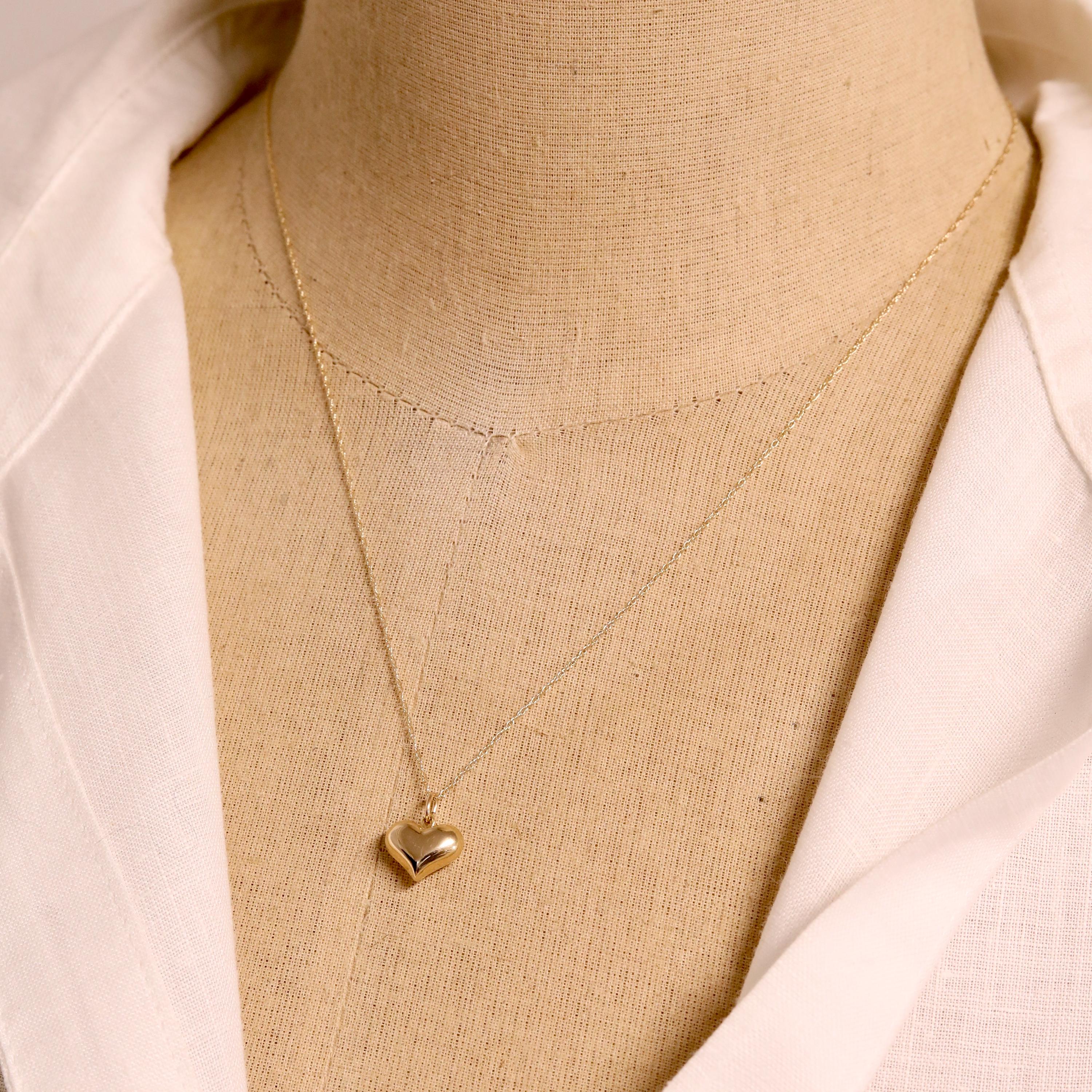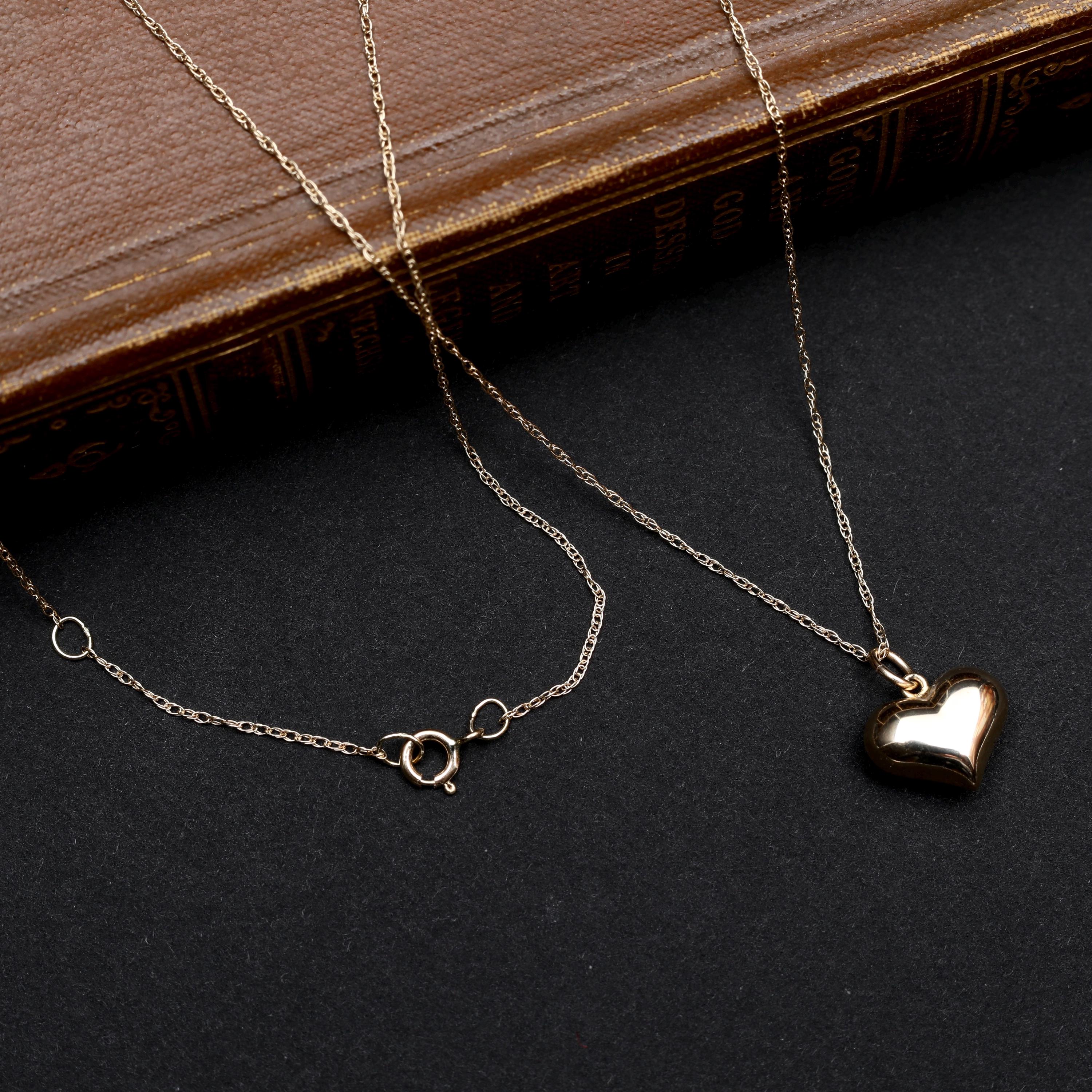 This vintage puffy heart pendant necklace is crafted in solid 14k gold and dates to the 1980s. The heart charm is hollow in construction, giving it gentle volume and a softly rounded form while remaining lightweight and easy to wear. Its petite scale makes it well suited for everyday wear or thoughtful gifting.