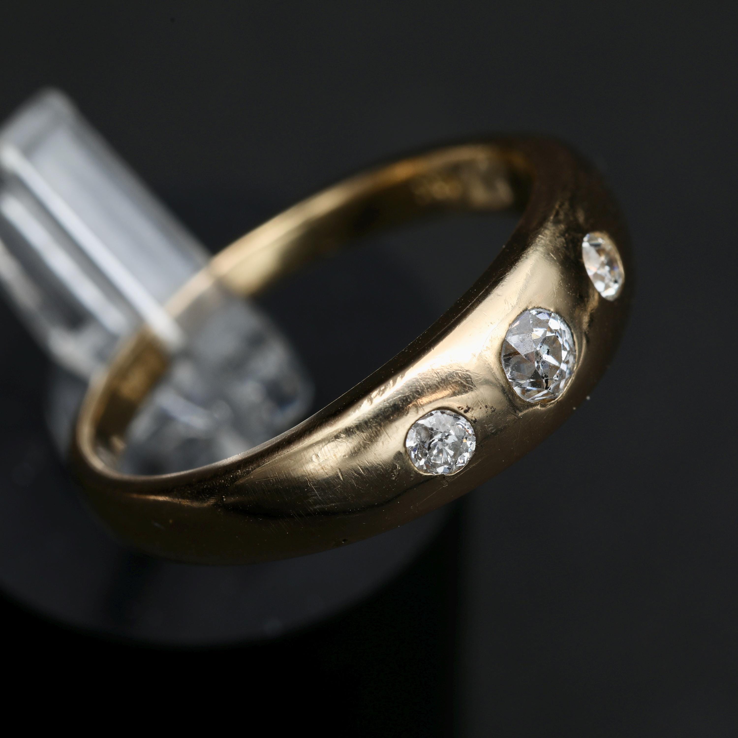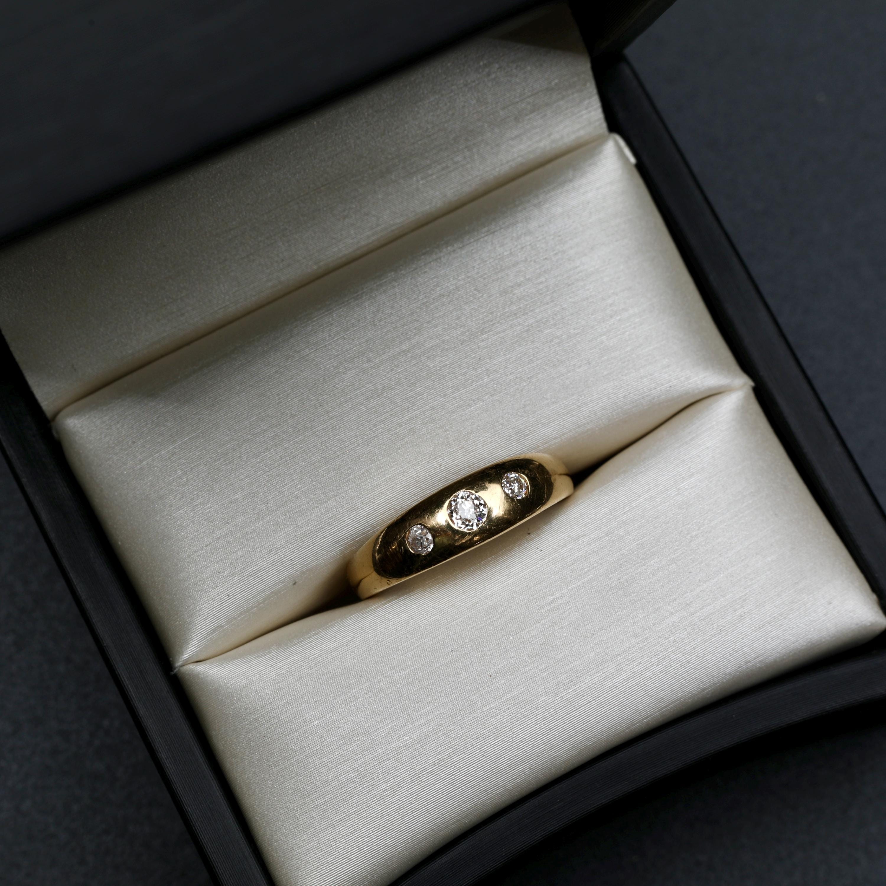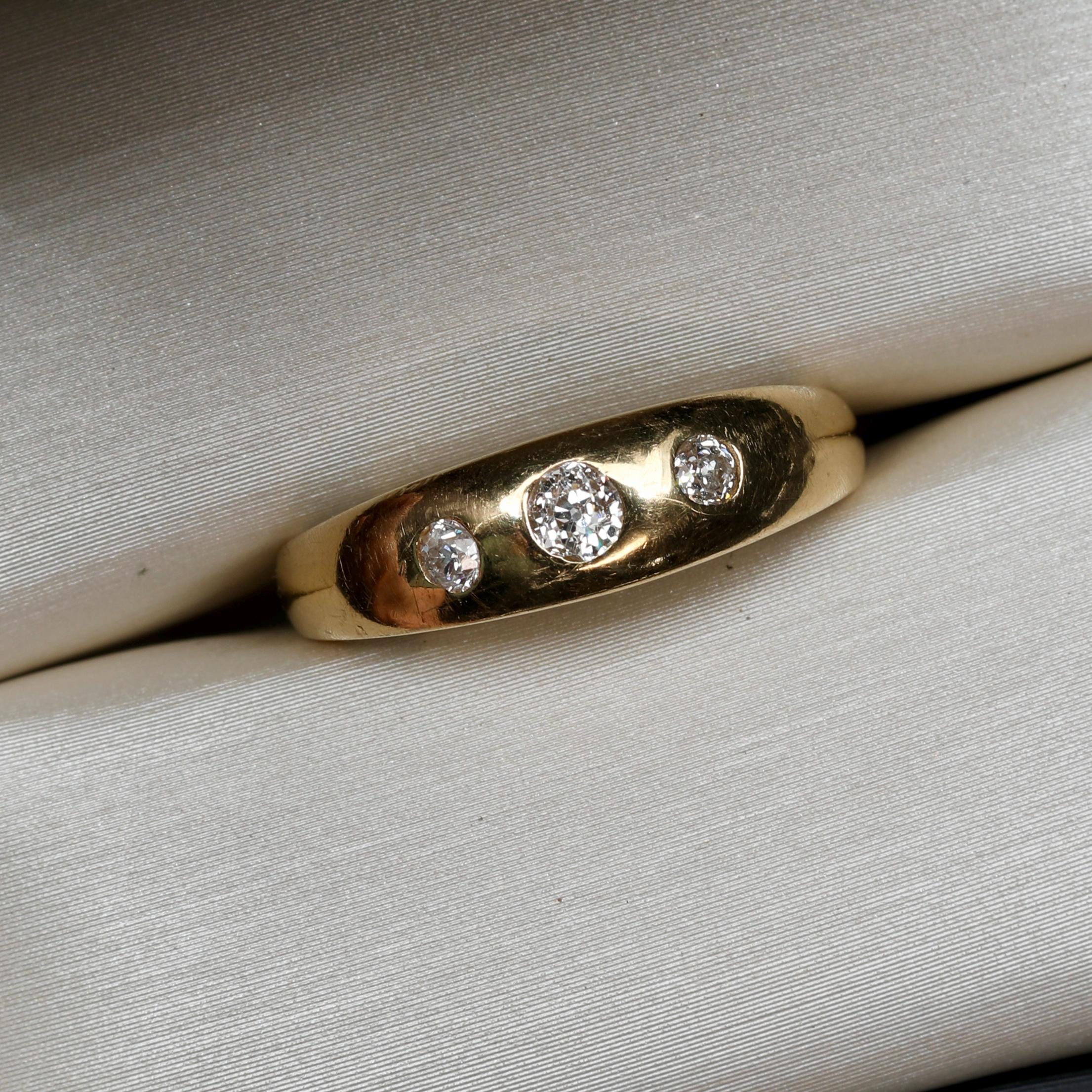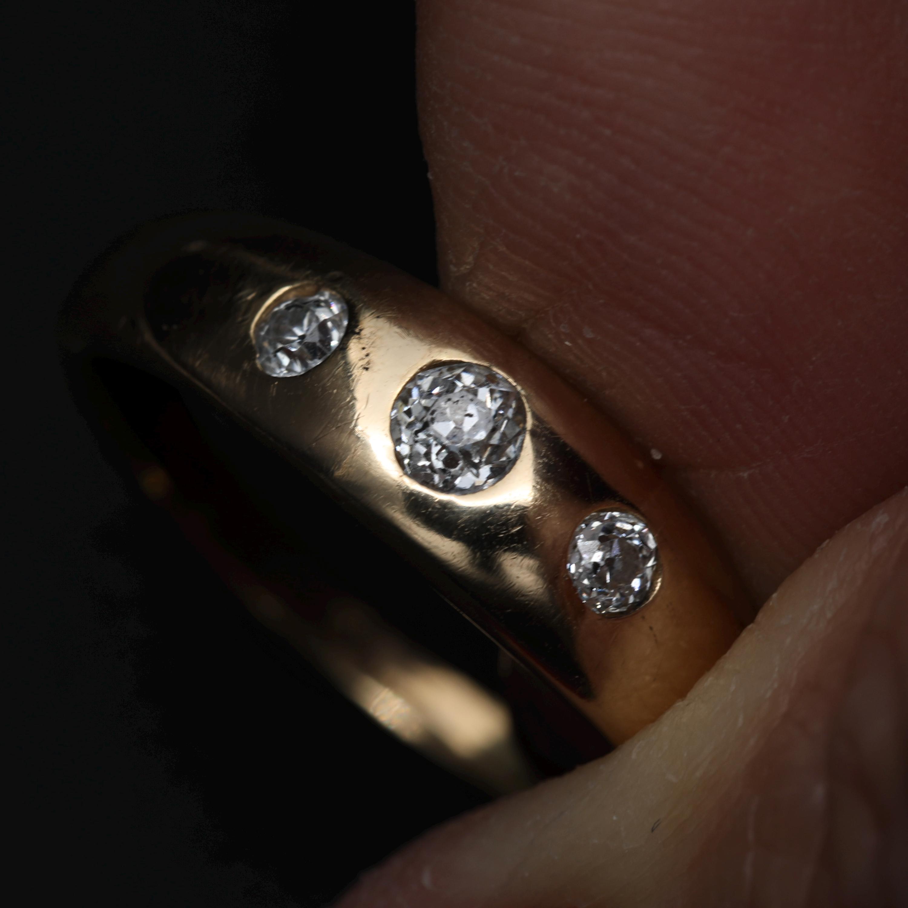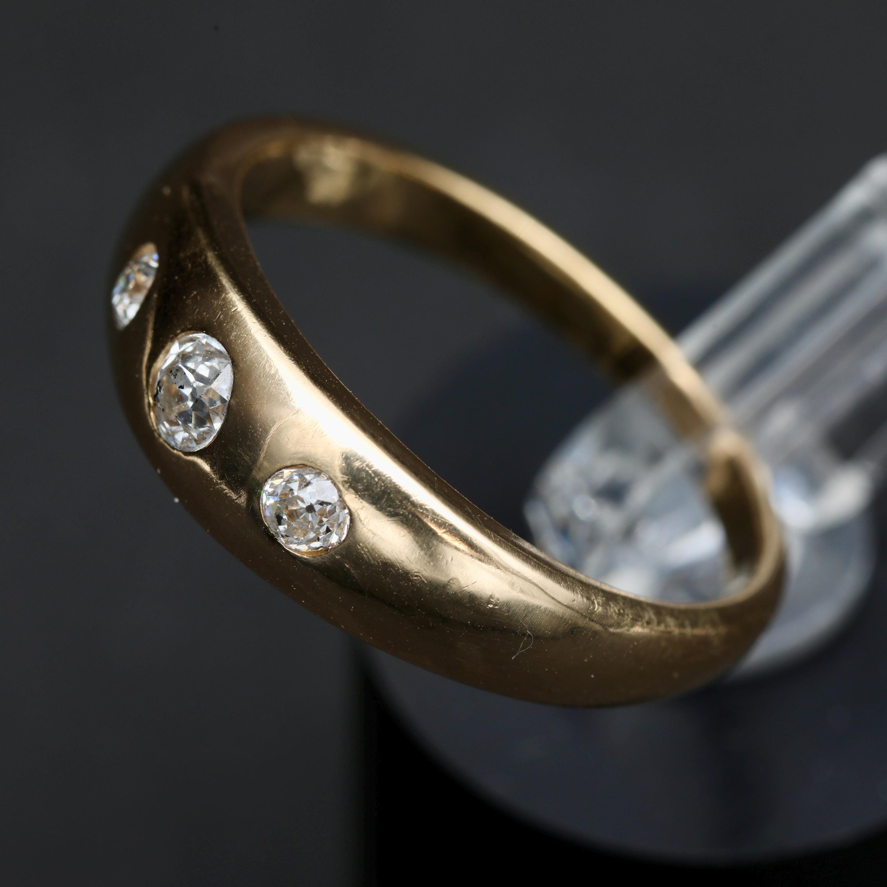 An antique Victorian gypsy ring crafted in rich 18k gold, set with old mine cut diamonds flush into a smooth, continuous band. The diamonds are evenly spaced and deeply set, creating a low-profile design intended for daily wear, an approach characteristic of late 19th-century English and European gold work.