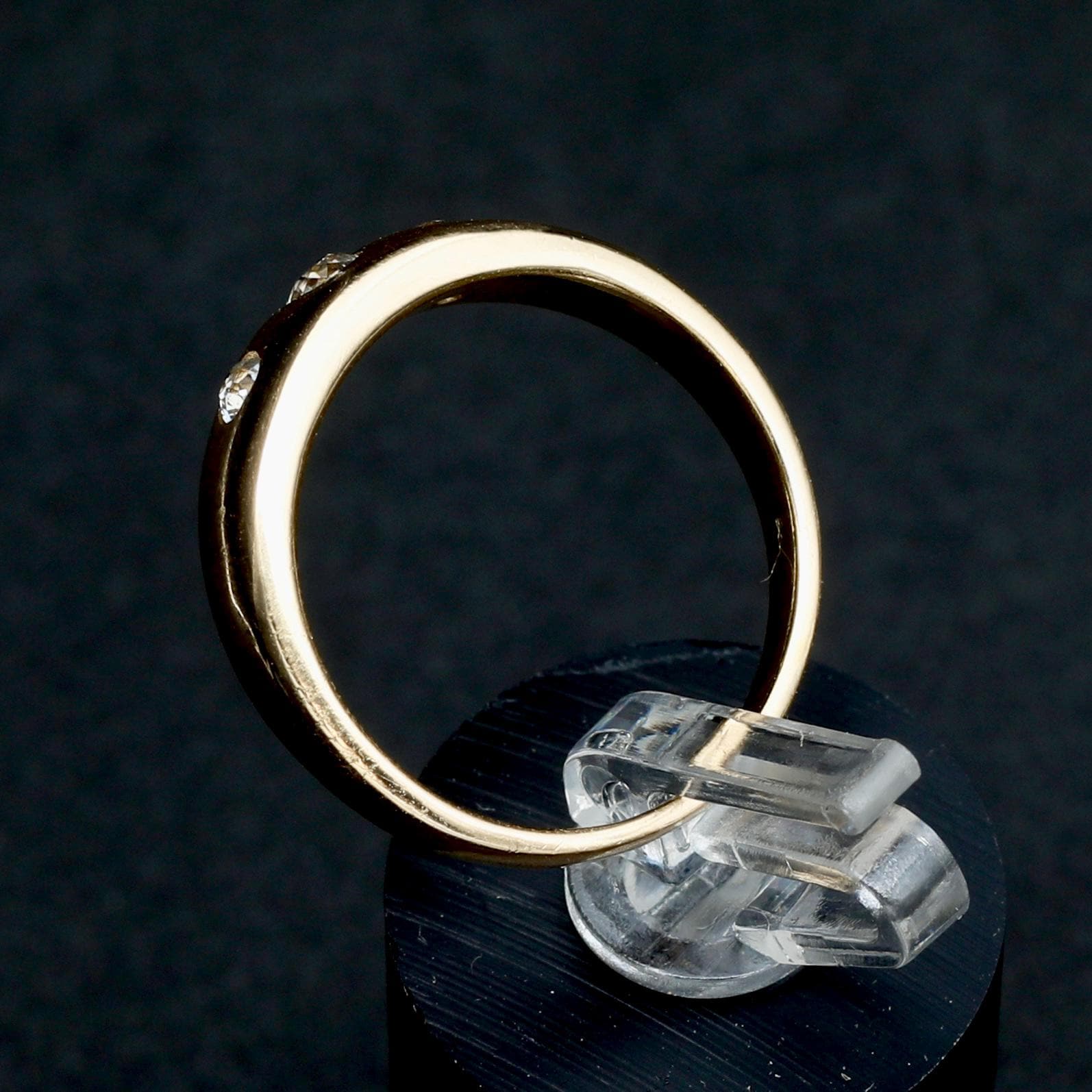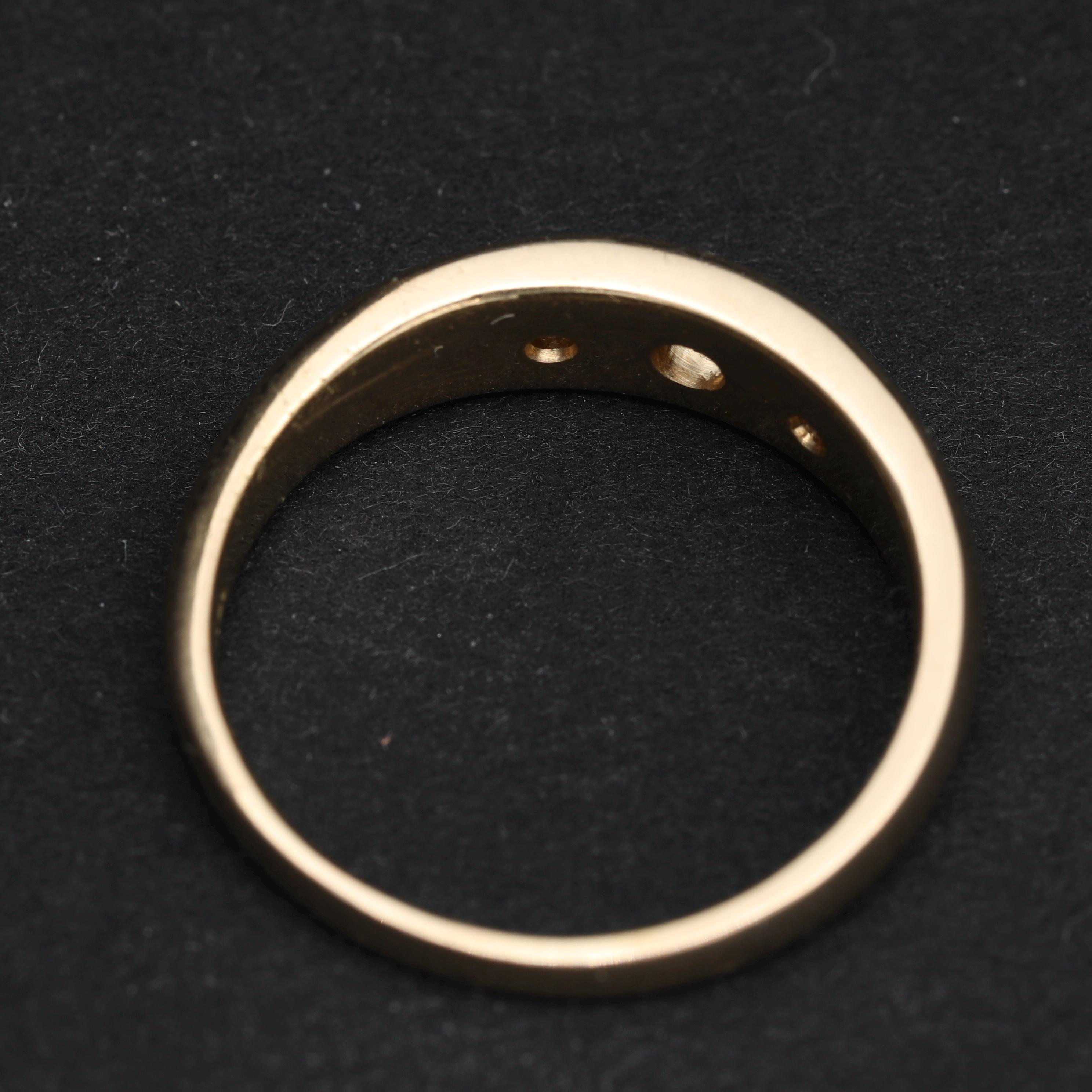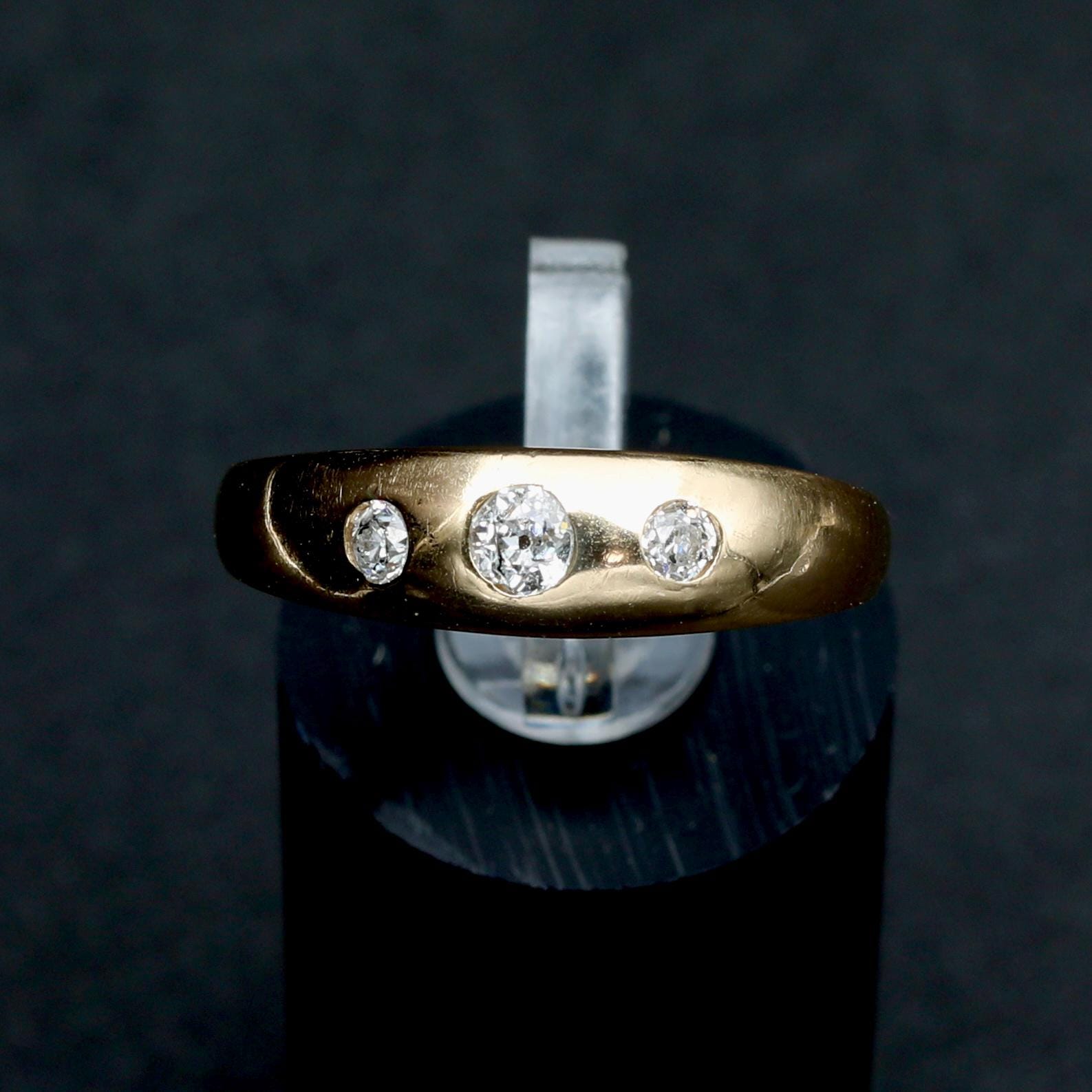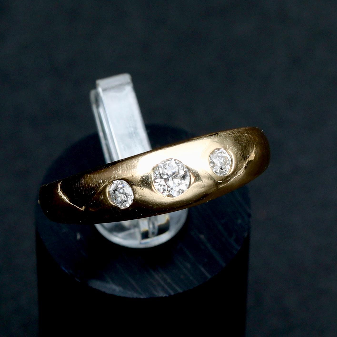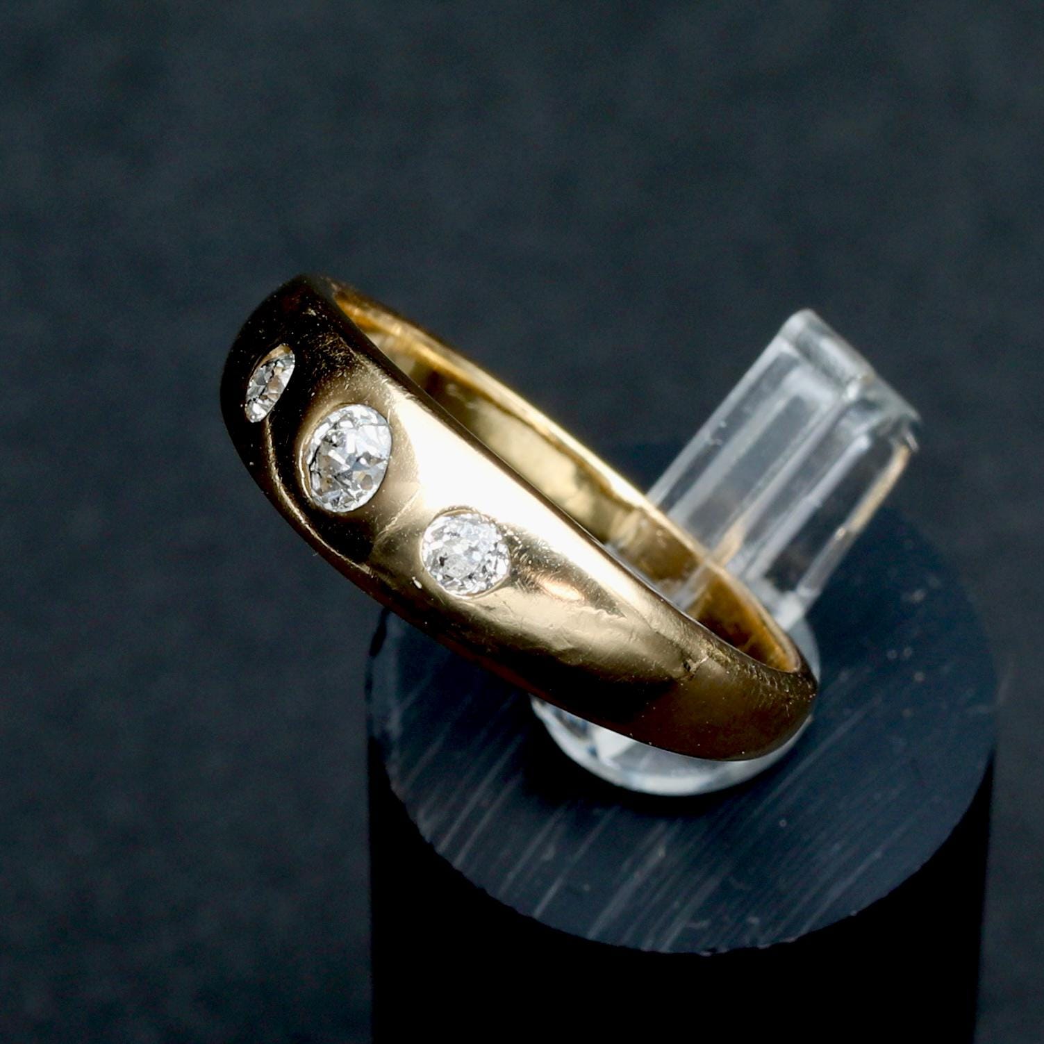 An antique Victorian gypsy ring crafted in rich 18k gold, set with old mine cut diamonds flush into a smooth, continuous band. The diamonds are evenly spaced and deeply set, creating a low-profile design intended for daily wear, an approach characteristic of late 19th-century English and European gold work.