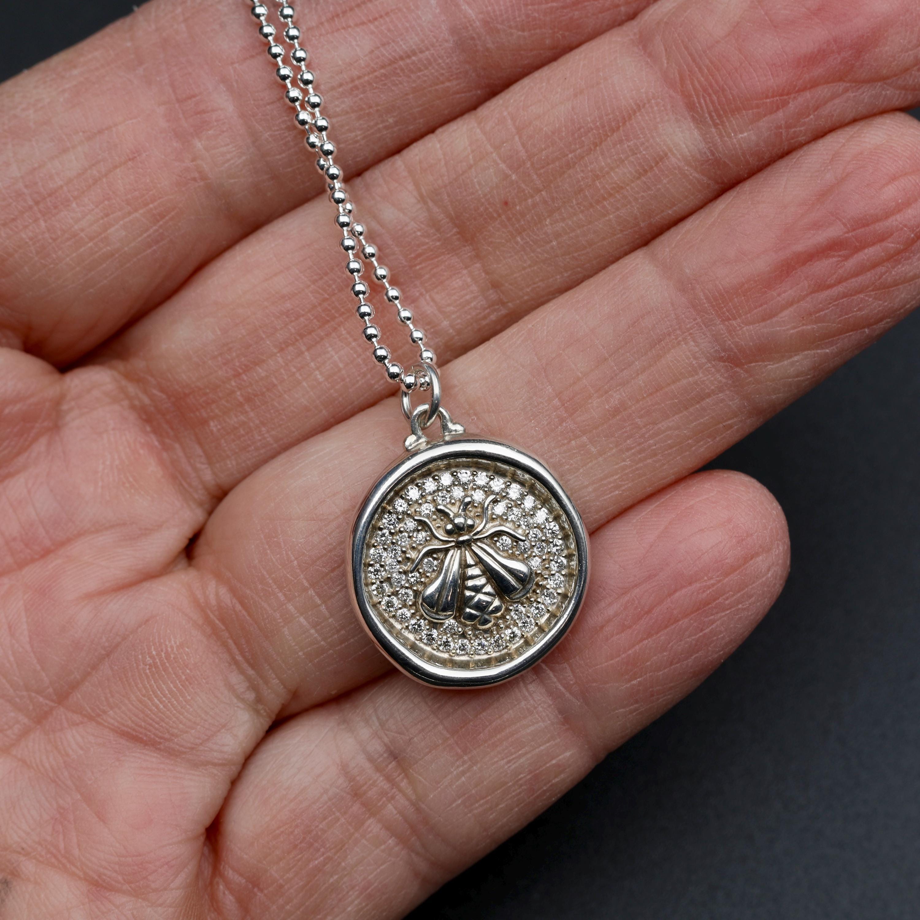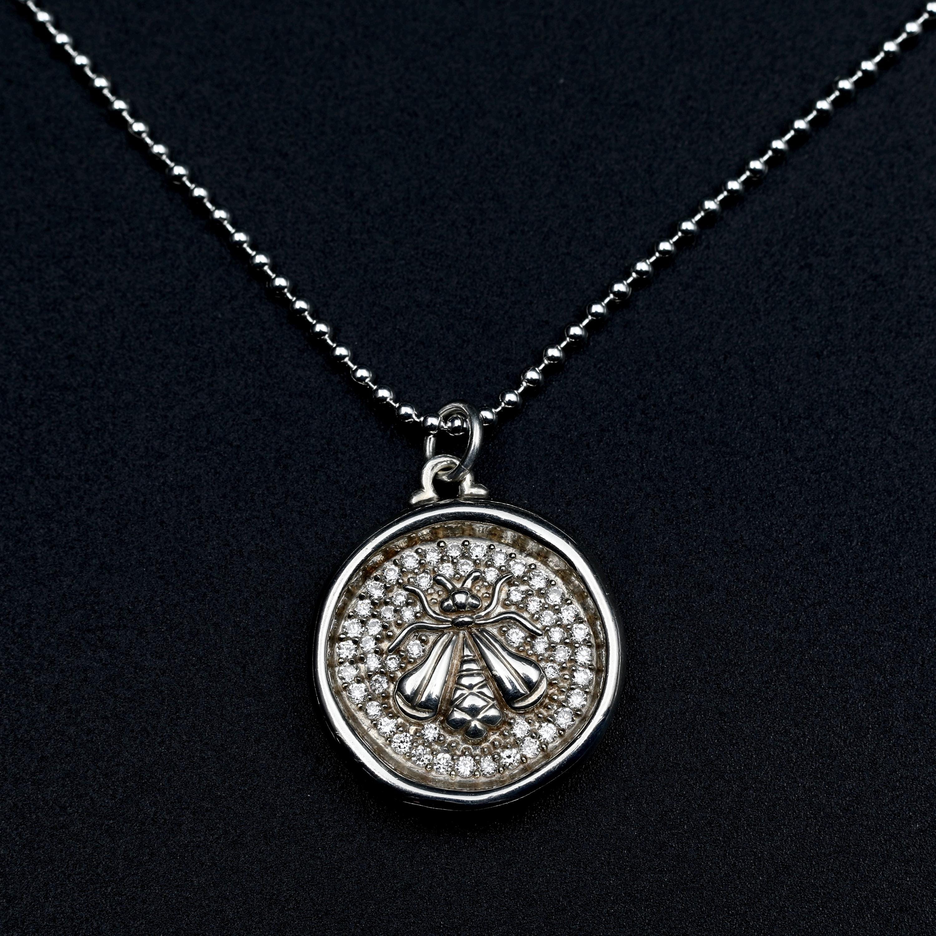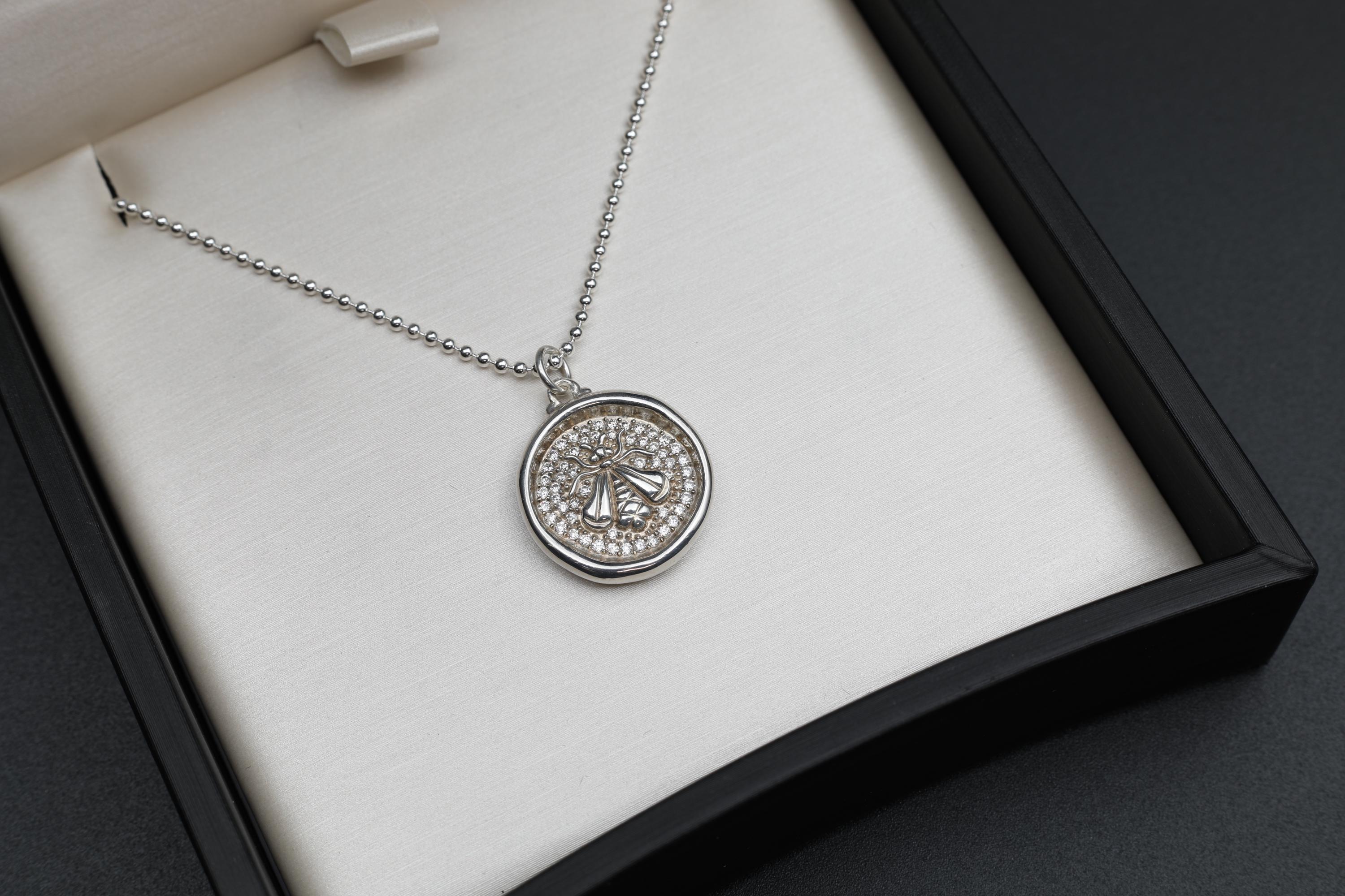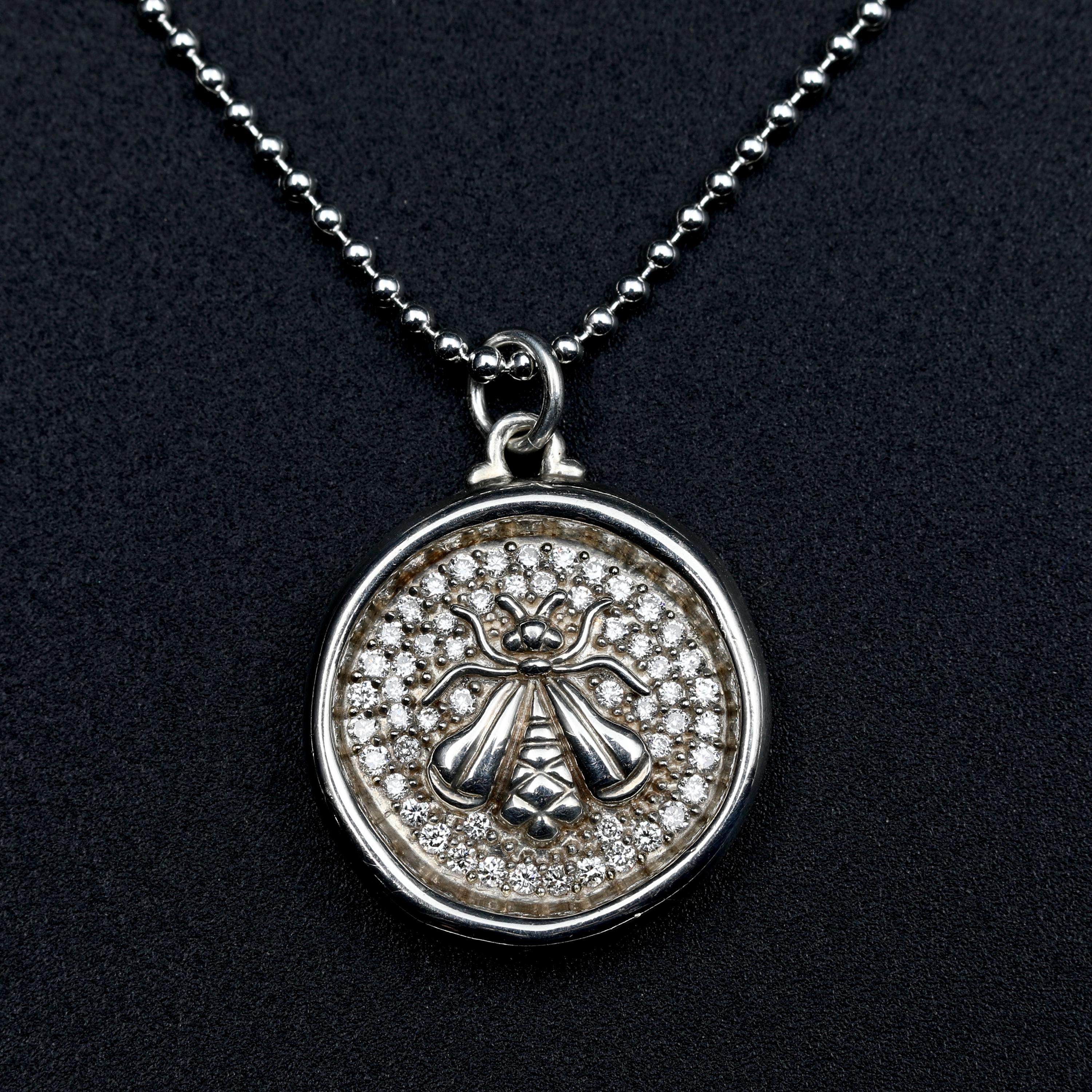 A vintage wax seal style bee pendant by Sloane Street Jewelry, crafted in sterling silver and set with 54 full cut diamonds. The raised bee motif sits against the pave diamond-set background, giving the piece depth and quiet sparkling light. A well-balanced designer necklace with a classic nature motif.