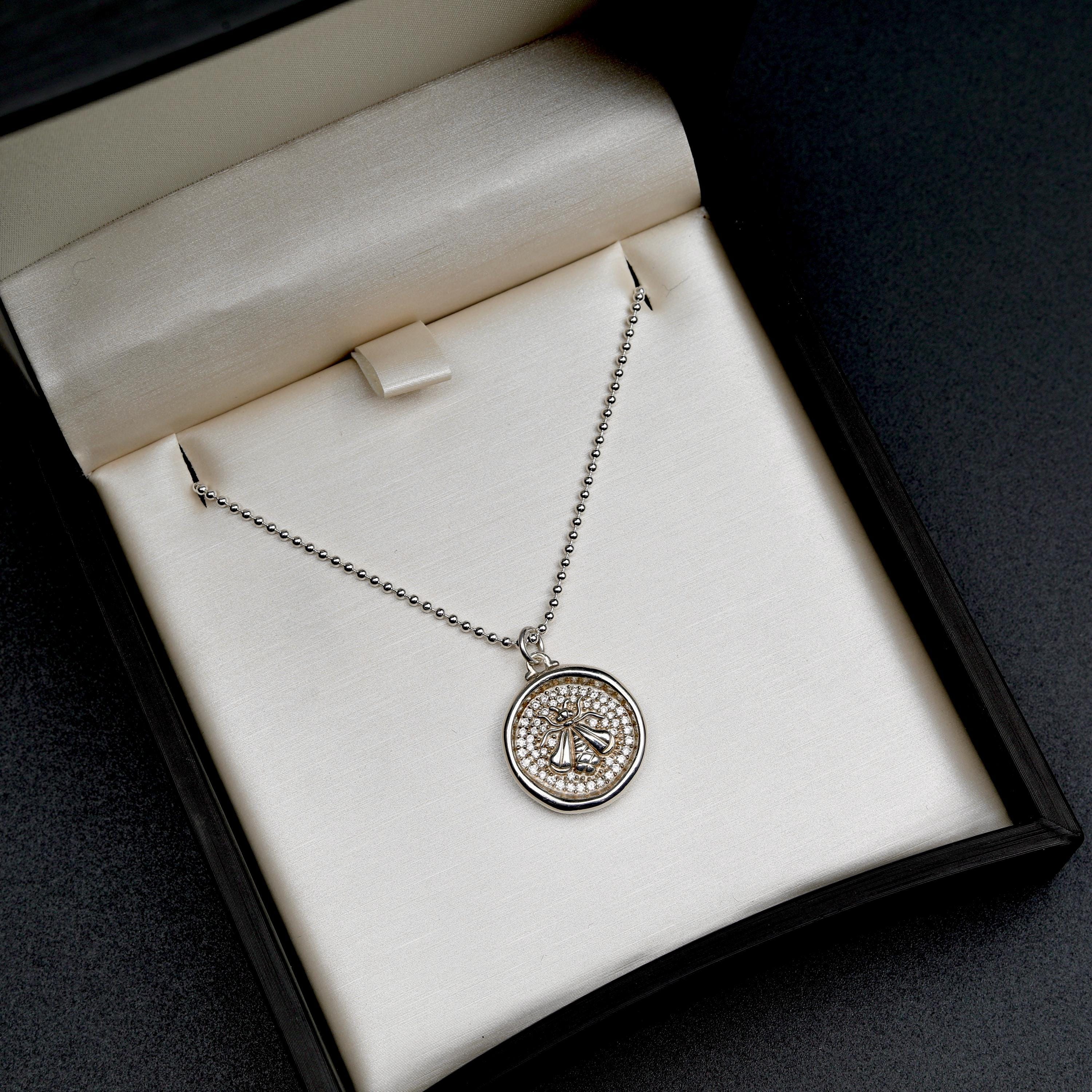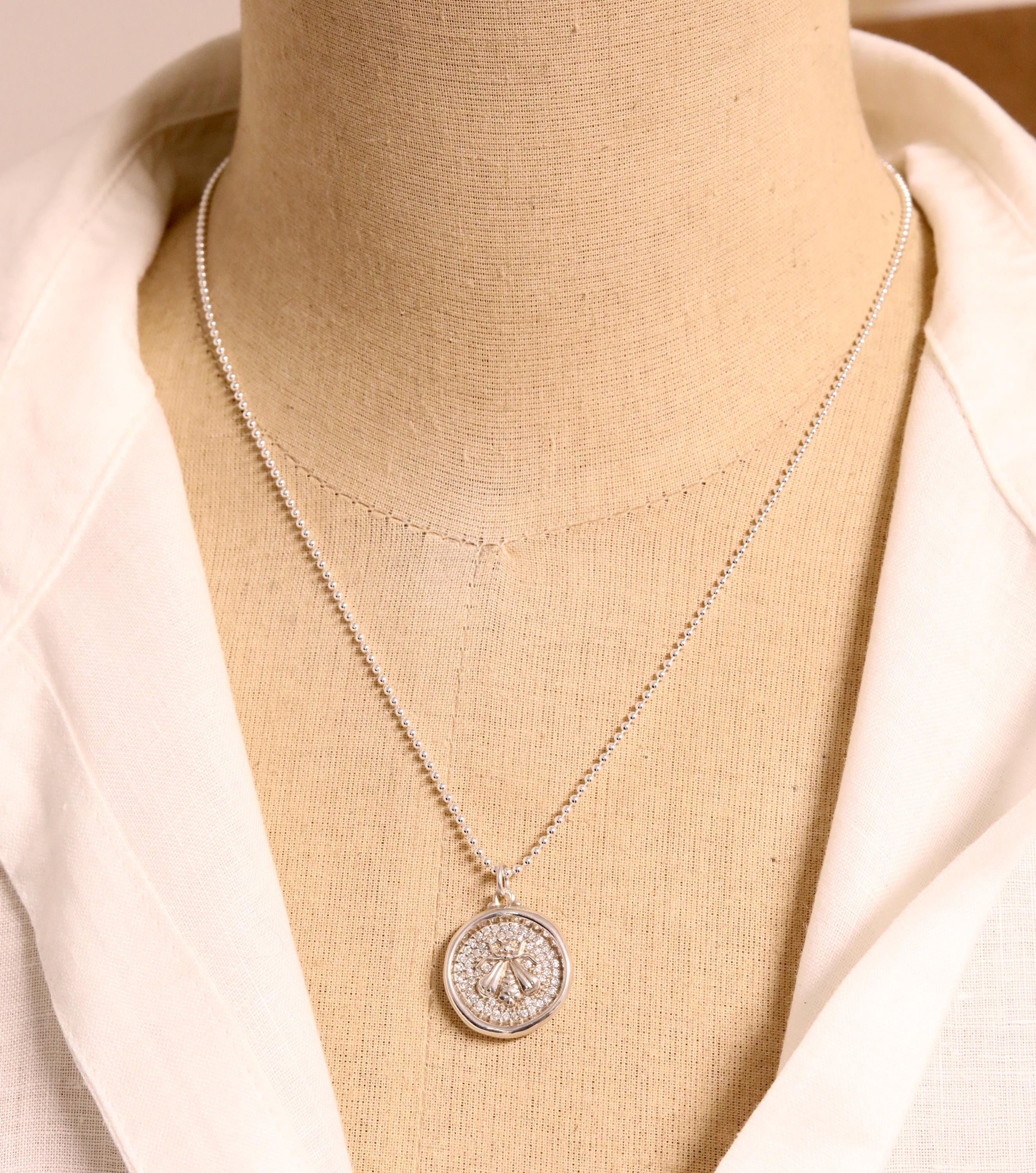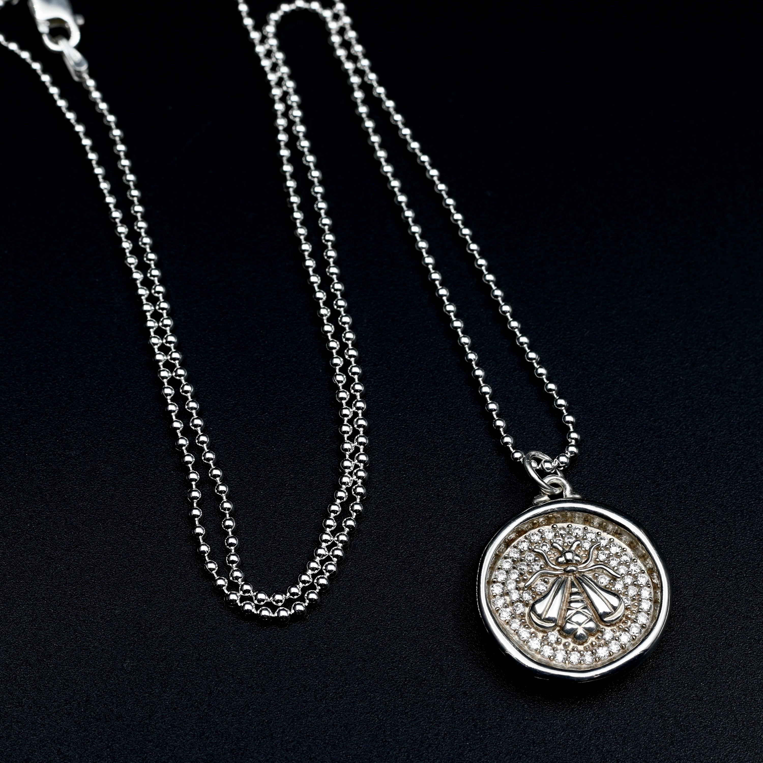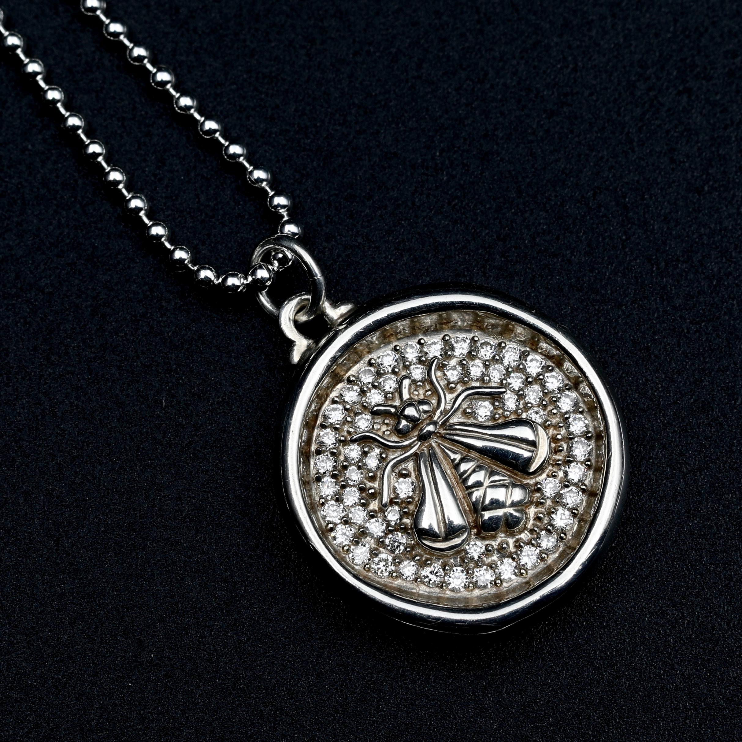 A vintage wax seal style bee pendant by Sloane Street Jewelry, crafted in sterling silver and set with 54 full cut diamonds. The raised bee motif sits against the pave diamond-set background, giving the piece depth and quiet sparkling light. A well-balanced designer necklace with a classic nature motif.