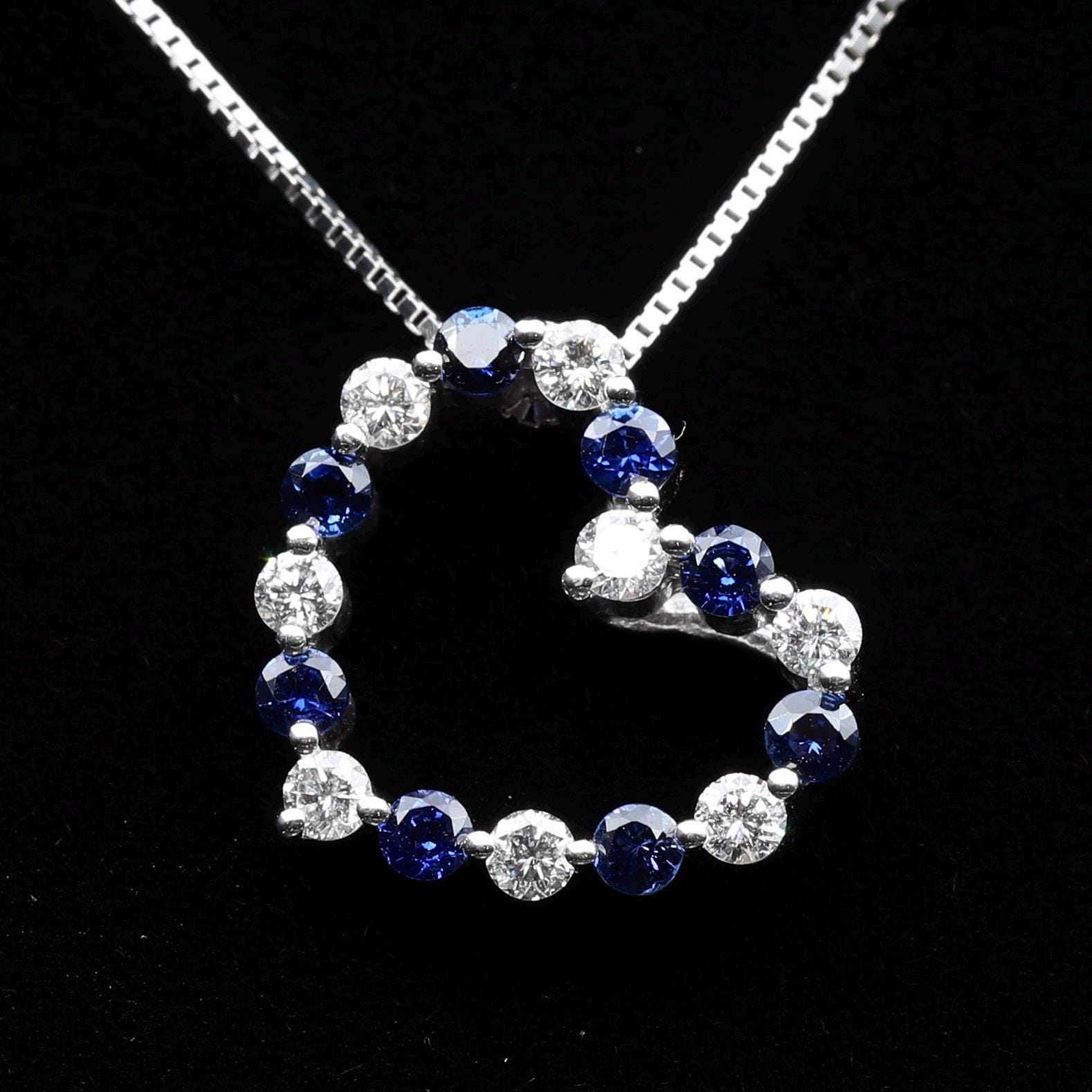 A vintage 14k white gold heart pendant from the 1980s, set with bright cornflower-blue sapphires and fine white diamonds totaling just over one carat combined. The stones are arranged in an open-heart motif, with alternating sapphires and diamonds, giving the piece a balanced, elegant symmetry.