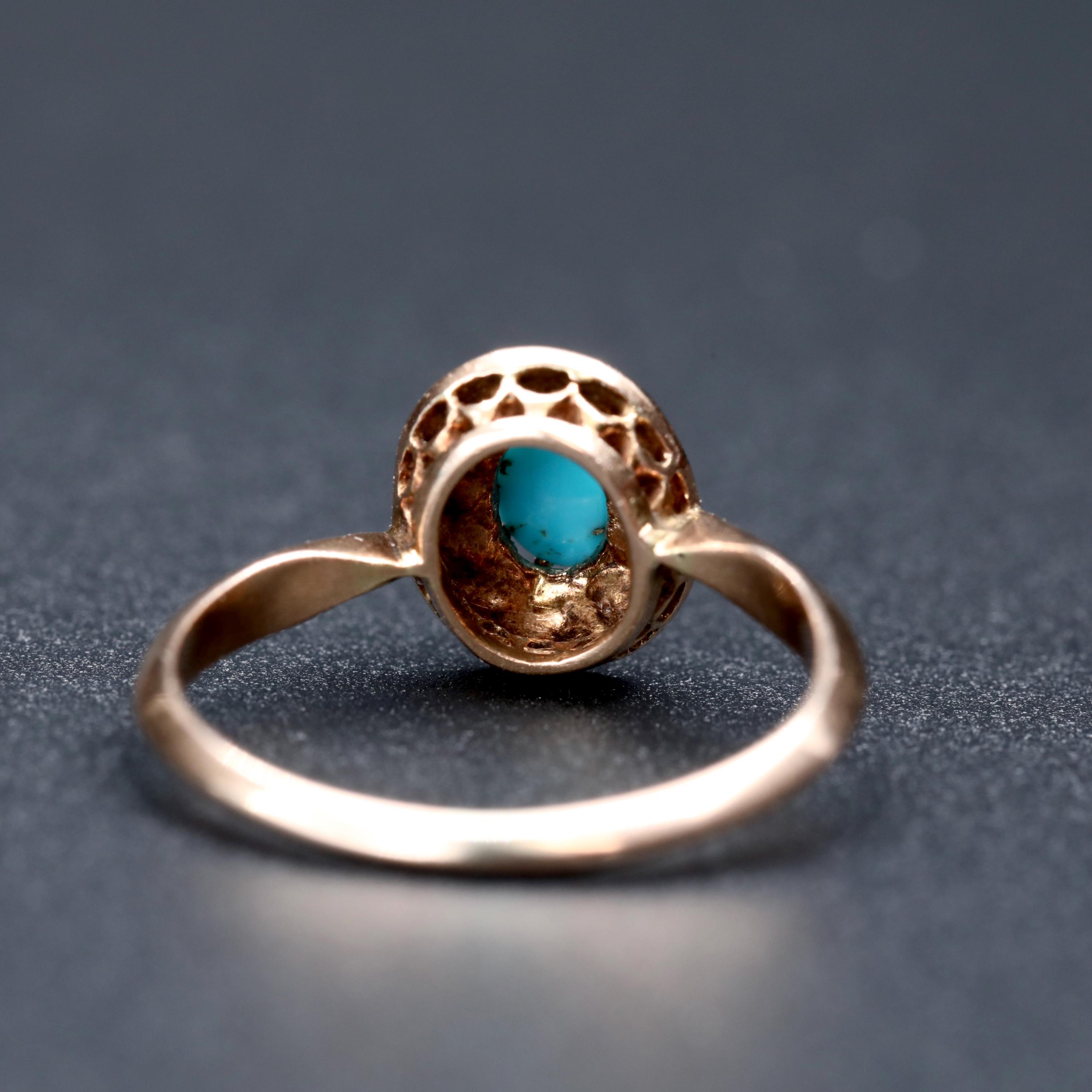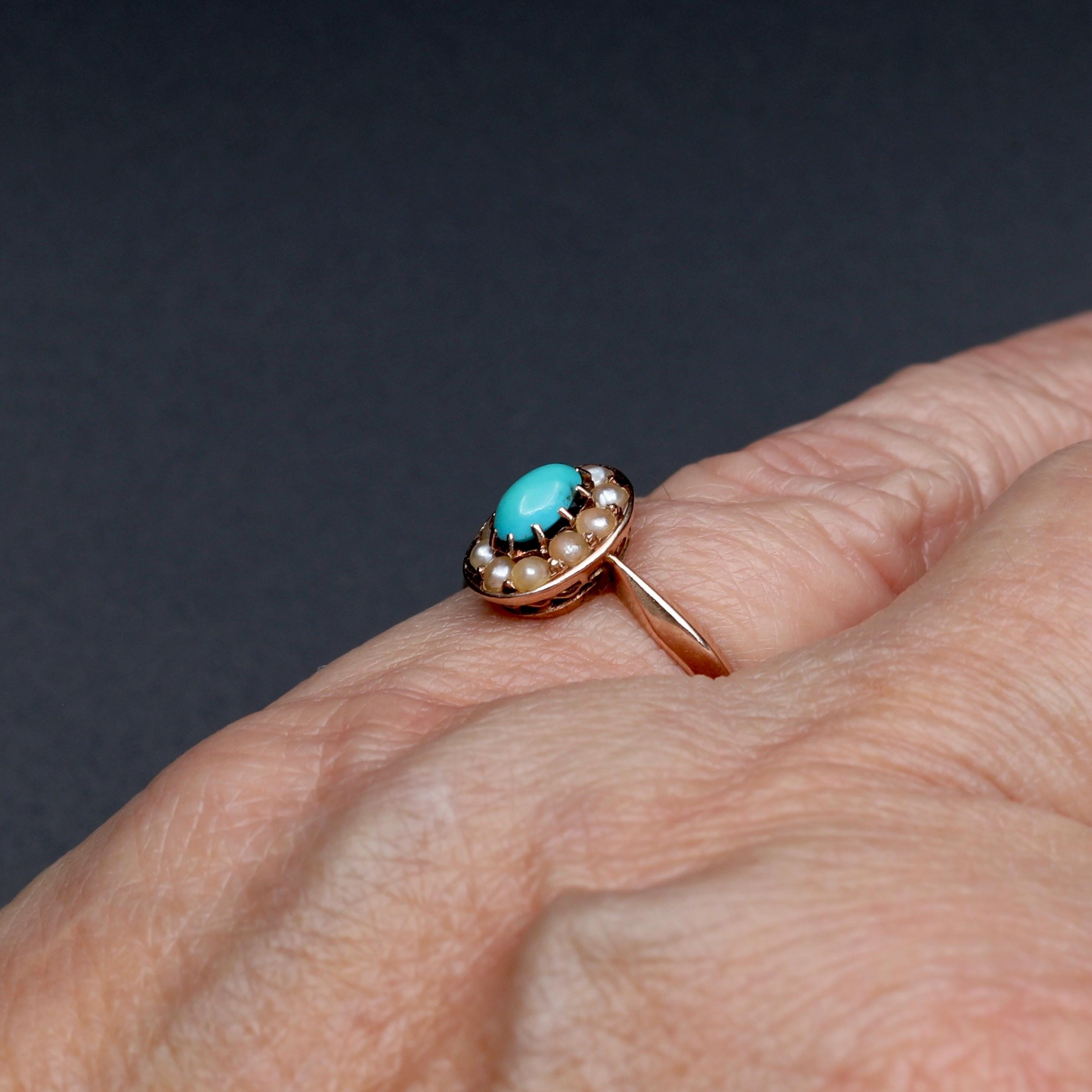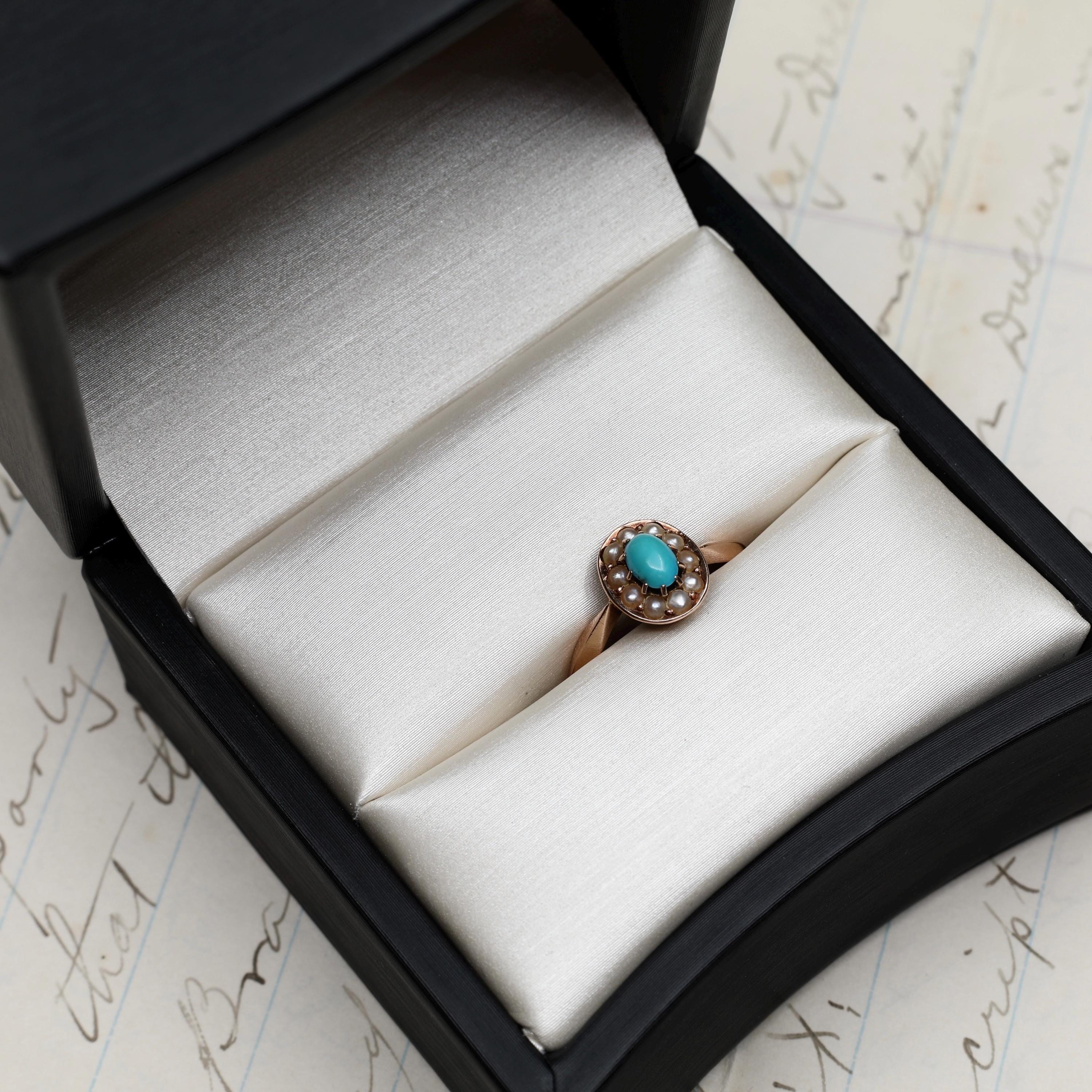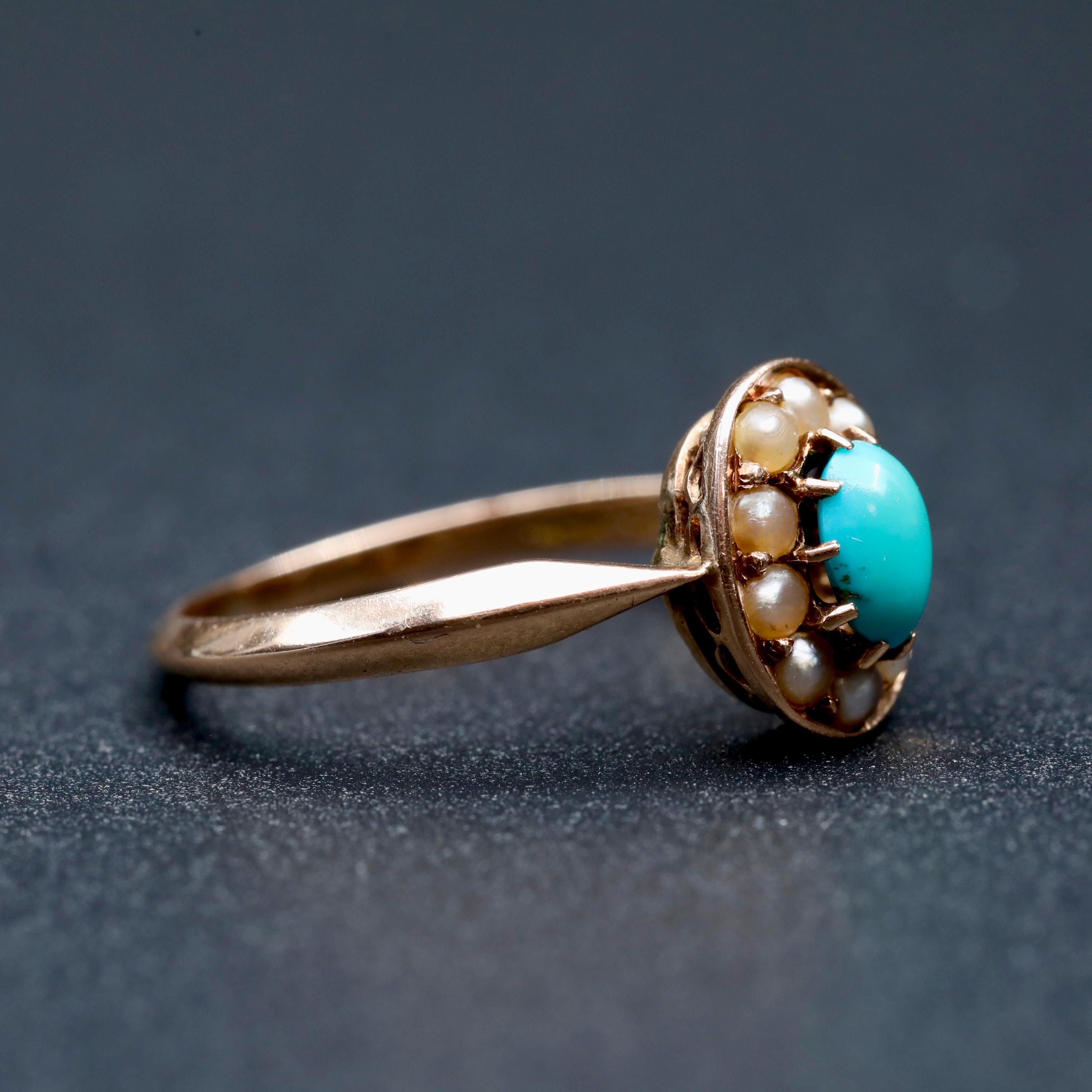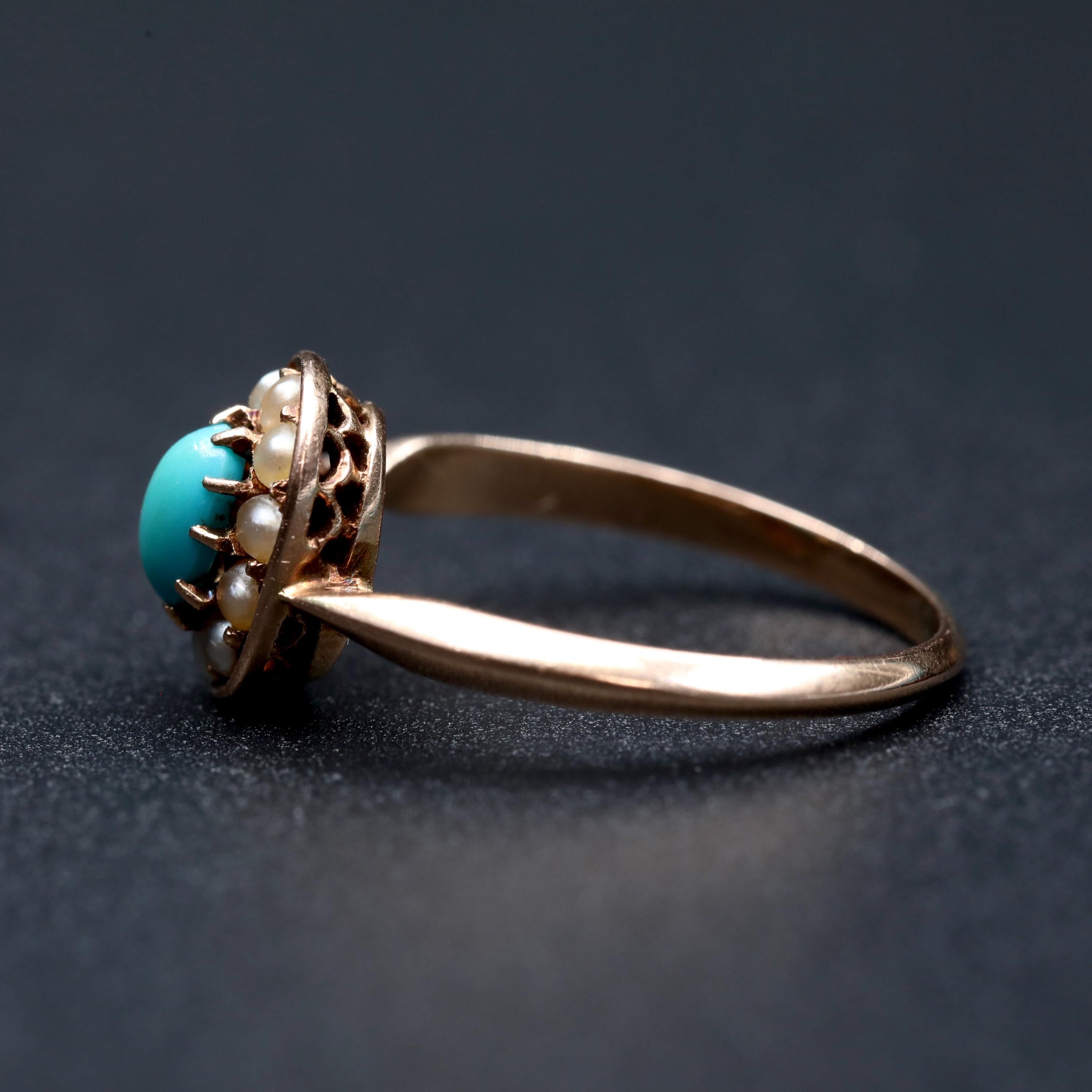 Late 19th century turquoise and seed pearl cluster ring rendered in warm 14k rose gold. The oval face centers a natural turquoise cabochon encircled by seed pearls in a classic Victorian arrangement. The ring is hand fabricated with a finely pierced gallery beneath the cluster that reflects careful bench work.