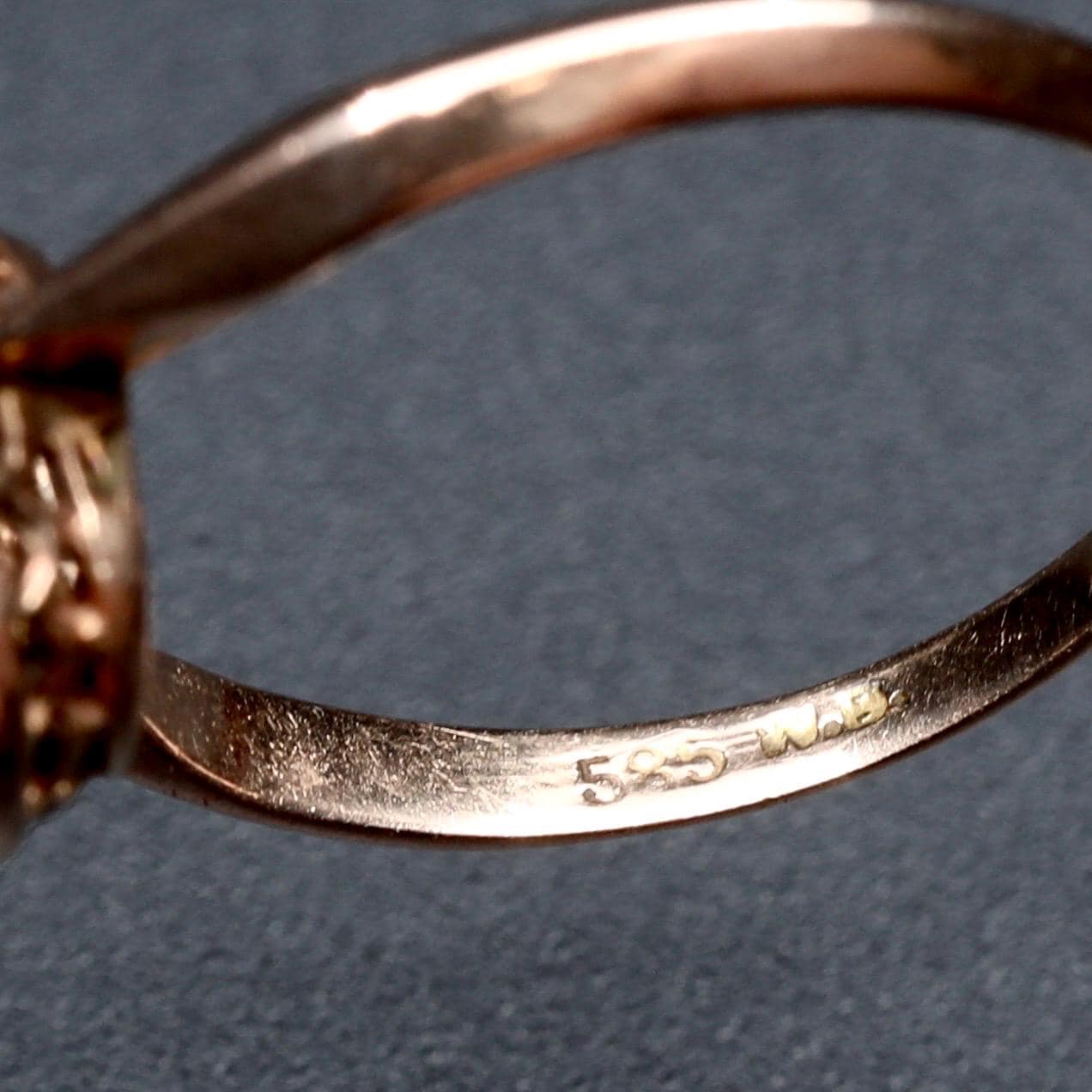 Marked 585 (14k) with maker’s mark W.B. The numeric purity mark is consistent with international 14k gold standards. Exact origin unknown.