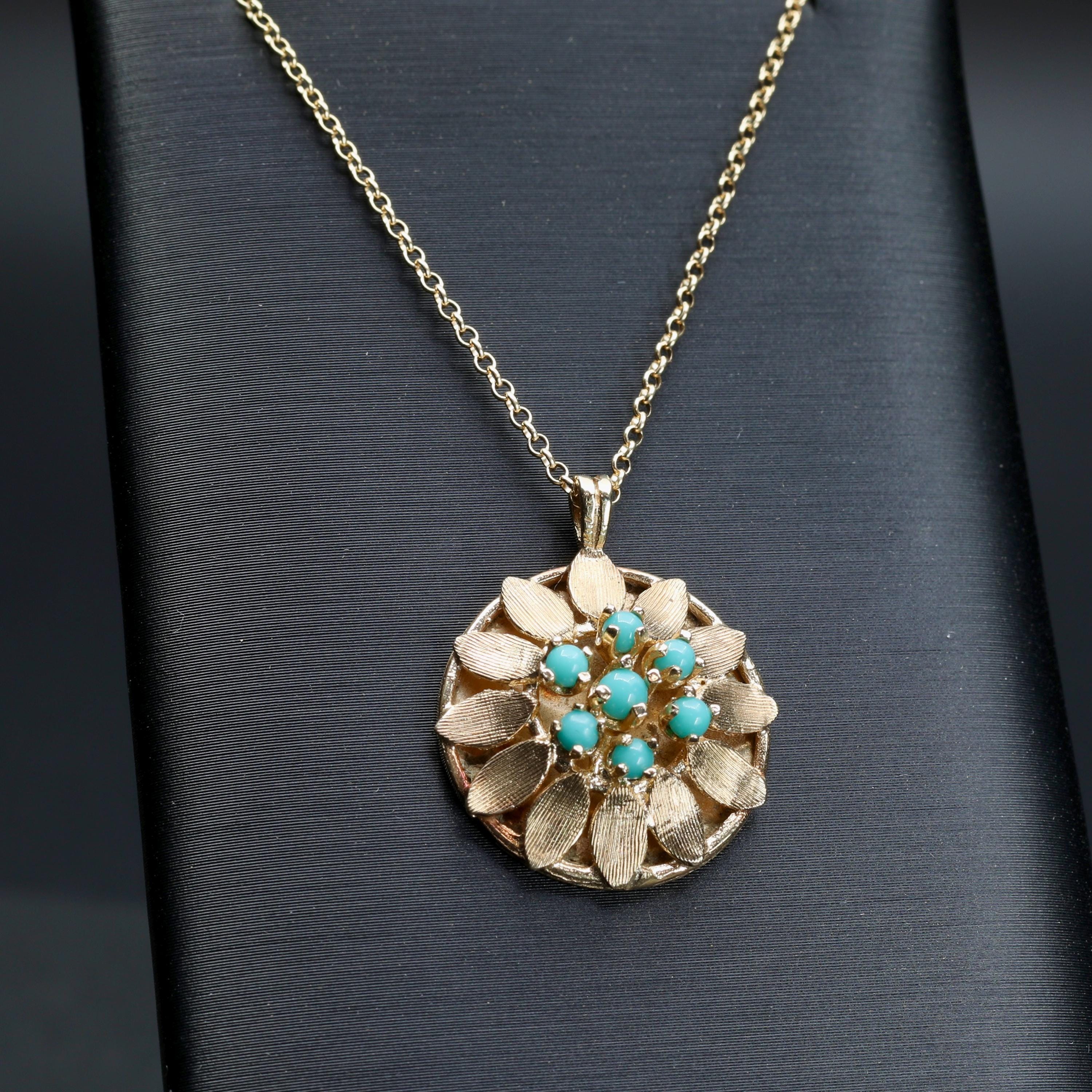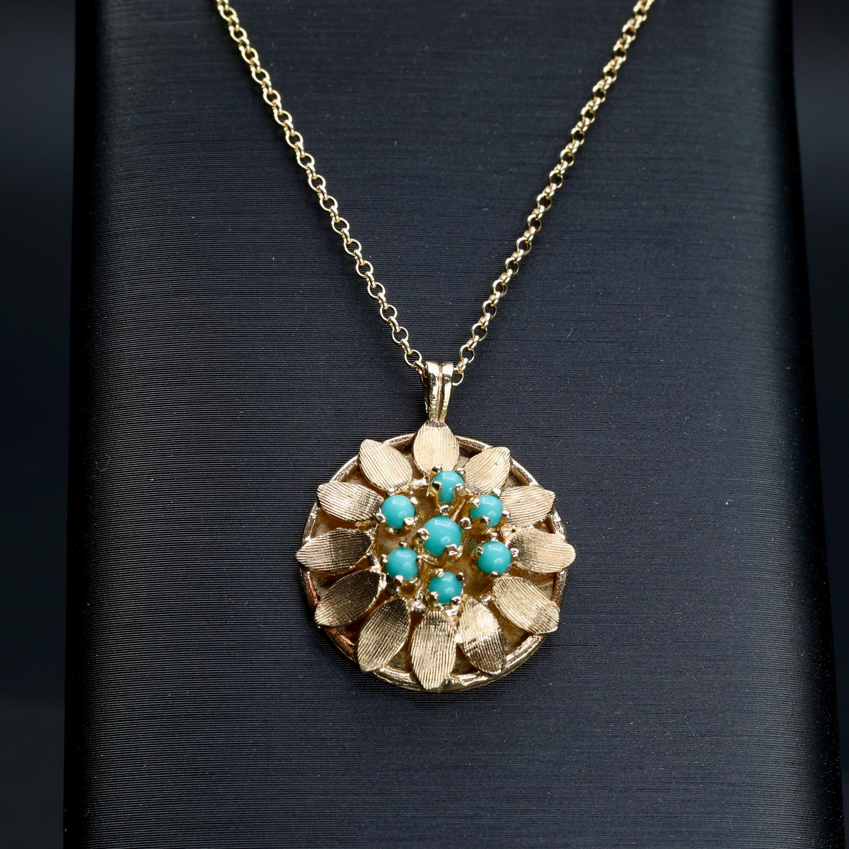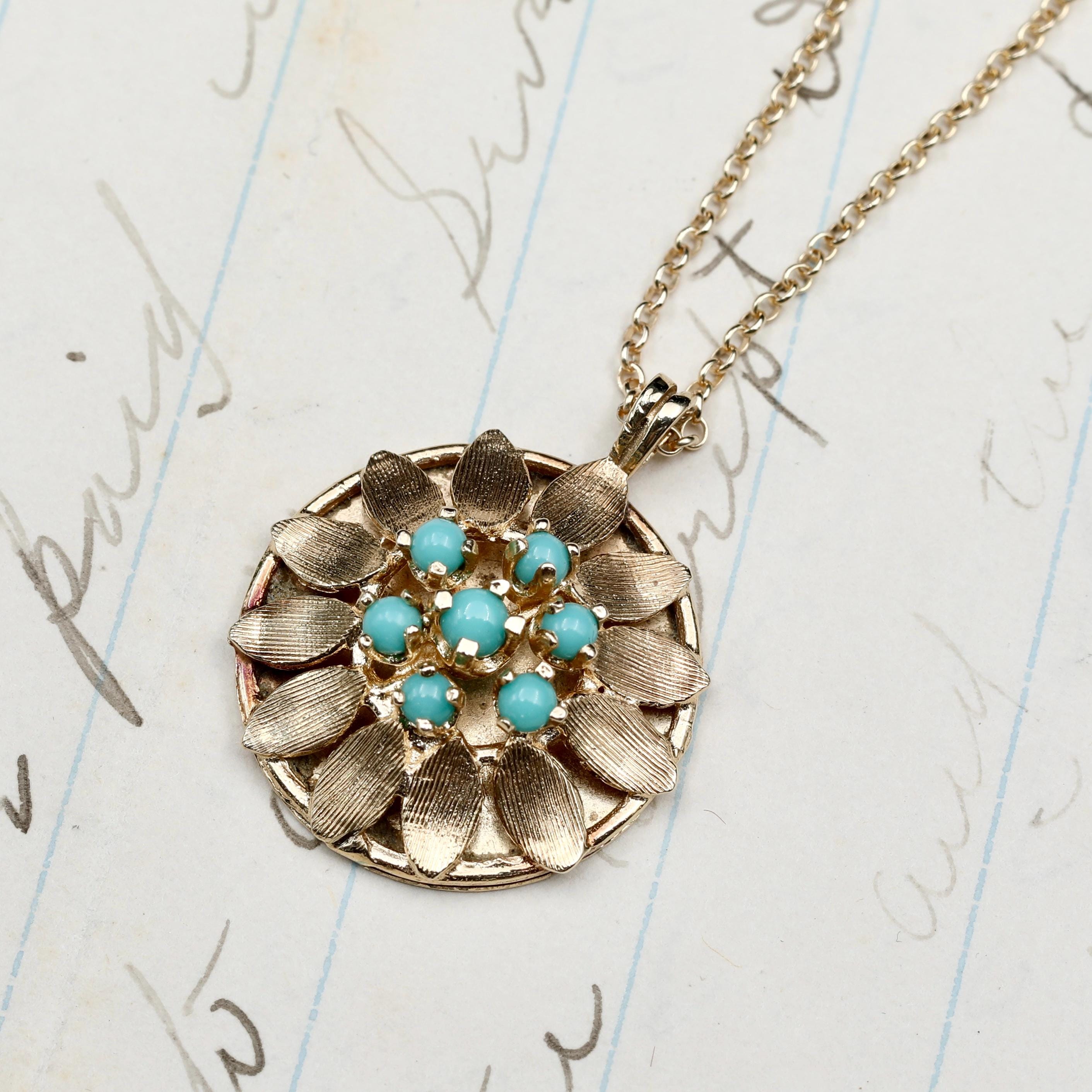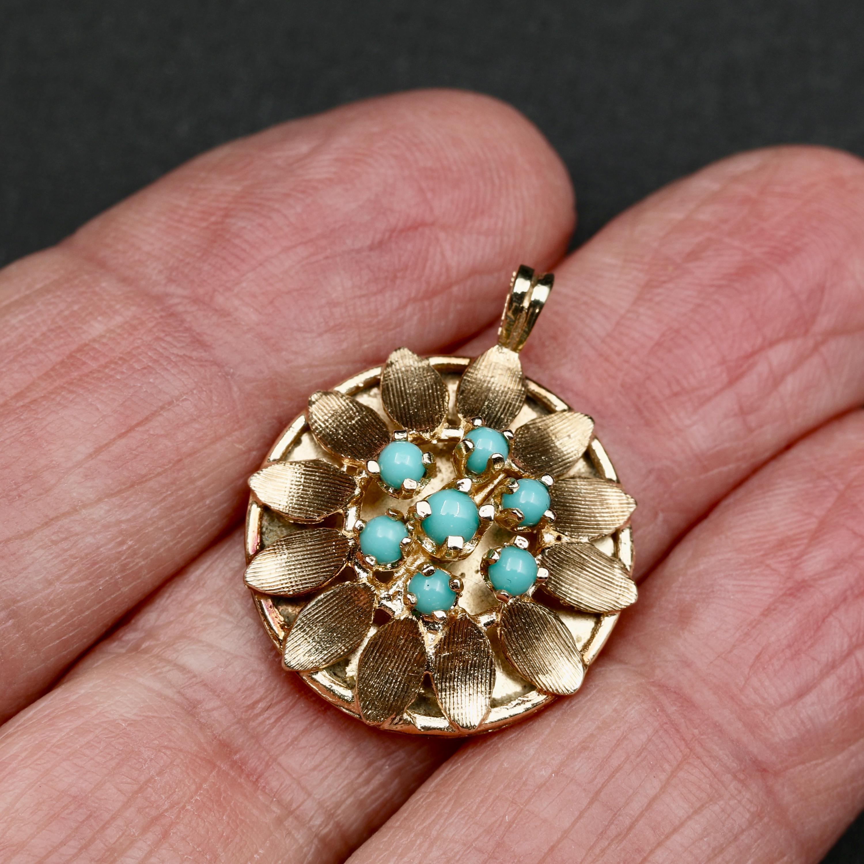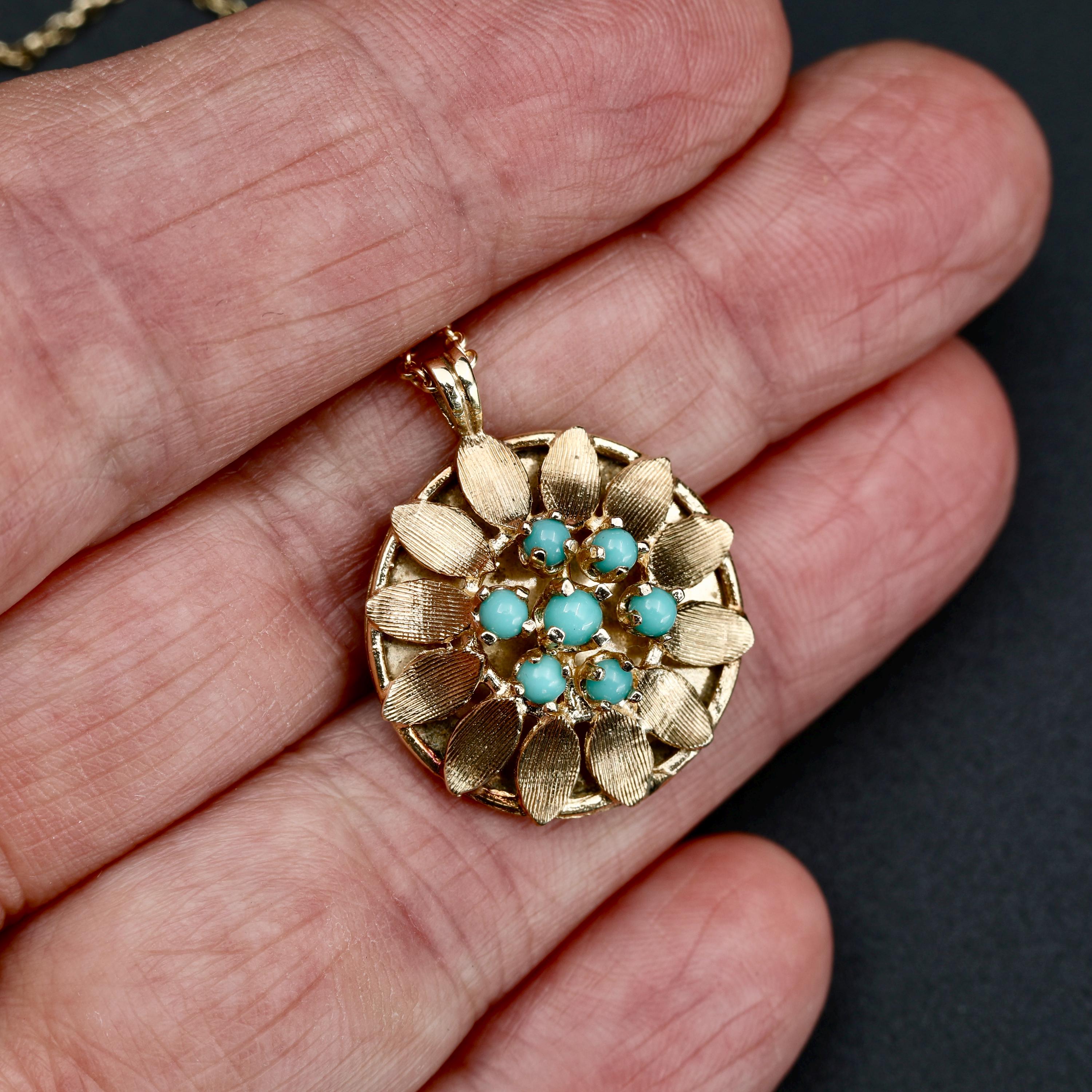 This vintage 1960s pendant features a stylized gold flower set with robin egg blue natural turquoise cabochons. The petals are finished with a Florentine texture, a decorative engraving technique popular in fine mid-century jewelry that creates a soft, shimmering surface across the gold.