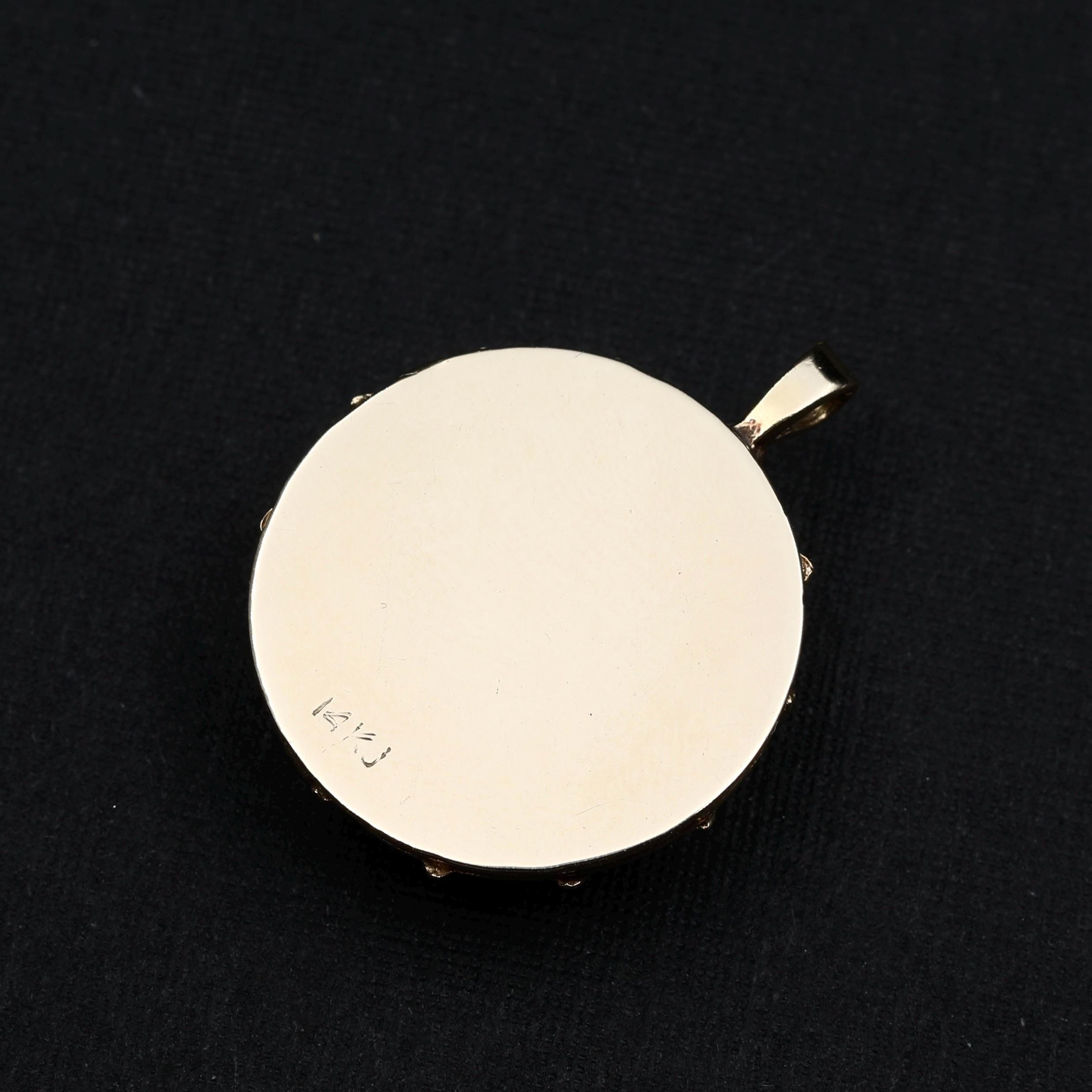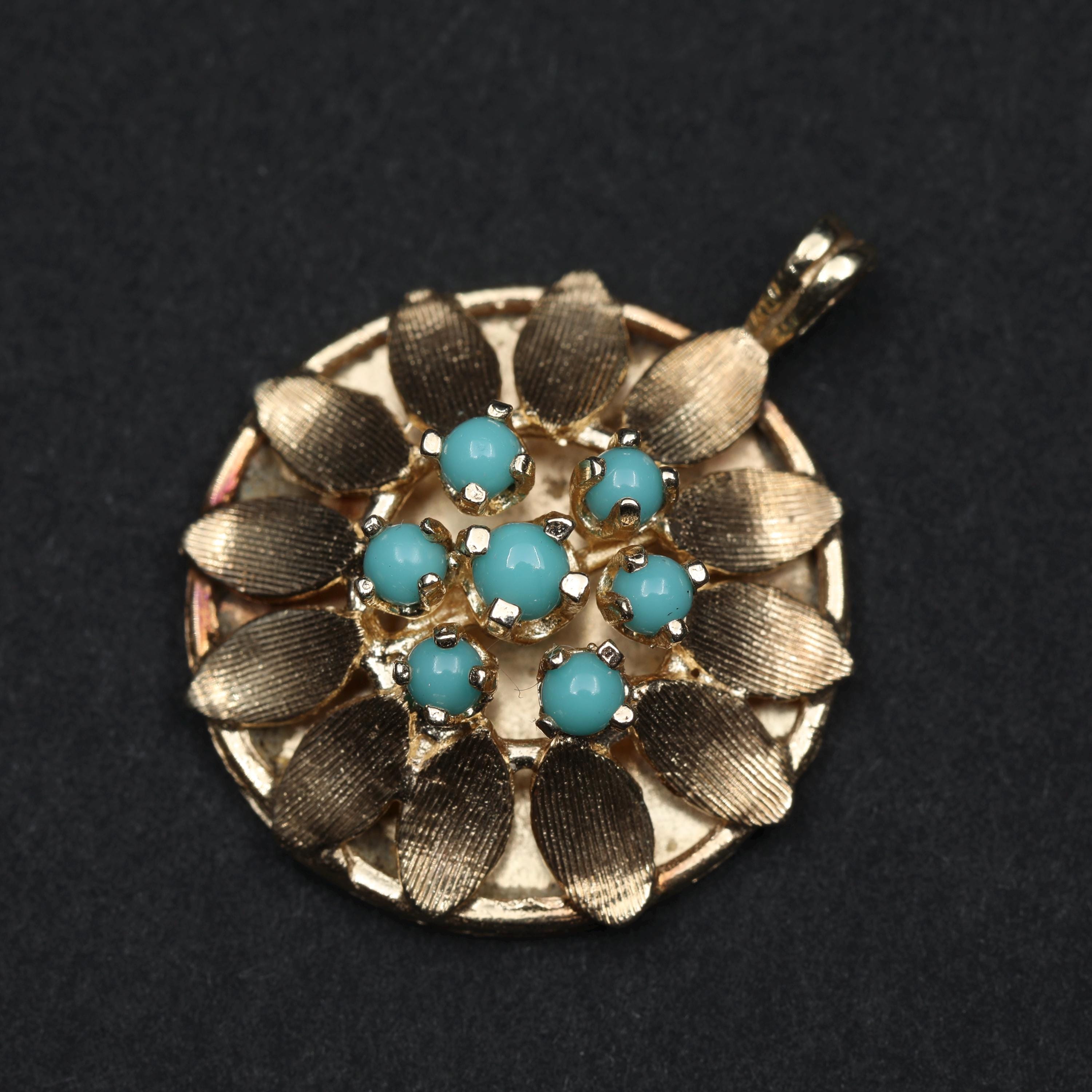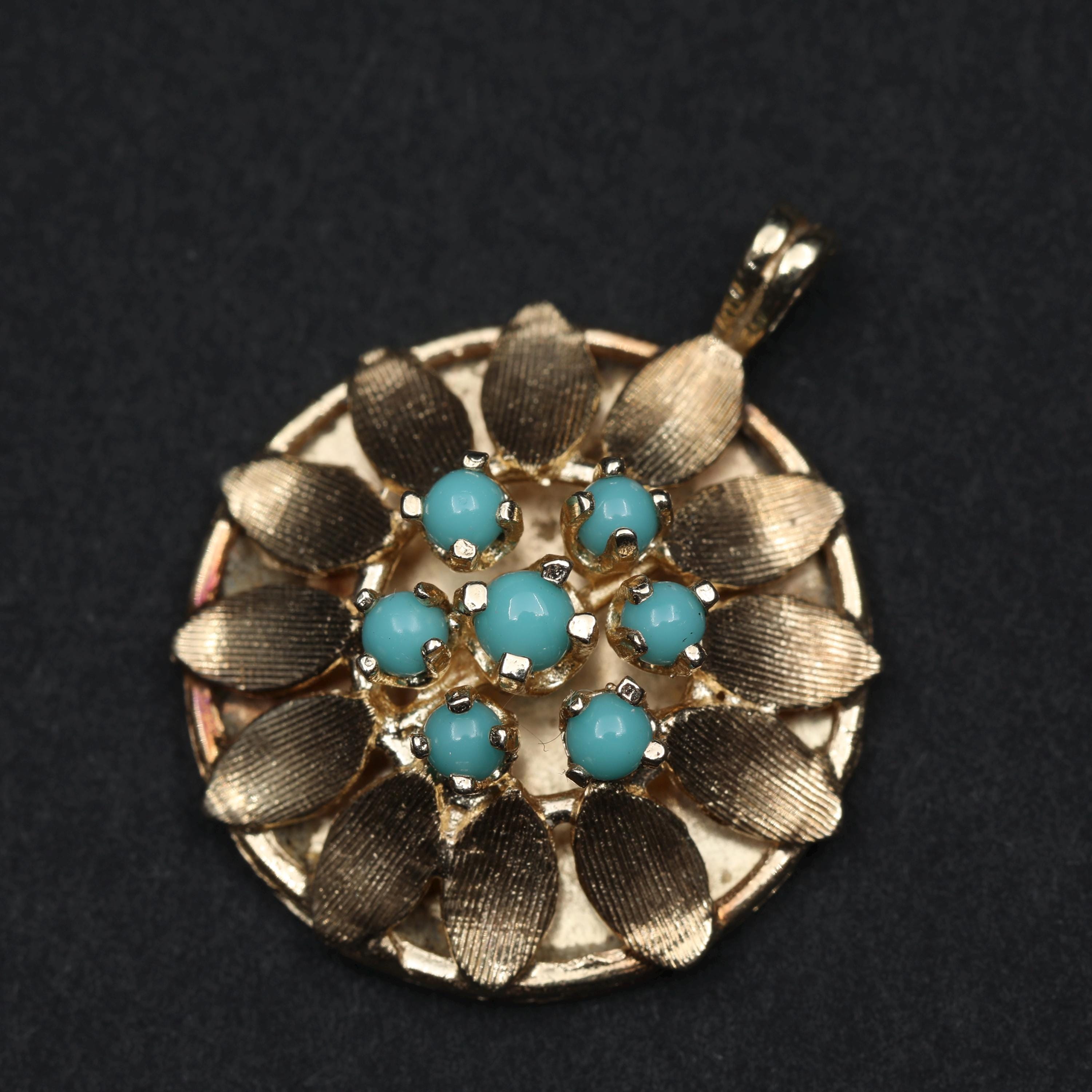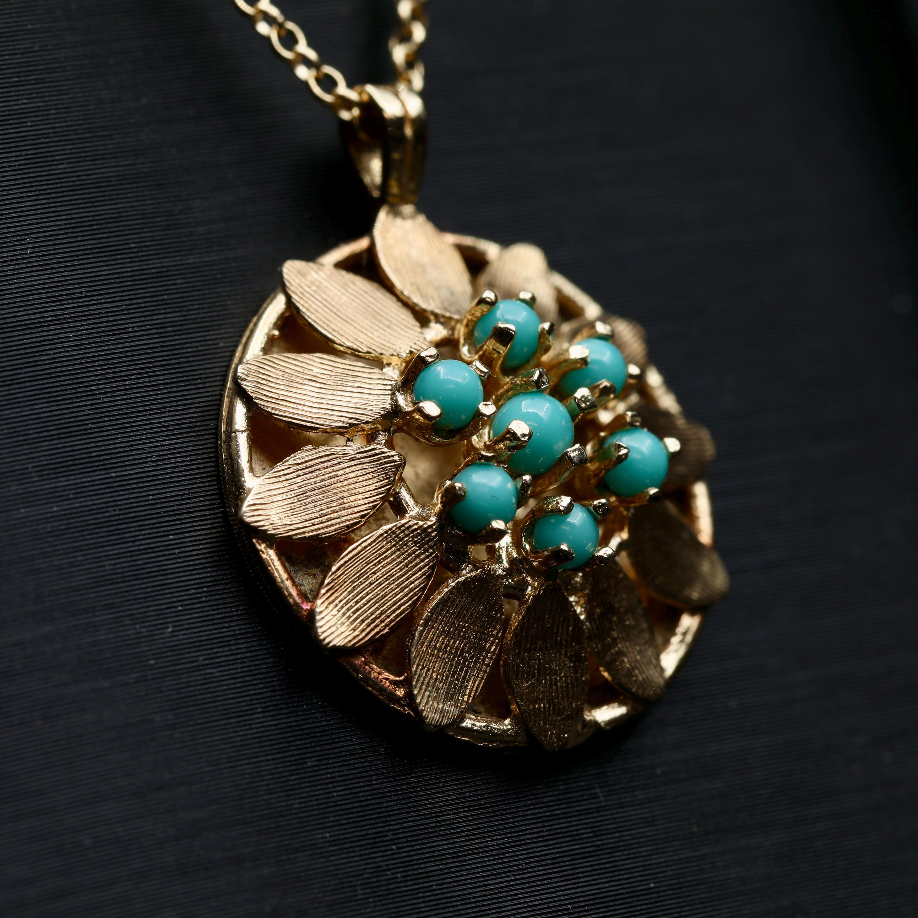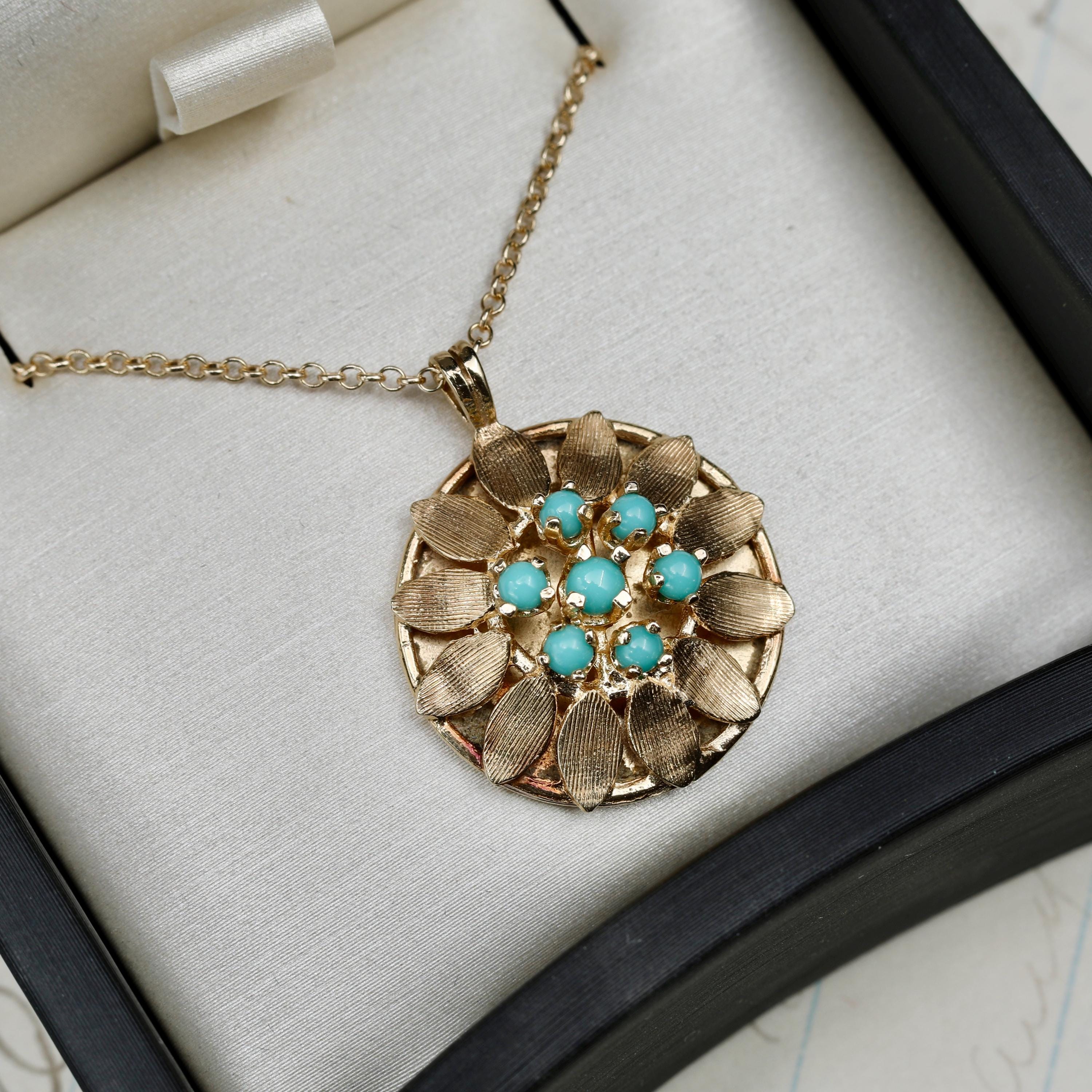 This vintage 1960s pendant features a stylized gold flower set with robin egg blue natural turquoise cabochons. The petals are finished with a Florentine texture, a decorative engraving technique popular in fine mid-century jewelry that creates a soft, shimmering surface across the gold.