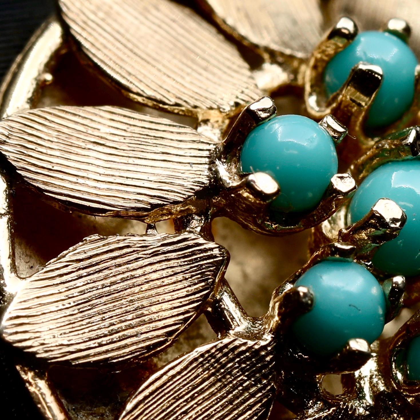 At the center, a cluster of turquoise forms the heart of the flower, their bright blue color standing in beautiful contrast to the warm tone of the gold. The design is both sculptural and balanced, a lovely example of mid-century jewelry that feels equally at home worn alone or layered with other pieces.