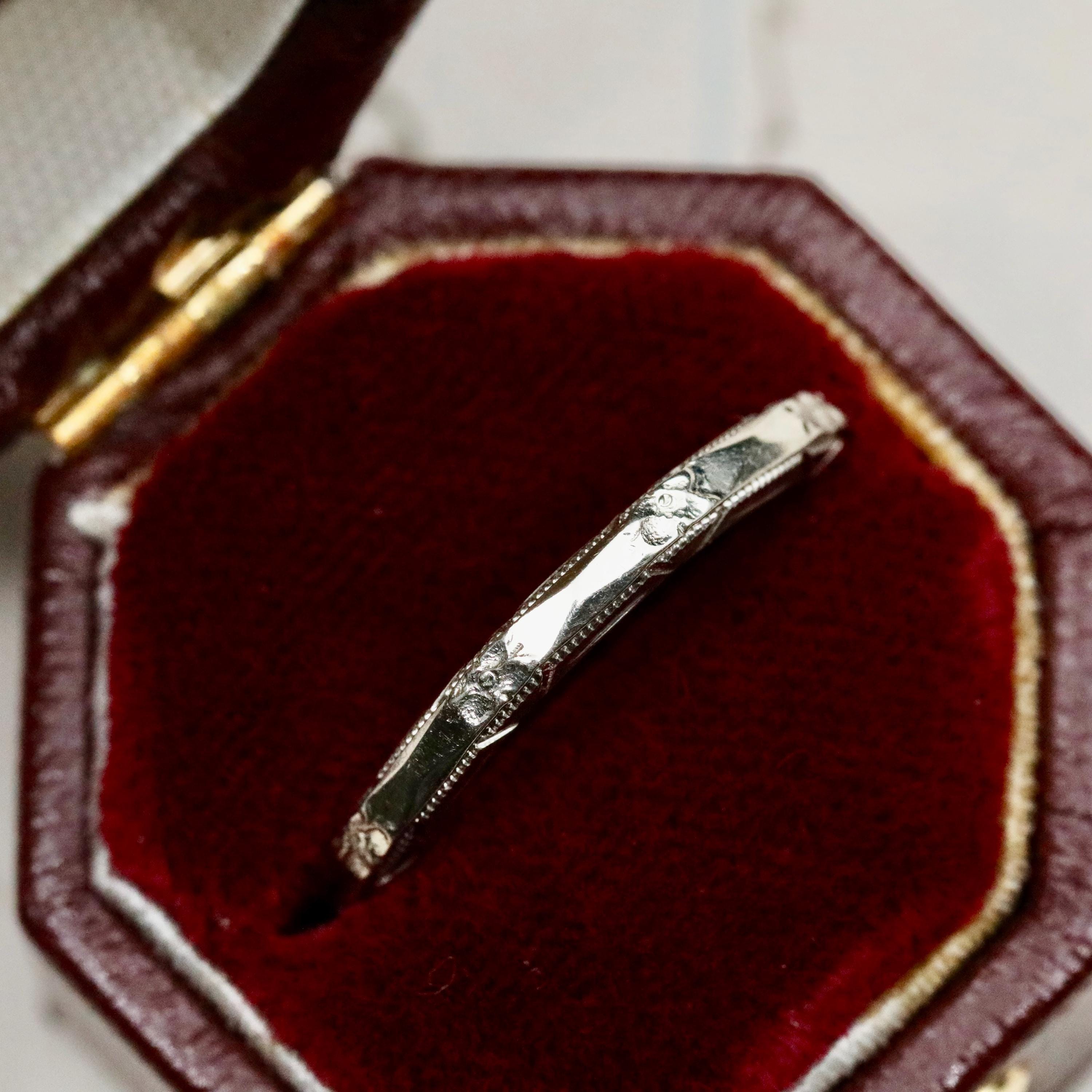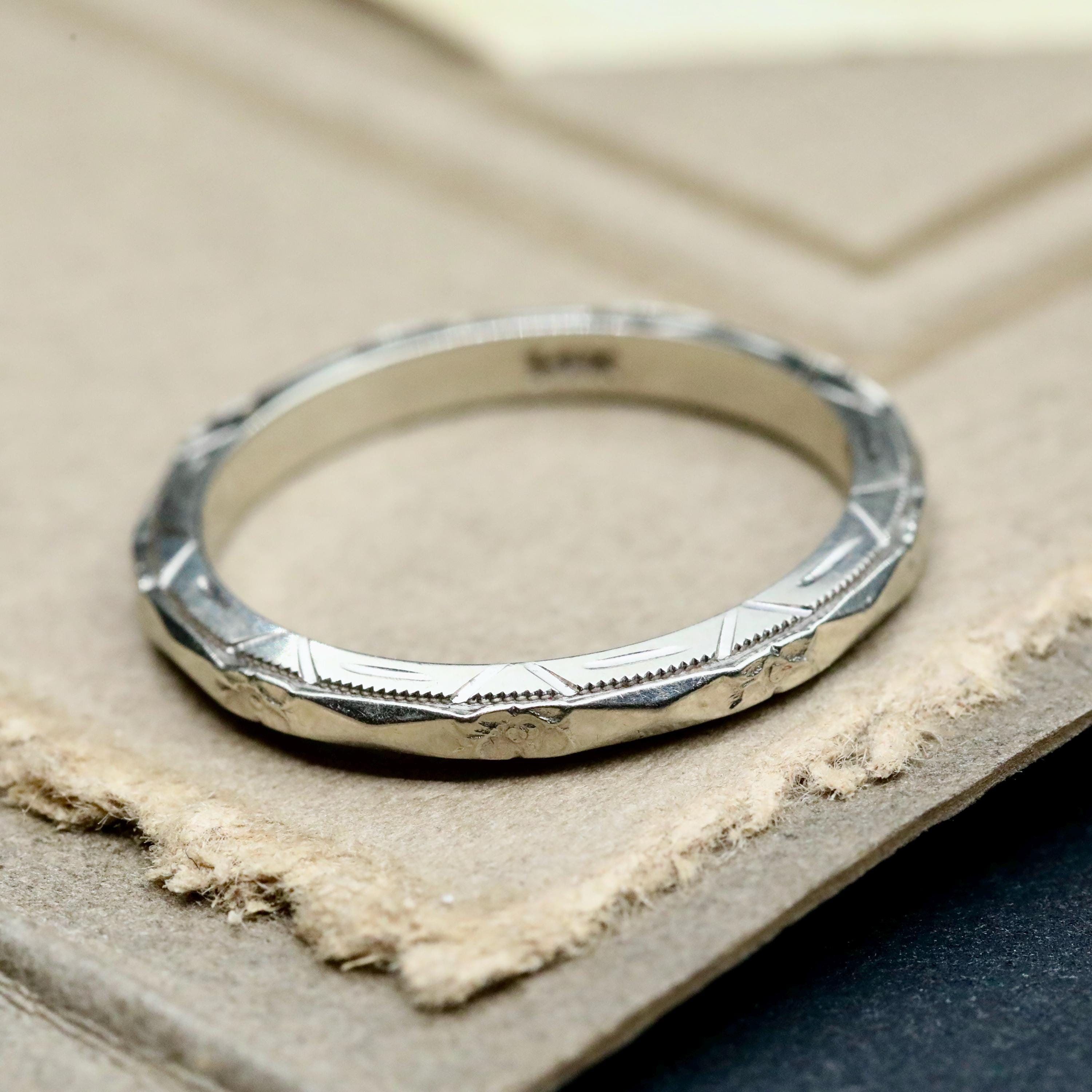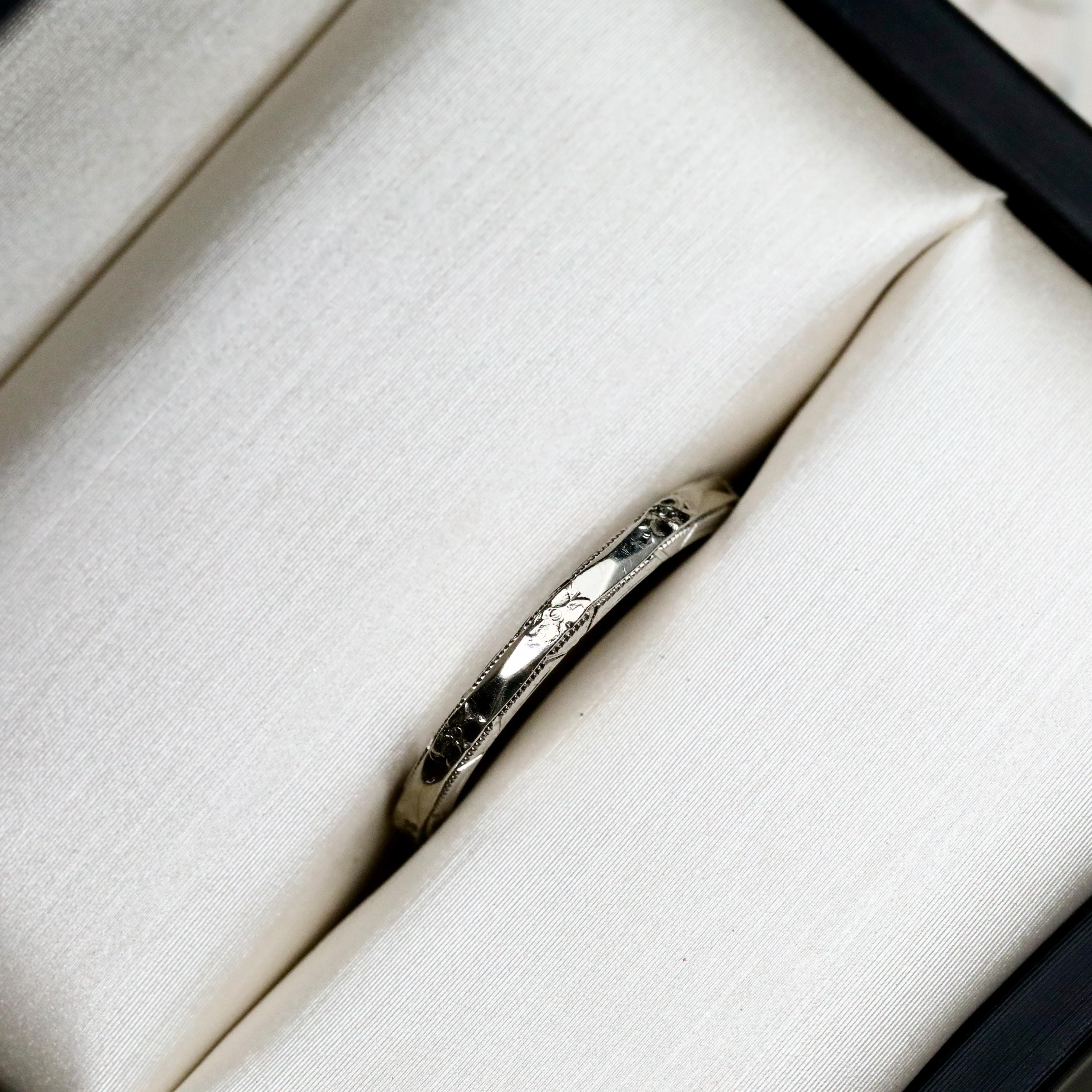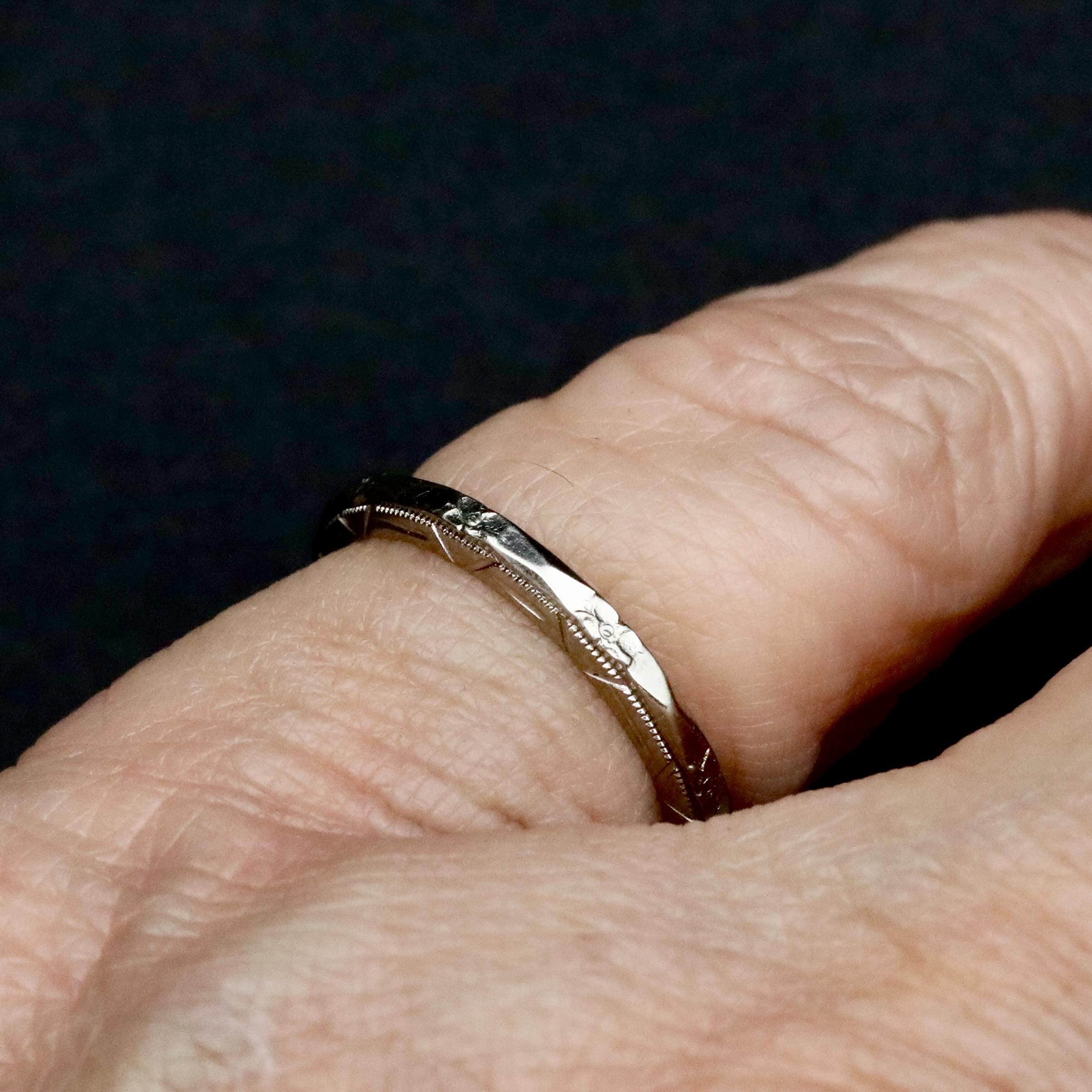 Measuring approximately 2.16 mm wide and 1.94 mm thick, the ring is a US size 5.5. It is not resizable, as altering the band would compromise the original engraving.