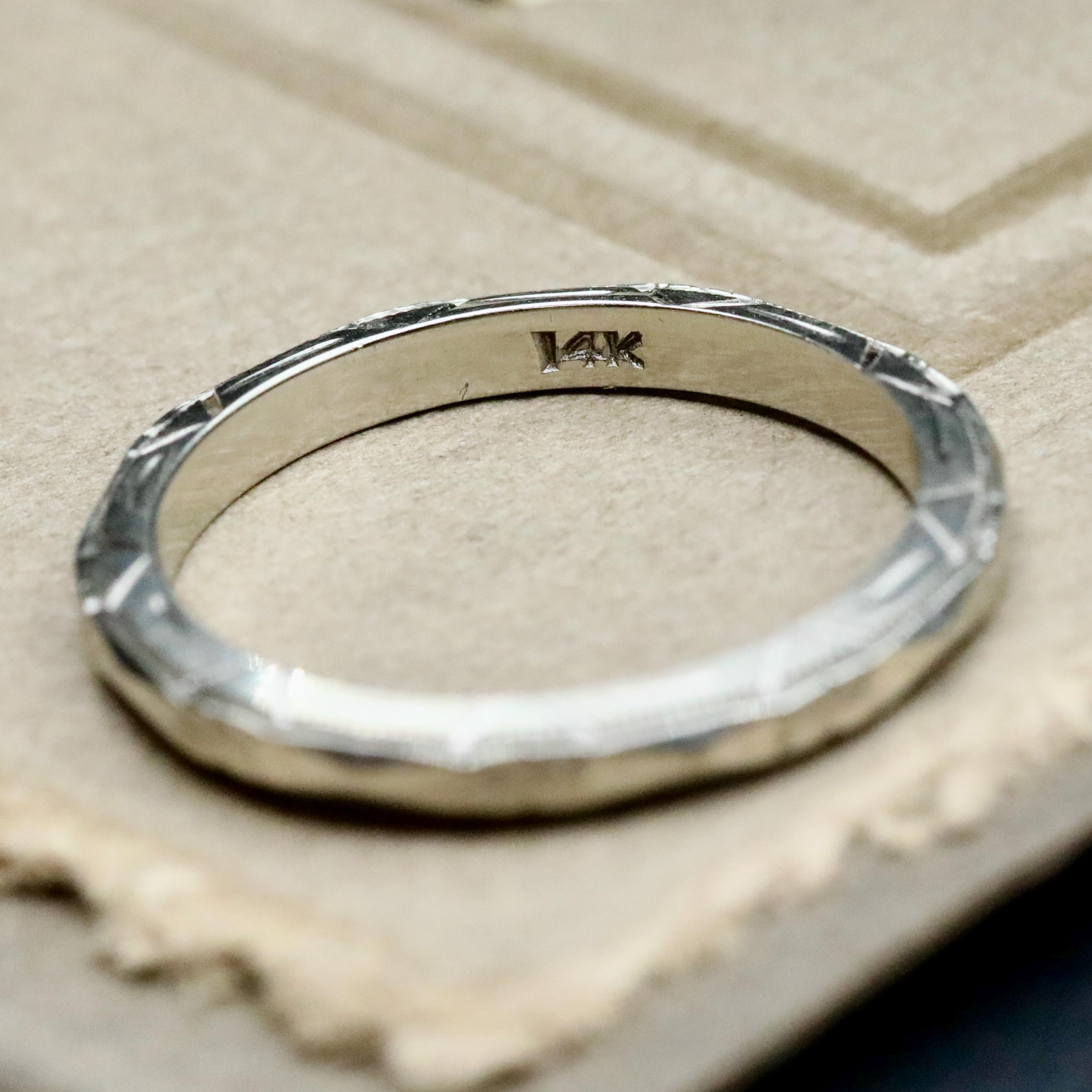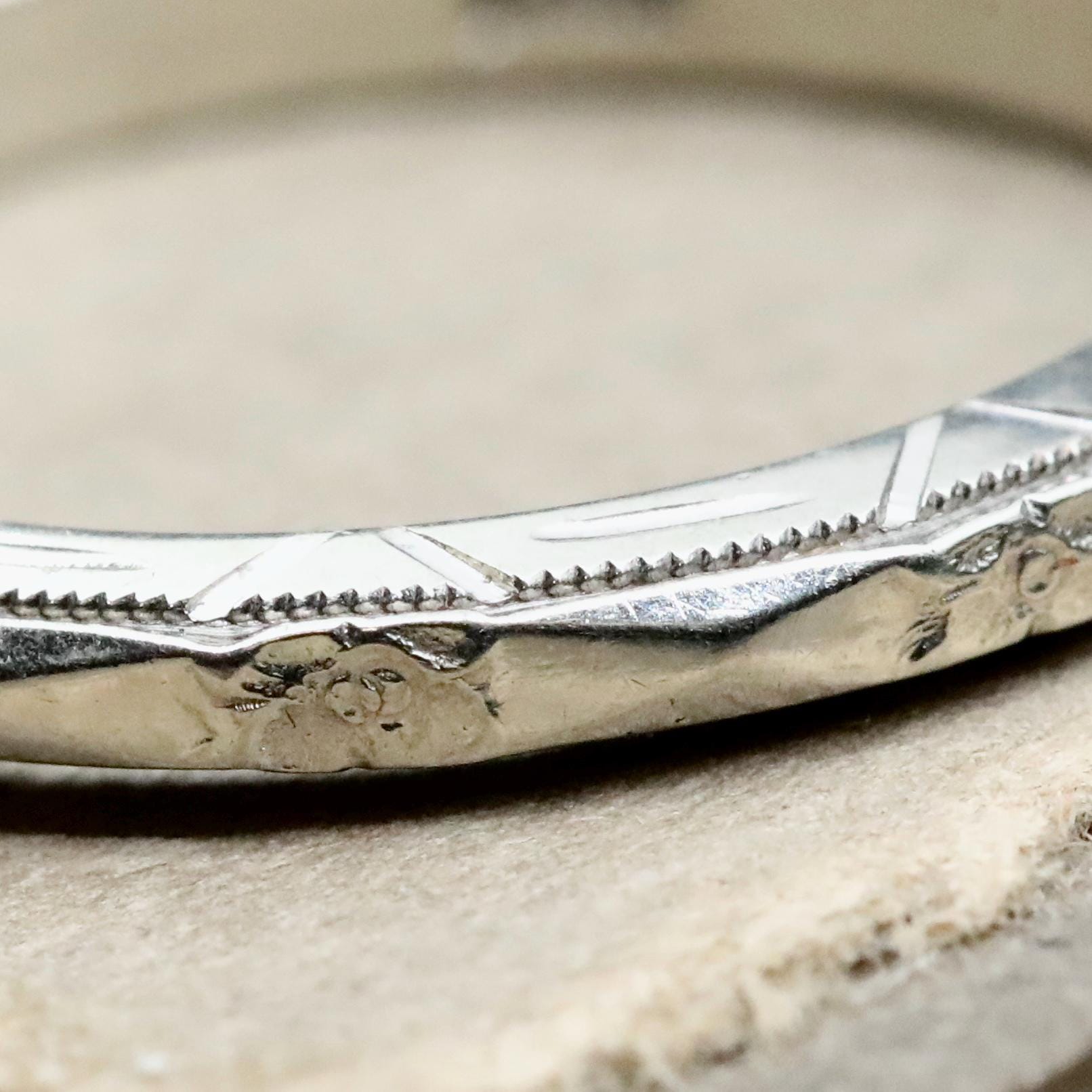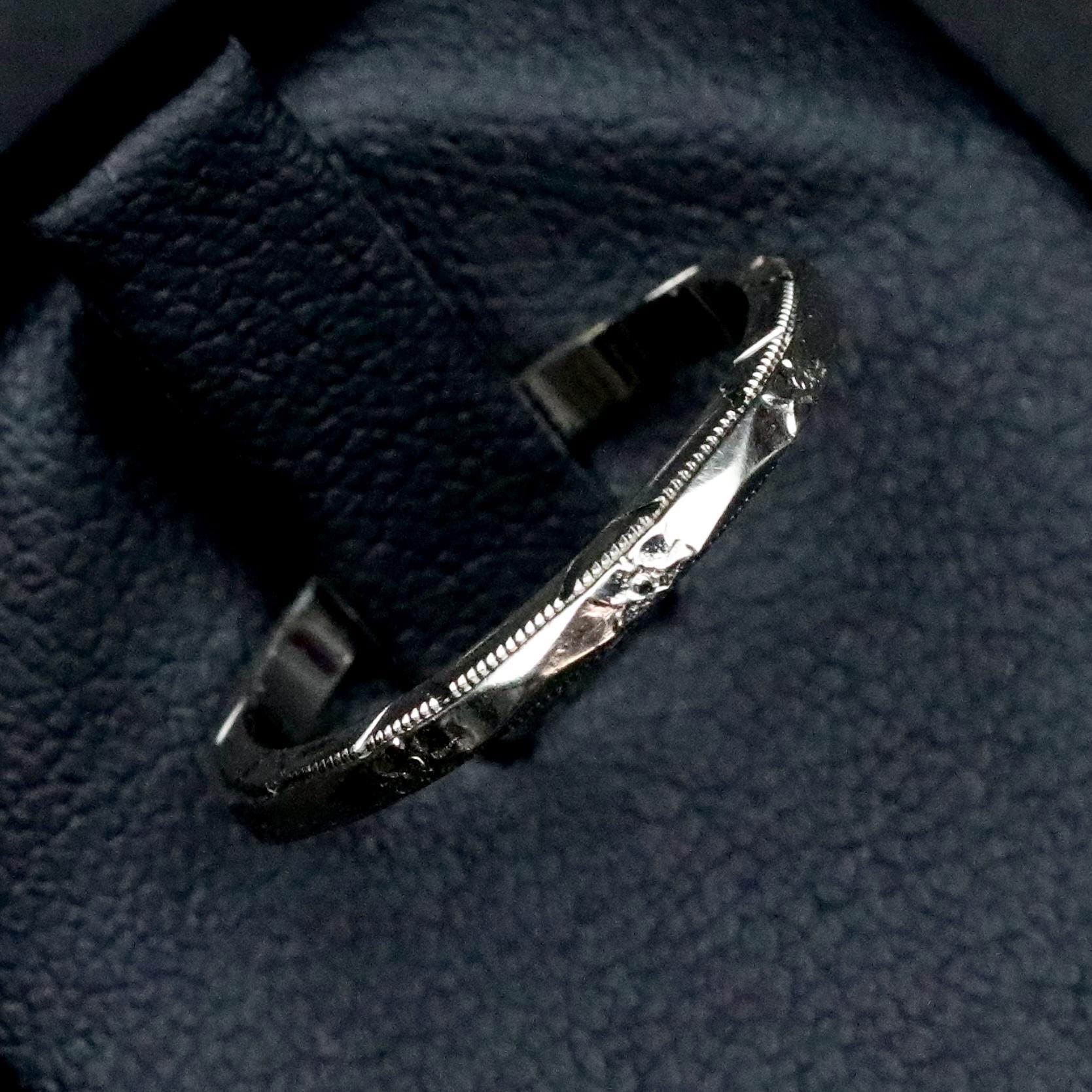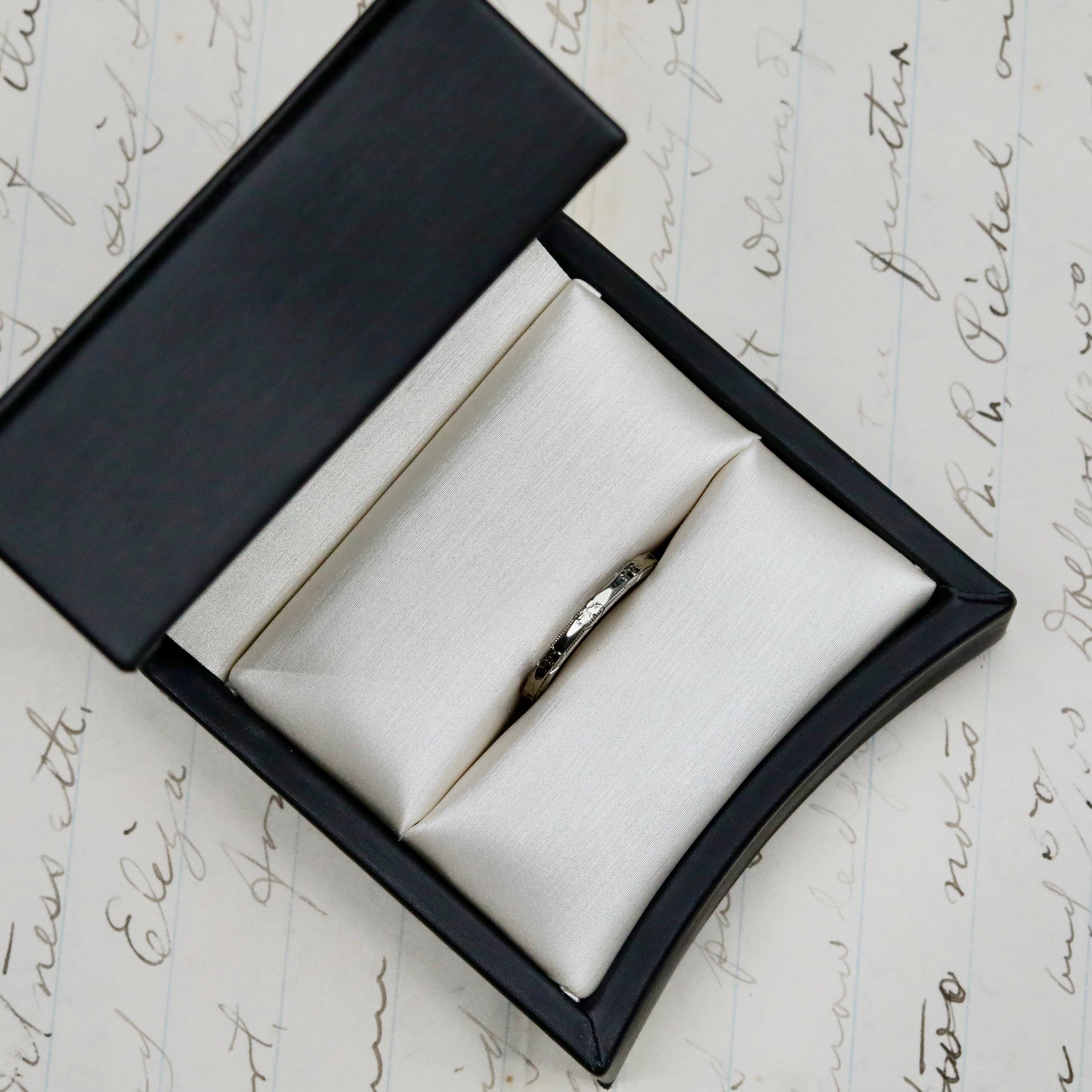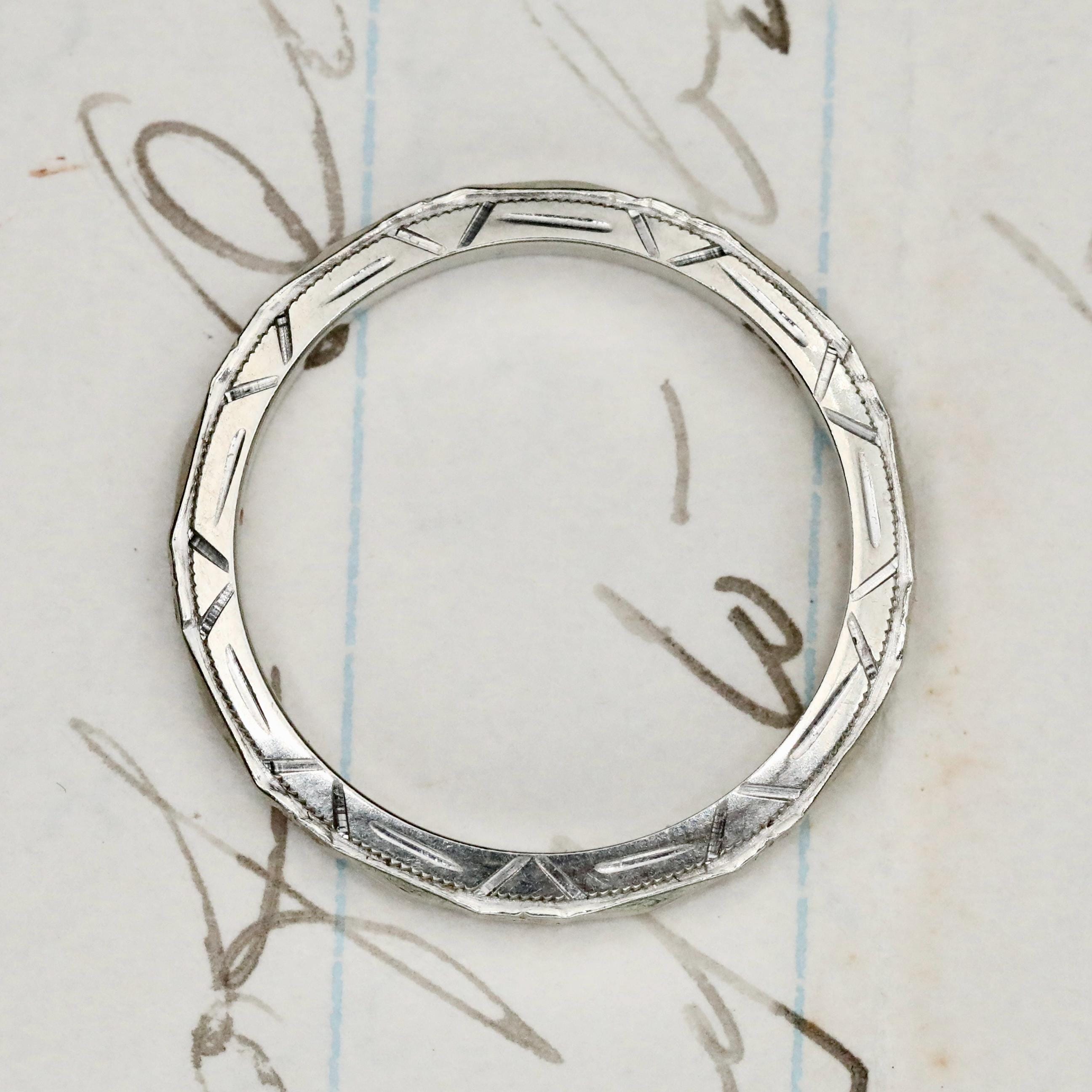 Measuring approximately 2.16 mm wide and 1.94 mm thick, the ring is a US size 5.5. It is not resizable, as altering the band would compromise the original engraving.