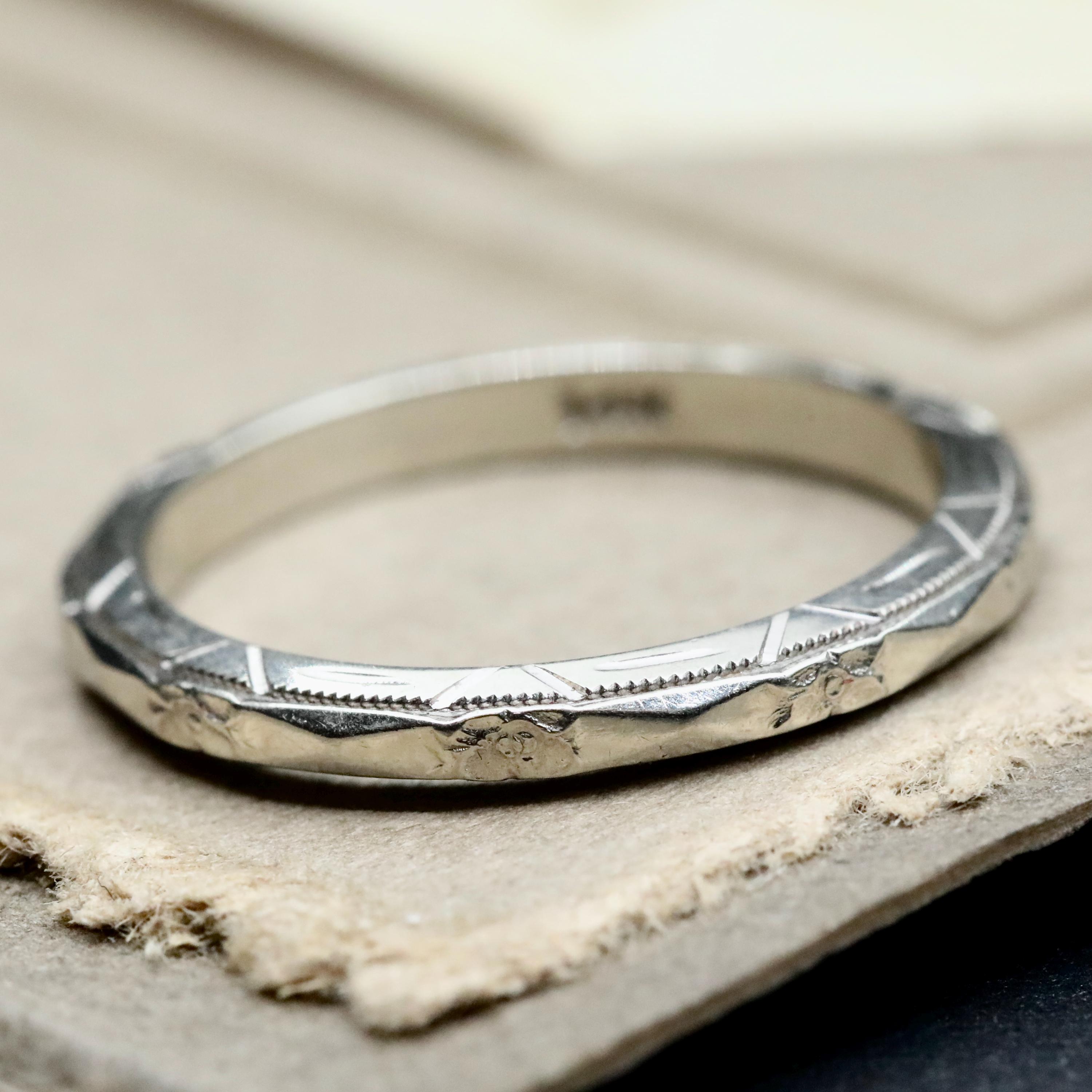 This antique 14K white gold wedding band features a crisp orange blossom floral pattern framed by delicate milgrain edges. The engraving wraps continuously around the band, a classic motif from the Art Deco period.