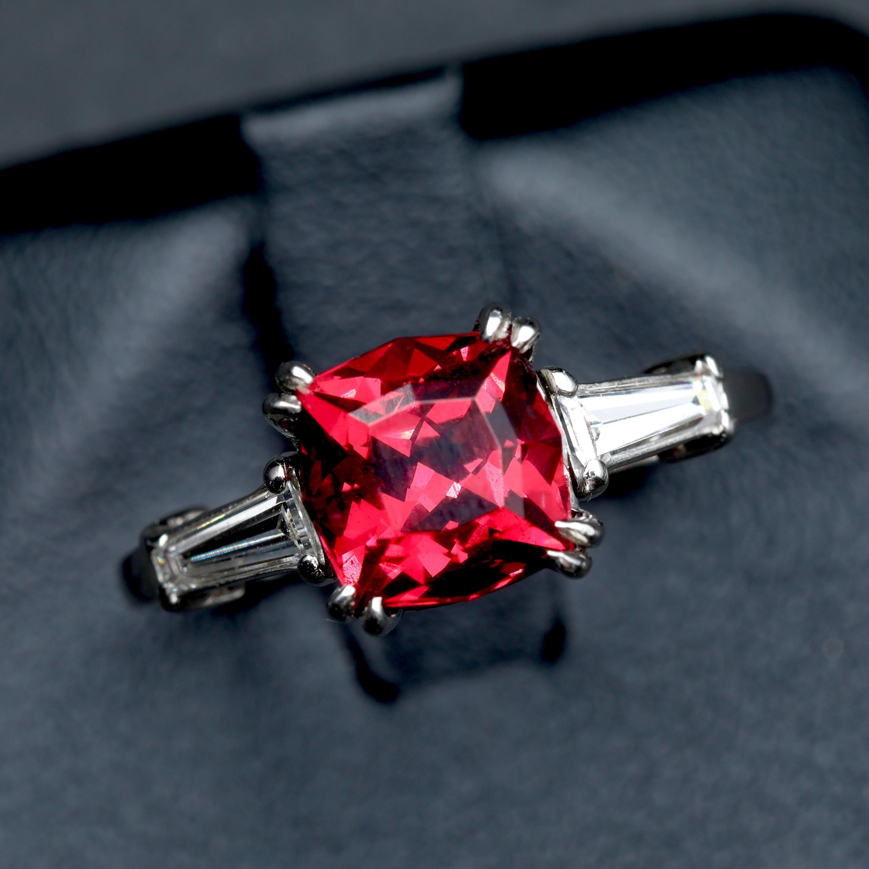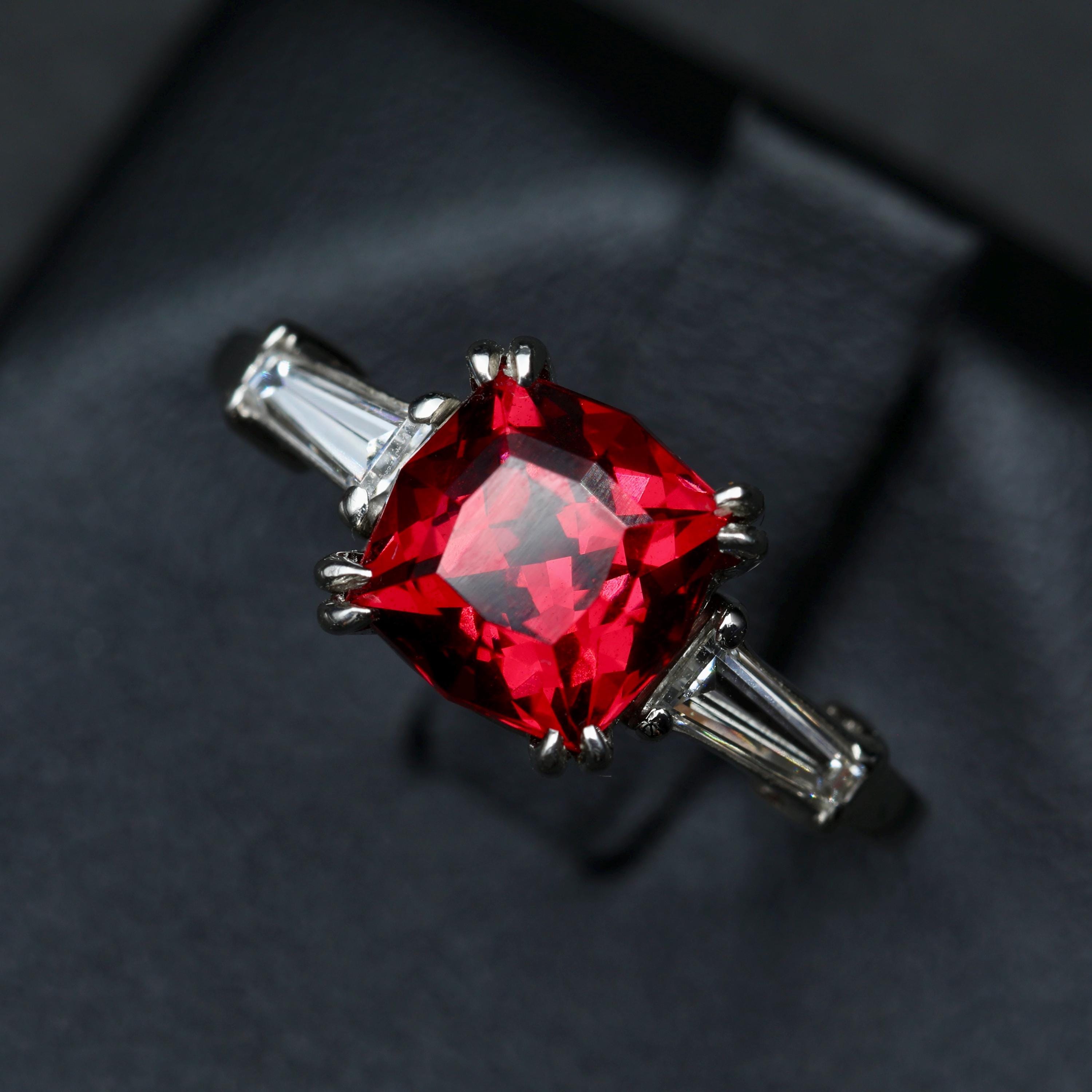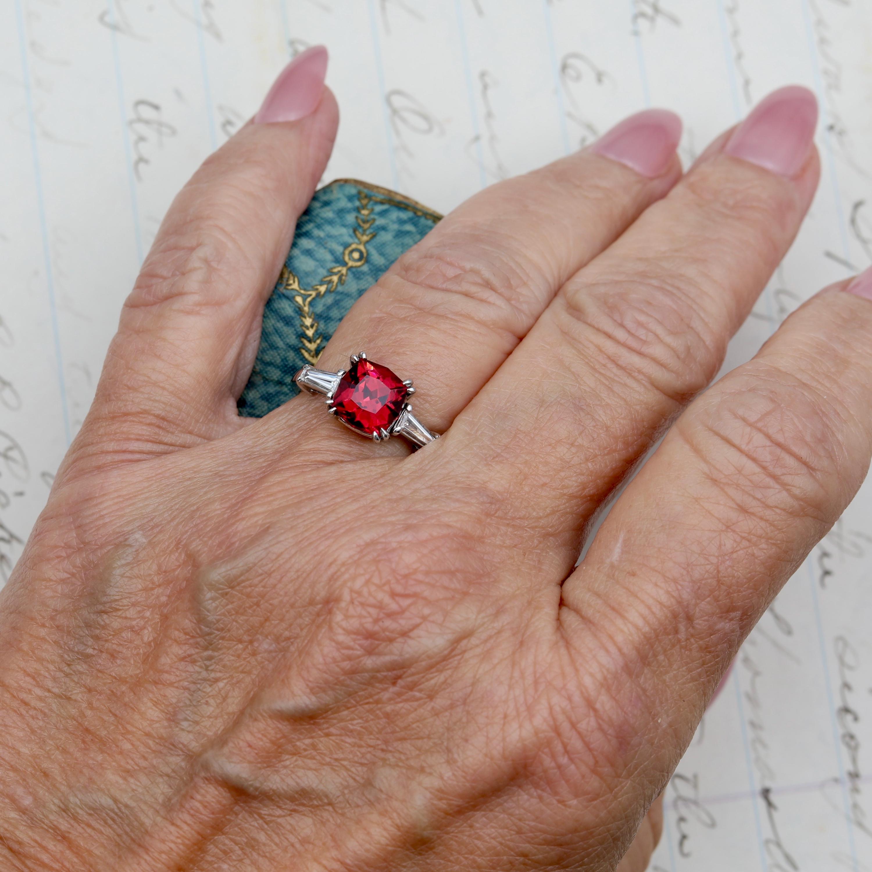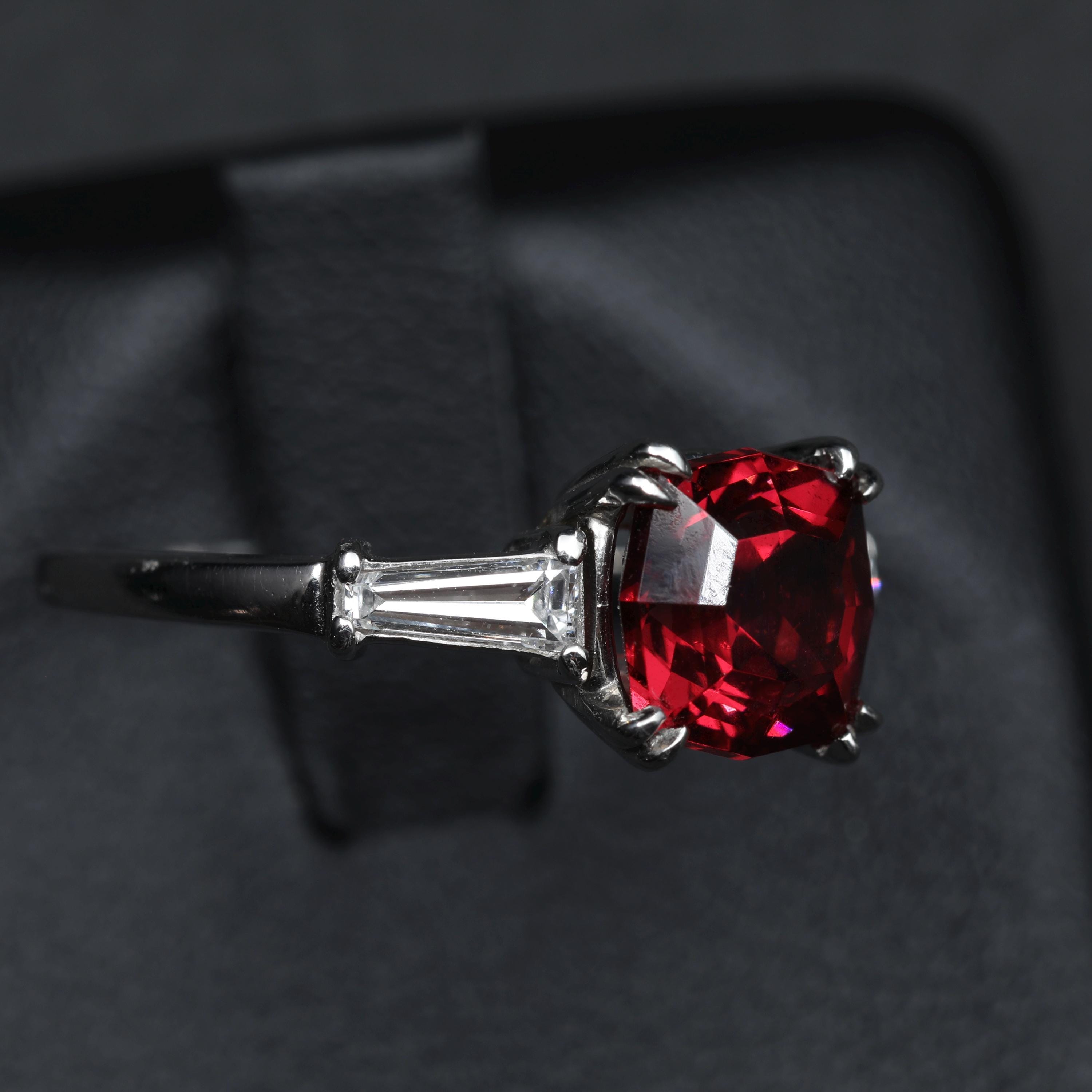This platinum garnet and diamond ring centers a vivid 3.01 carat cushion-cut pyrope garnet, accented by tapered baguette diamonds. The garnet shows rich red saturation with crisp faceting and lively brilliance that remains bright across different lighting conditions.
