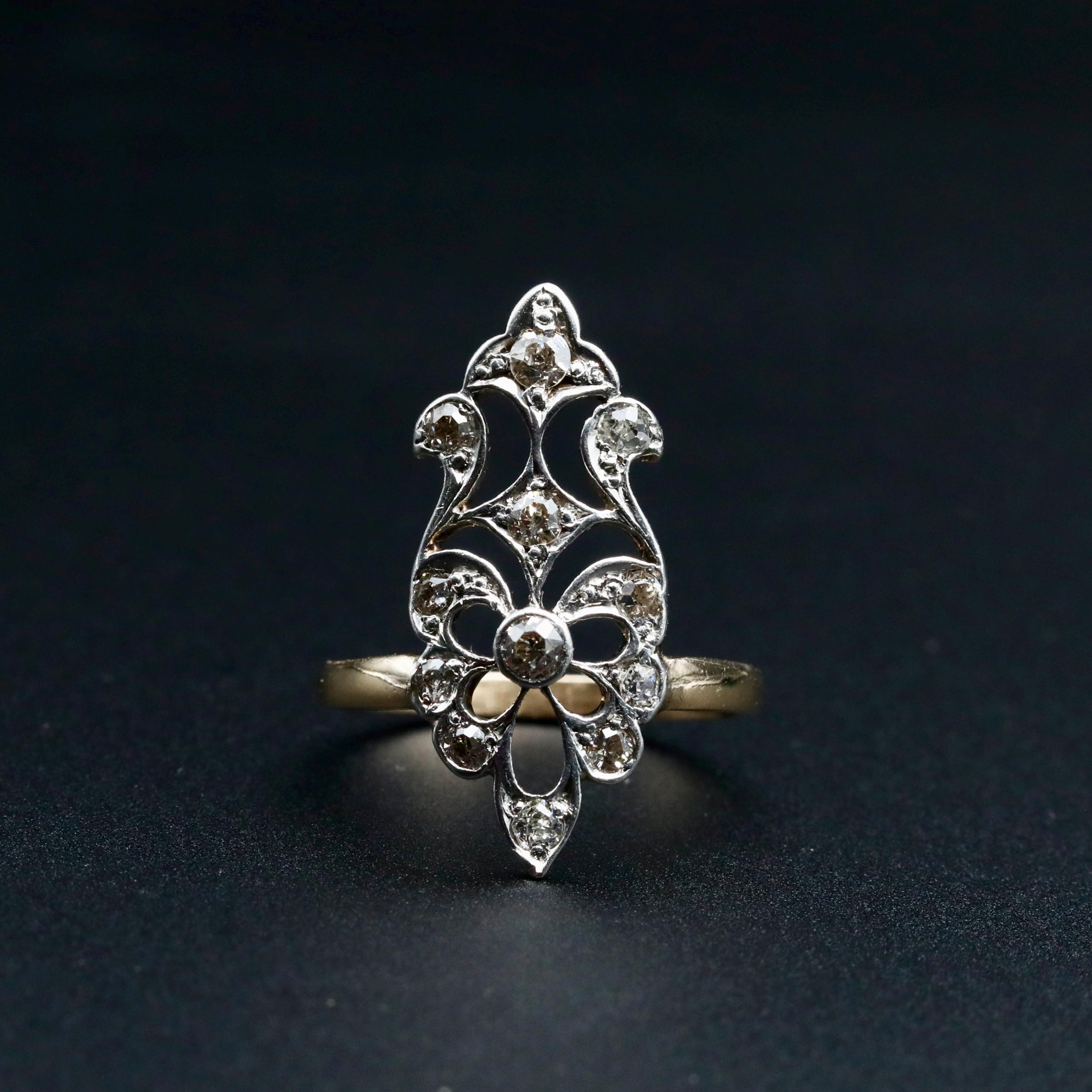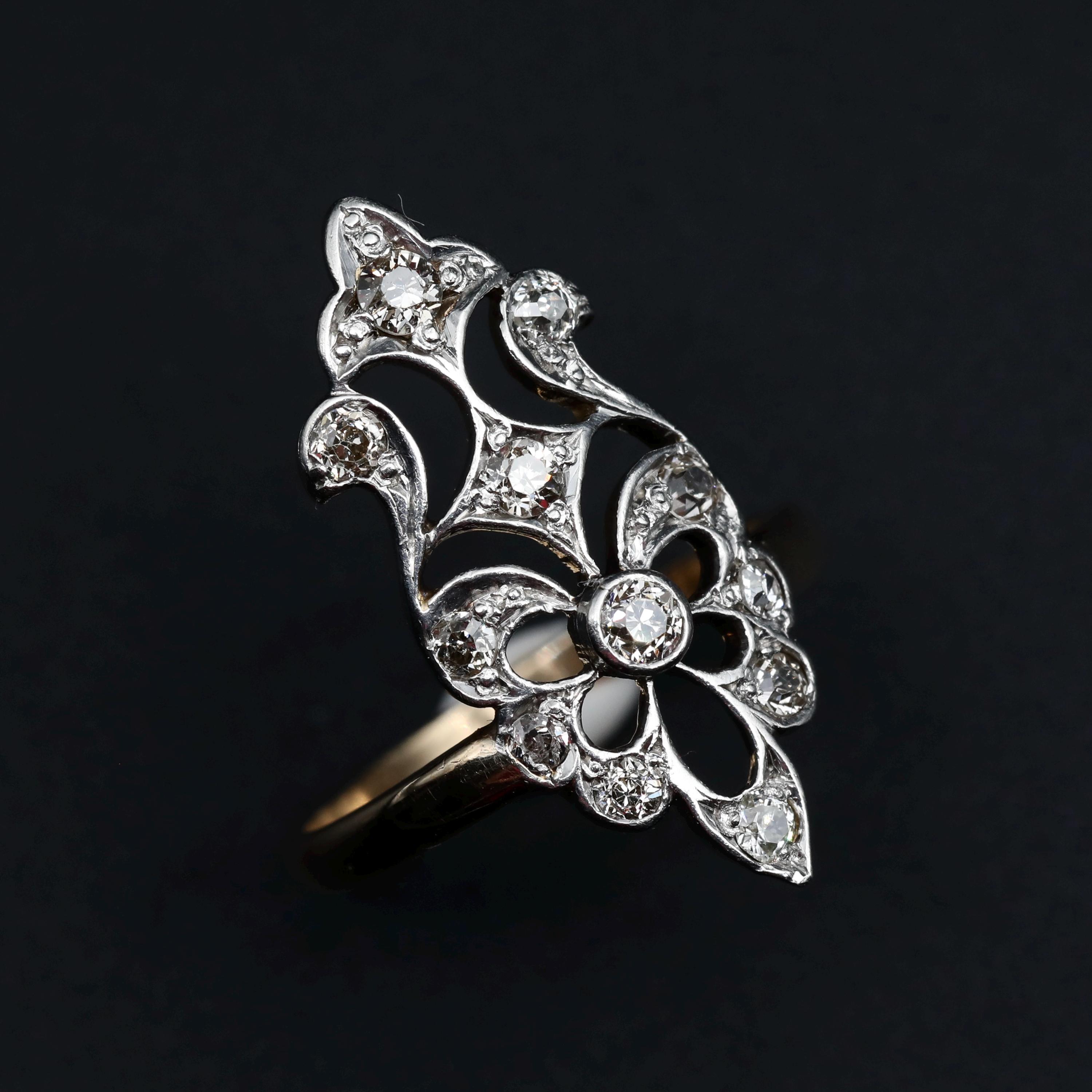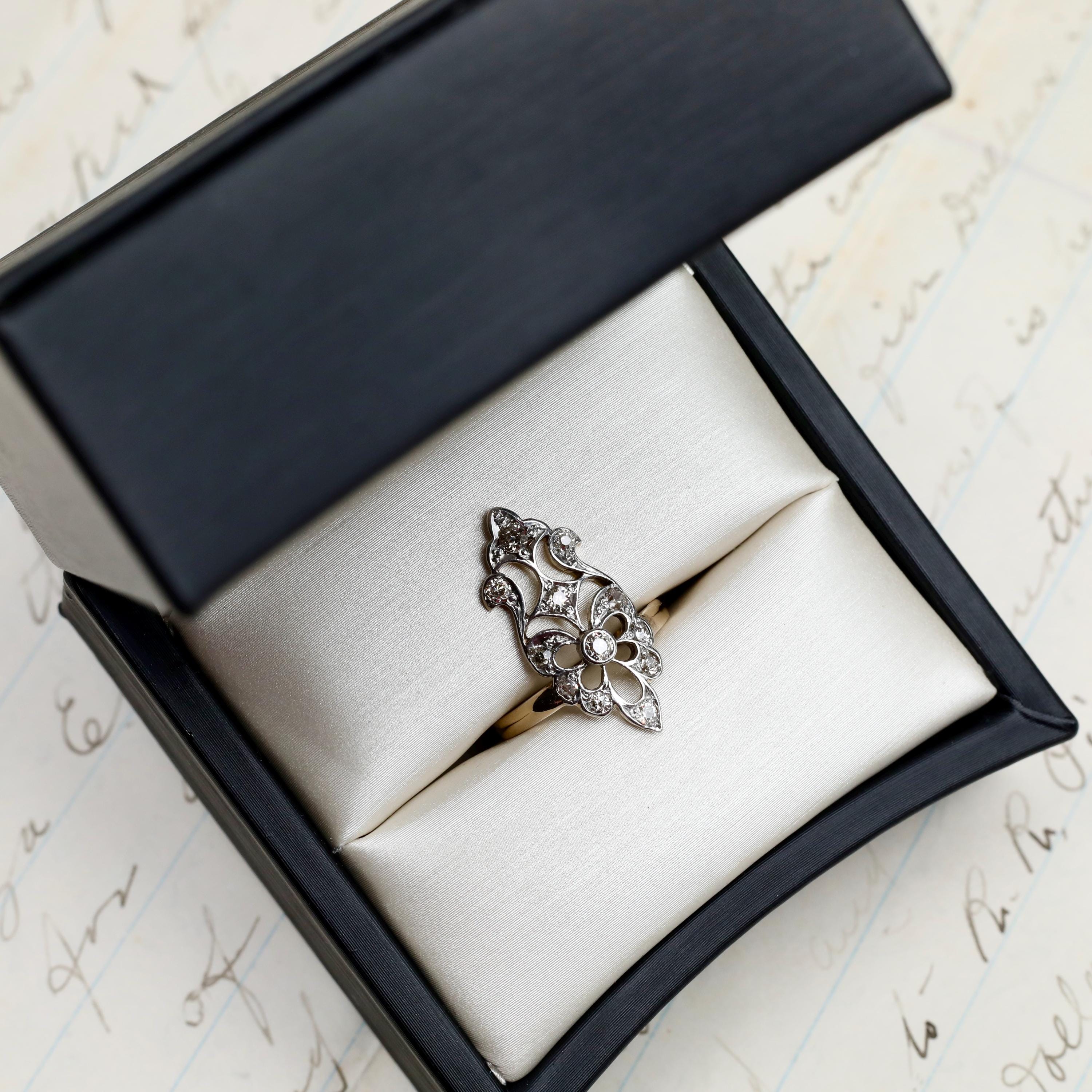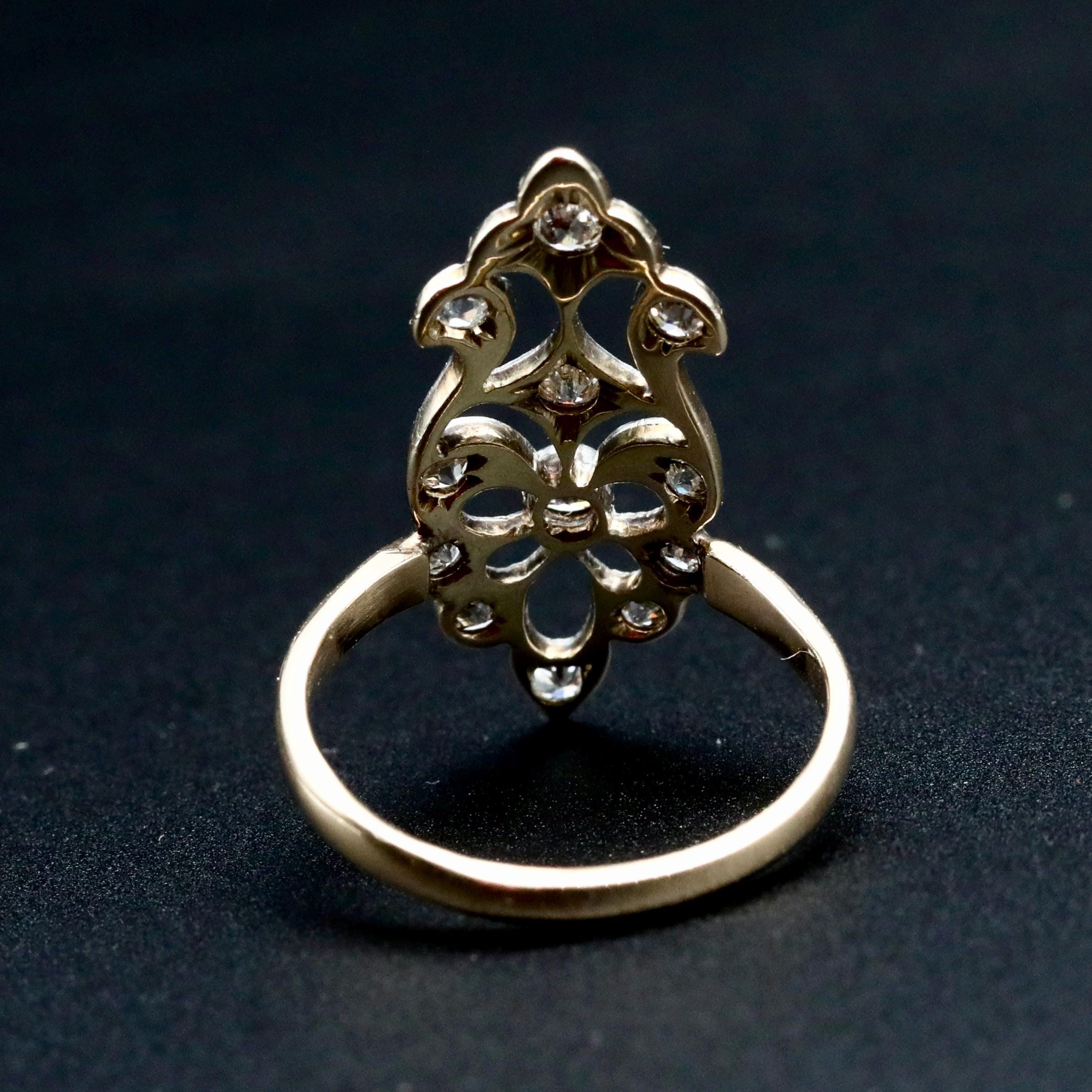 A refined Belle Époque ring, designed in the elongated navette form that defines the period. The surface is set with old mine cut diamonds, offering a soft, antique brilliance that feels distinct from modern stones.