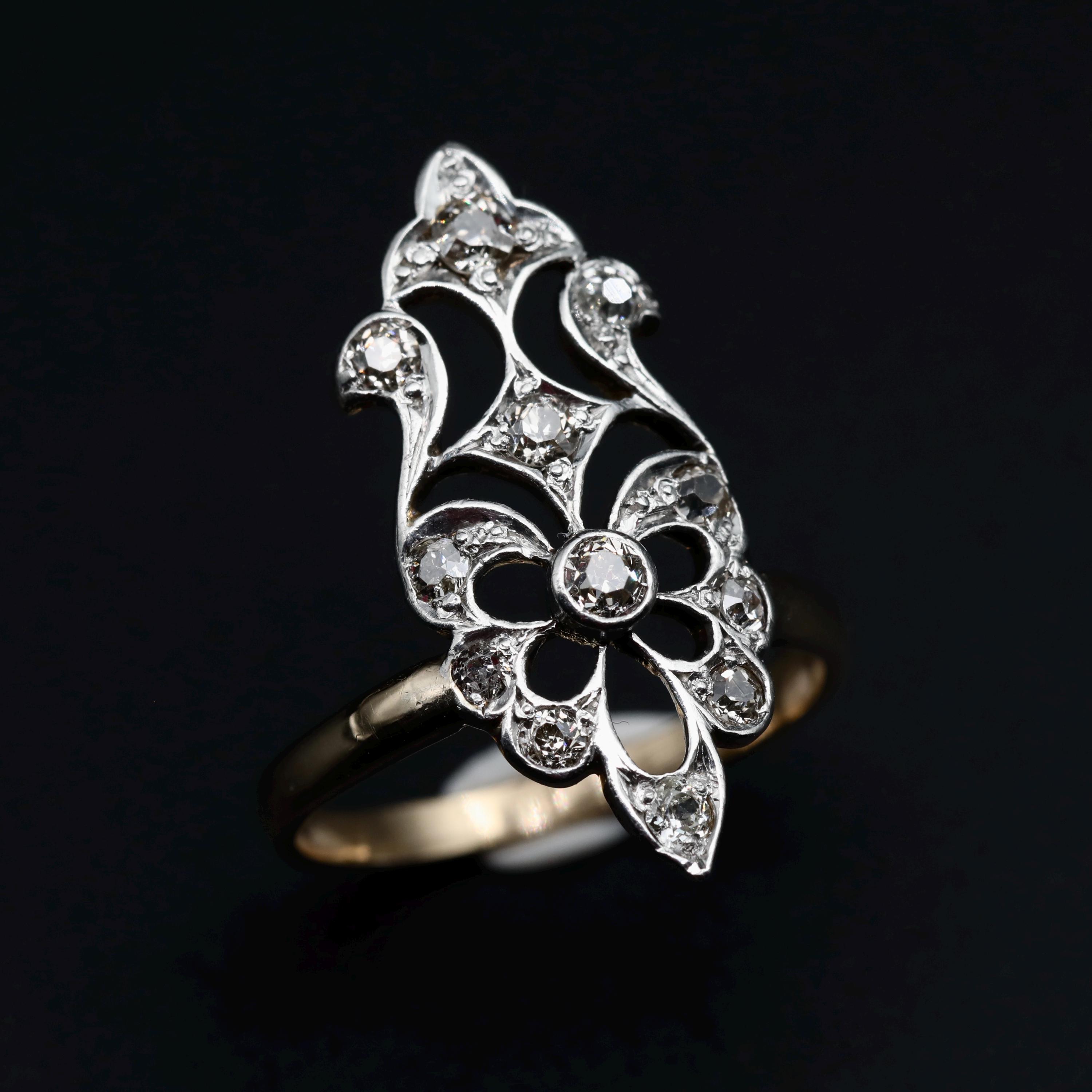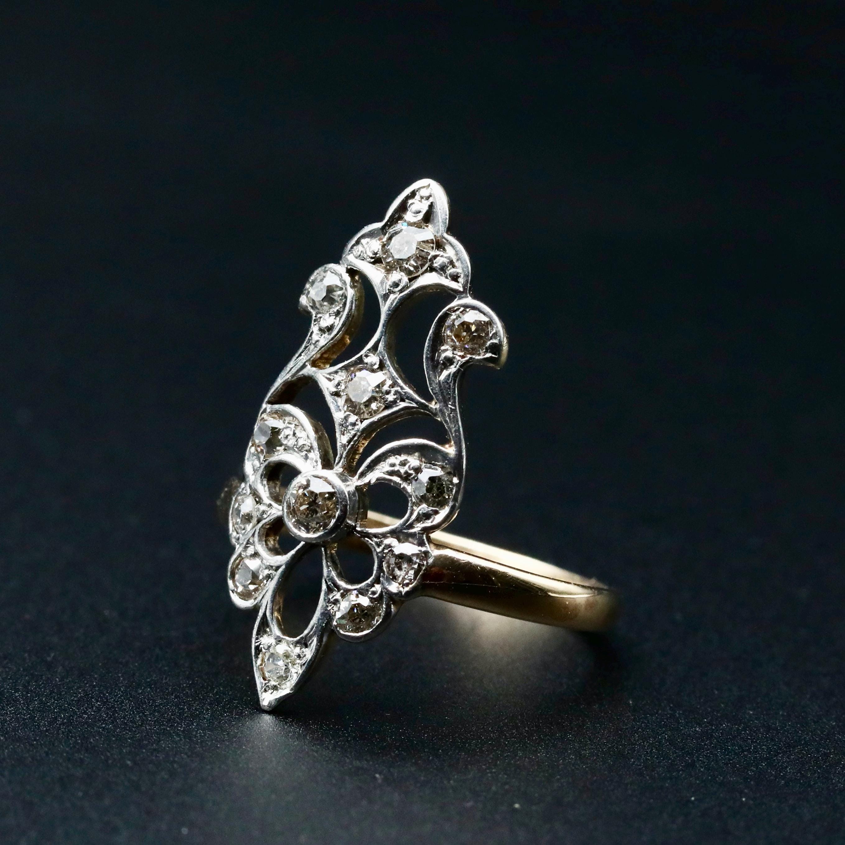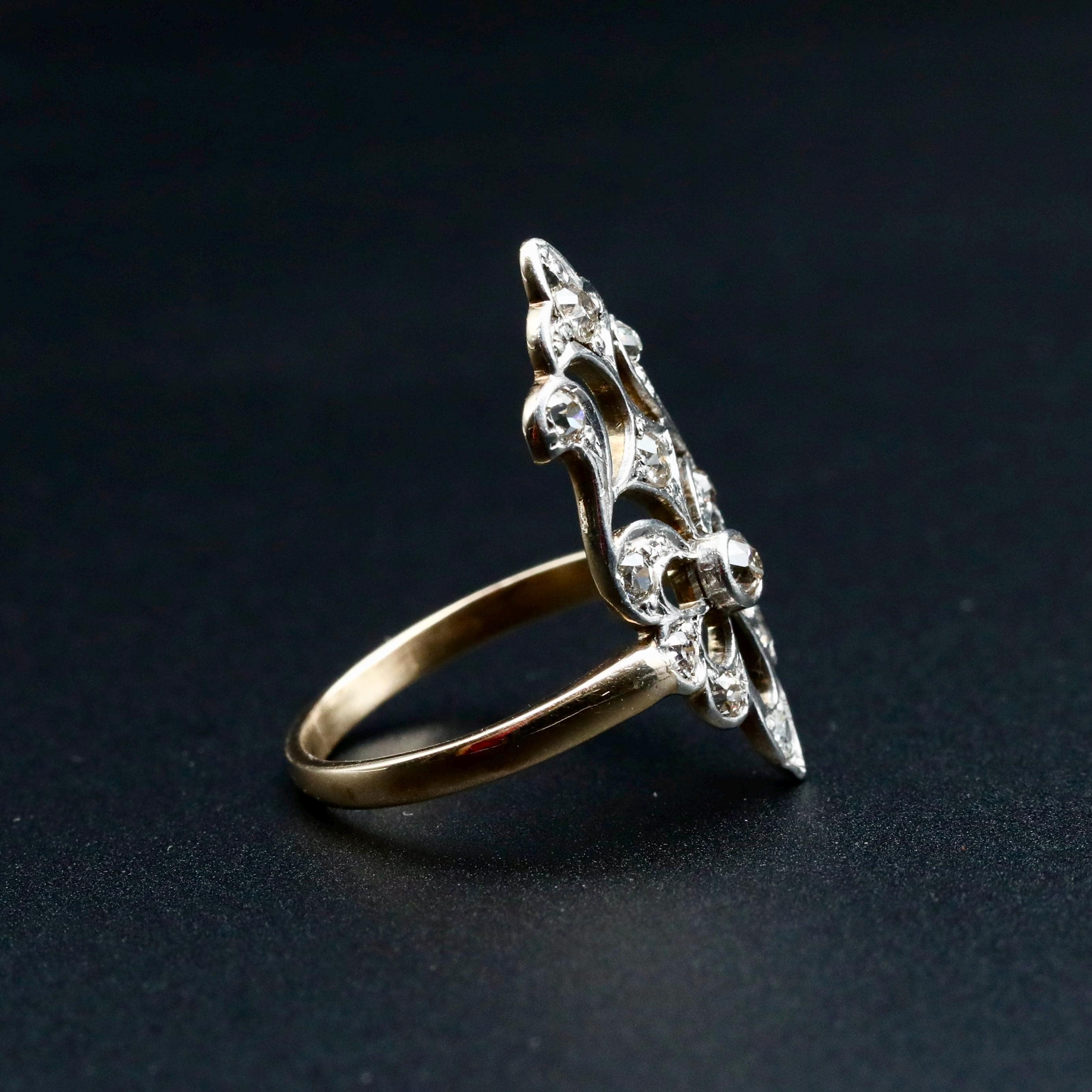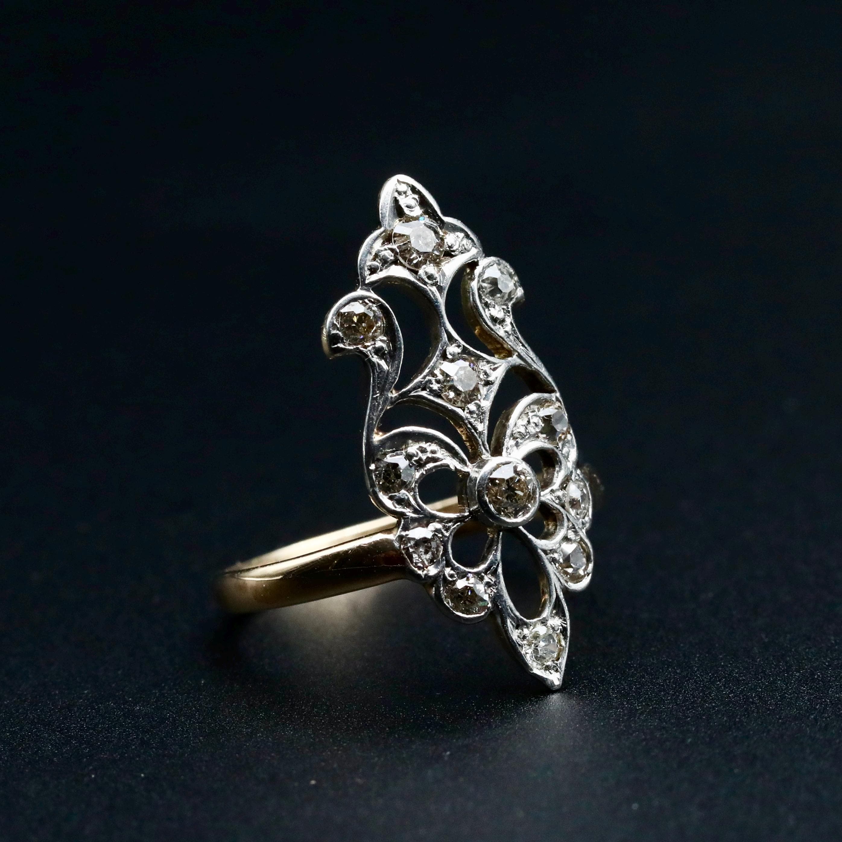 A refined Belle Époque ring, designed in the elongated navette form that defines the period. The surface is set with old mine cut diamonds, offering a soft, antique brilliance that feels distinct from modern stones.