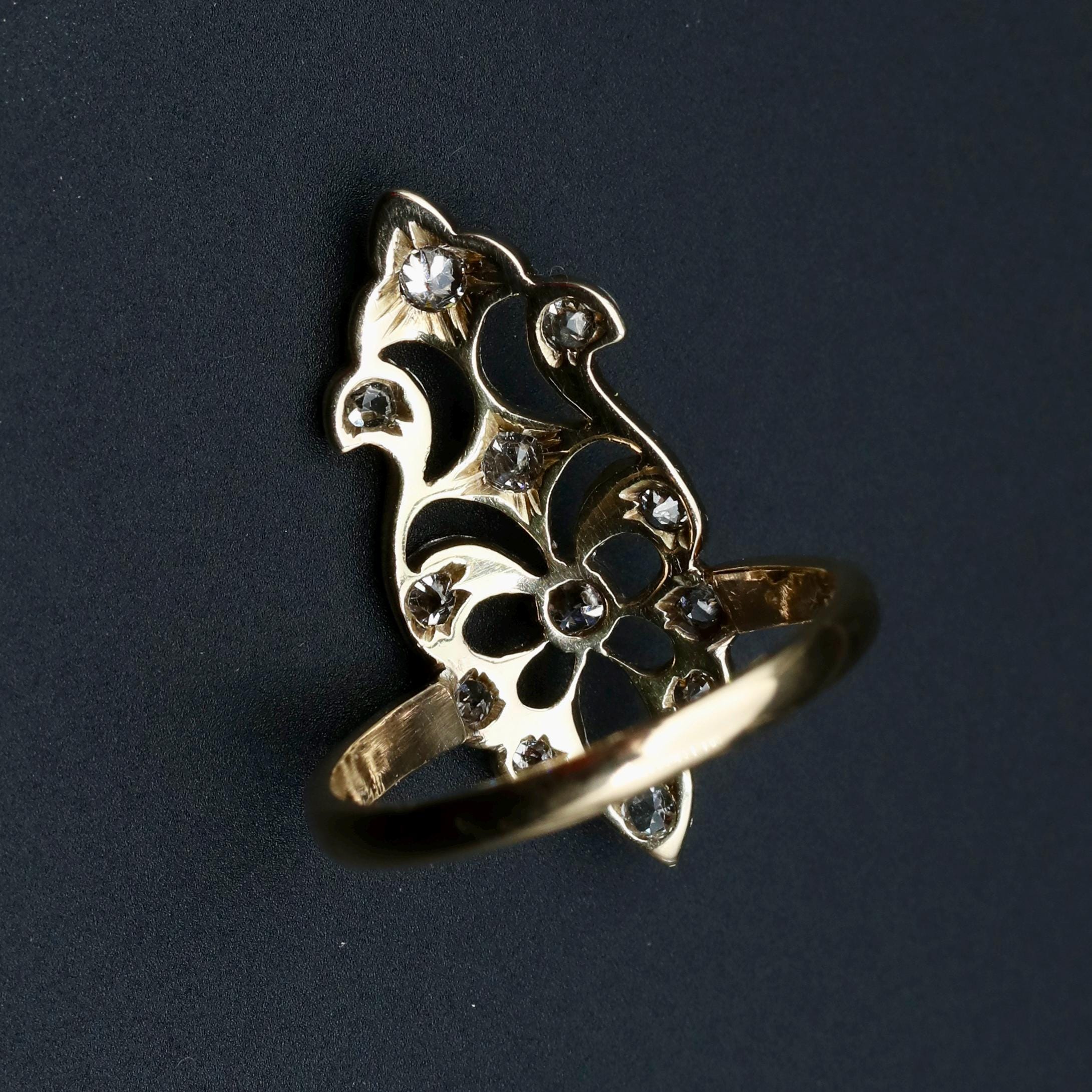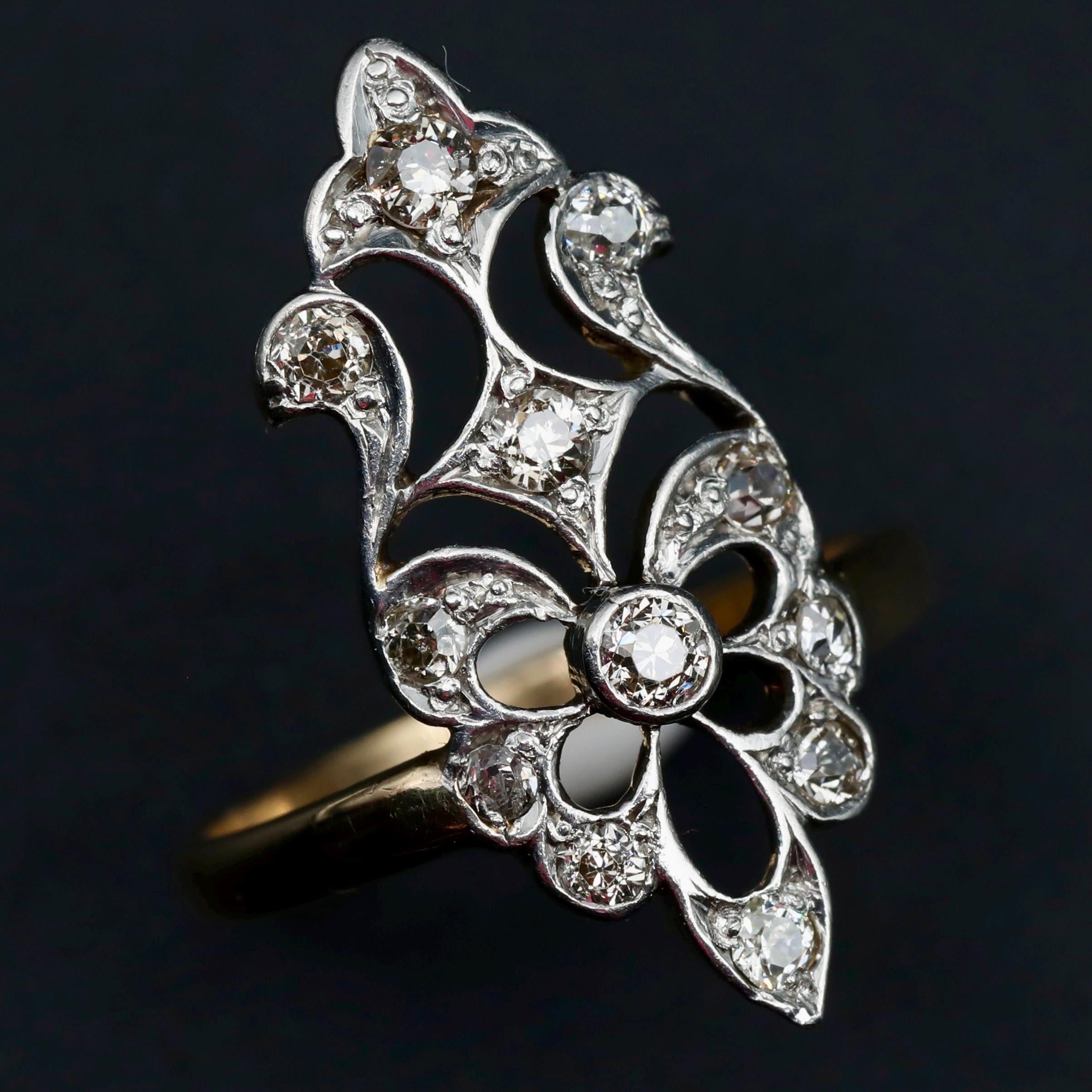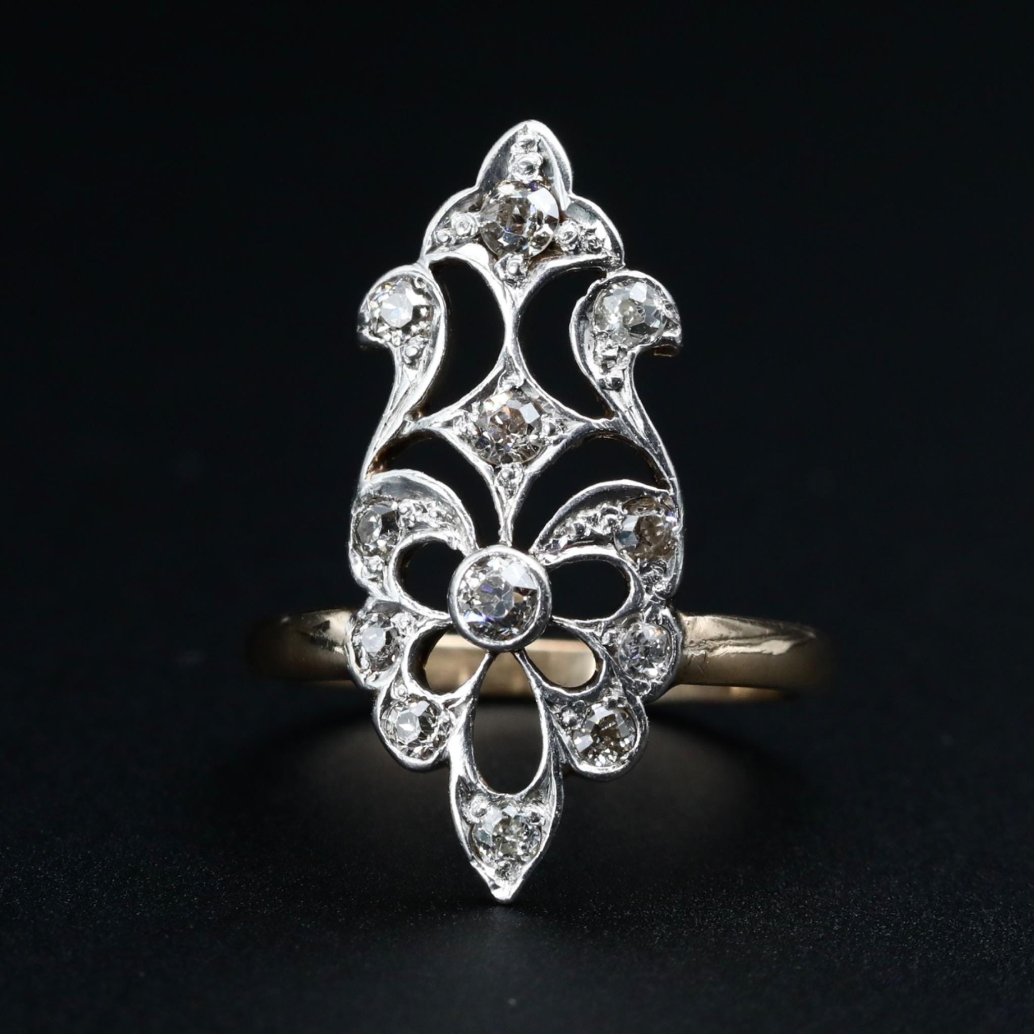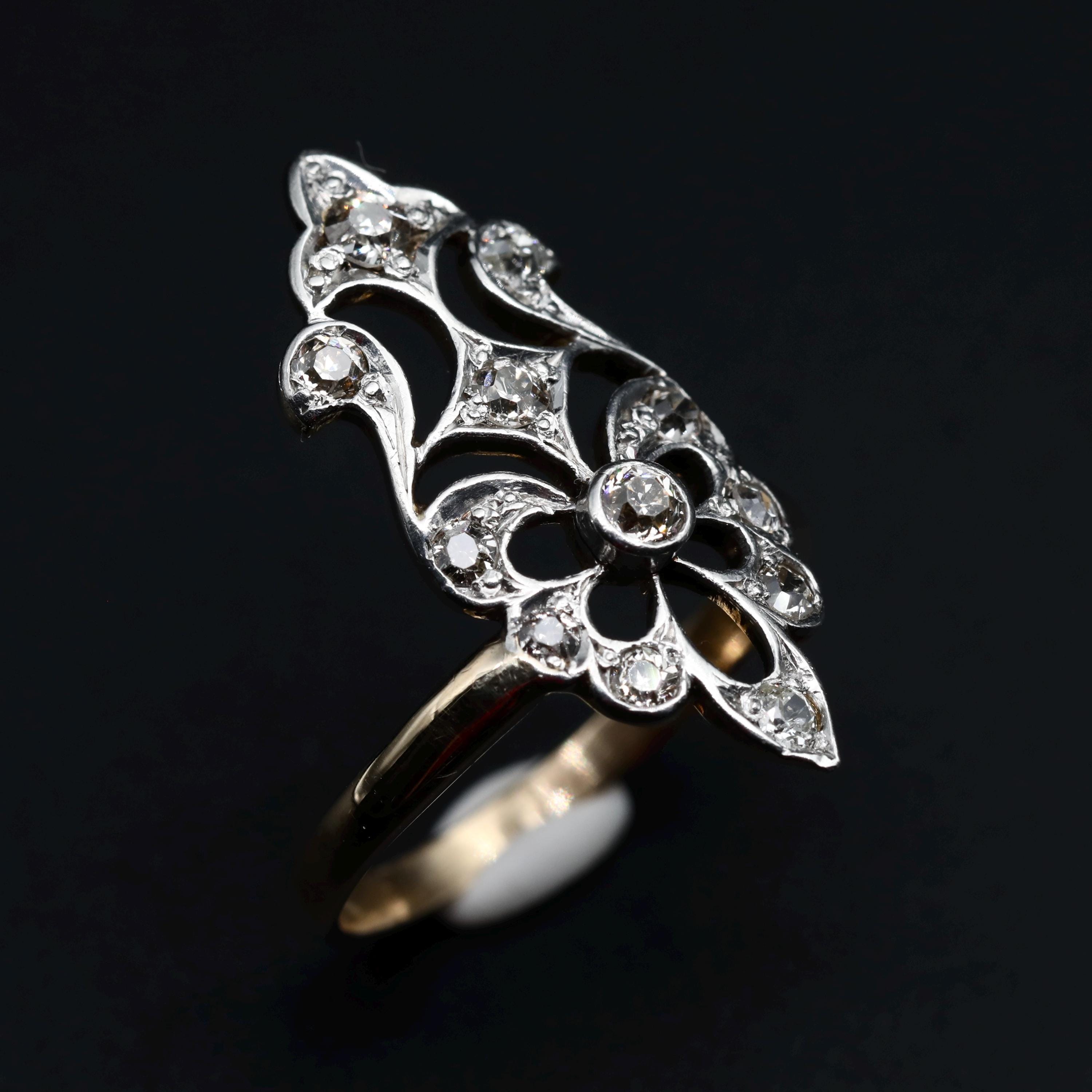 A refined Belle Époque ring, designed in the elongated navette form that defines the period. The surface is set with old mine cut diamonds, offering a soft, antique brilliance that feels distinct from modern stones.