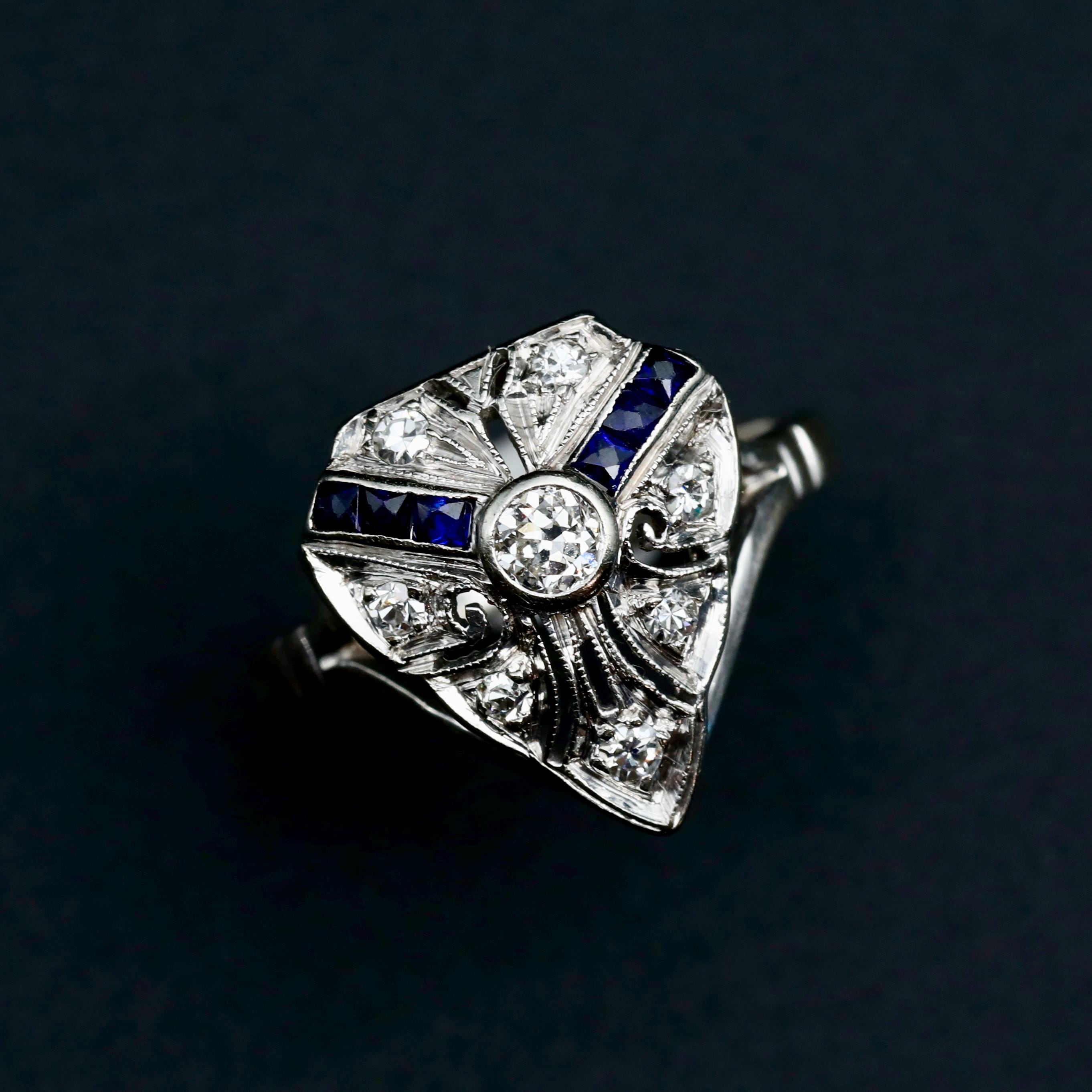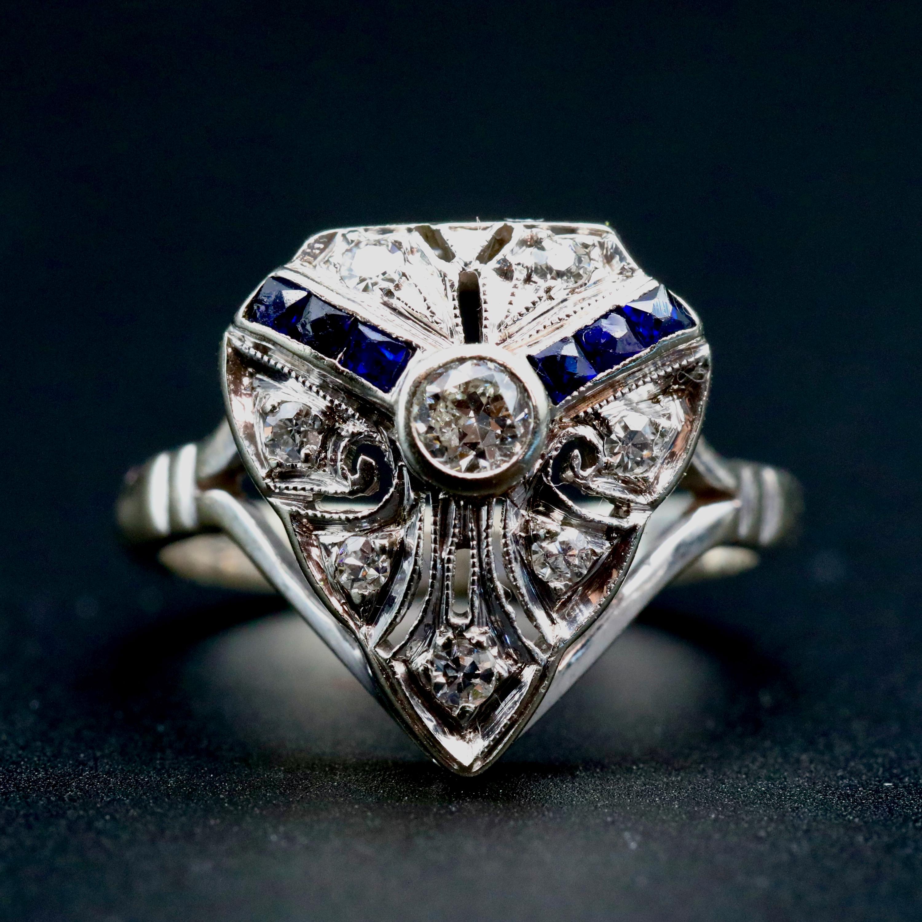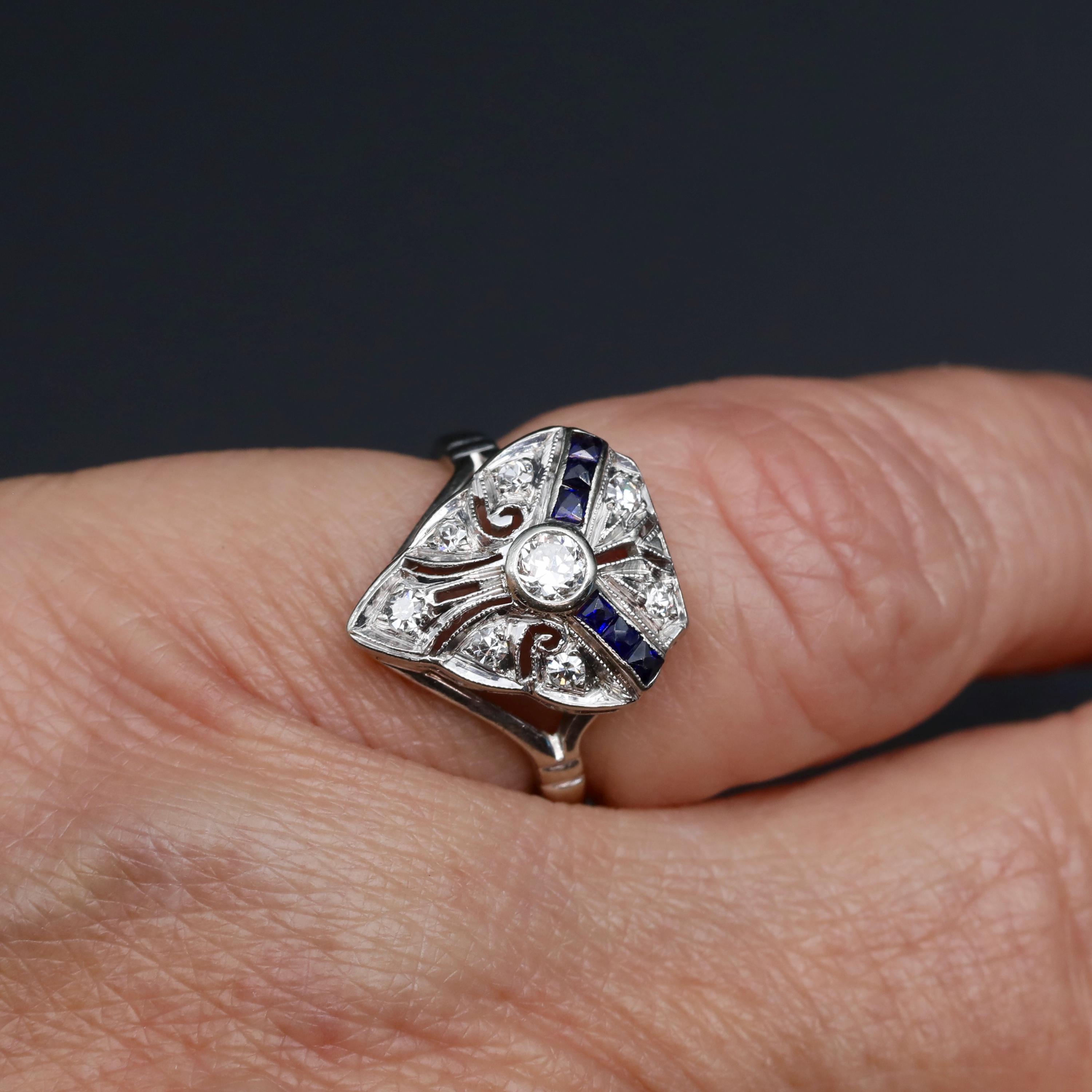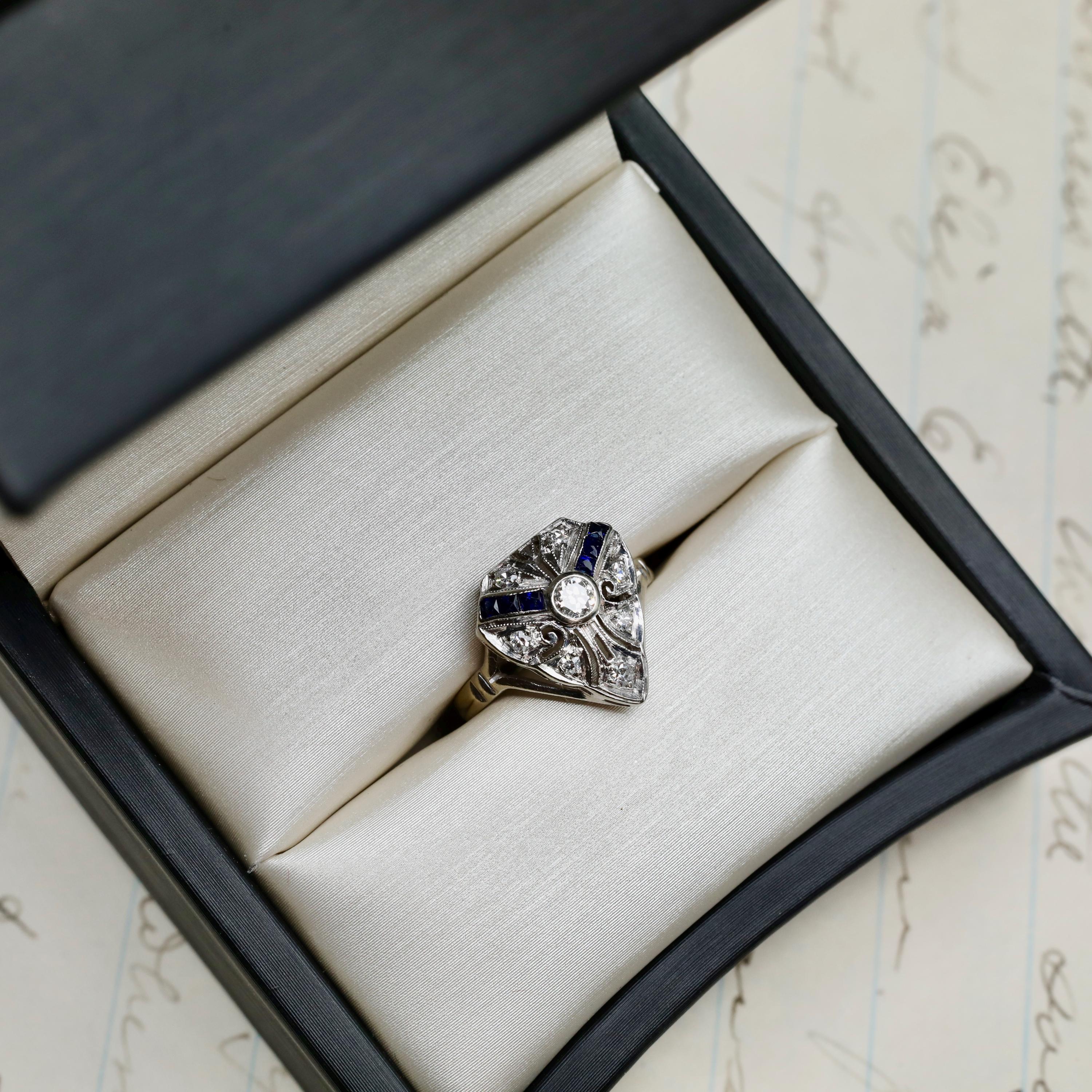 A finely detailed Art Deco ring from the 1920s, centered with a transitional cut diamond and framed by geometric panels of deep blue sapphires and additional old cut diamonds.