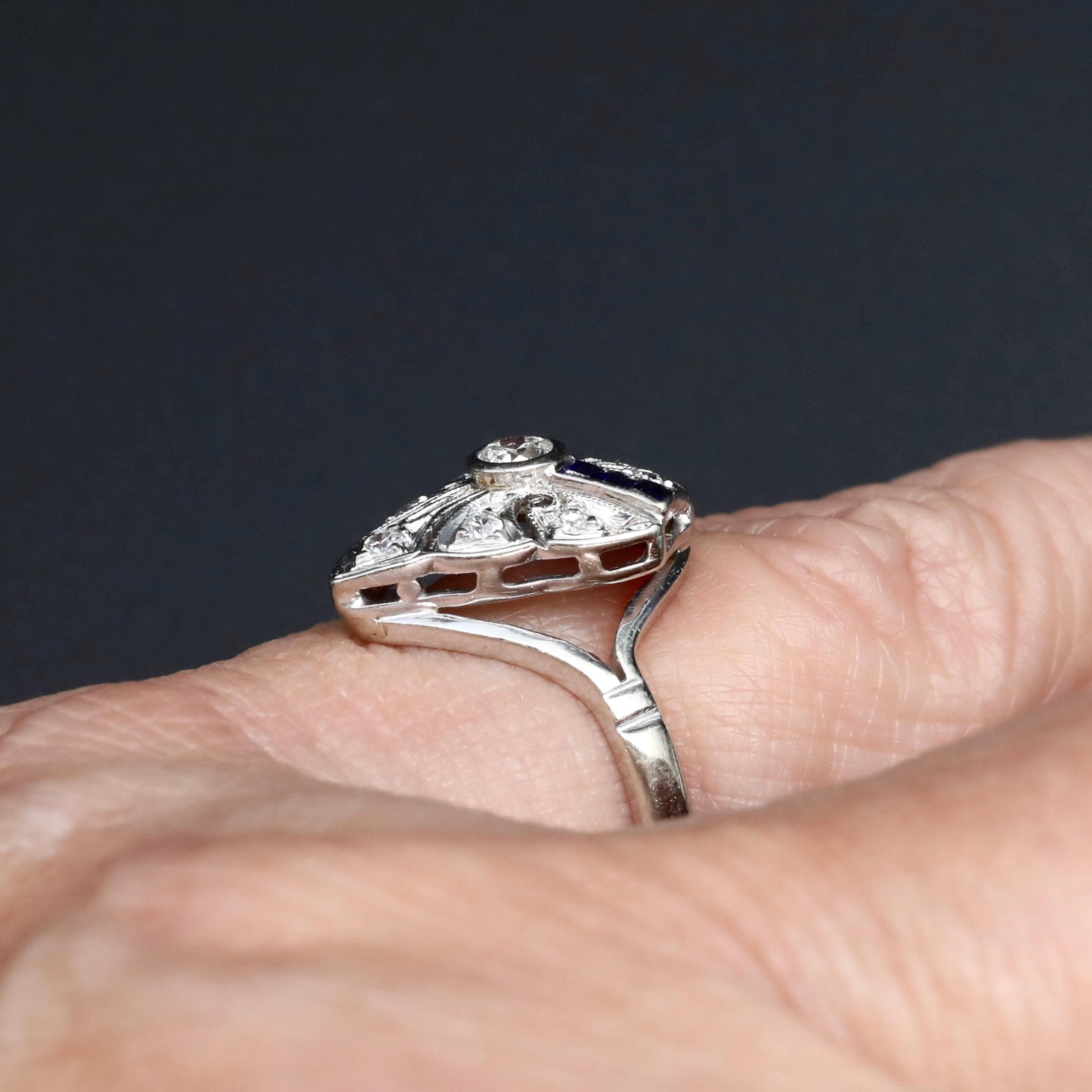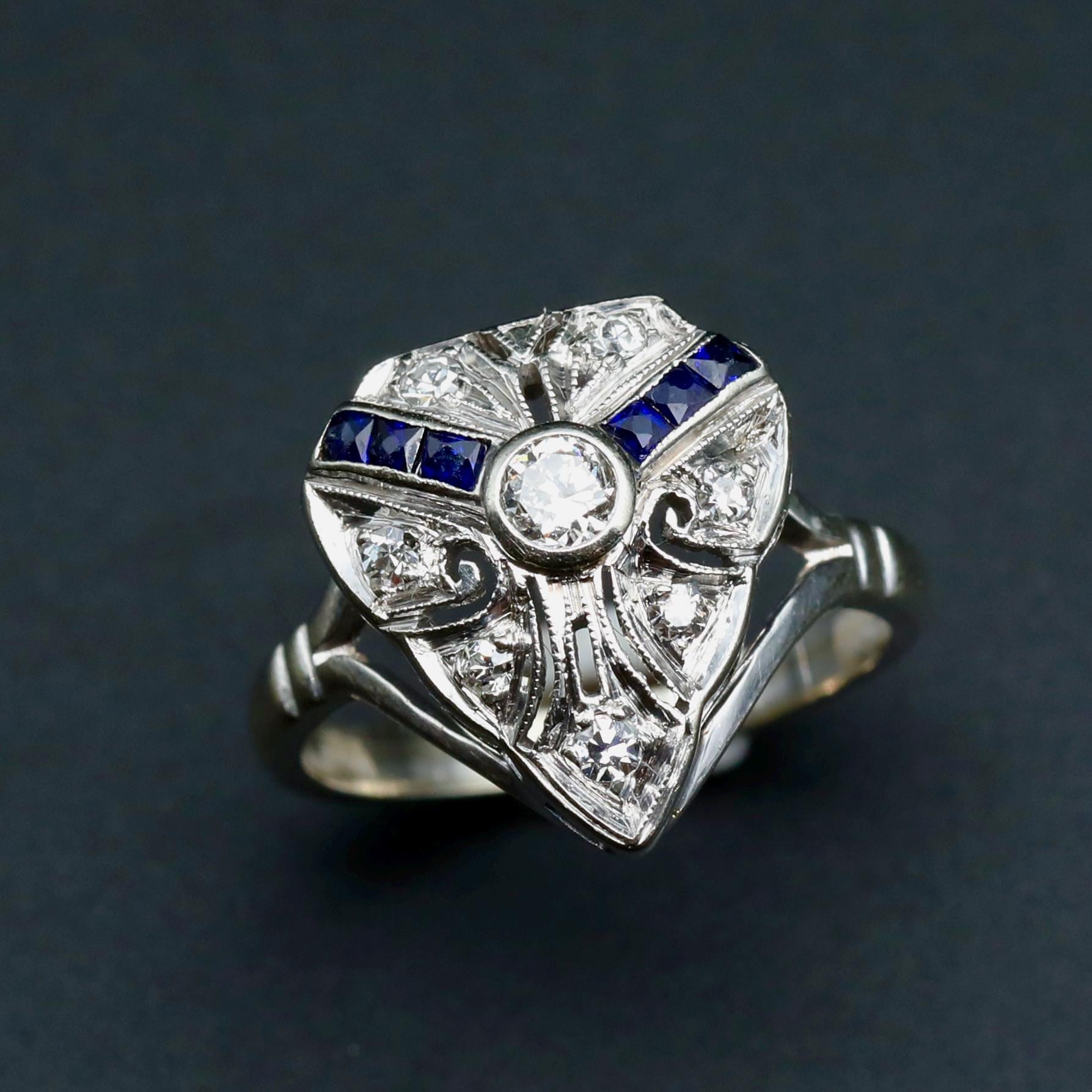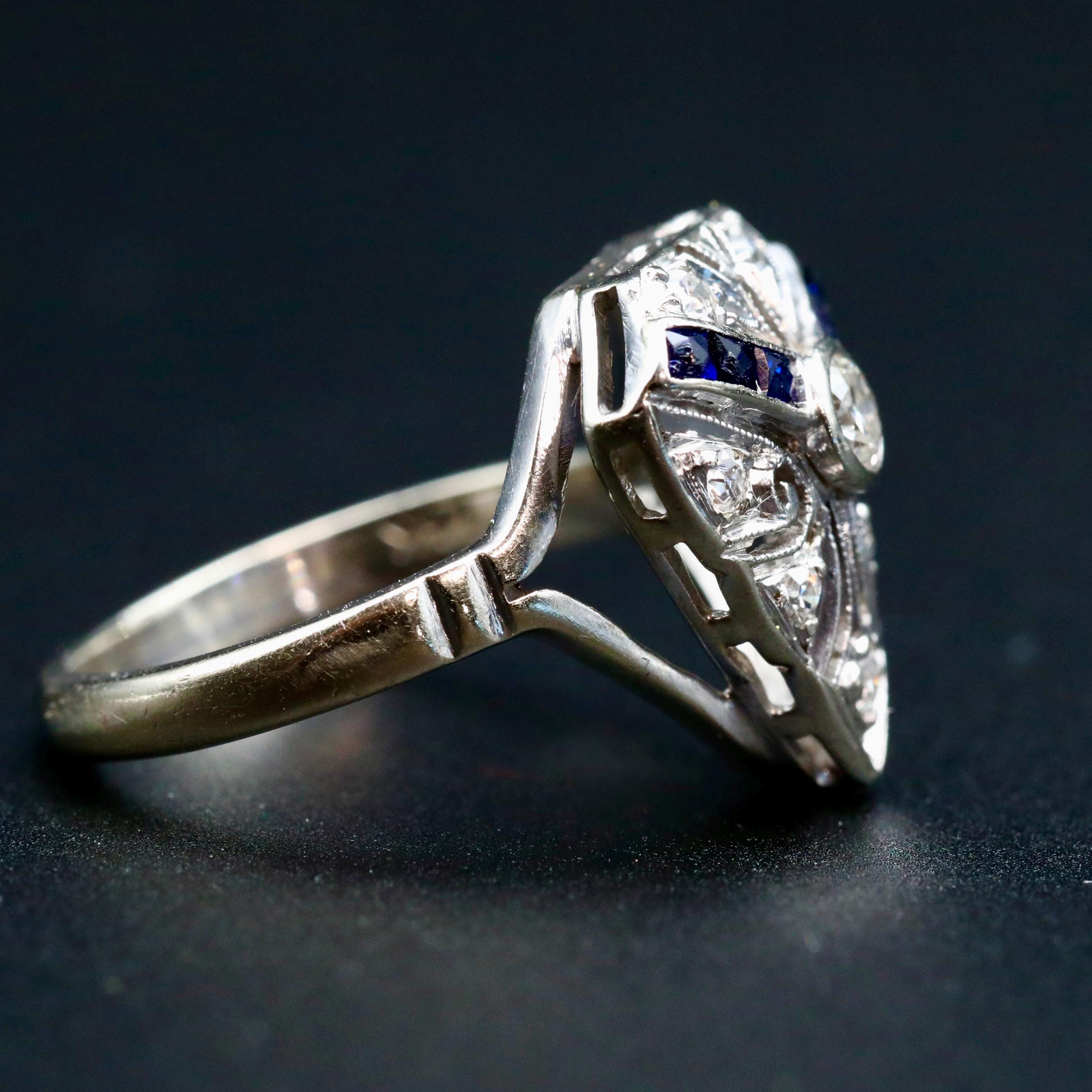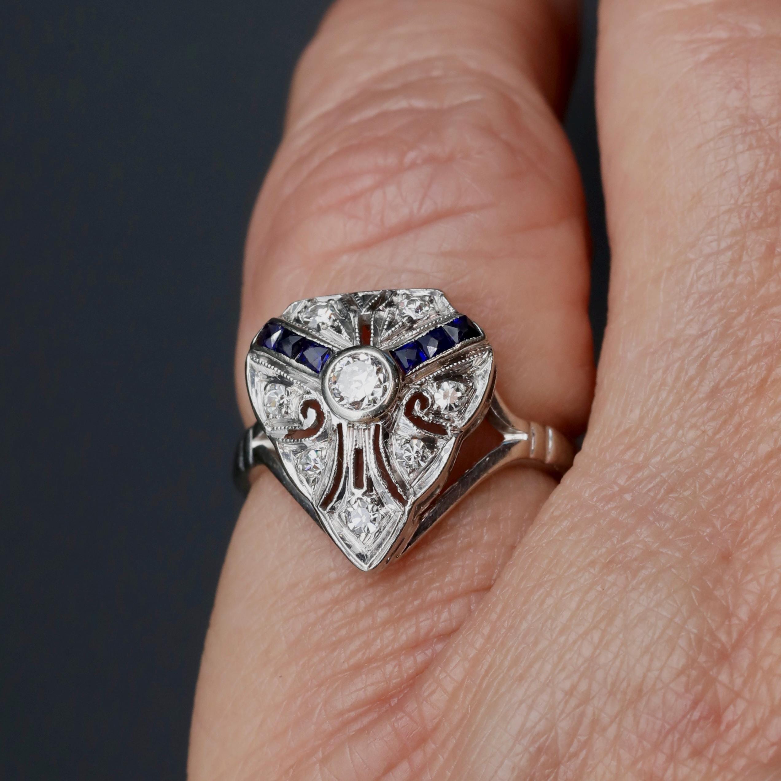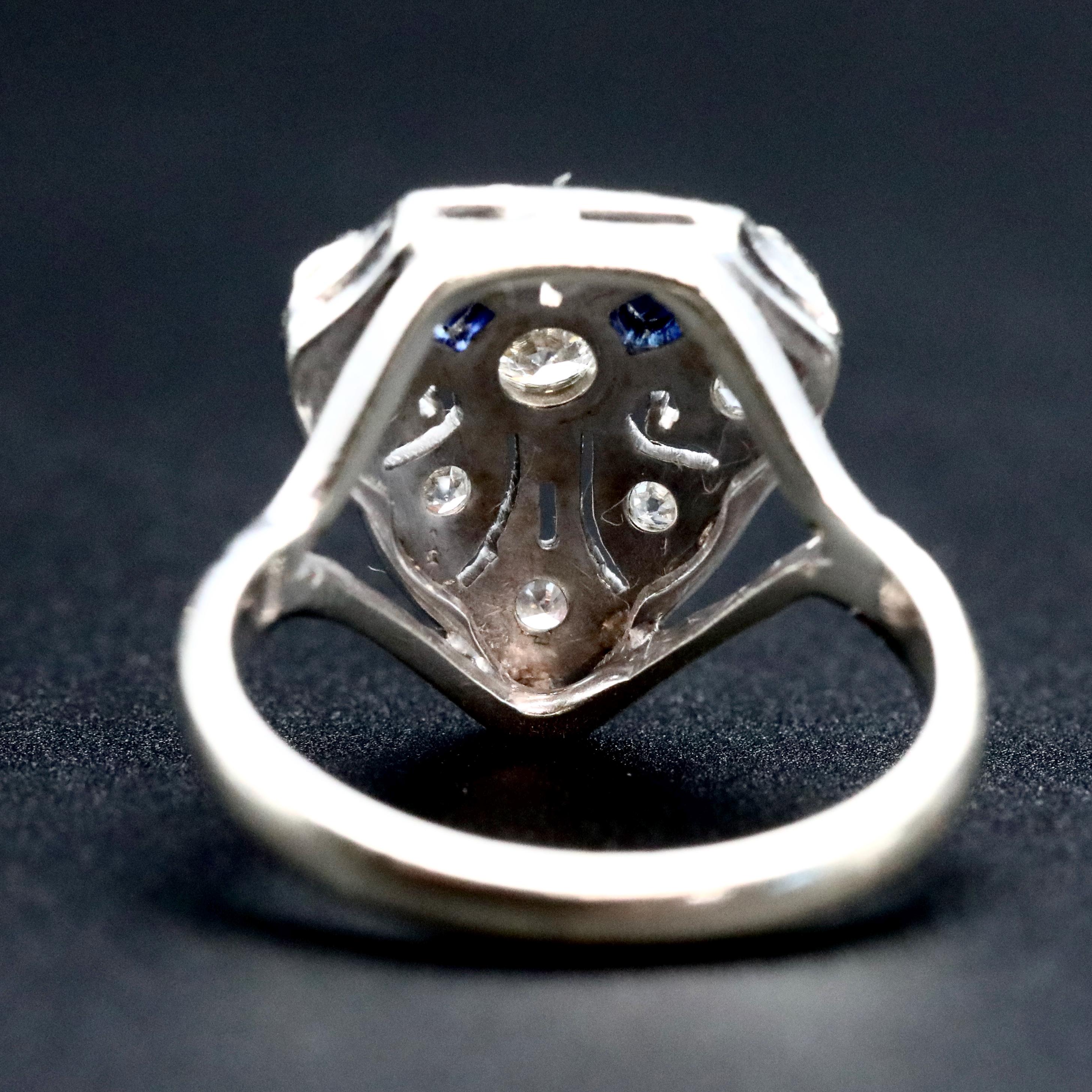 A finely detailed Art Deco ring from the 1920s, centered with a transitional cut diamond and framed by geometric panels of deep blue sapphires and additional old cut diamonds.
