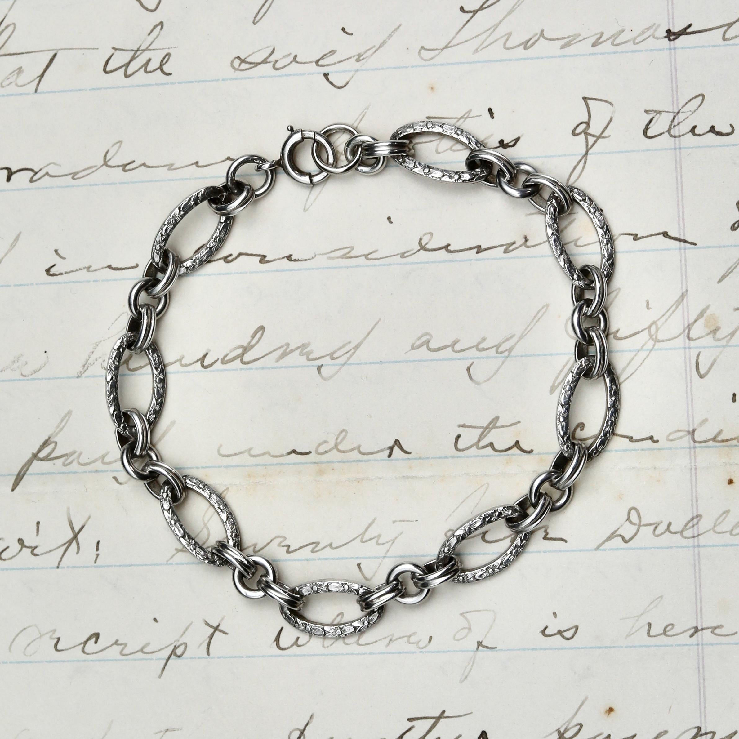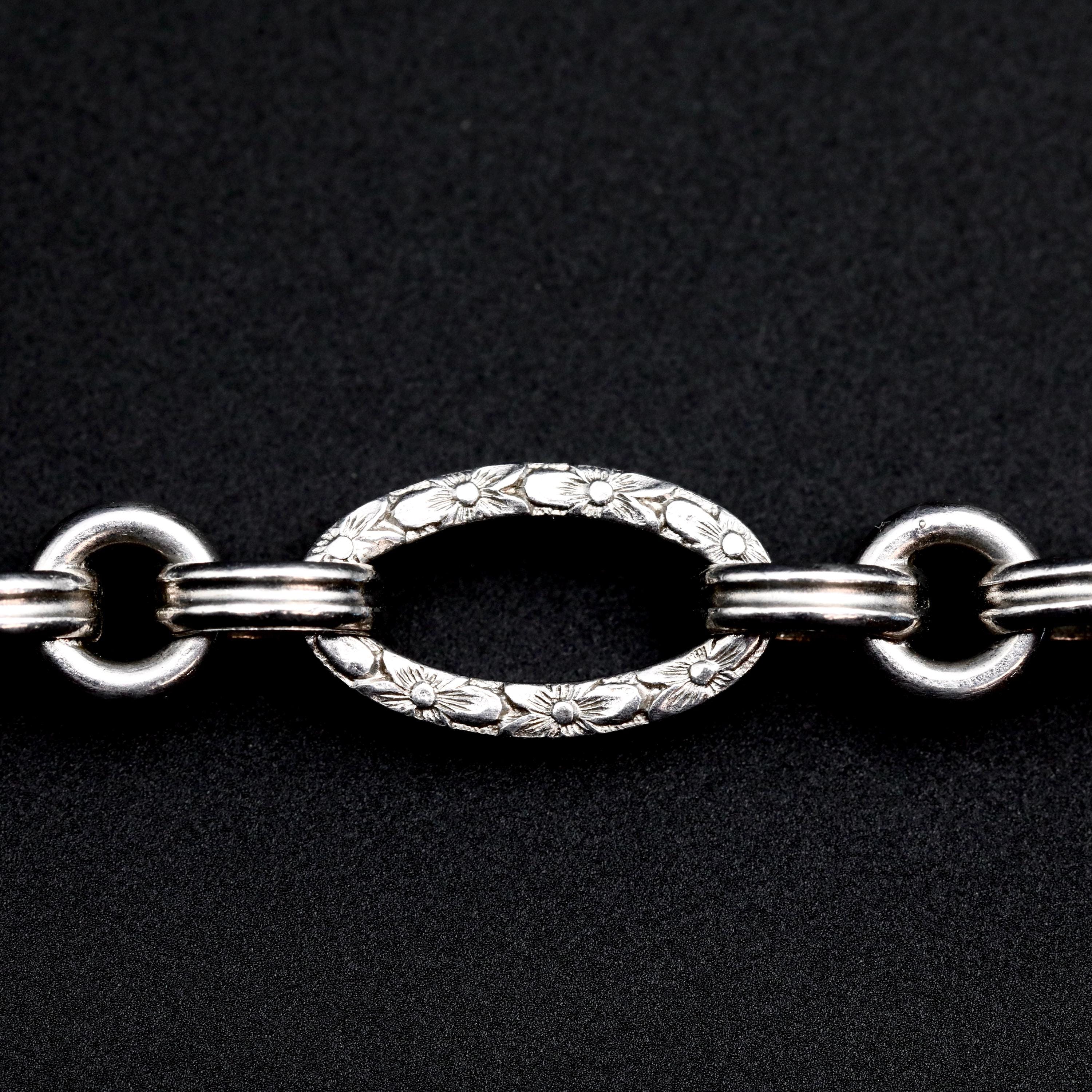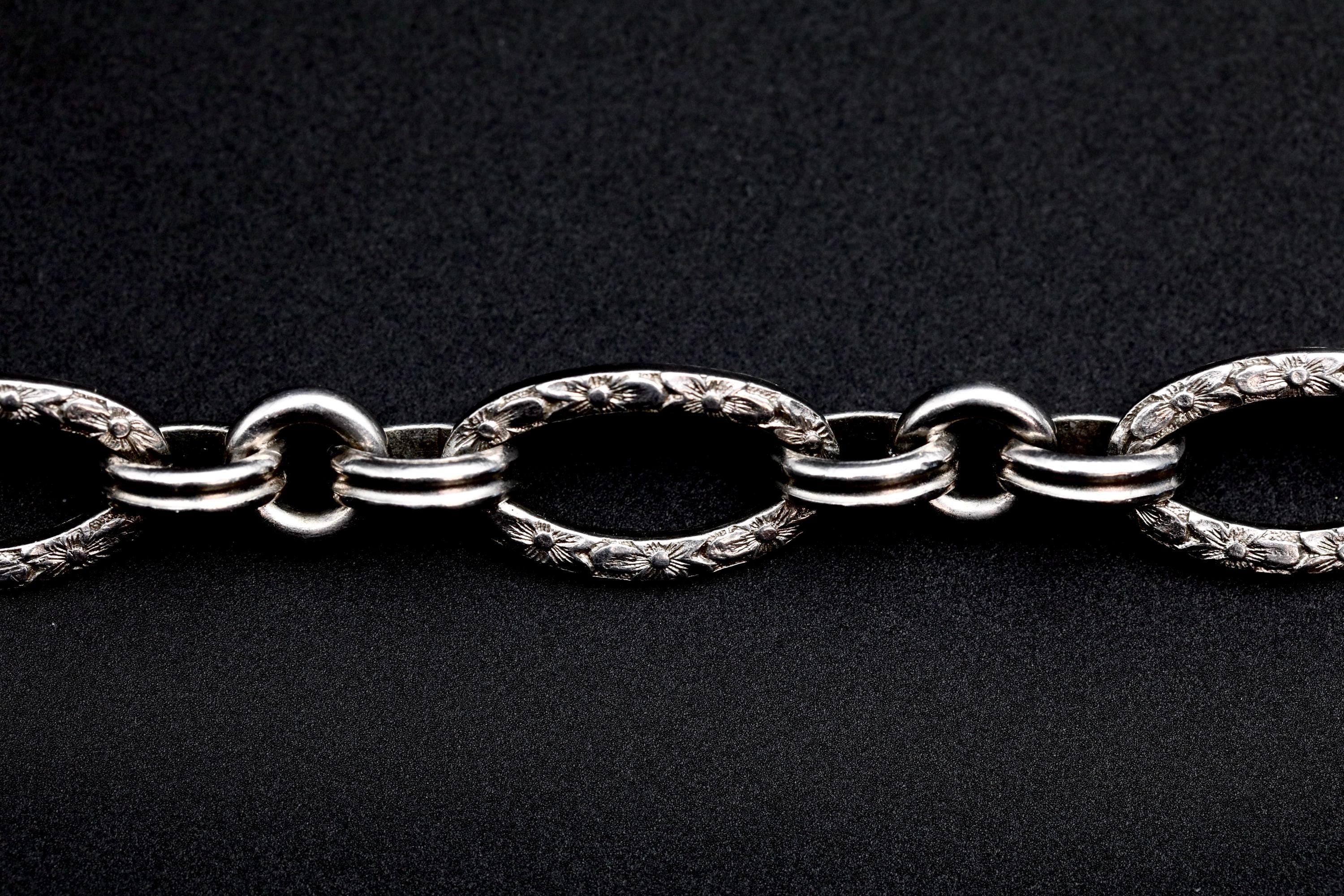 A refined Art Deco bracelet from the 1930s, composed of alternating oval and round links in solid sterling silver. Each elongated link is engraved with a delicate floral motif, creating subtle texture and movement across the surface.