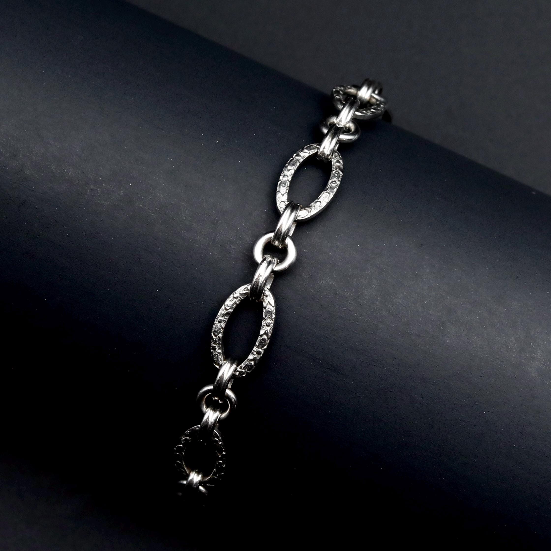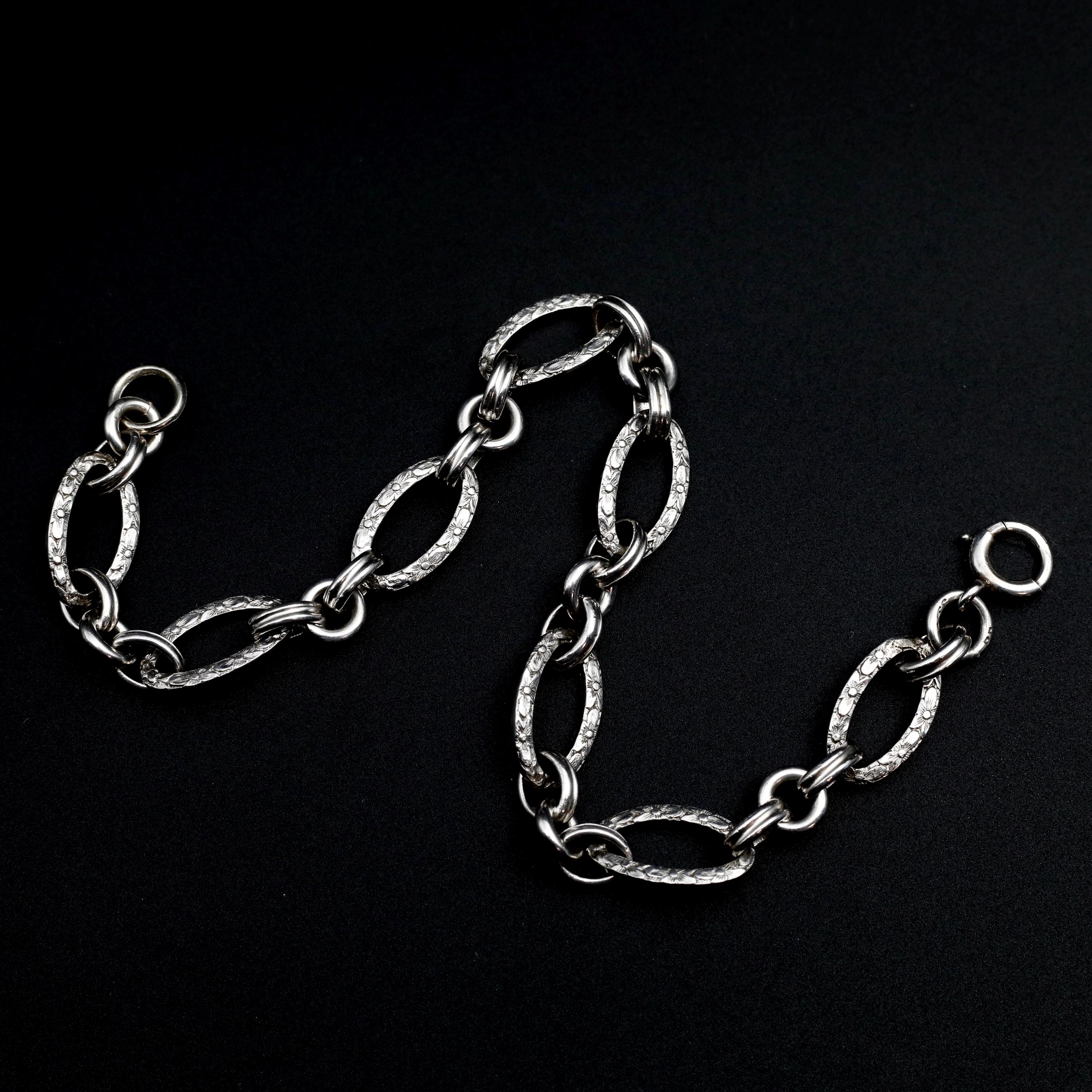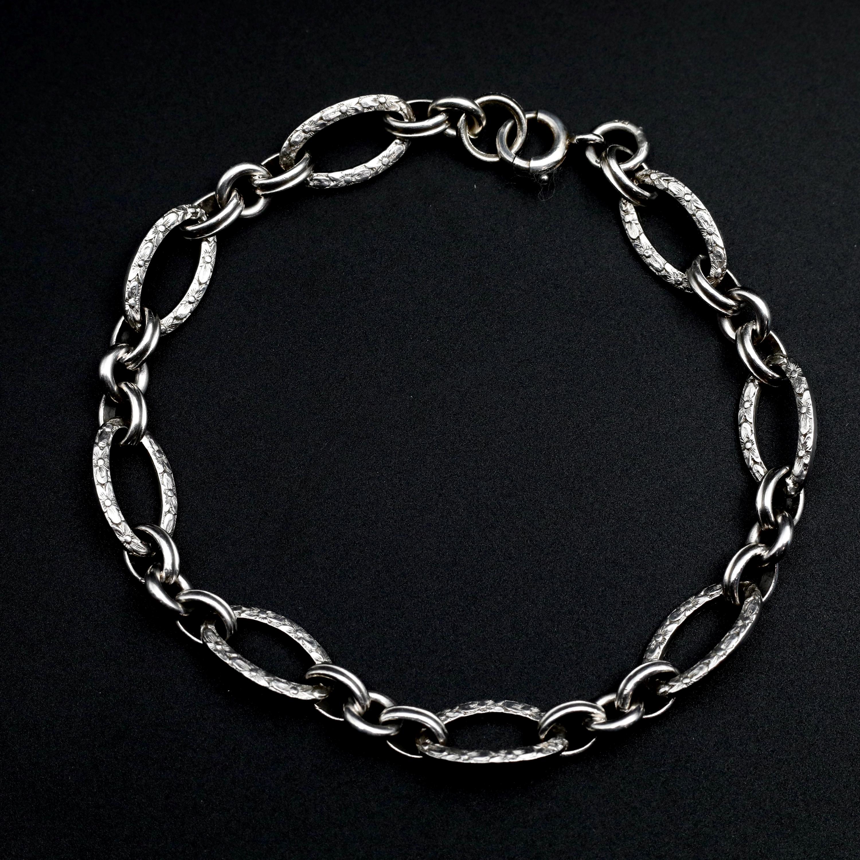 A refined Art Deco bracelet from the 1930s, composed of alternating oval and round links in solid sterling silver. Each elongated link is engraved with a delicate floral motif, creating subtle texture and movement across the surface.