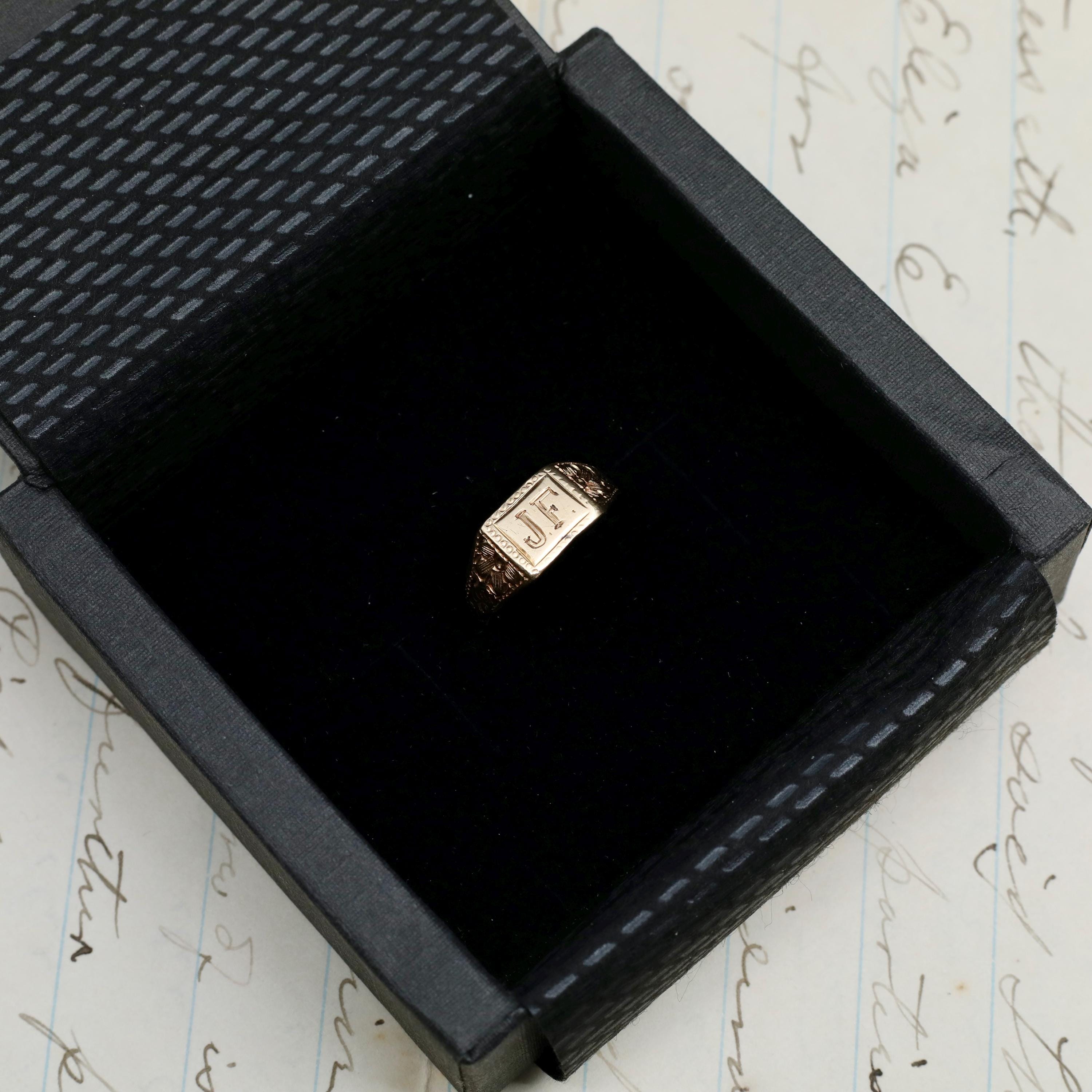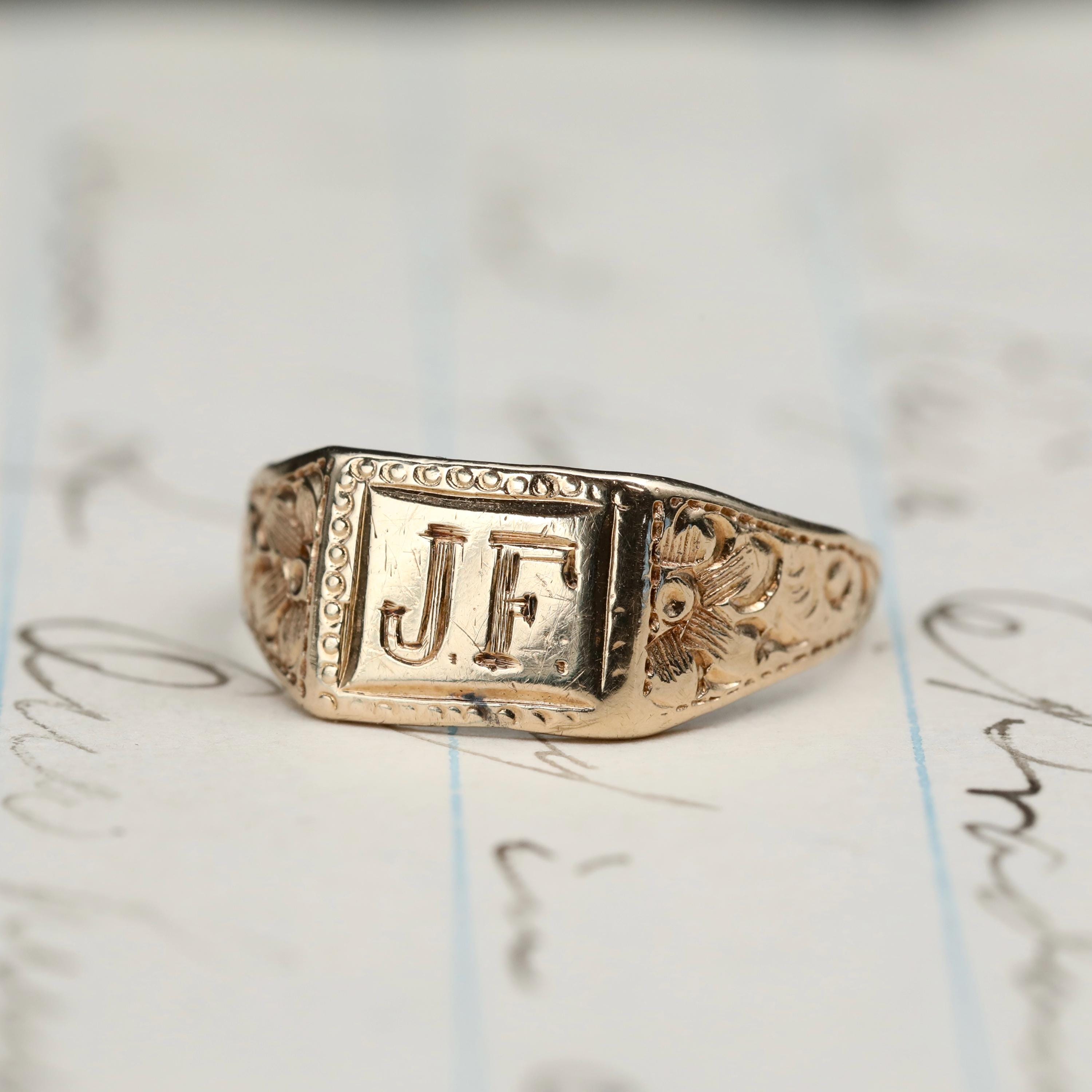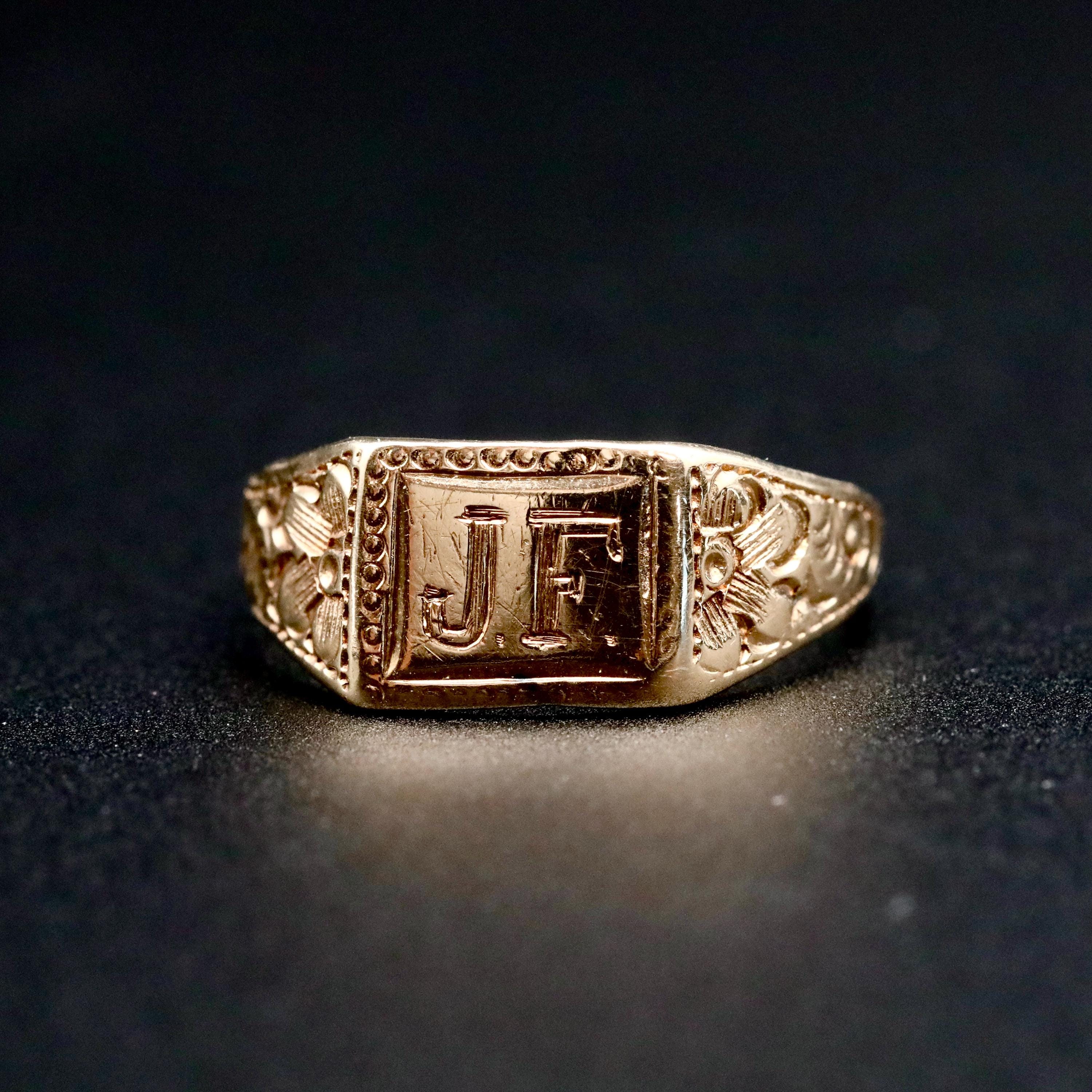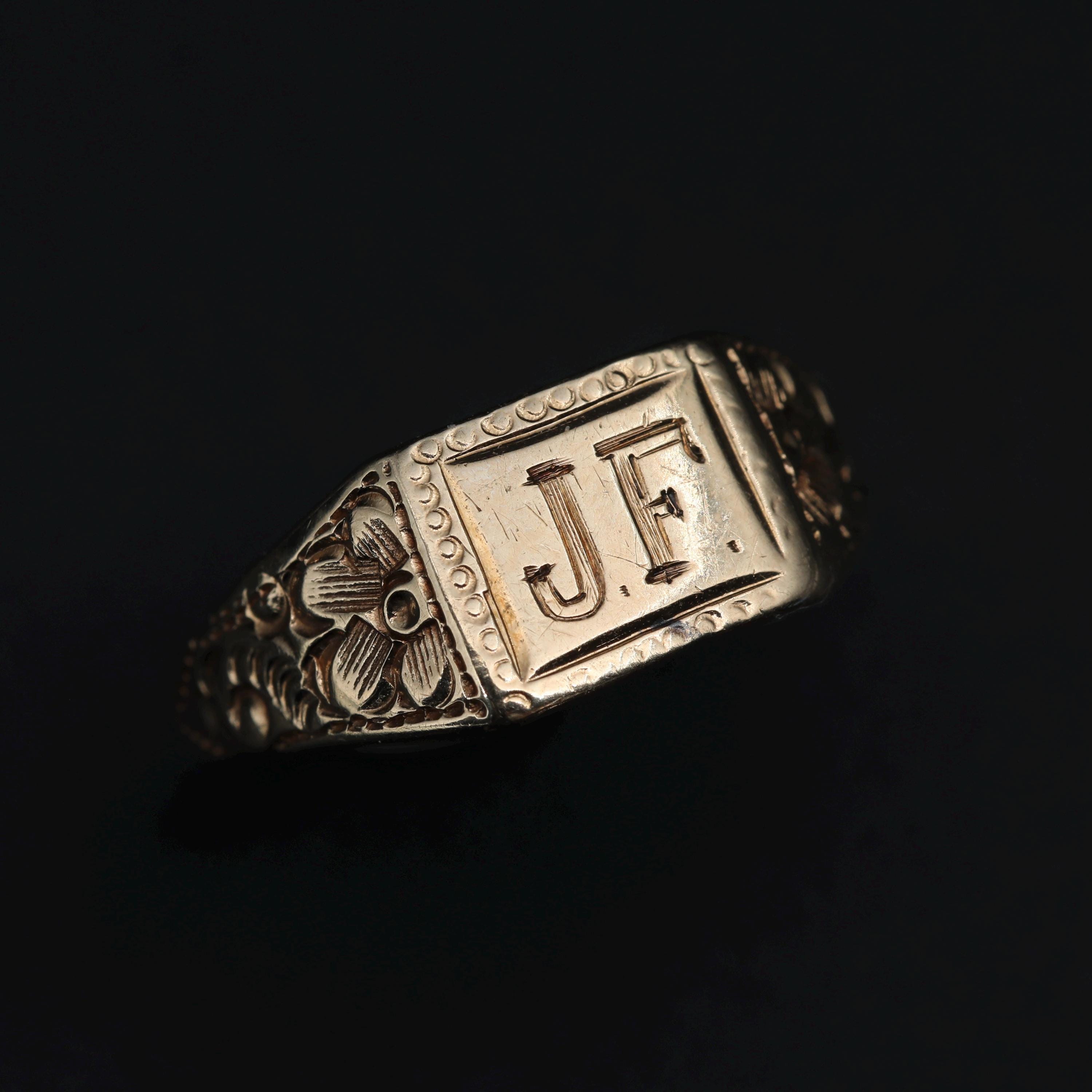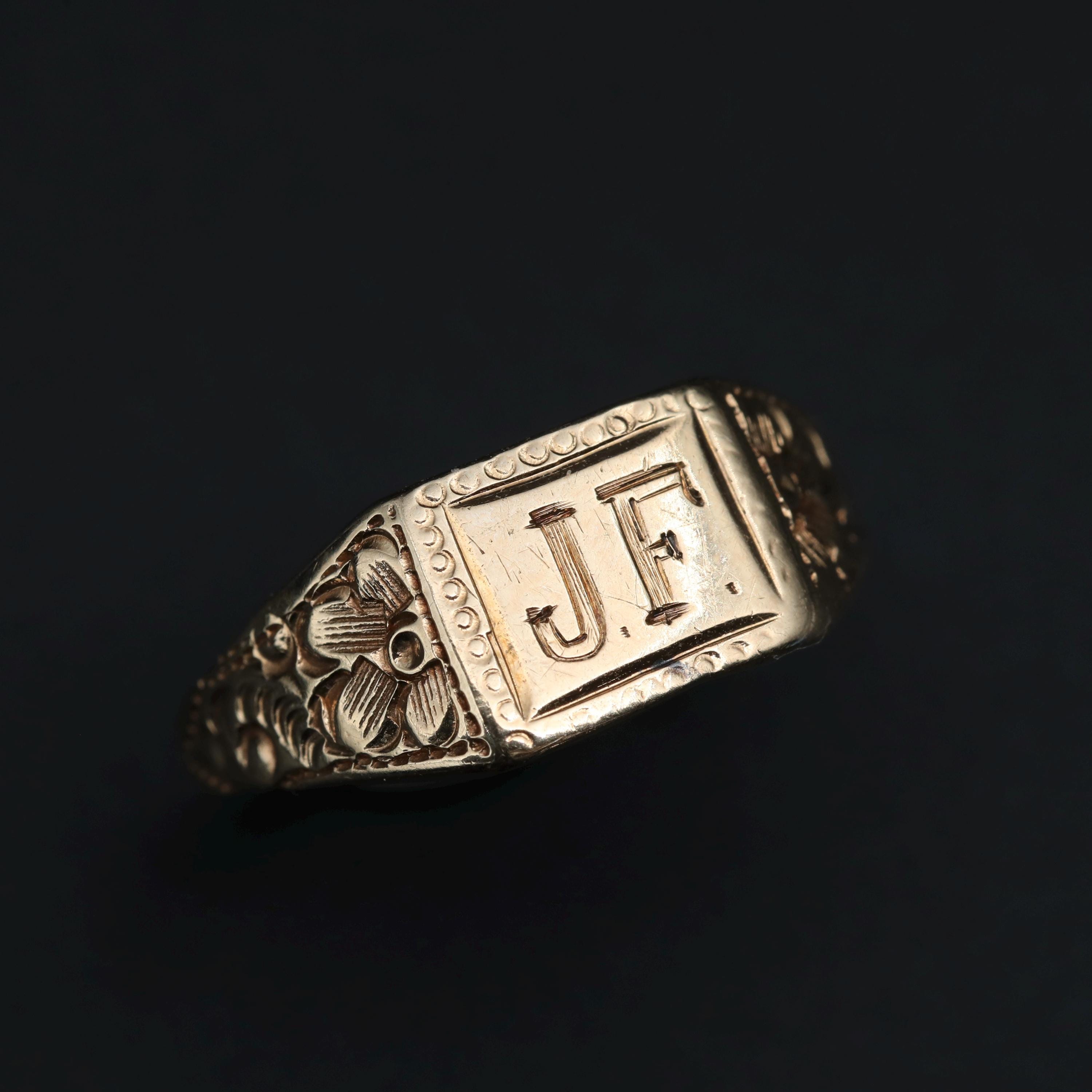 An antique 14k gold signet ring engraved with the initials JF. The square signet face features a hand-engraved monogram, while the sides of the shank are detailed with raised scrollwork and Floral ornament, adding structure and visual interest without excess weight.