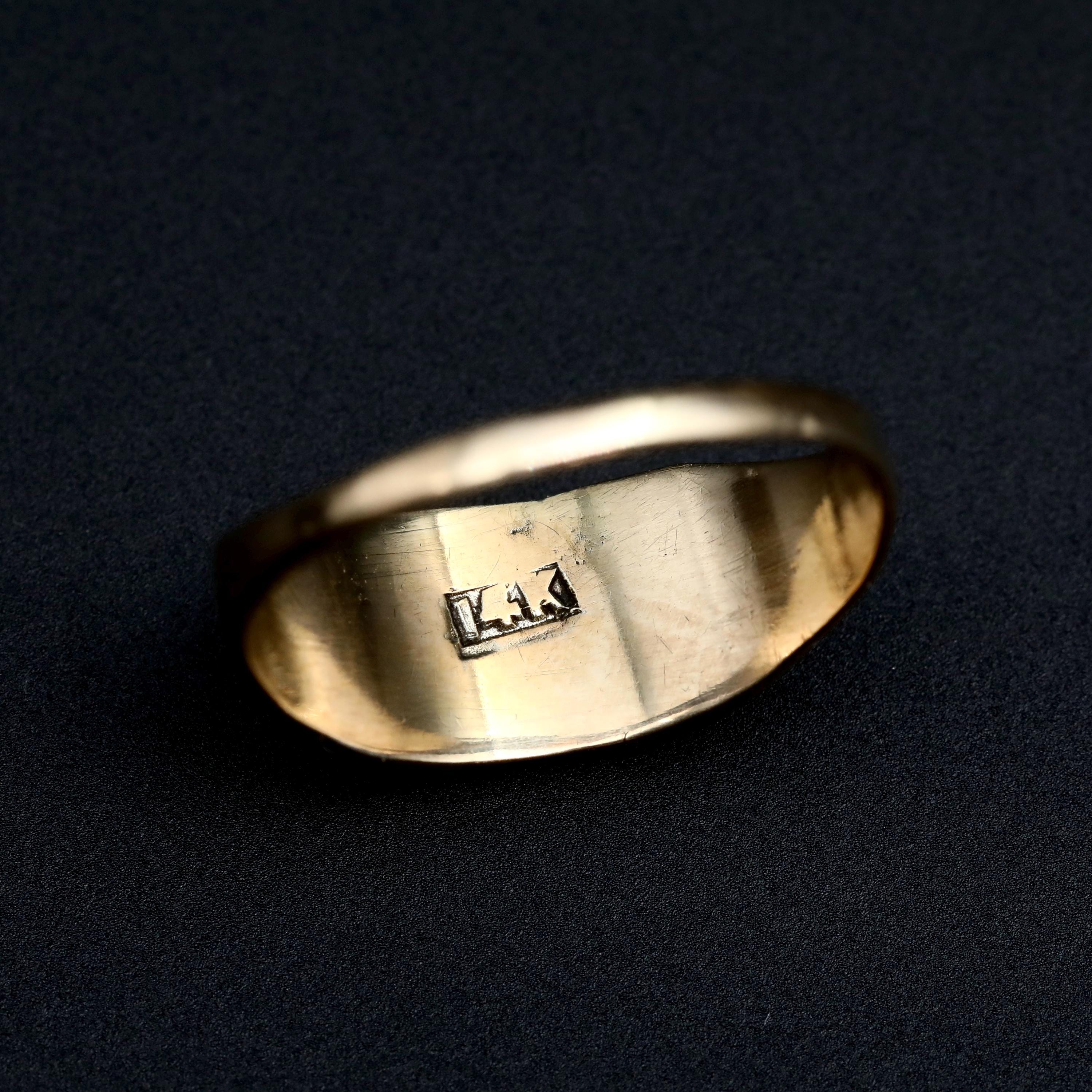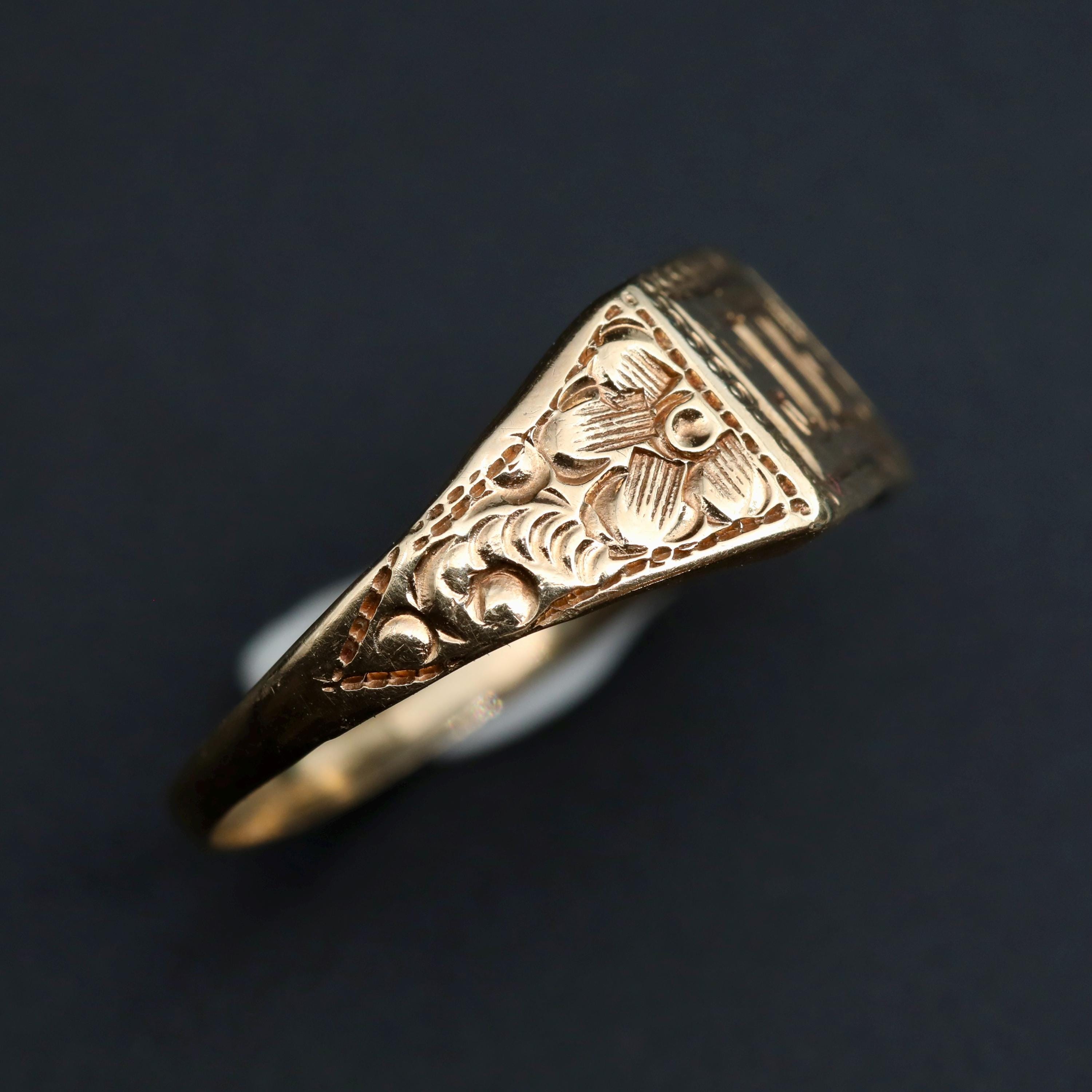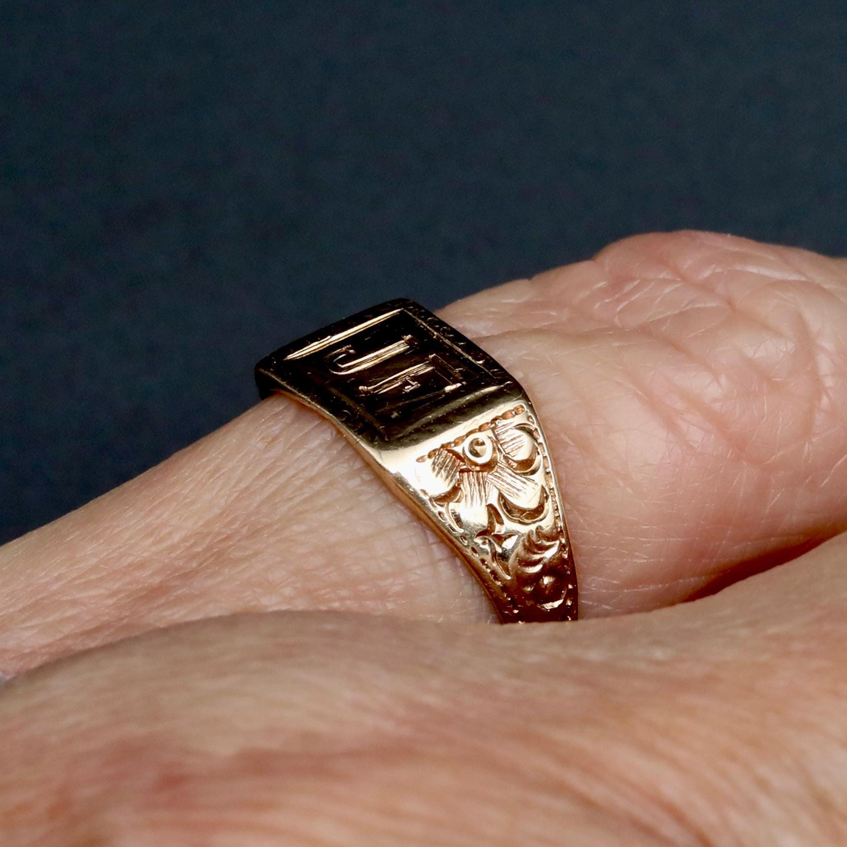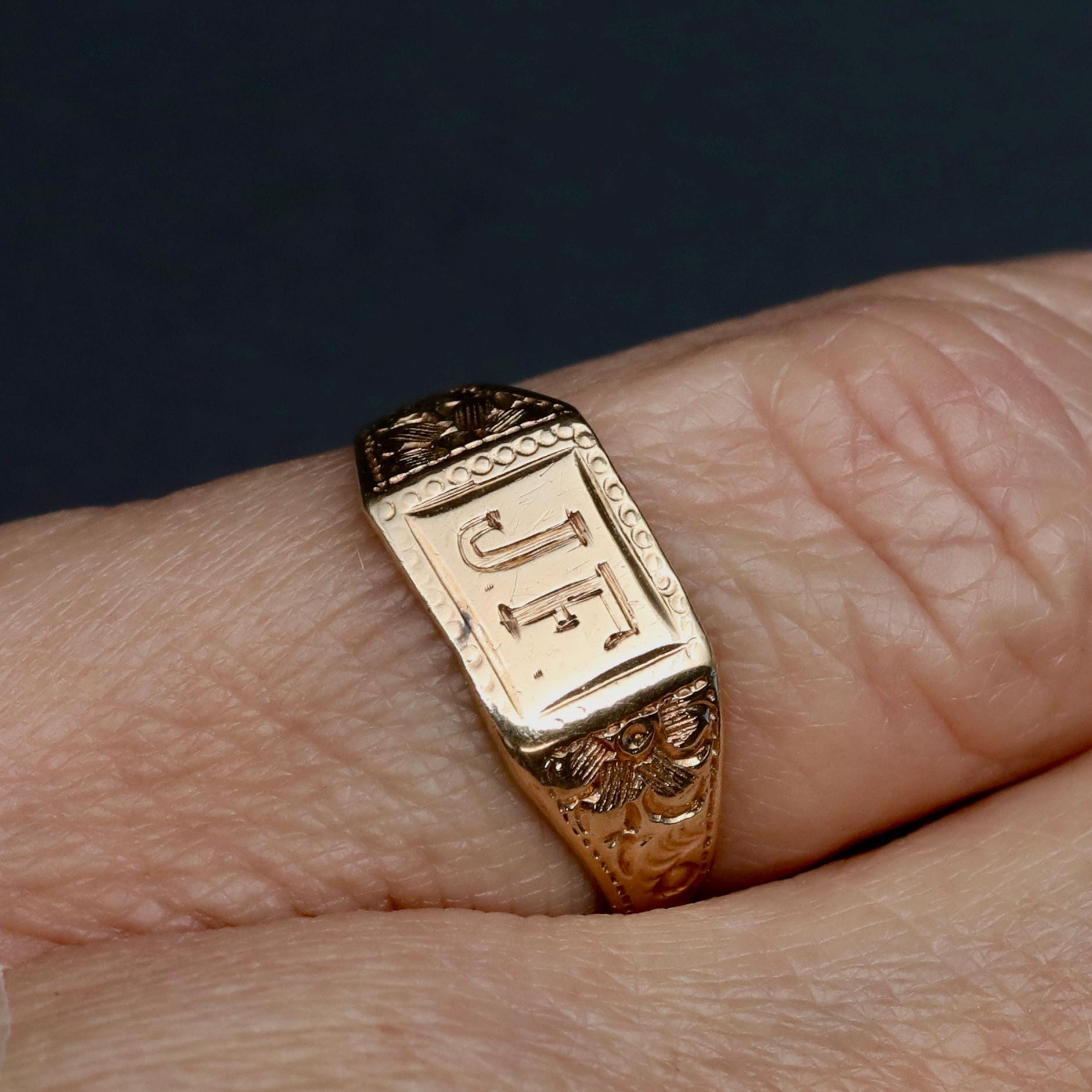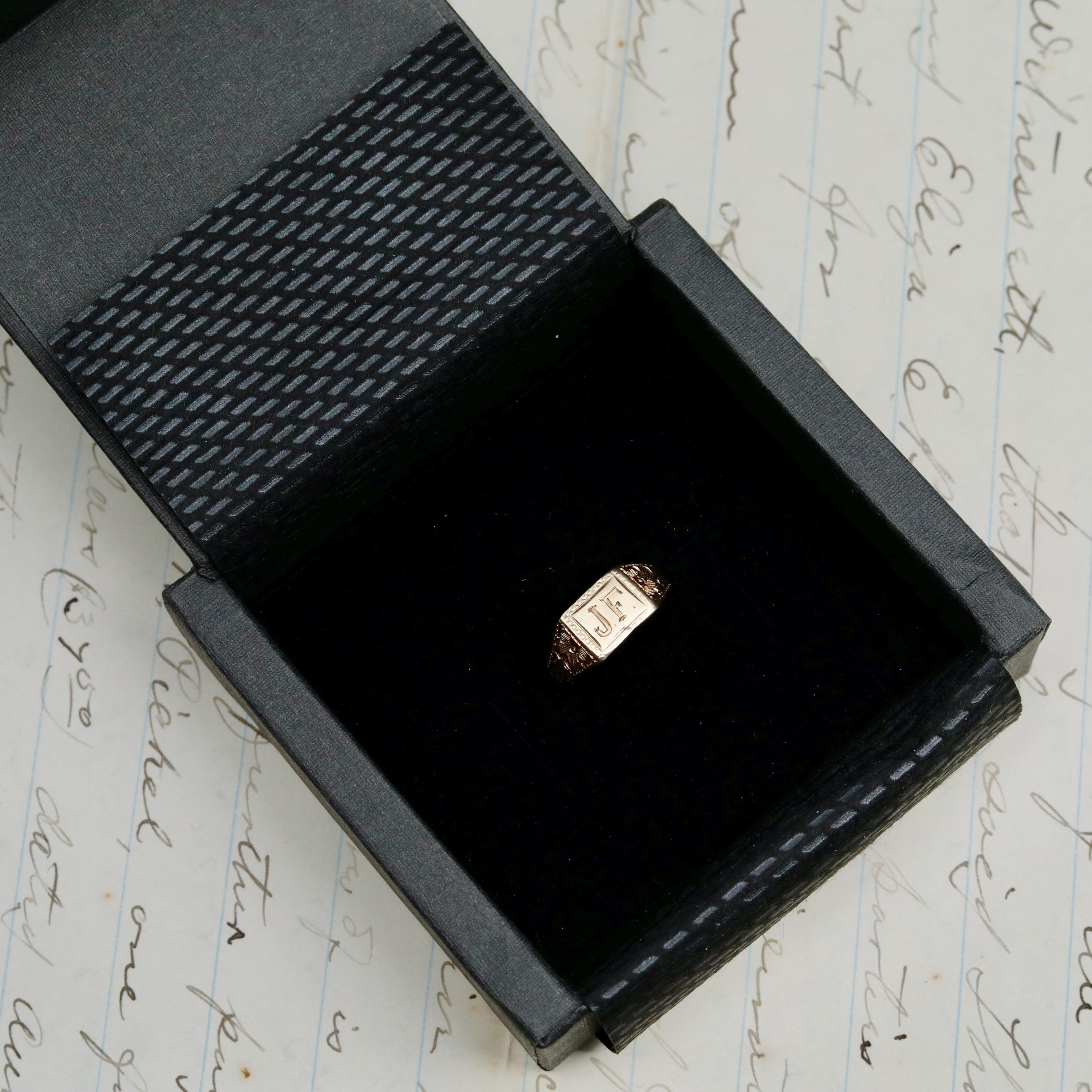 An antique 14k gold signet ring engraved with the initials JF. The square signet face features a hand-engraved monogram, while the sides of the shank are detailed with raised scrollwork and Floral ornament, adding structure and visual interest without excess weight.
