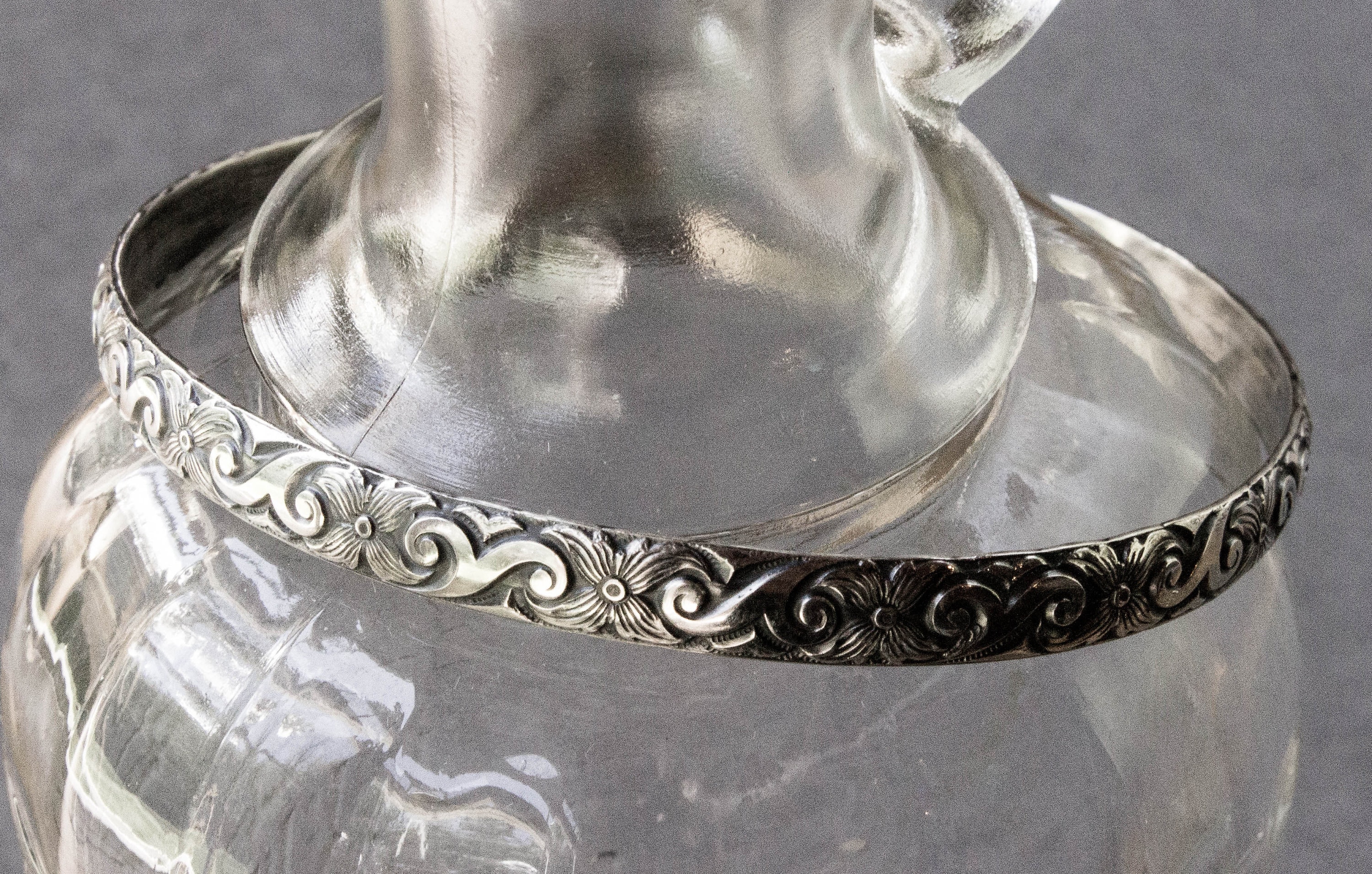 This XL extra large solid sterling silver bangle bracelet features a pattern reminiscent of vintage-inspired flowers and scrolls. The oxidized and hand polished patina brings out the fine detail of the pattern. .925 solid sterling silver.