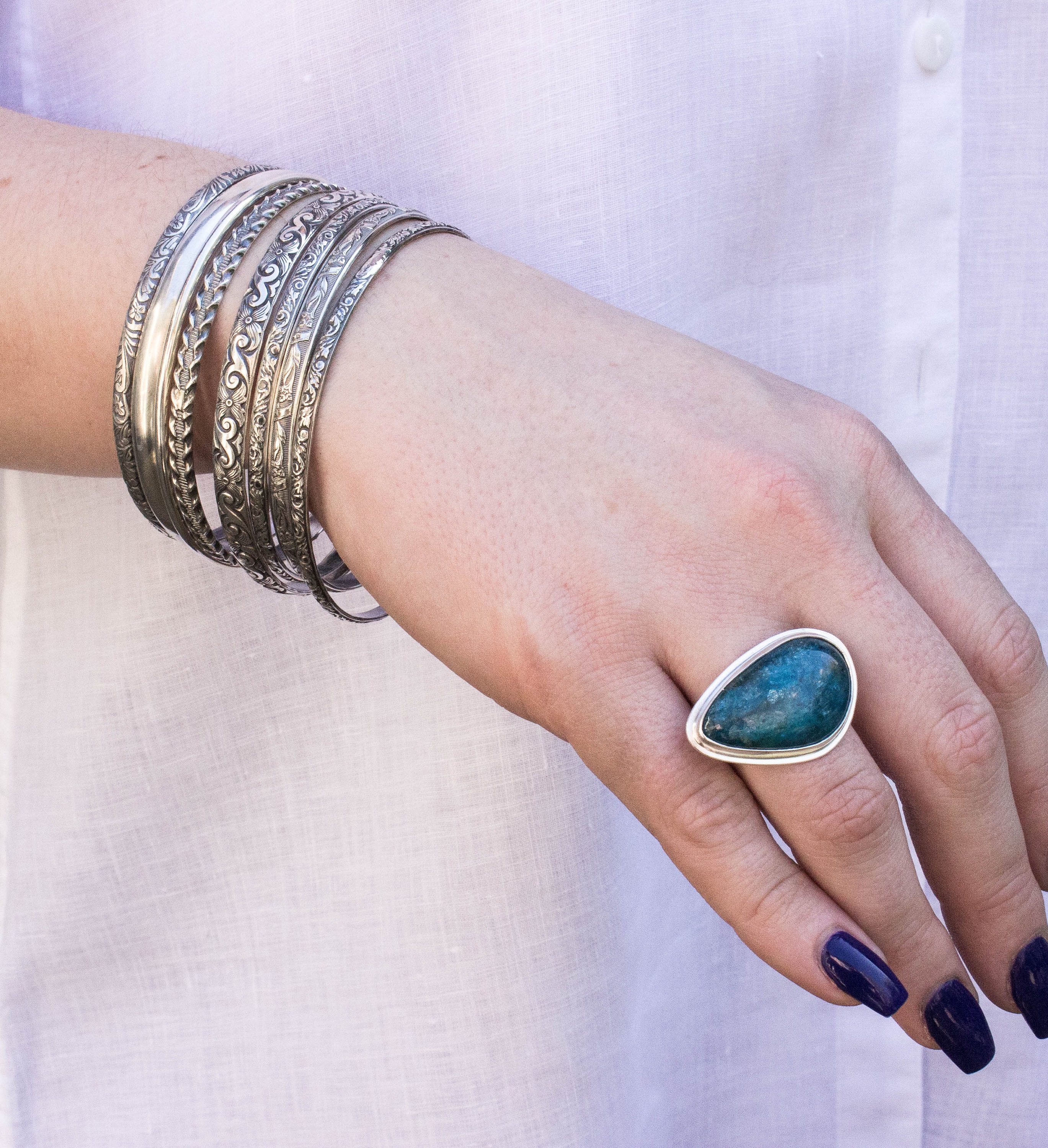 Handcrafted, this bracelet is of medium width, great on its own and a wonderful addition to any stack. This listing is for the bracelet shown in the first photo in XL size only. Makes a wonderful gift. Shipped in a jewelry gift box, ready for a fabulous presentation or a beautiful treat for yourself!