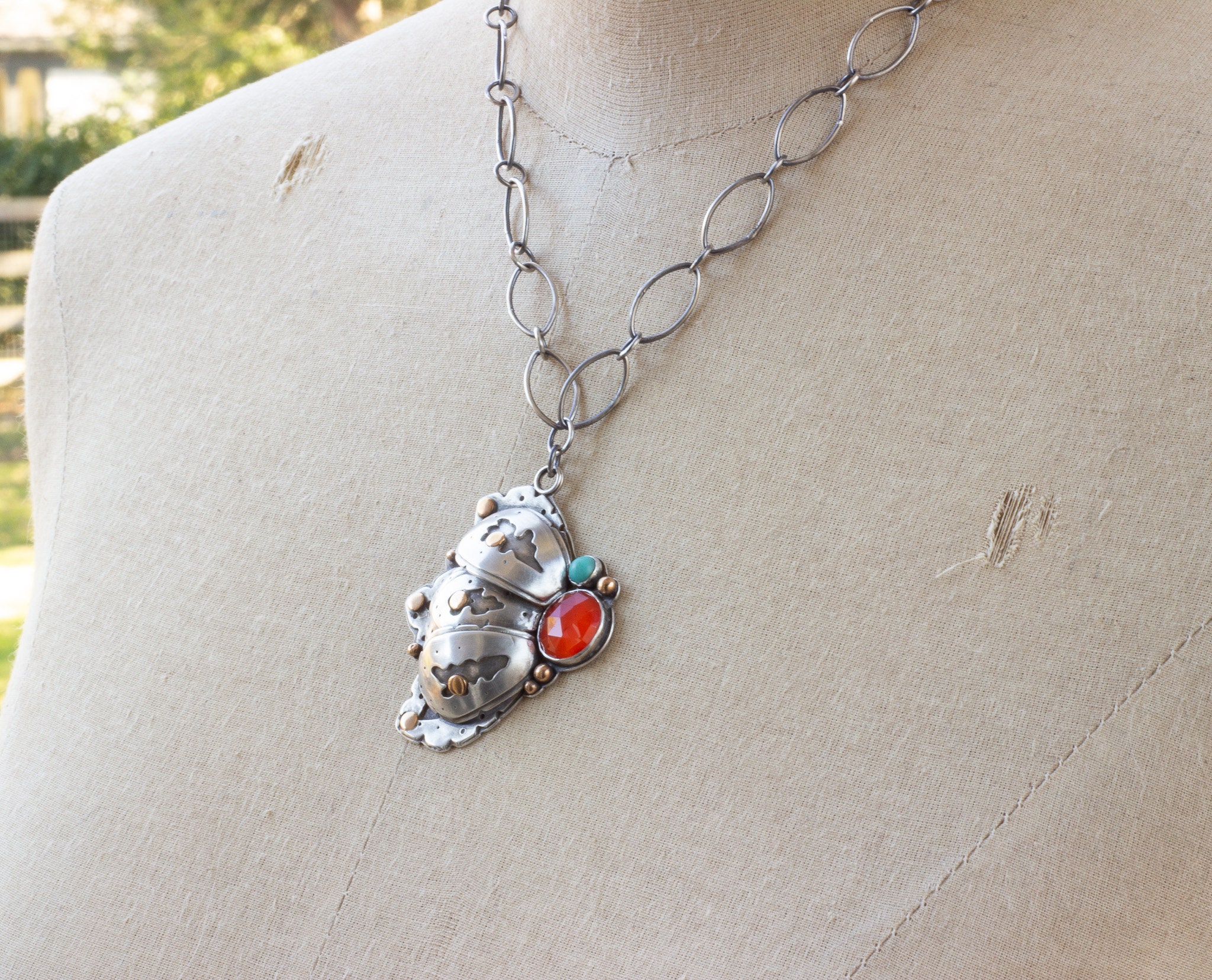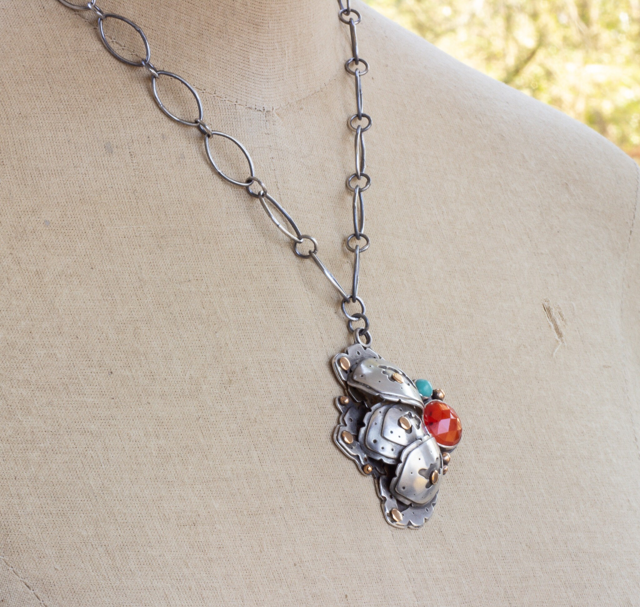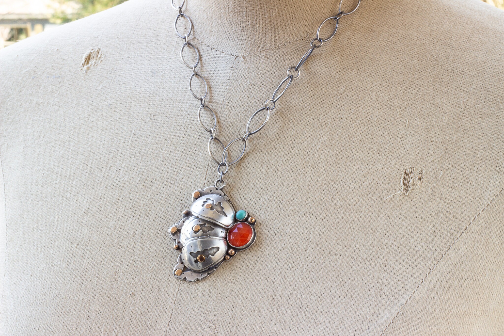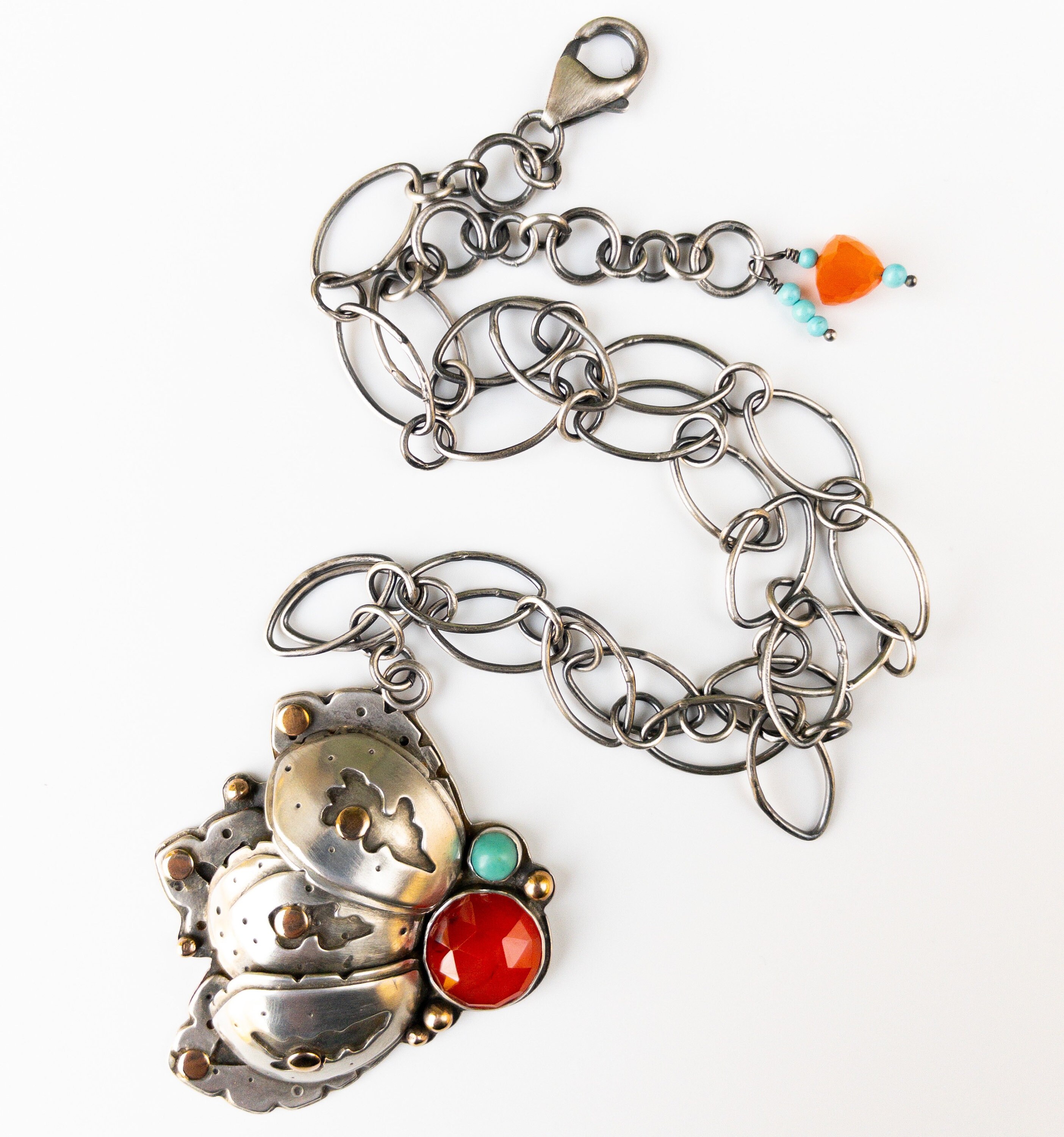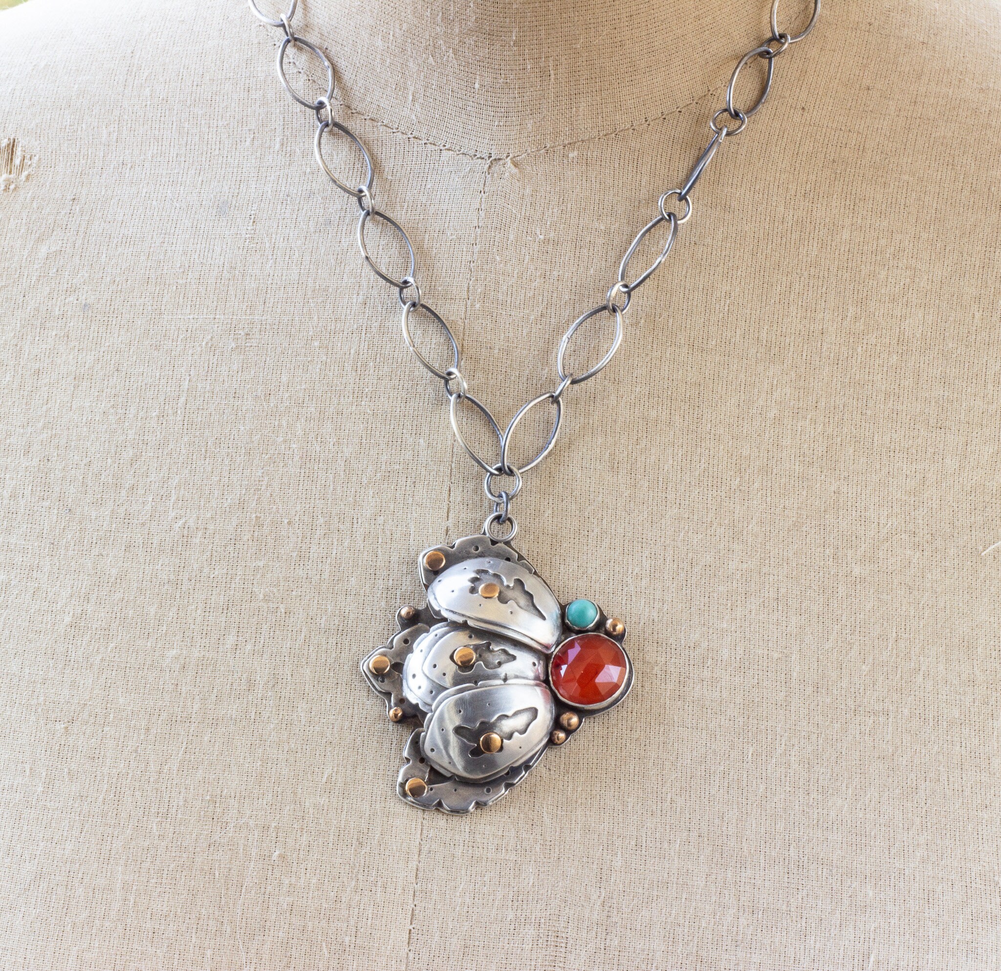 Bold color and sculptural silverwork define this one-of-a-kind statement necklace, featuring a vivid rose-cut carnelian accented with natural turquoise. The floral pendant is entirely handcrafted in sterling silver, with warm bronze granulation adding depth and contrast to the layered design.
